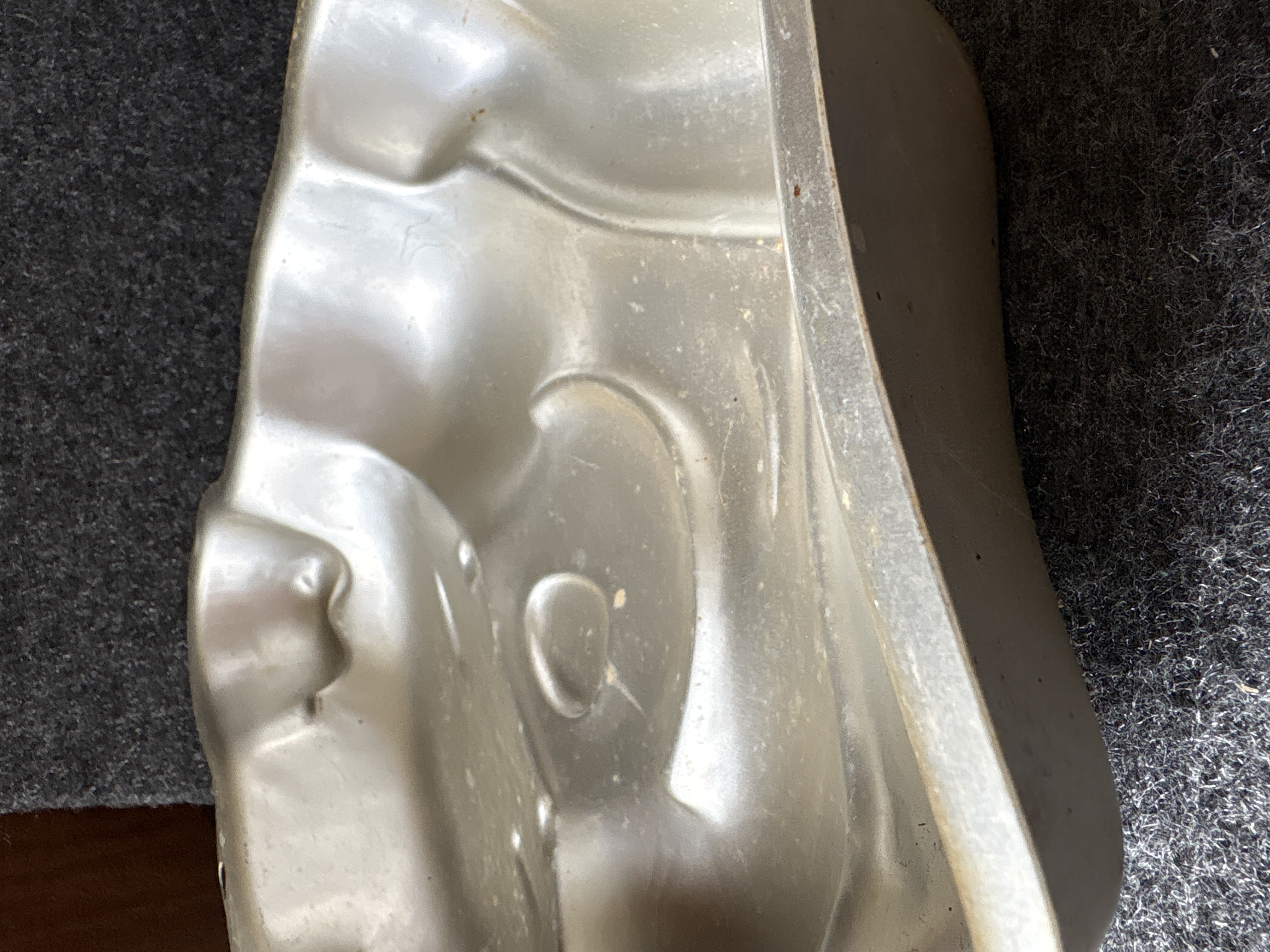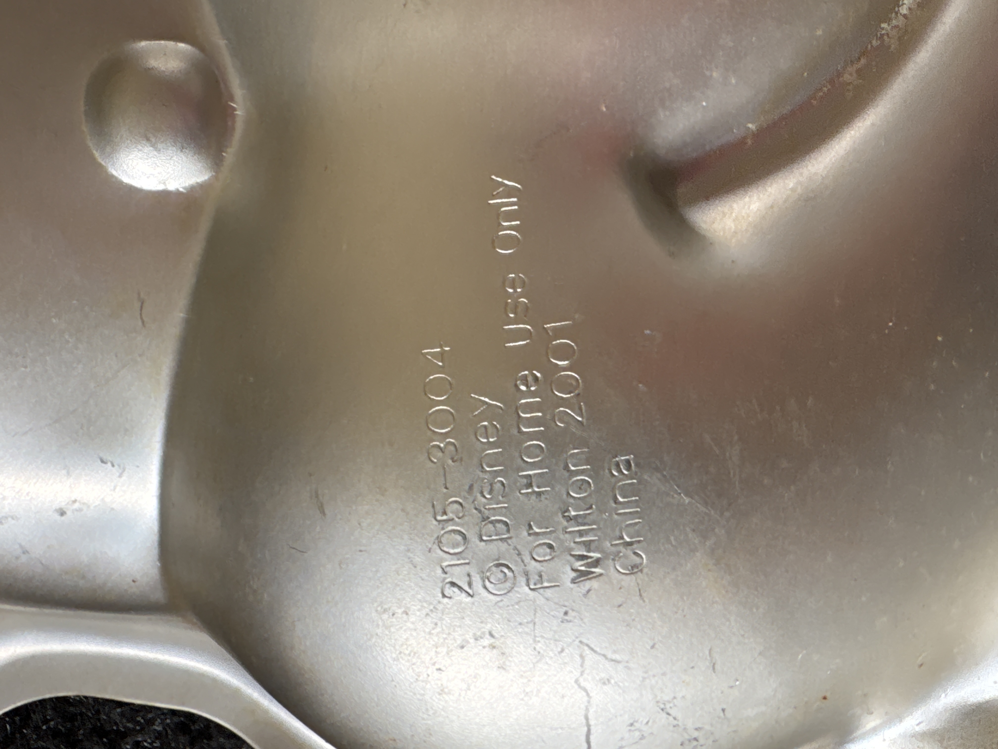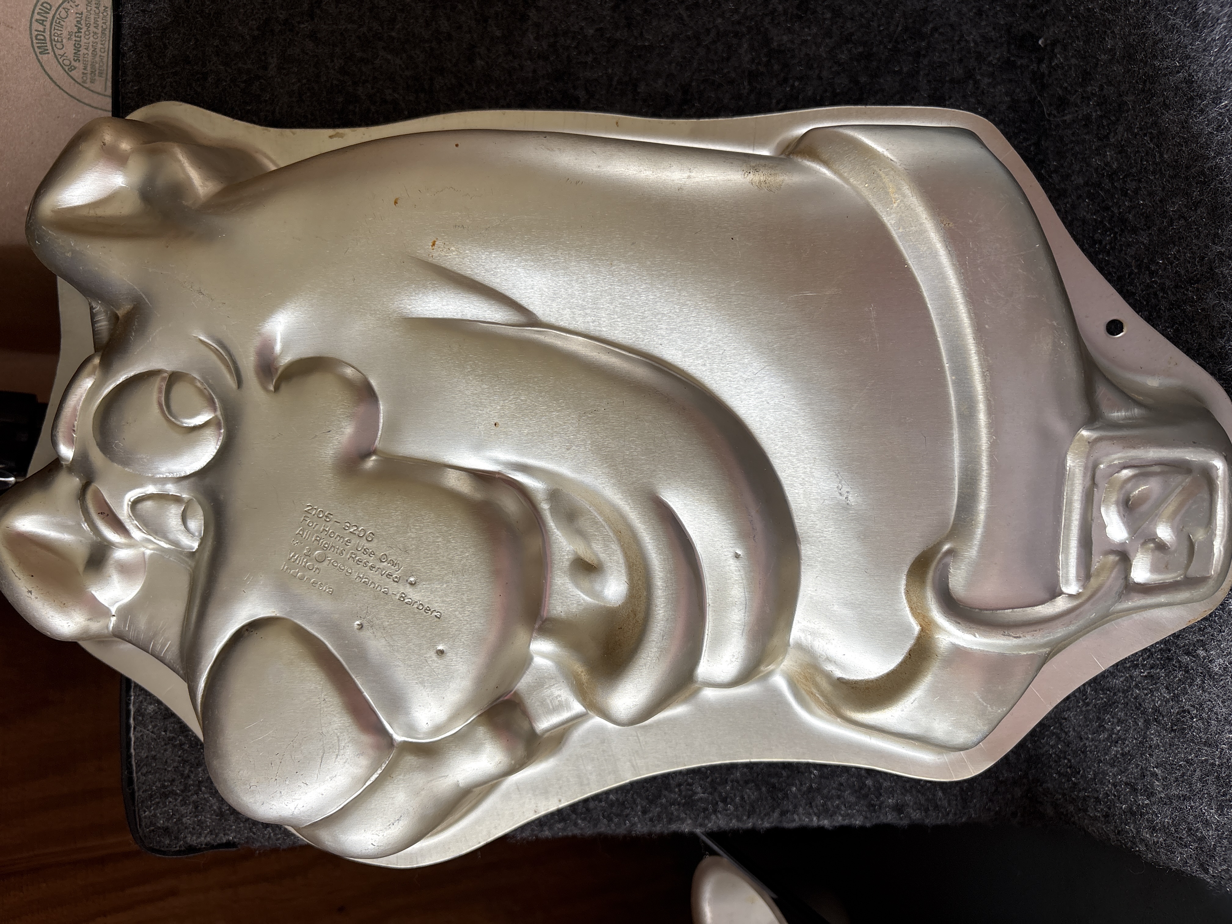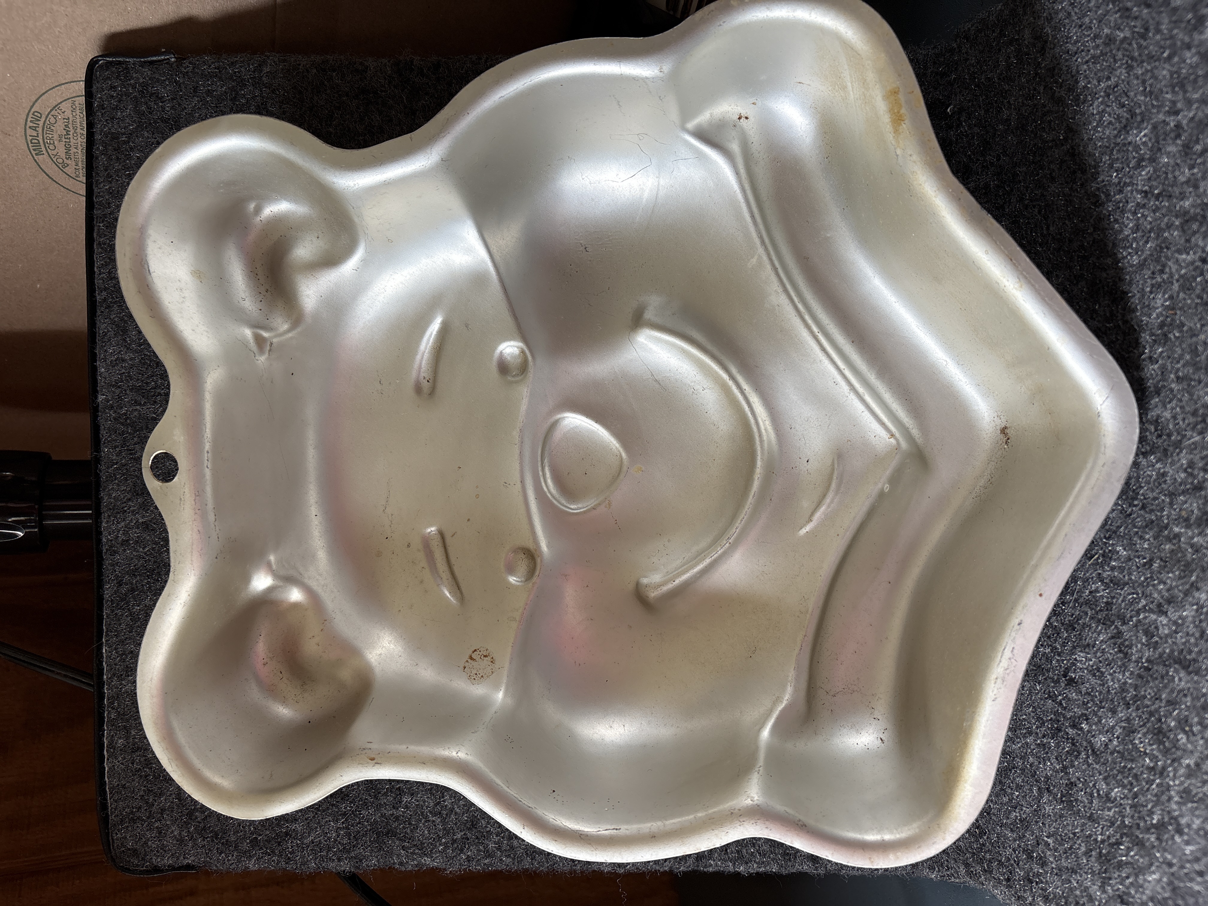 Two silver-colored aluminum character cake pans featuring a 2001 Disney Winnie the Pooh and a 1999 Hanna-Barbera Scooby-Doo.