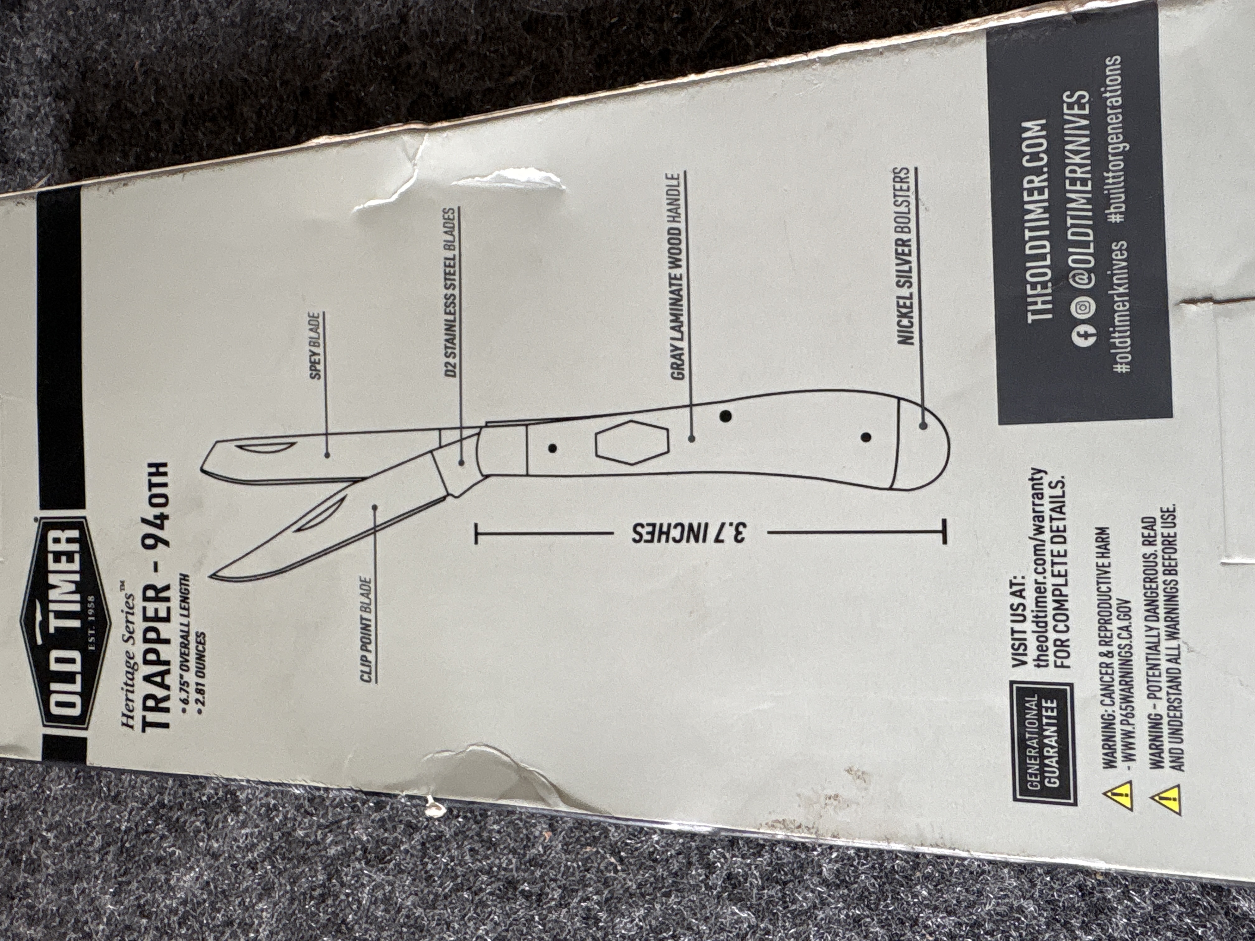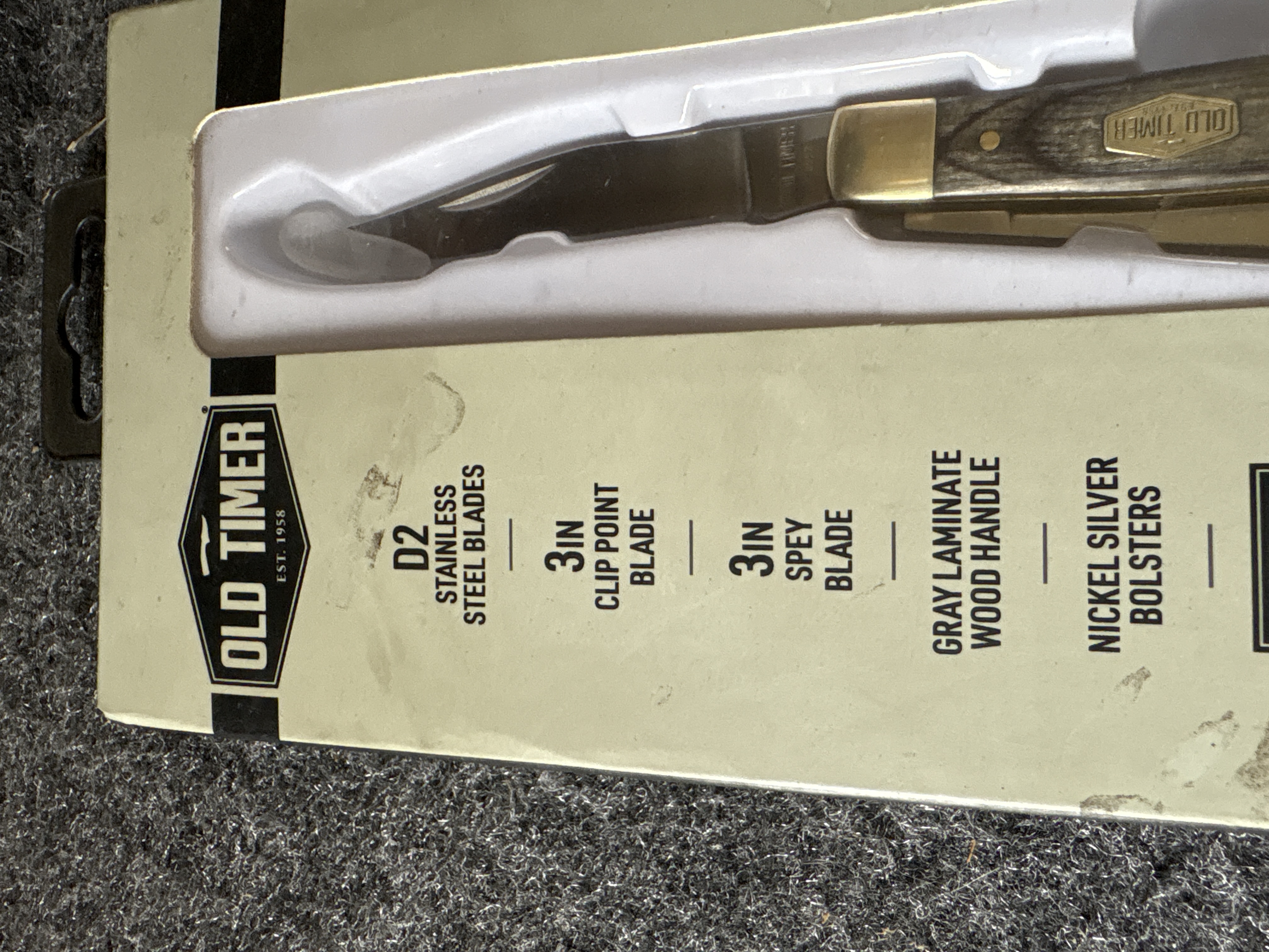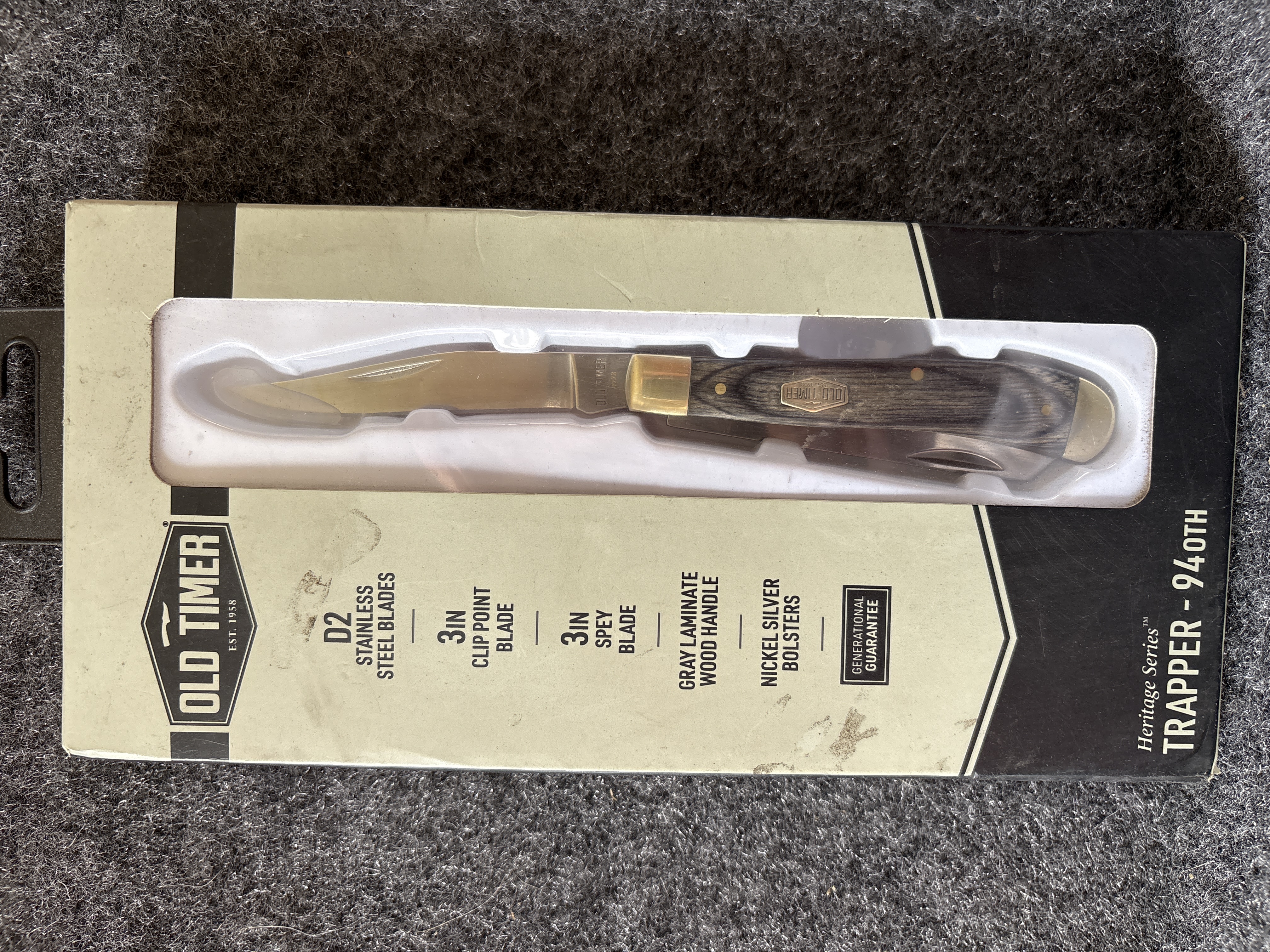 An Old Timer Heritage Series Trapper 94OTH folding knife featuring two 3 inch D2 stainless steel blades, gray laminate wood handles, and nickel silver bolsters, weighing 2.81 ounces and measuring 6.75 inches in total length.