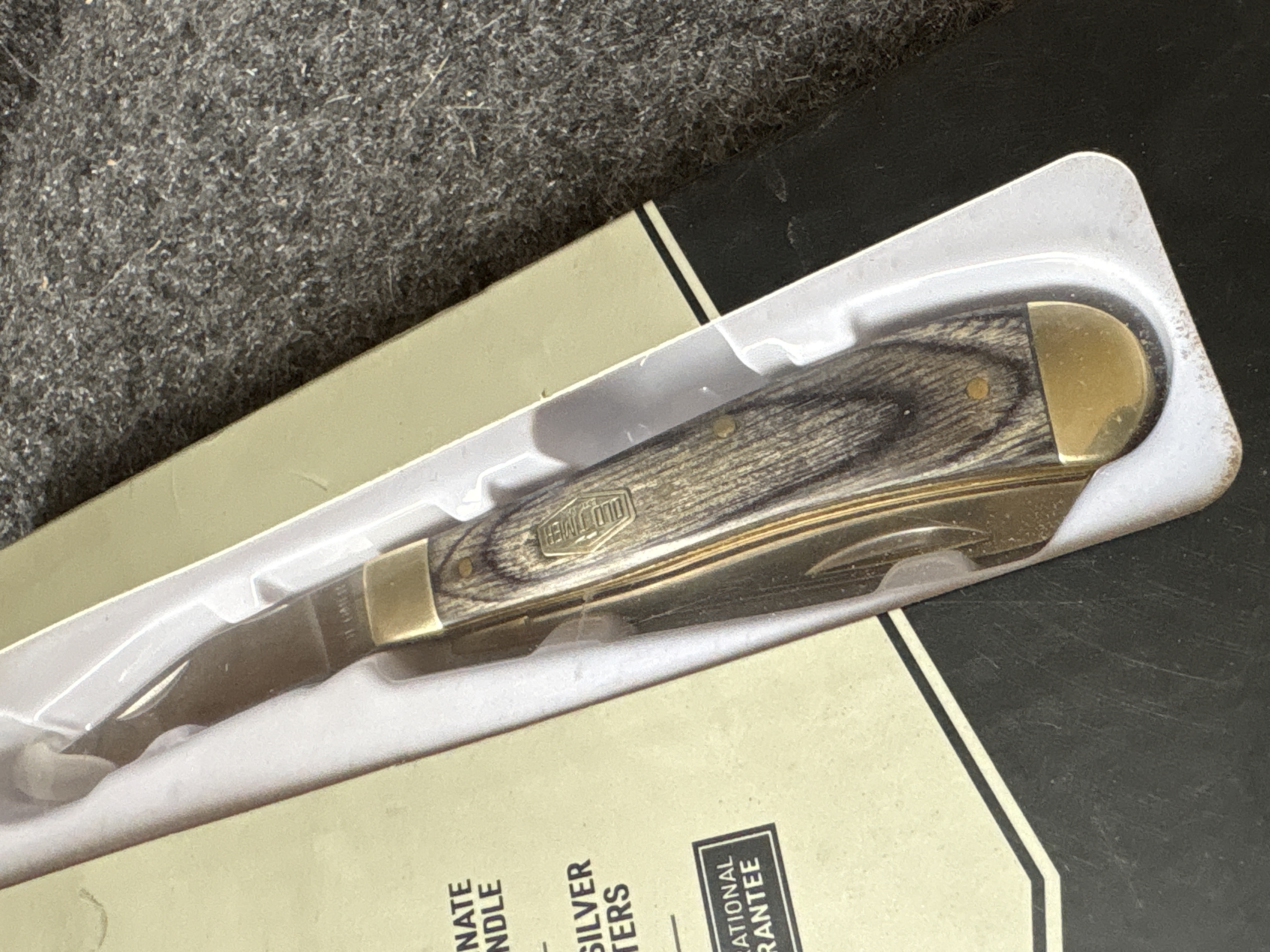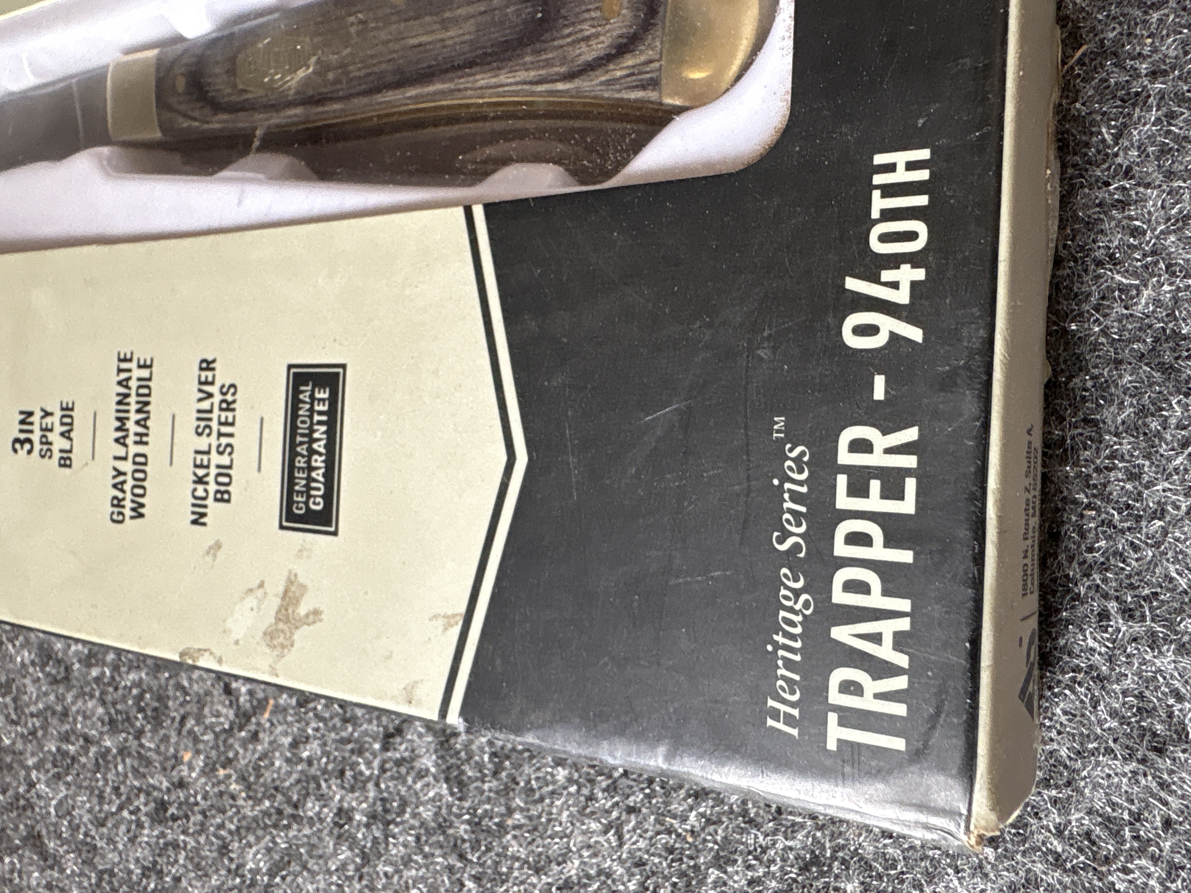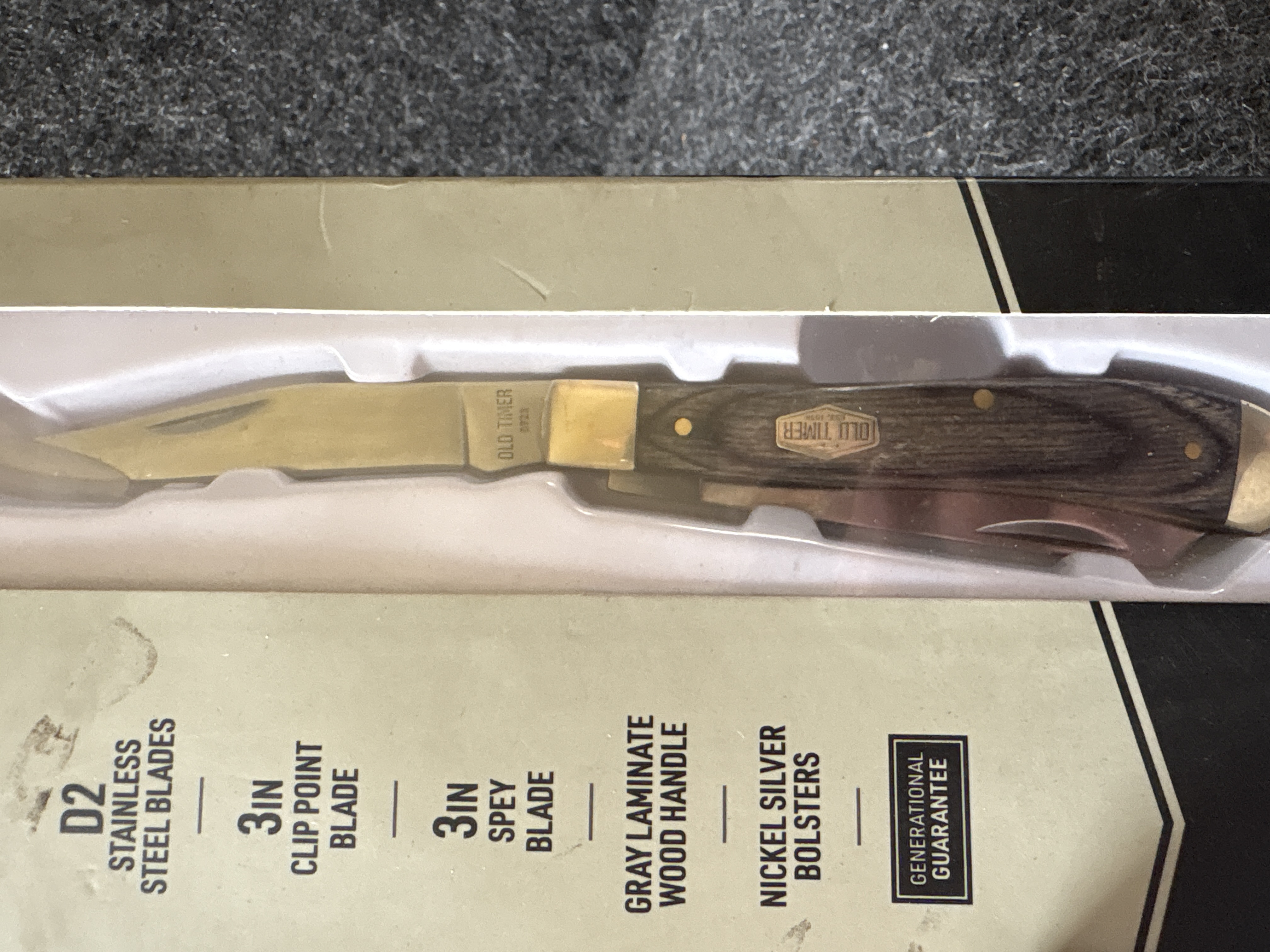 An Old Timer Heritage Series Trapper 94OTH folding knife featuring two 3 inch D2 stainless steel blades, gray laminate wood handles, and nickel silver bolsters, weighing 2.81 ounces and measuring 6.75 inches in total length.