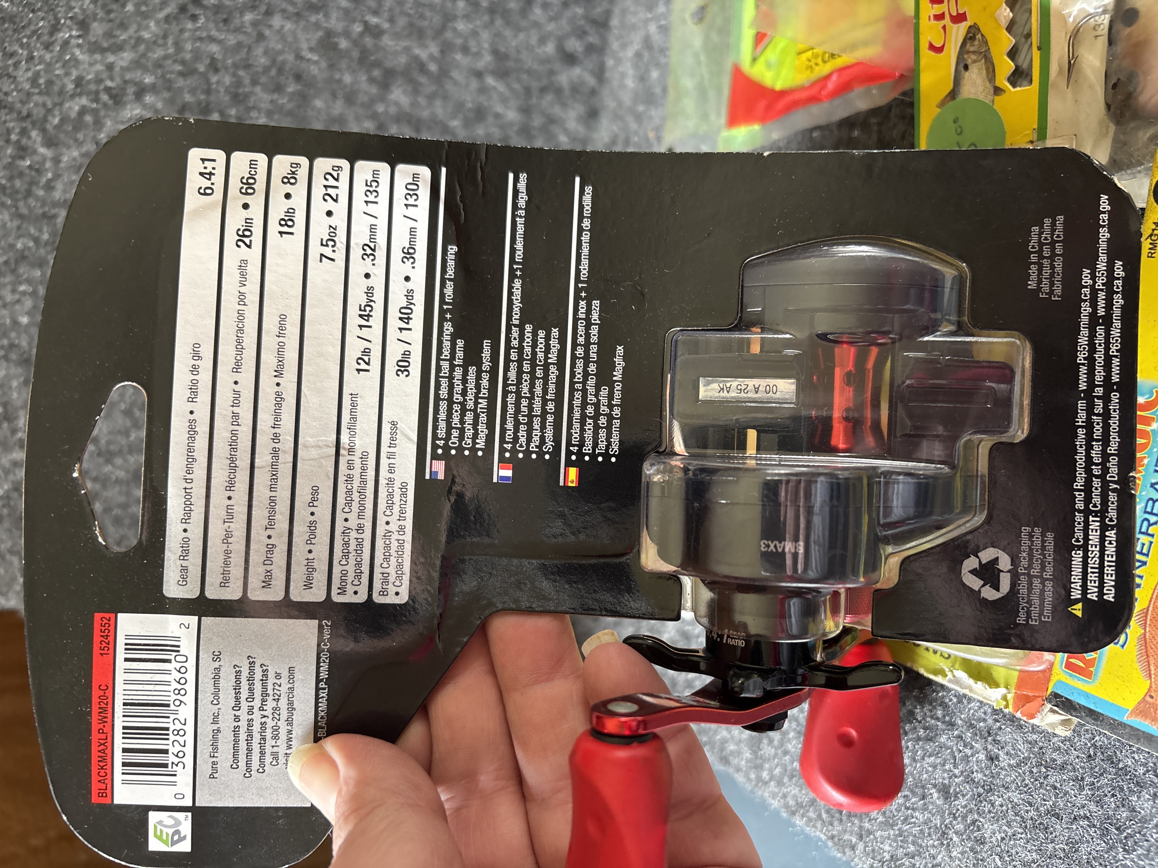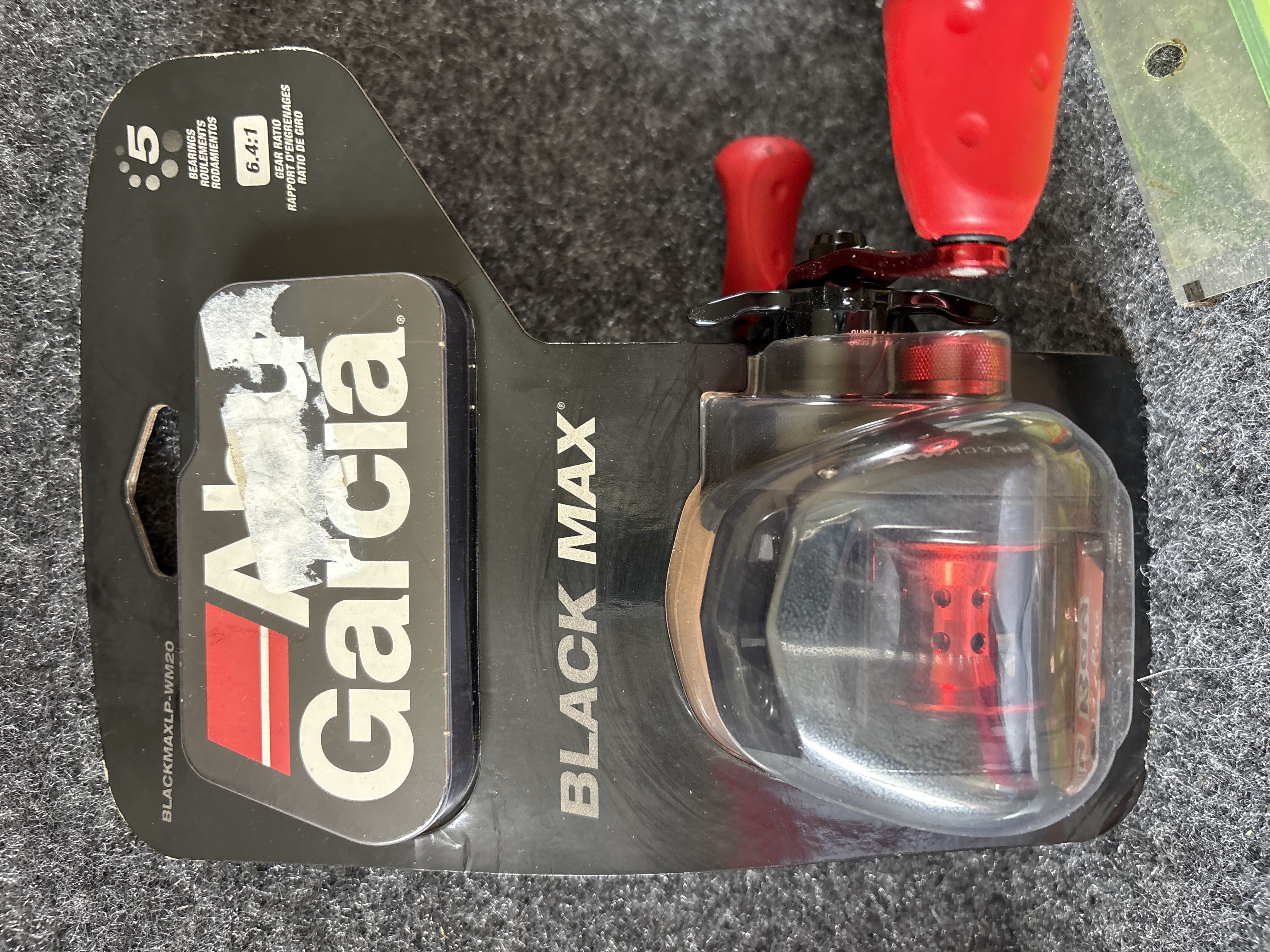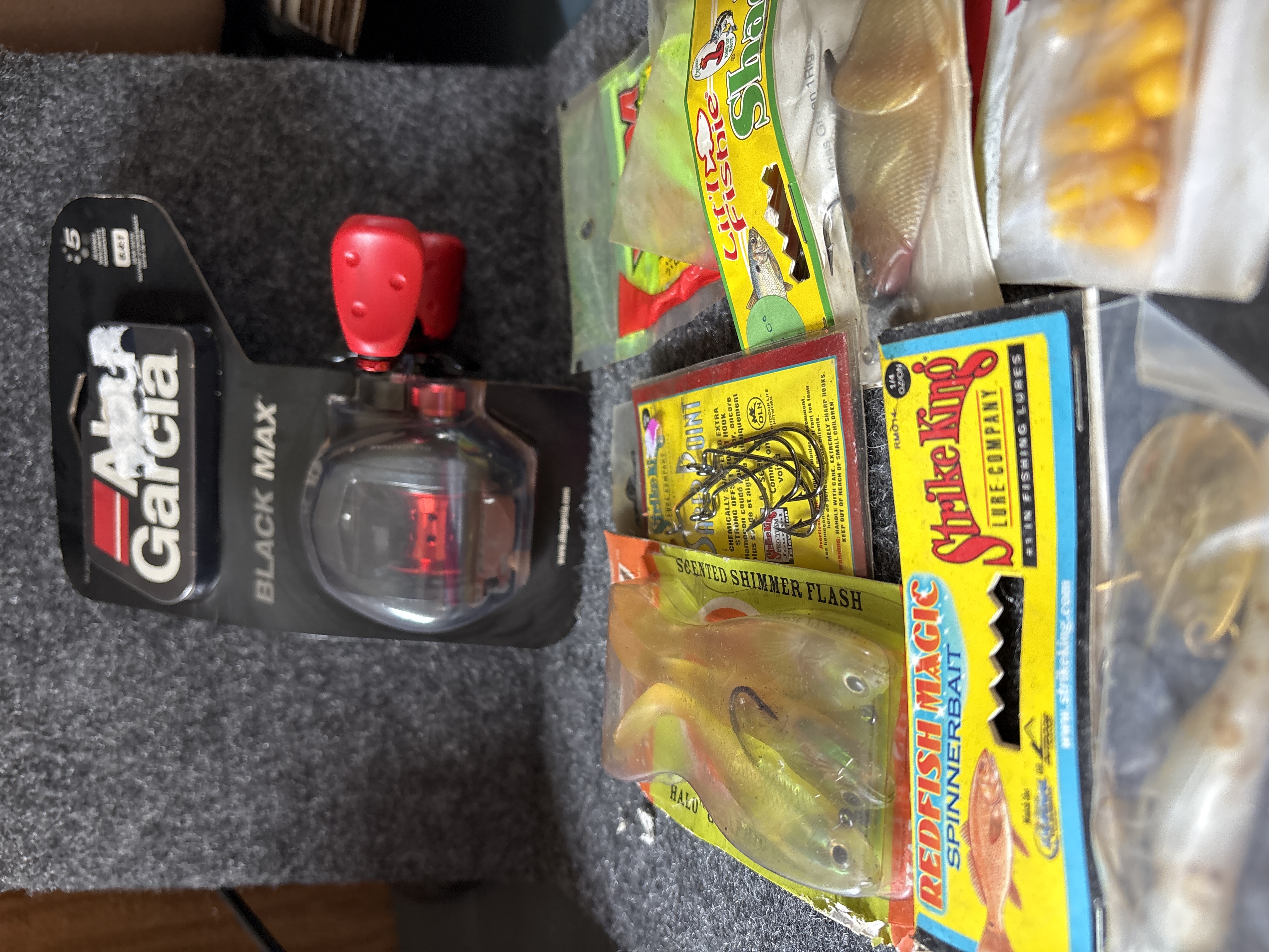 A collection of fishing gear featuring a black and red Abu Garcia Black Max baitcasting reel with a 6.4:1 gear ratio and various packaged lures and hooks from brands including Strike King, YUM, and Creme.