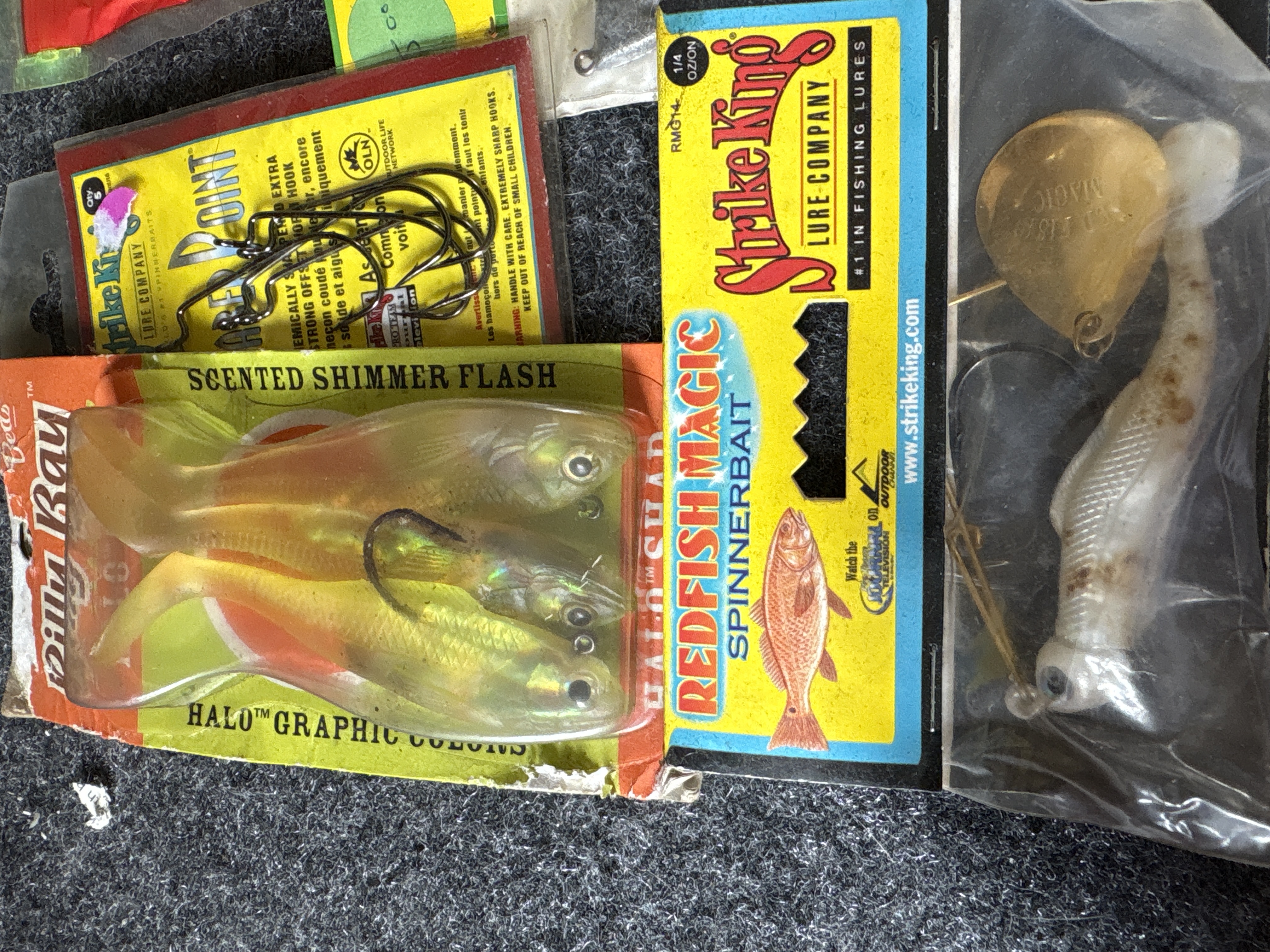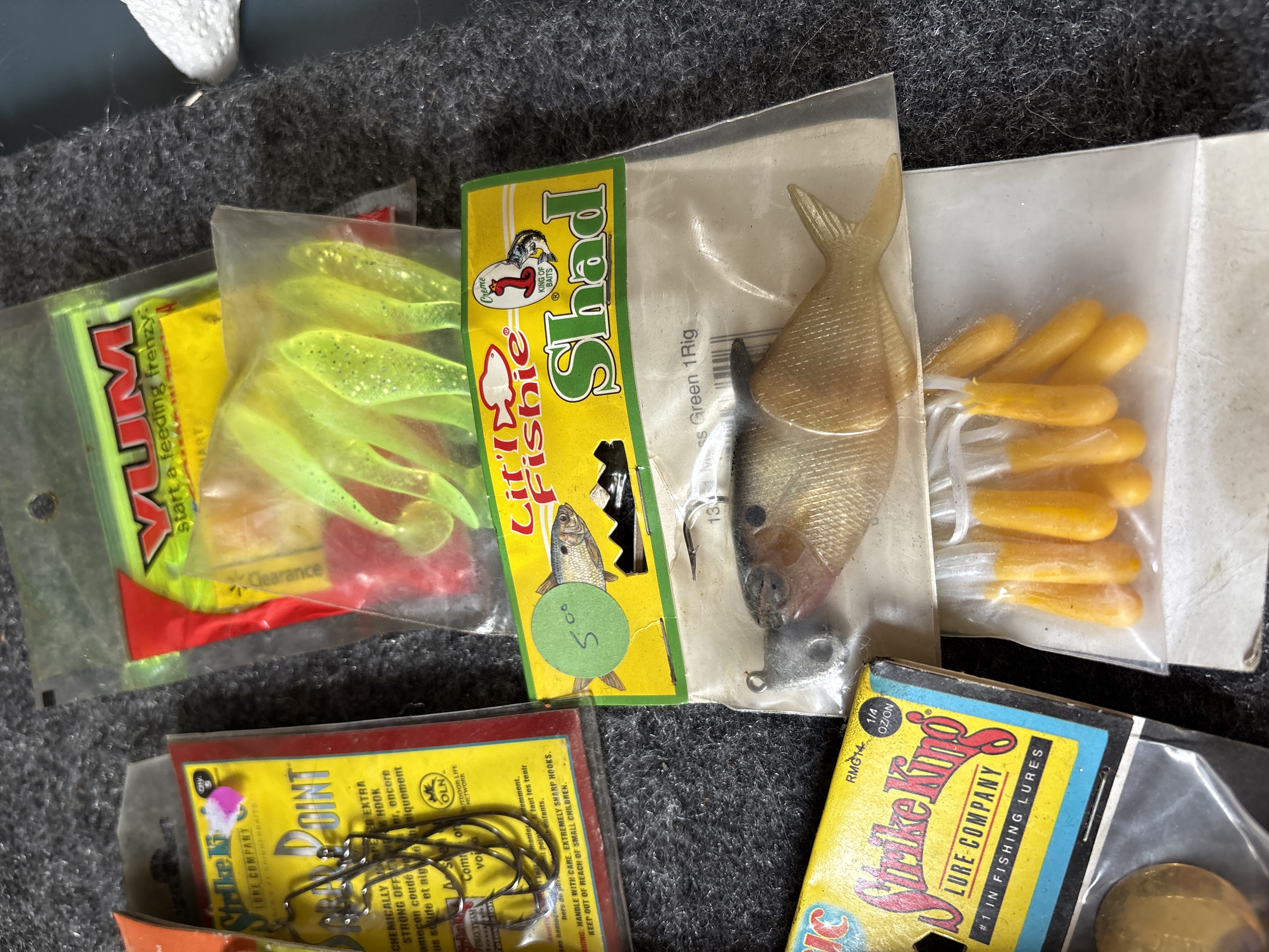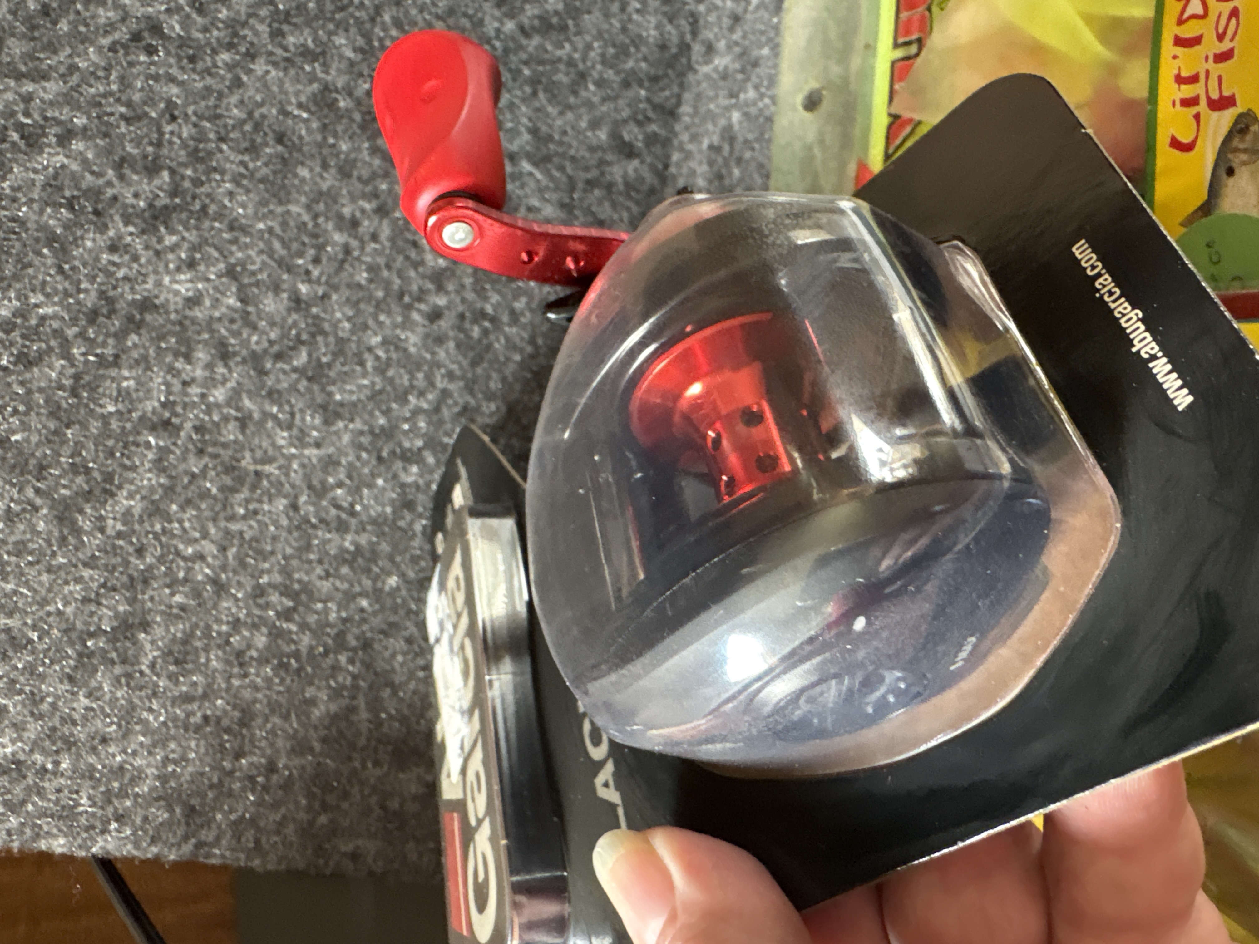 A collection of fishing gear featuring a black and red Abu Garcia Black Max baitcasting reel with a 6.4:1 gear ratio and various packaged lures and hooks from brands including Strike King, YUM, and Creme.