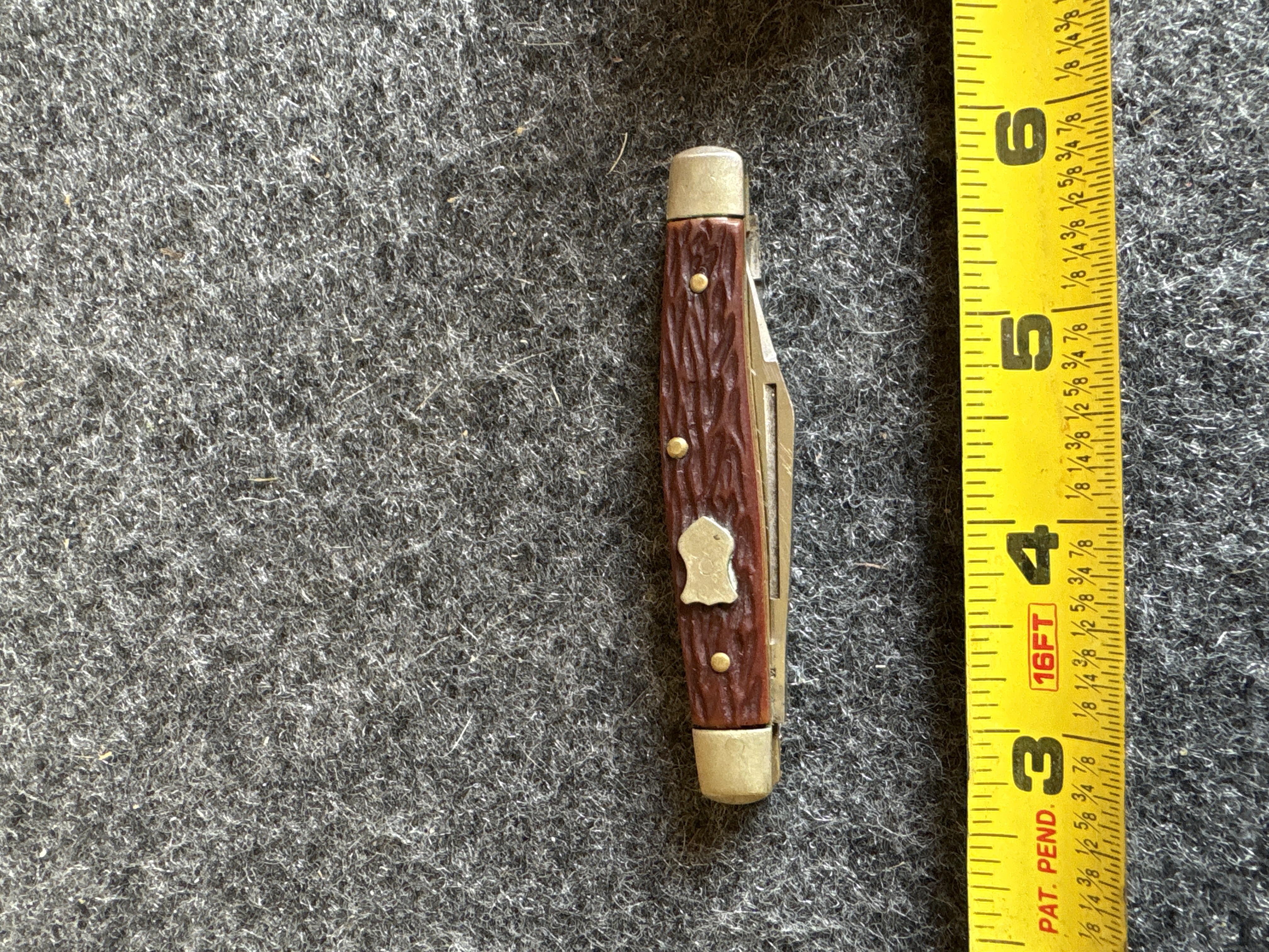 A three blade folding pocket knife featuring textured reddish brown handles, brass bolsters, and a blade tang stamped with ERN and a crown logo, measuring approximately 3.25 inches when closed.