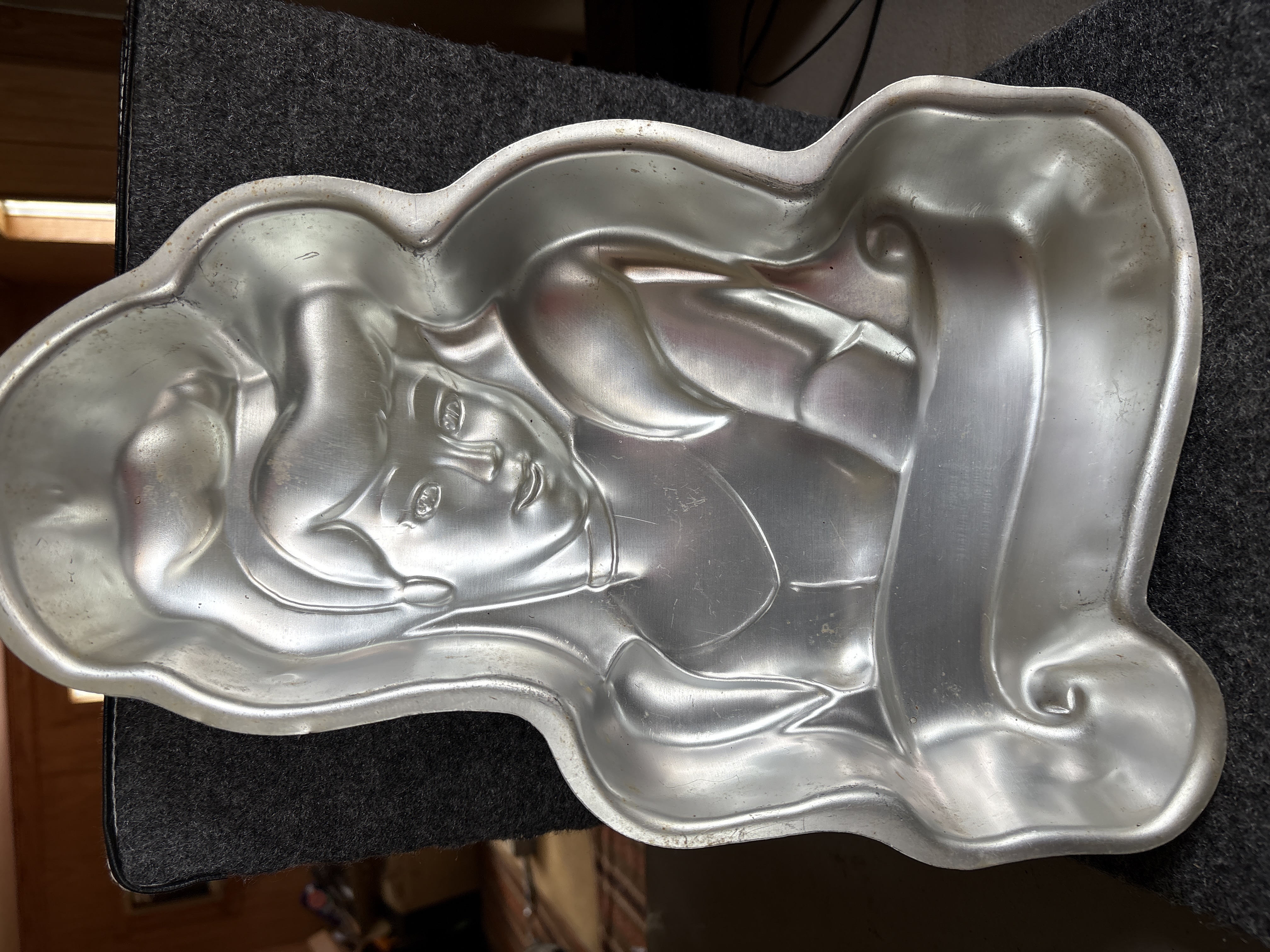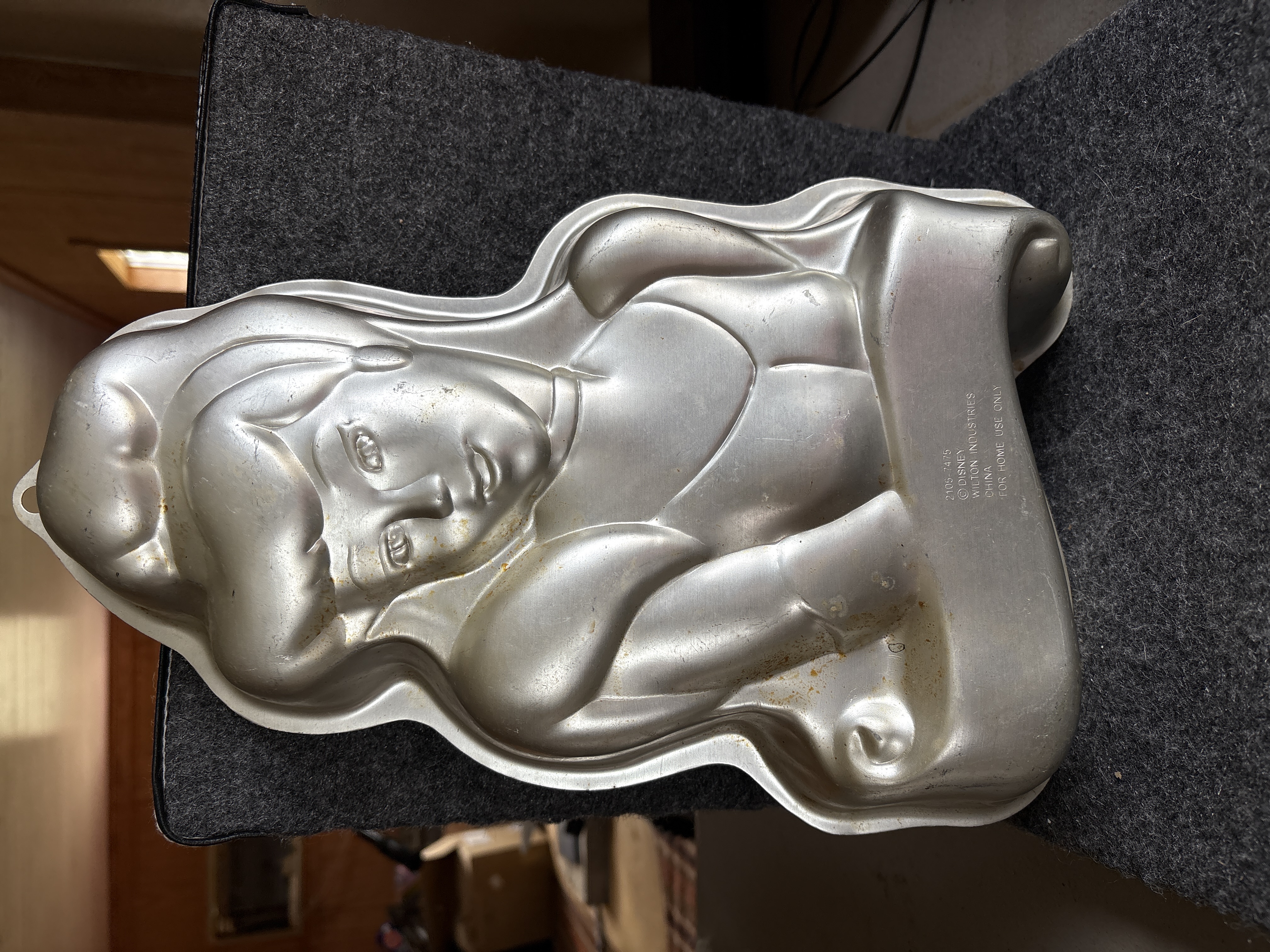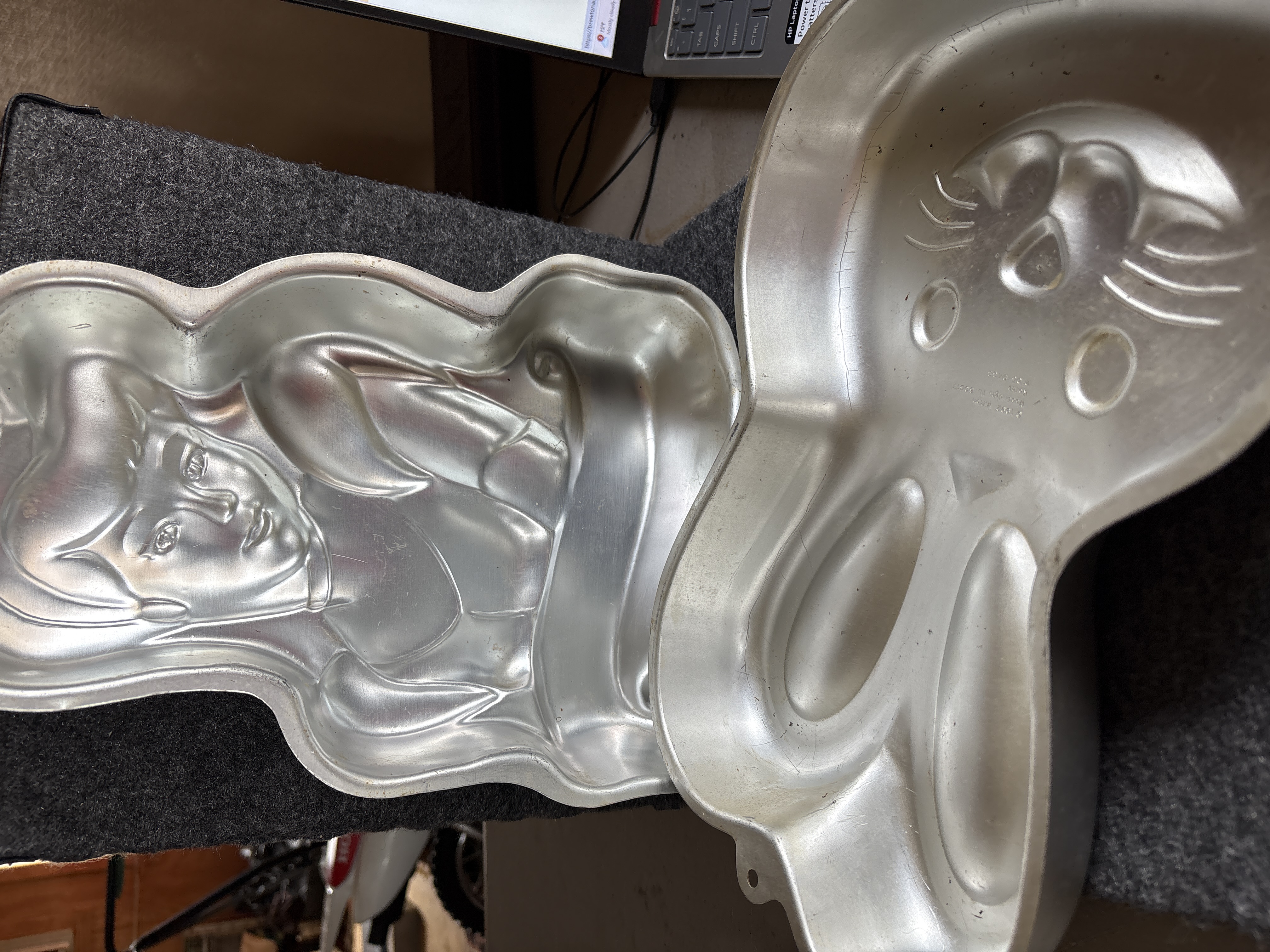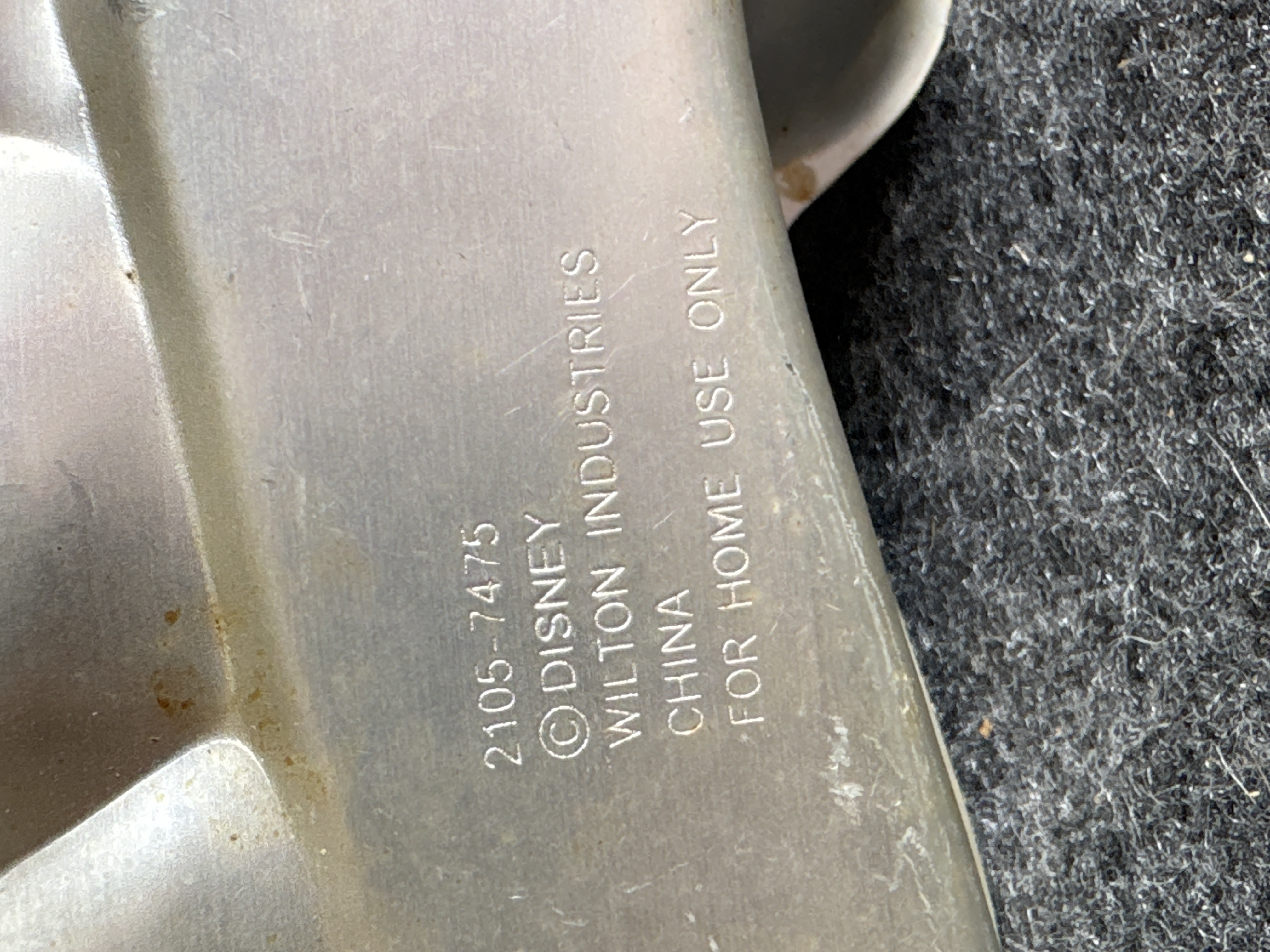 A collection of silver-colored aluminum character cake pans including a Disney Princess Jasmine mold marked 2105-7475 and a 1992 Wilton bunny-shaped mold marked 2105-9438.