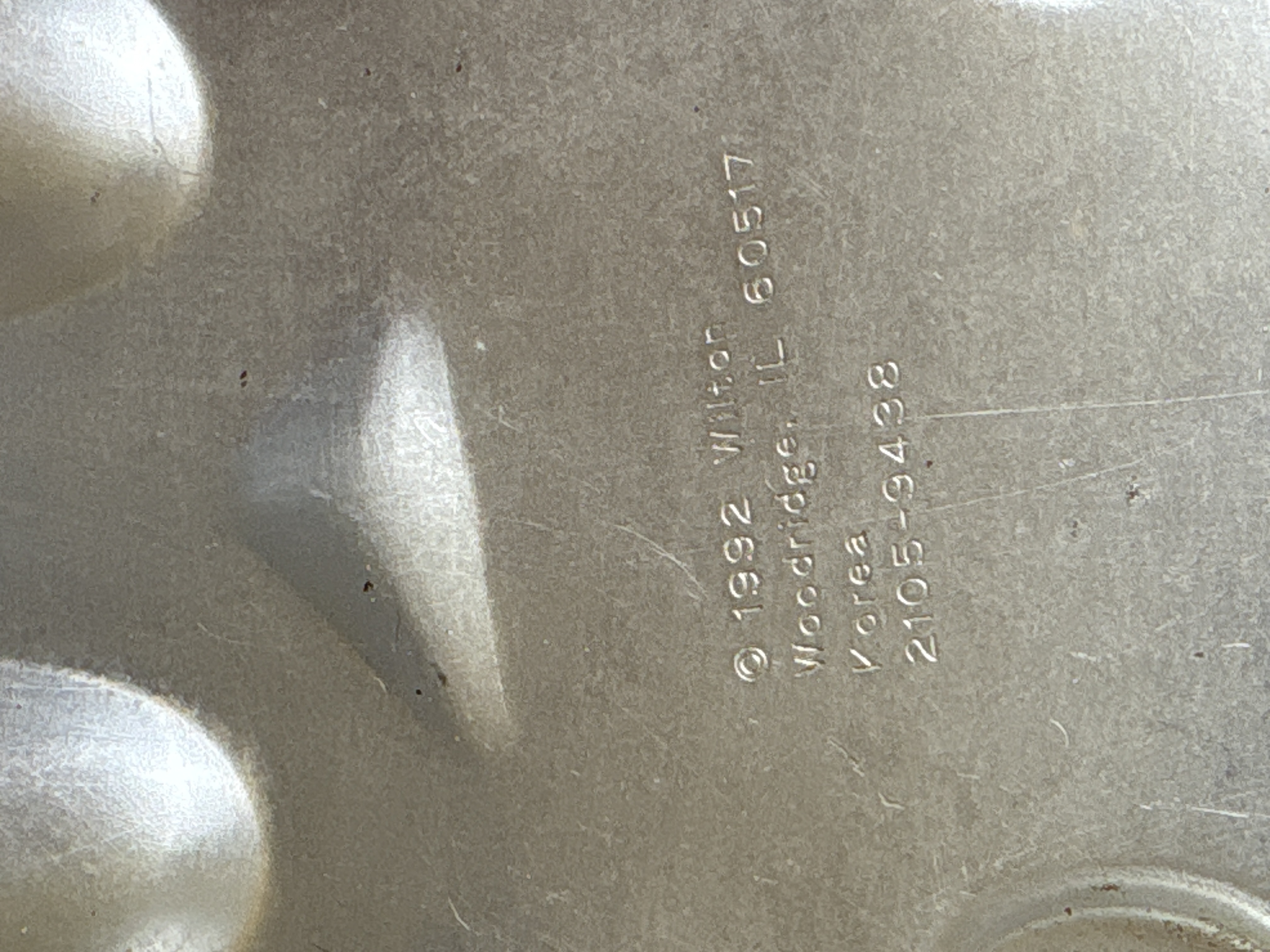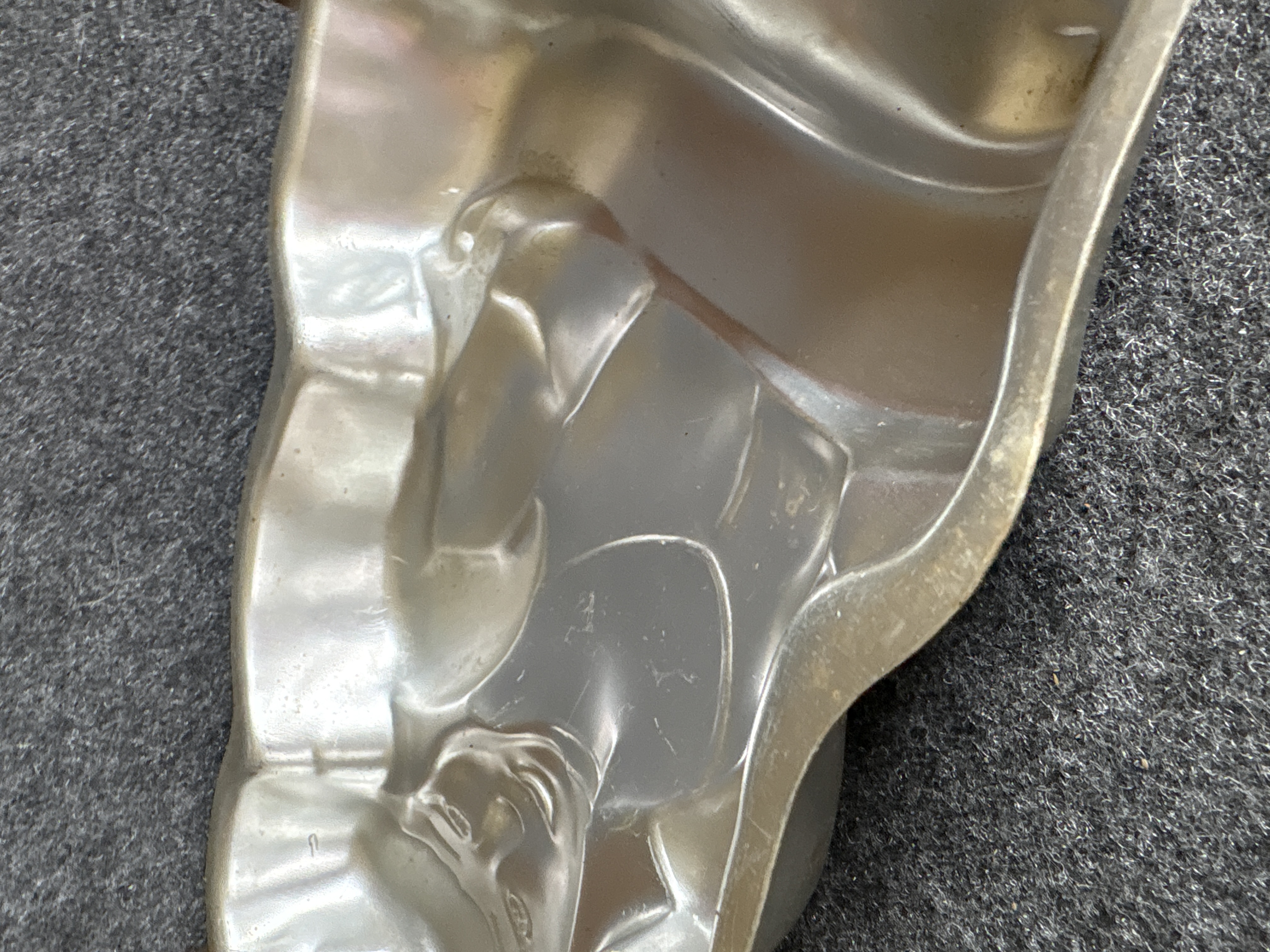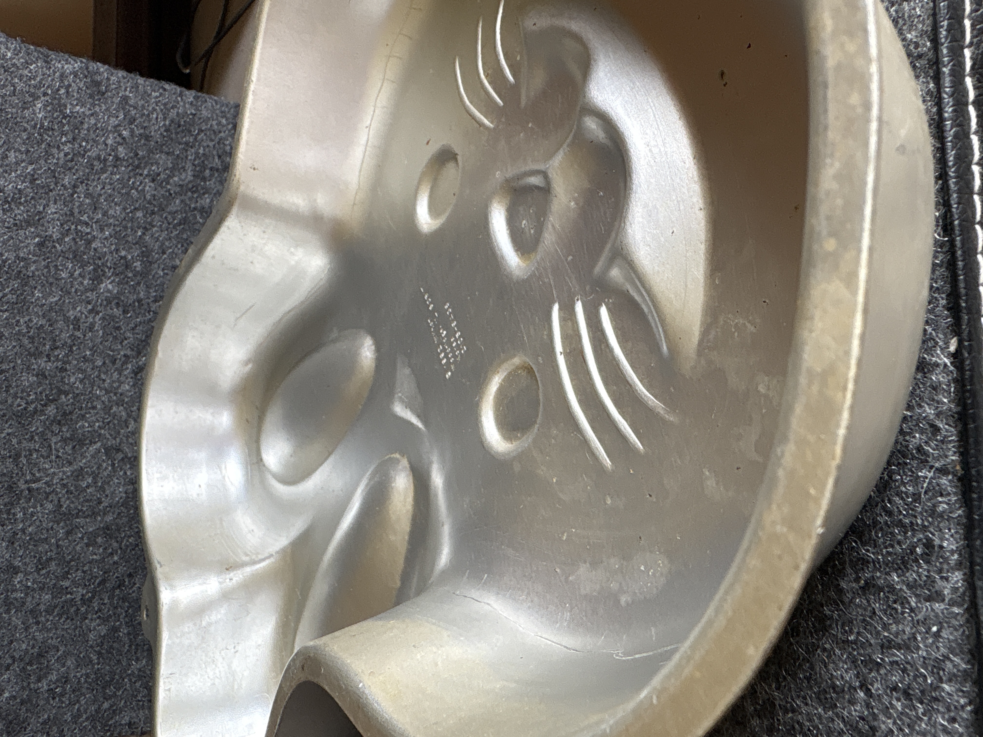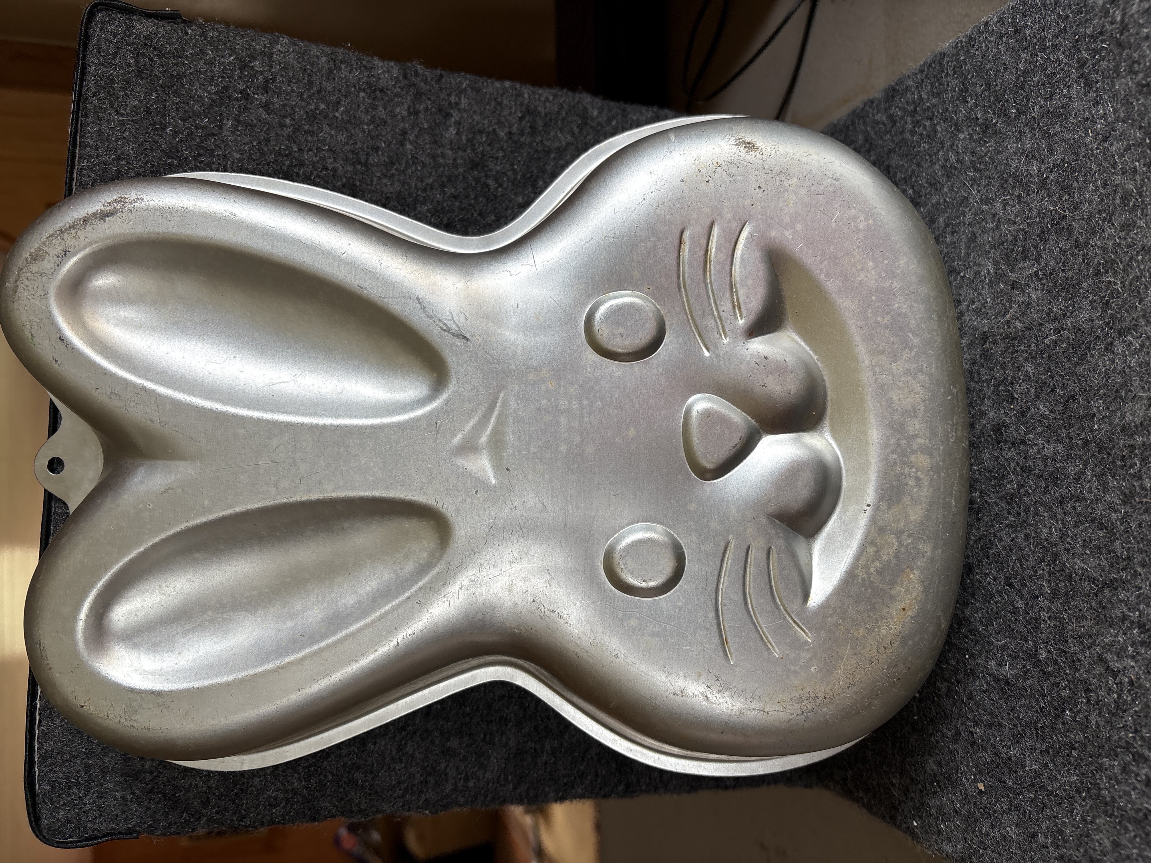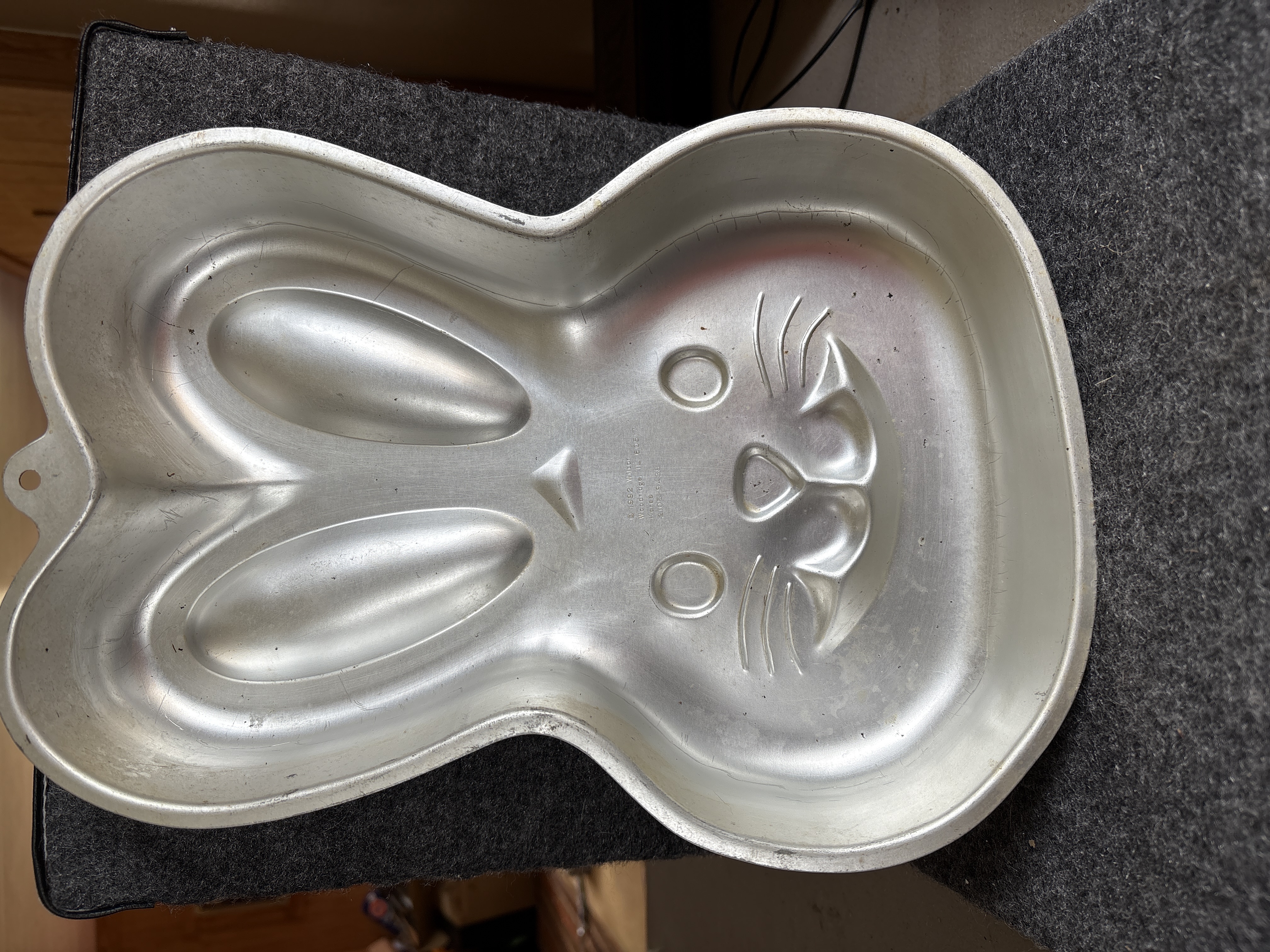 A collection of silver-colored aluminum character cake pans including a Disney Princess Jasmine mold marked 2105-7475 and a 1992 Wilton bunny-shaped mold marked 2105-9438.