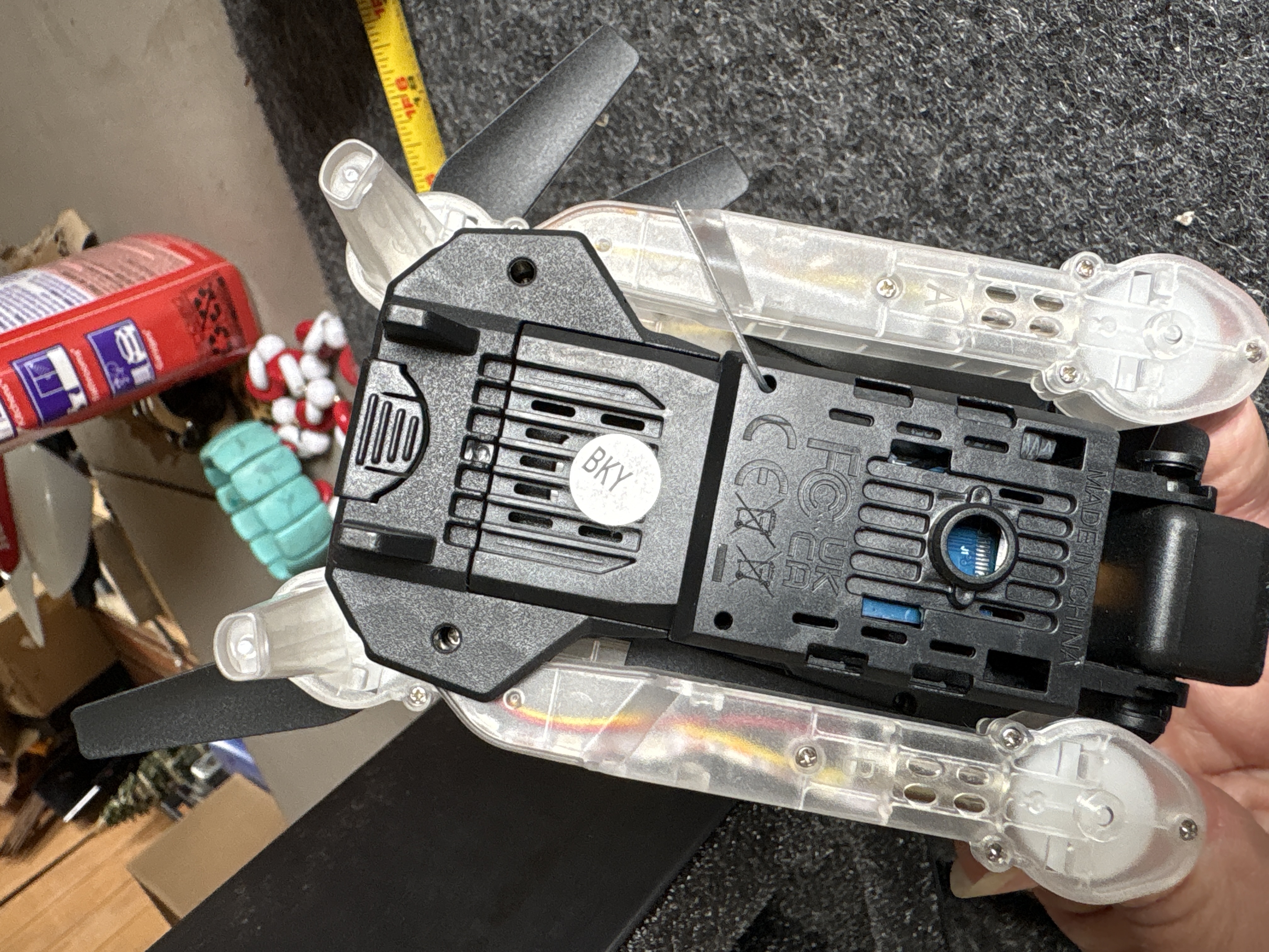 A collection of hobbyist drone equipment featuring a black and clear quadcopter with a BKY sticker, a black remote controller, a white USB cable, and instruction manuals, with the drone measuring approximately 5 inches in length.