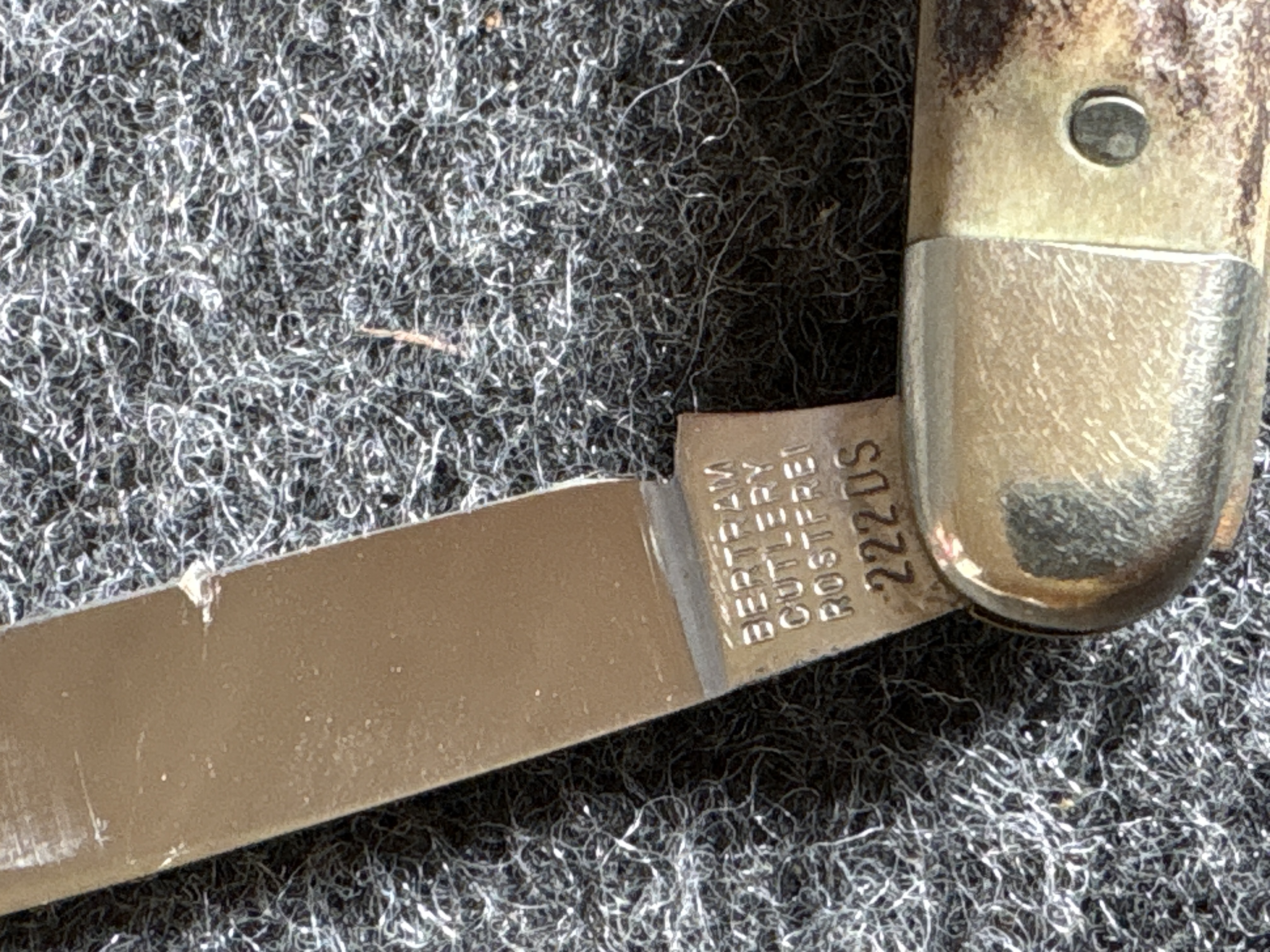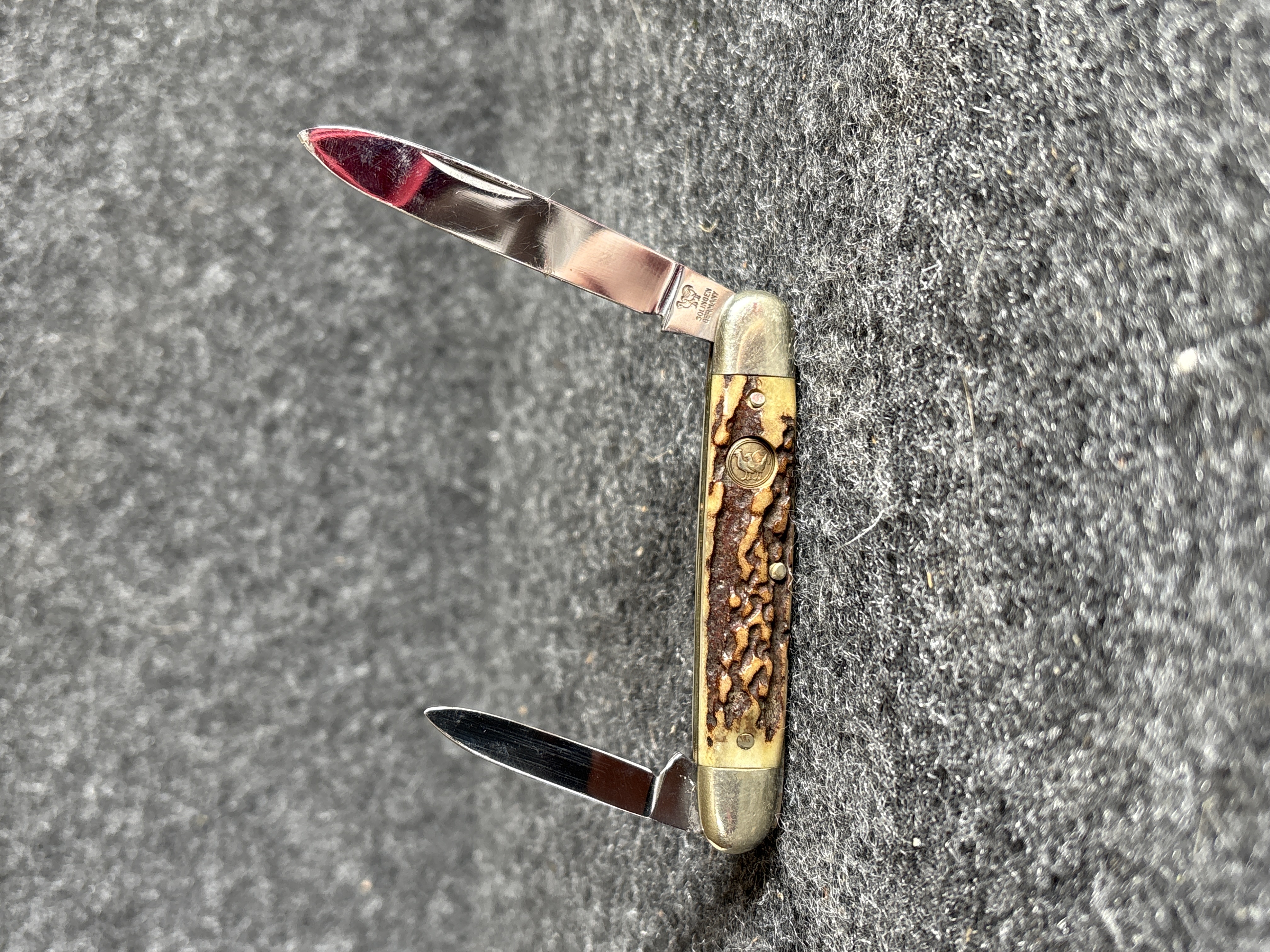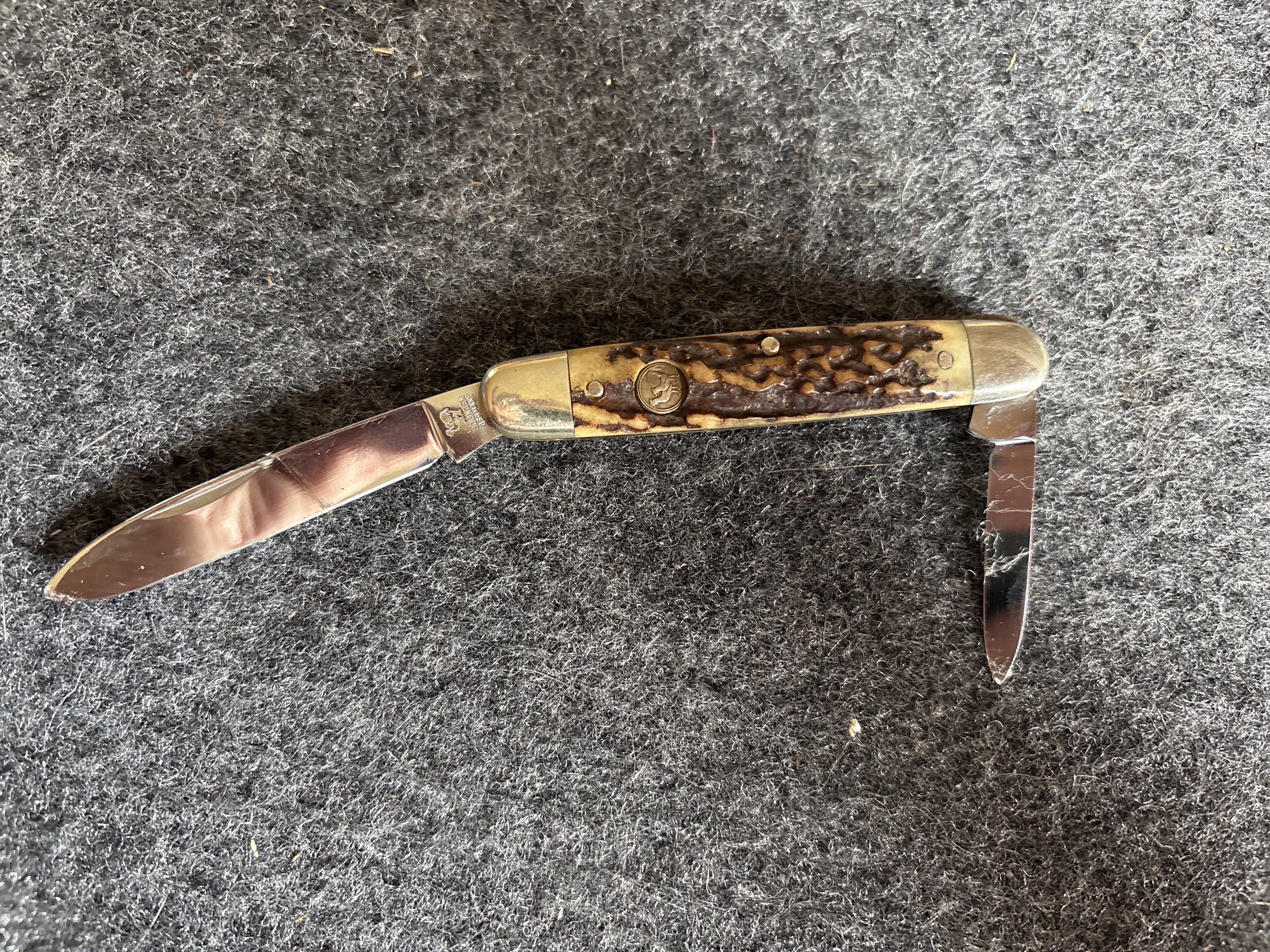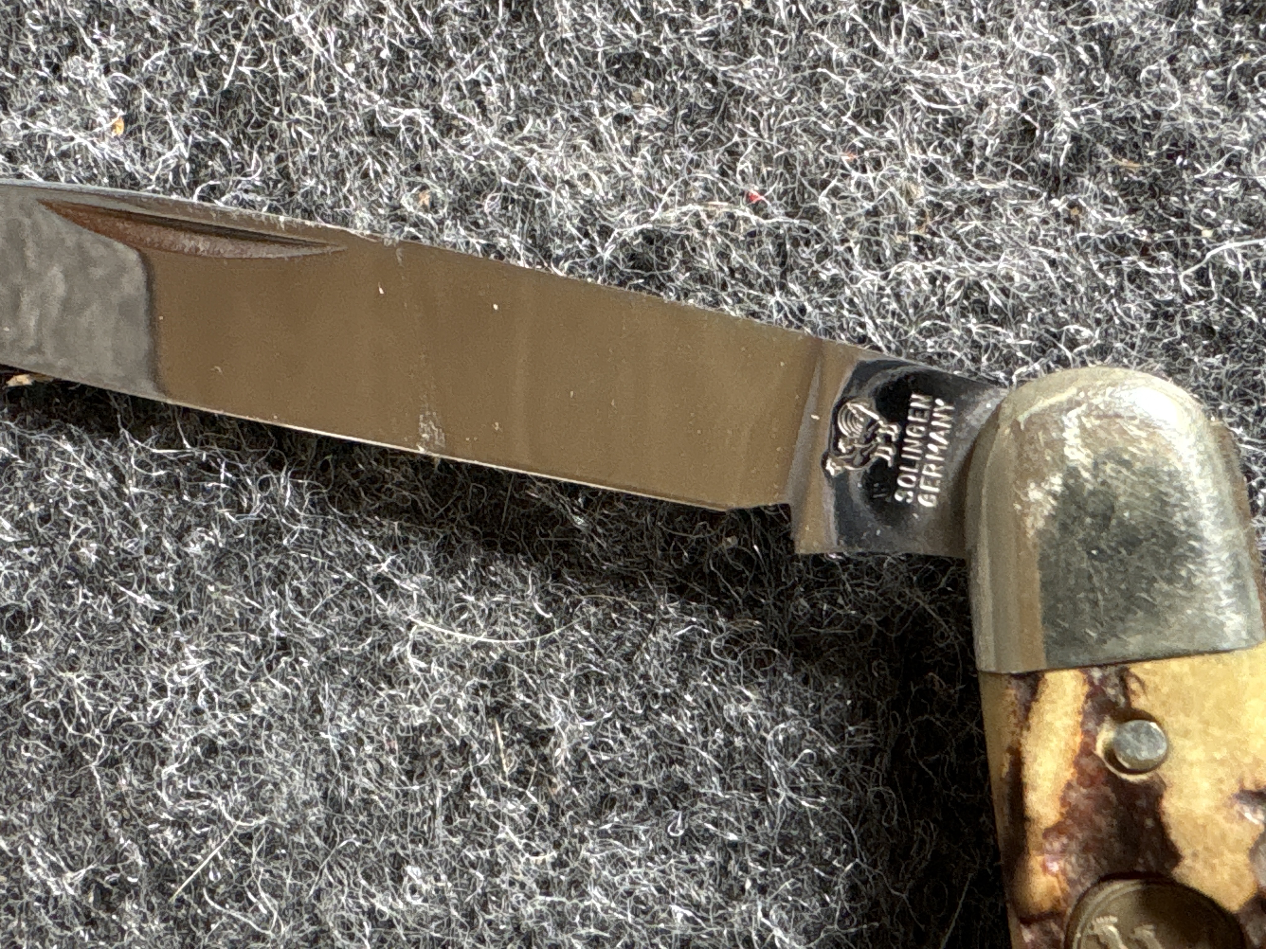 A two-blade folding pocket knife featuring genuine stag handles with an inlaid bird logo, stamped Bertram Cutlery Solingen Germany 222DS, measuring approximately 3.5 inches when closed.