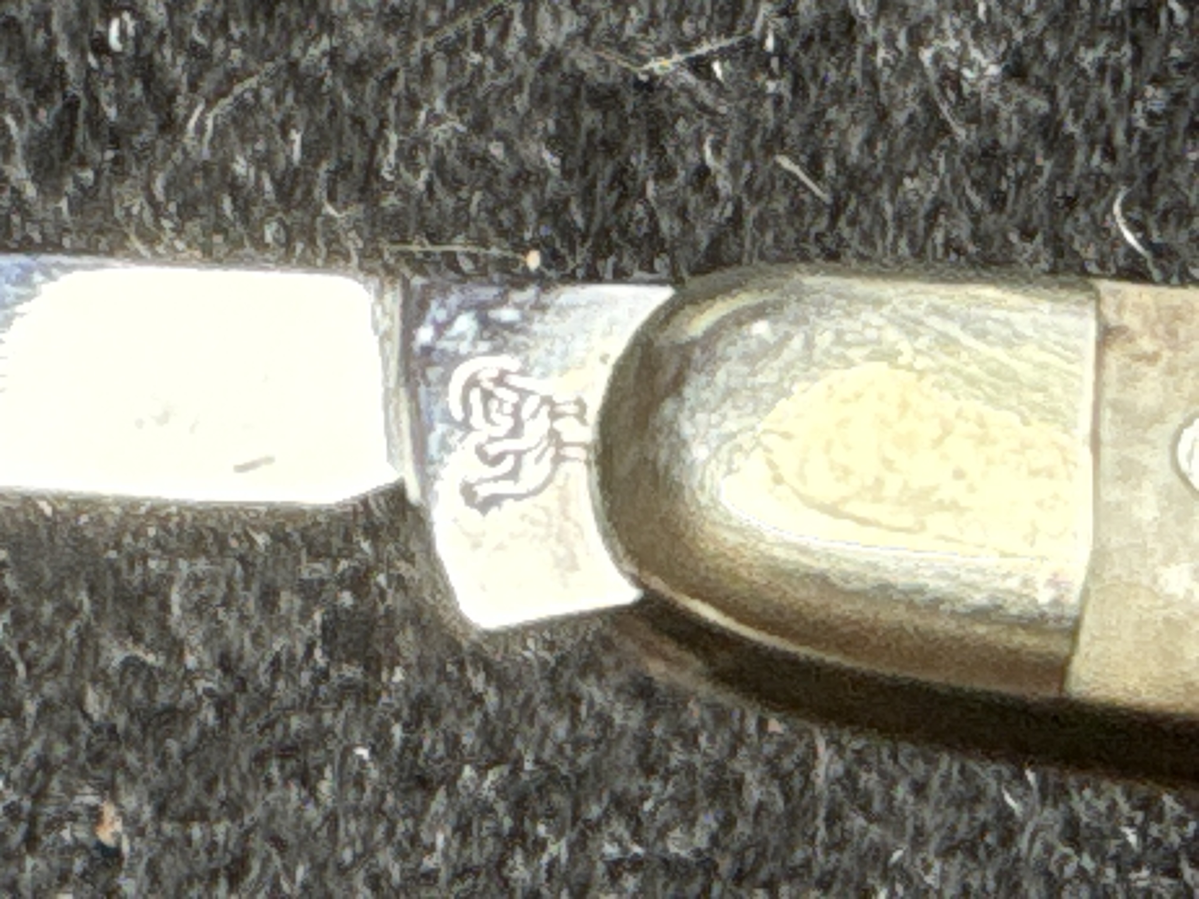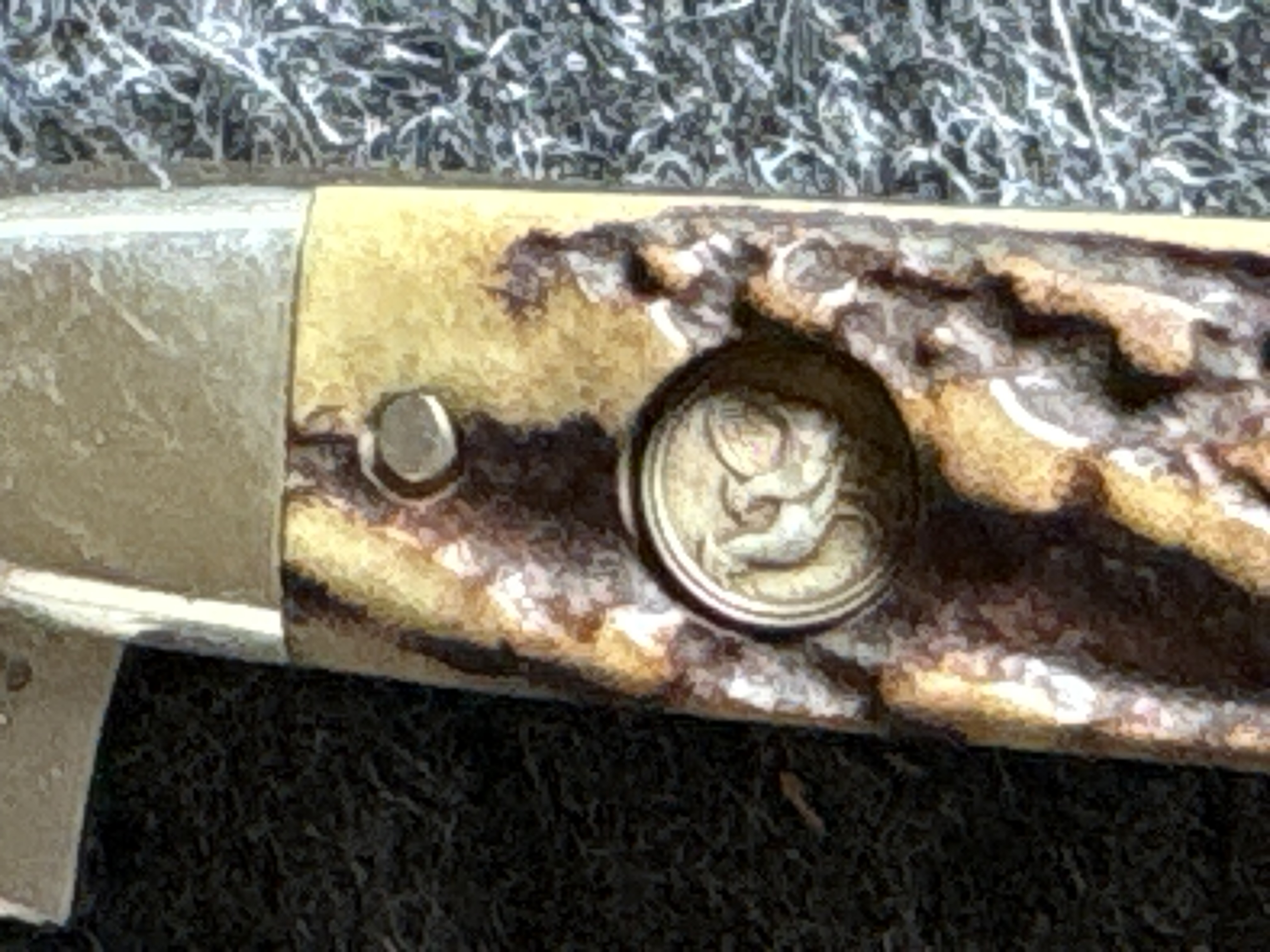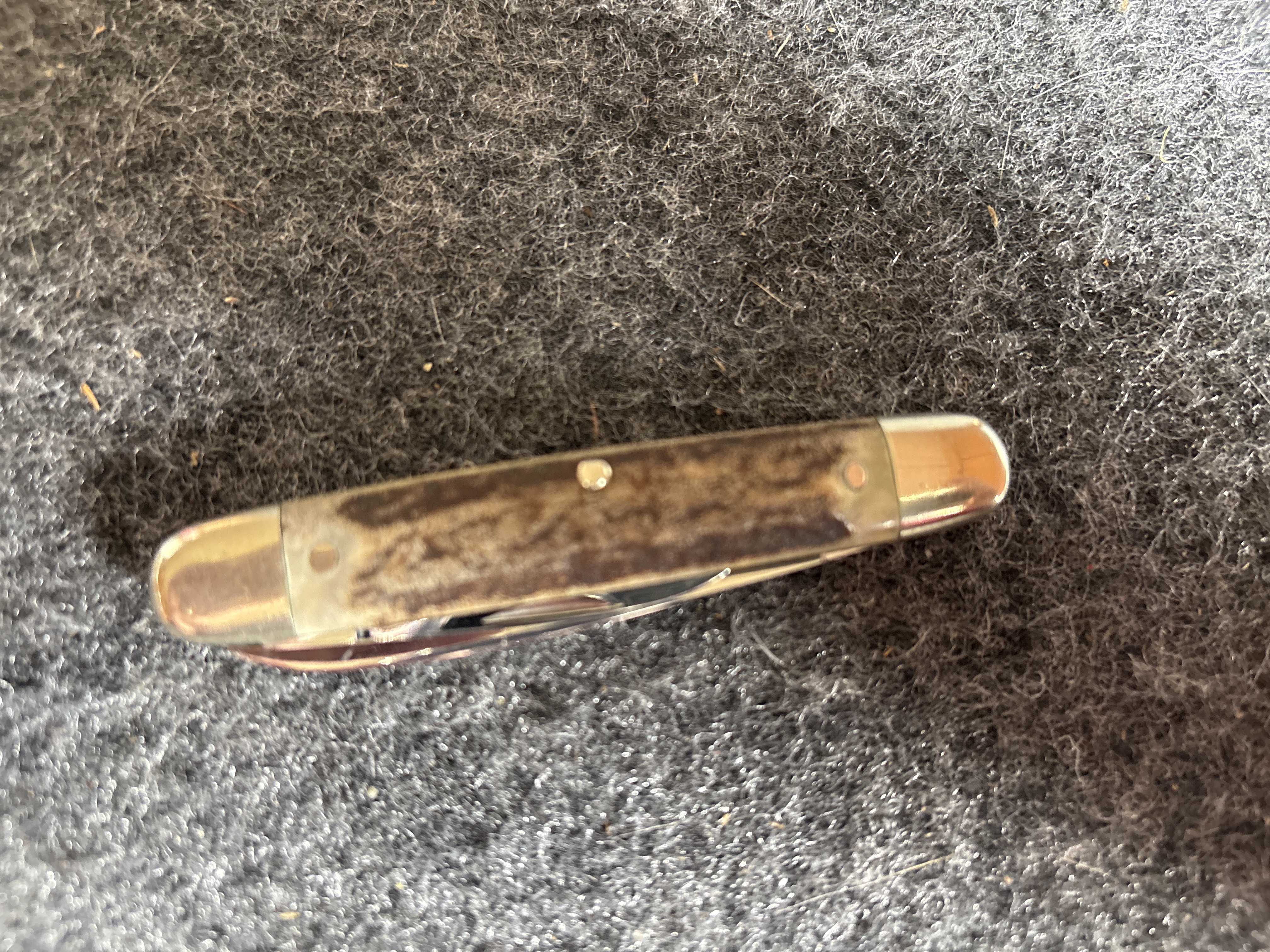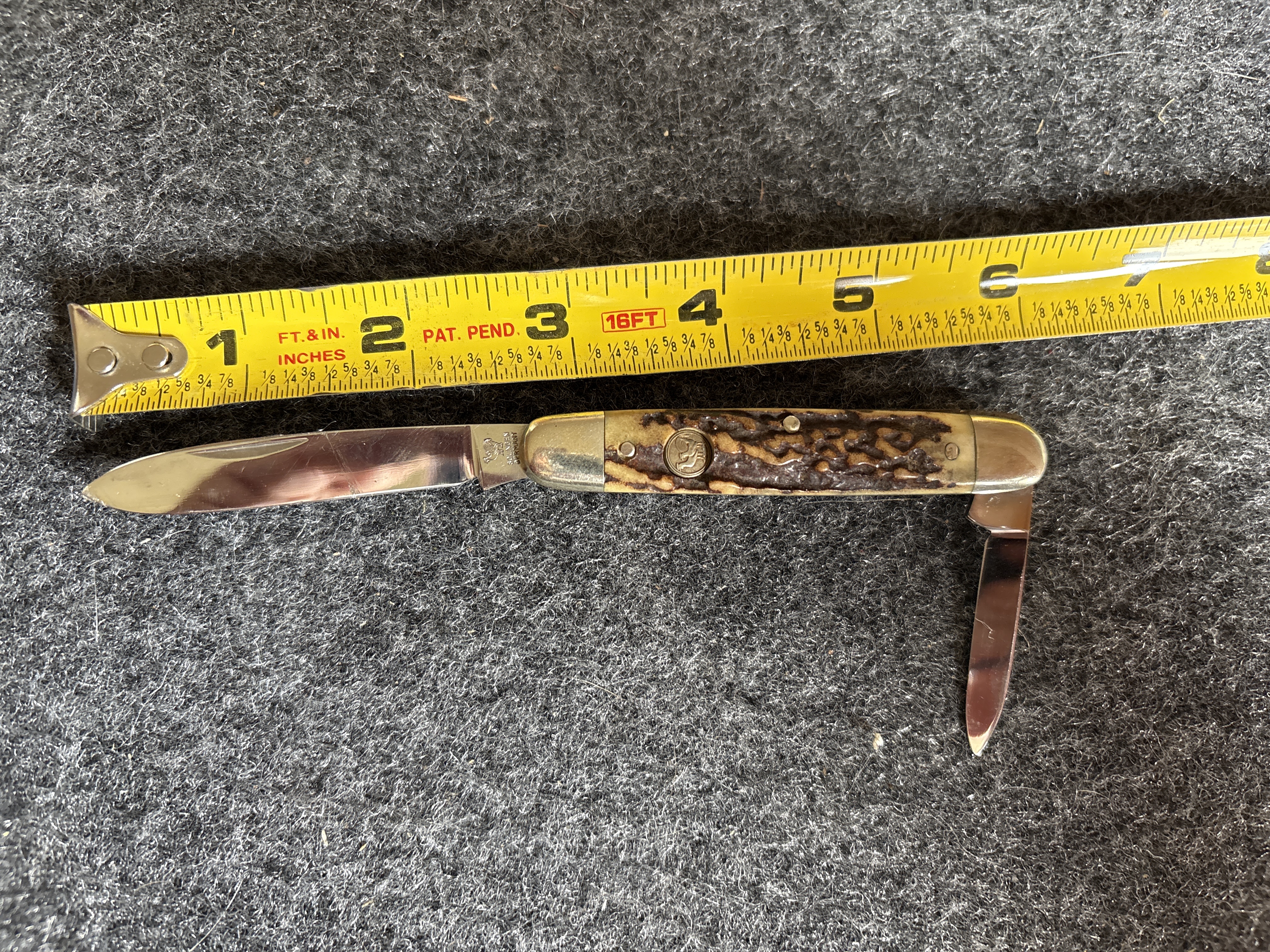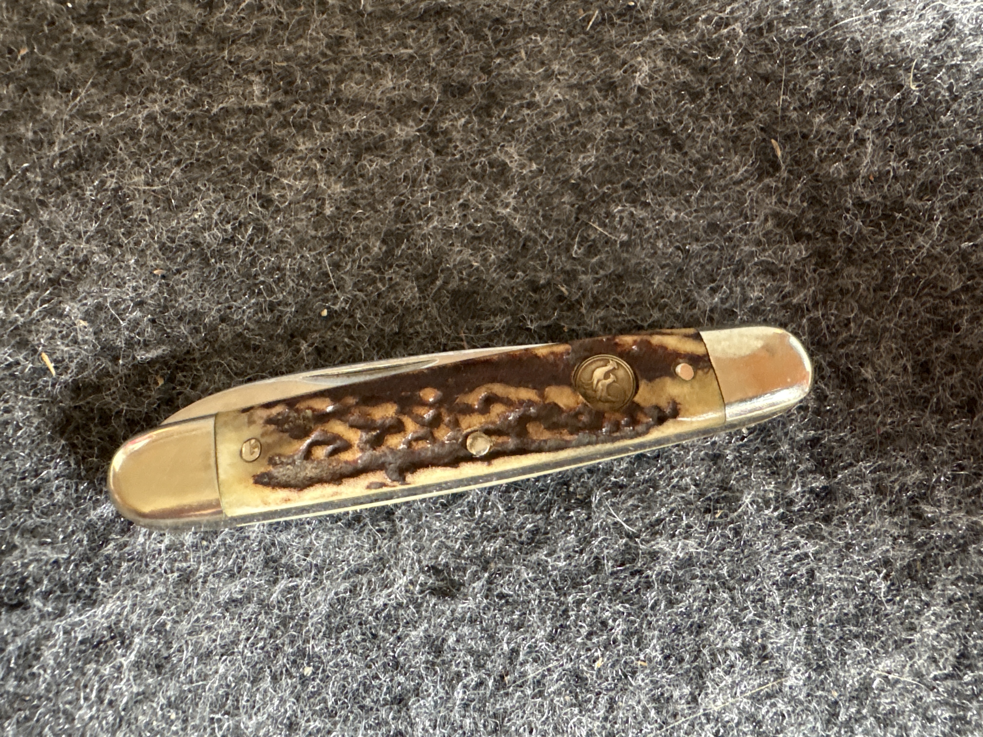 A two-blade folding pocket knife featuring genuine stag handles with an inlaid bird logo, stamped Bertram Cutlery Solingen Germany 222DS, measuring approximately 3.5 inches when closed.