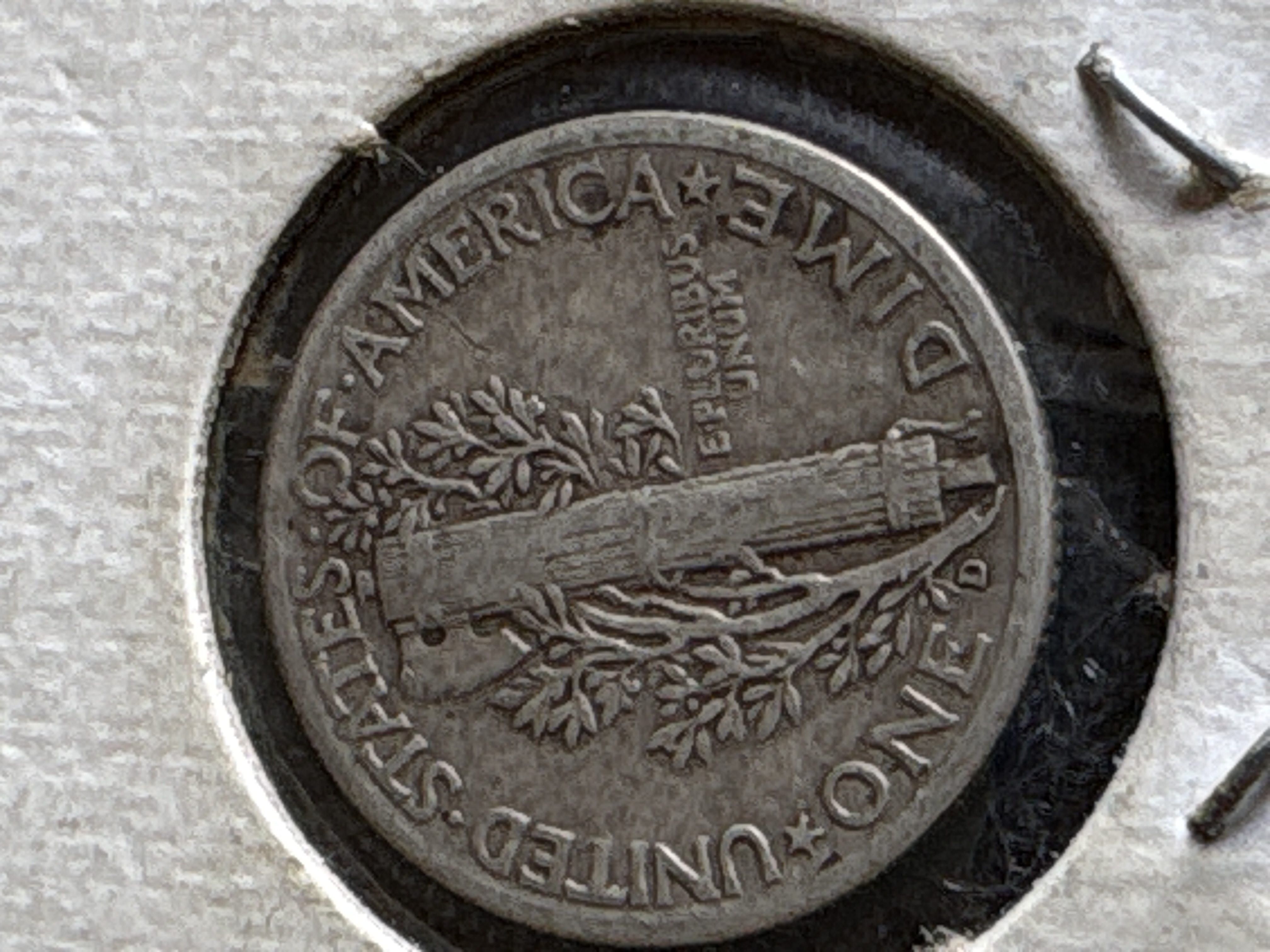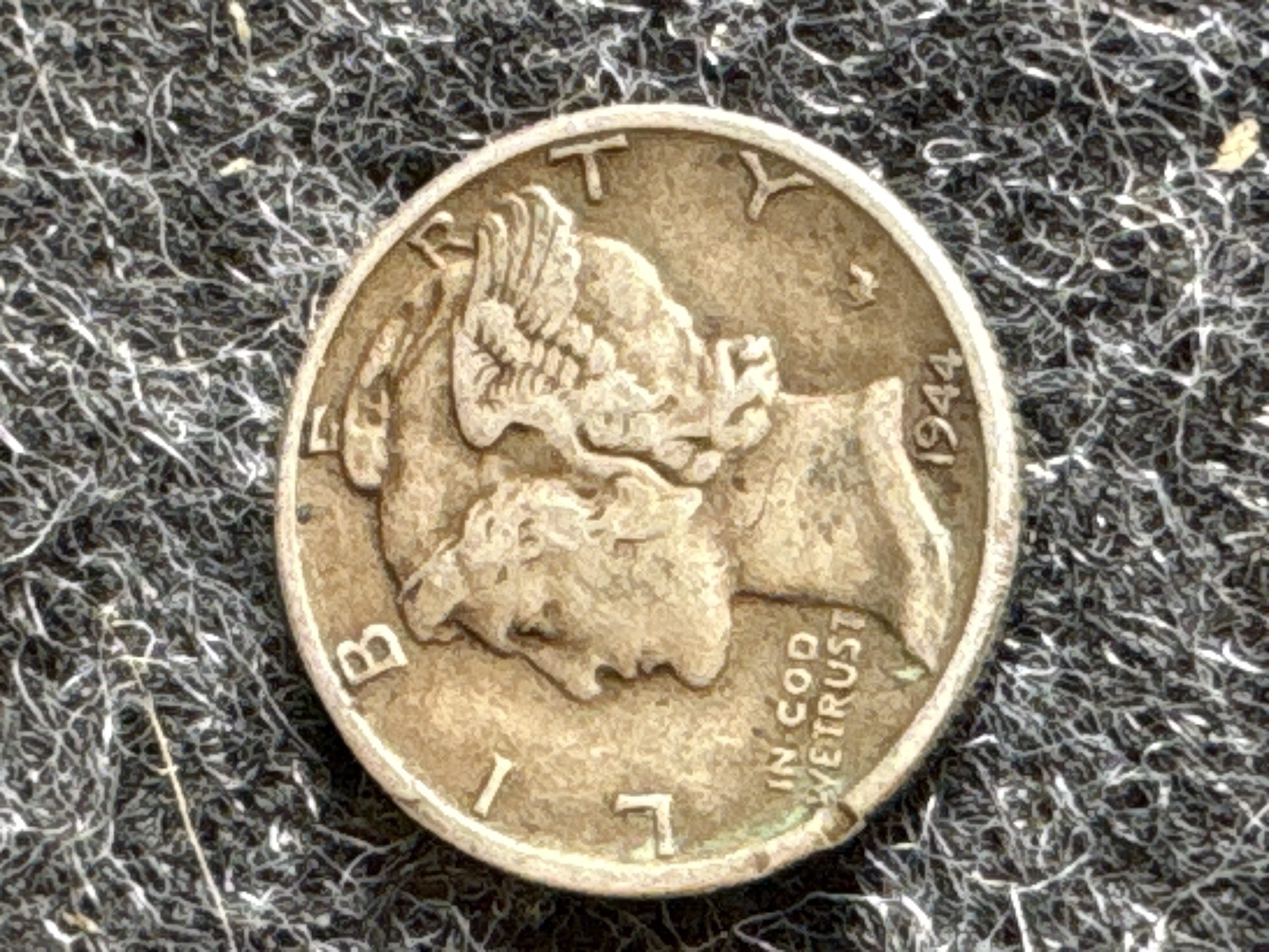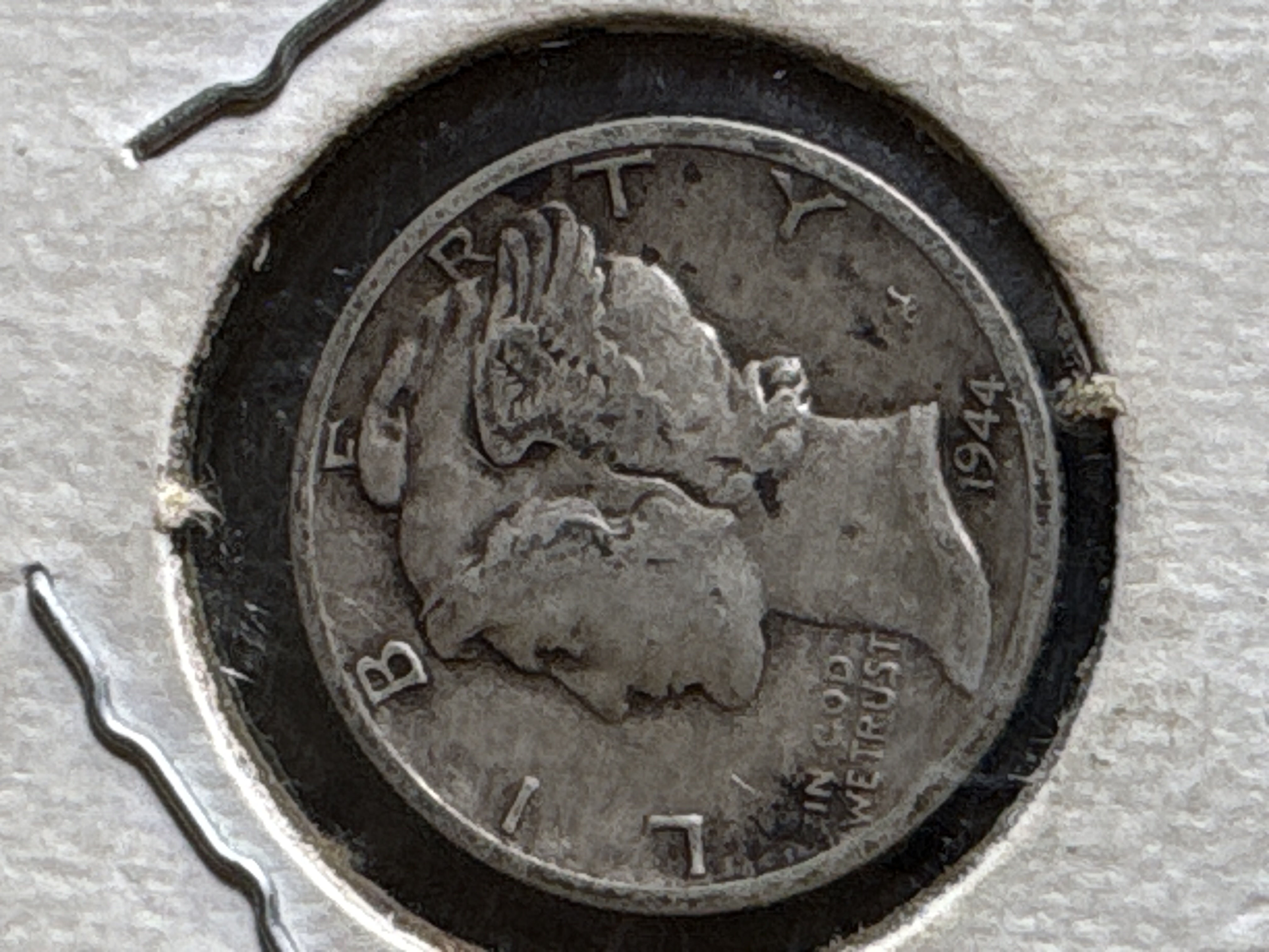 Two silver Mercury dimes dated 1944, including one in a protective cardboard holder marked 1944 D.