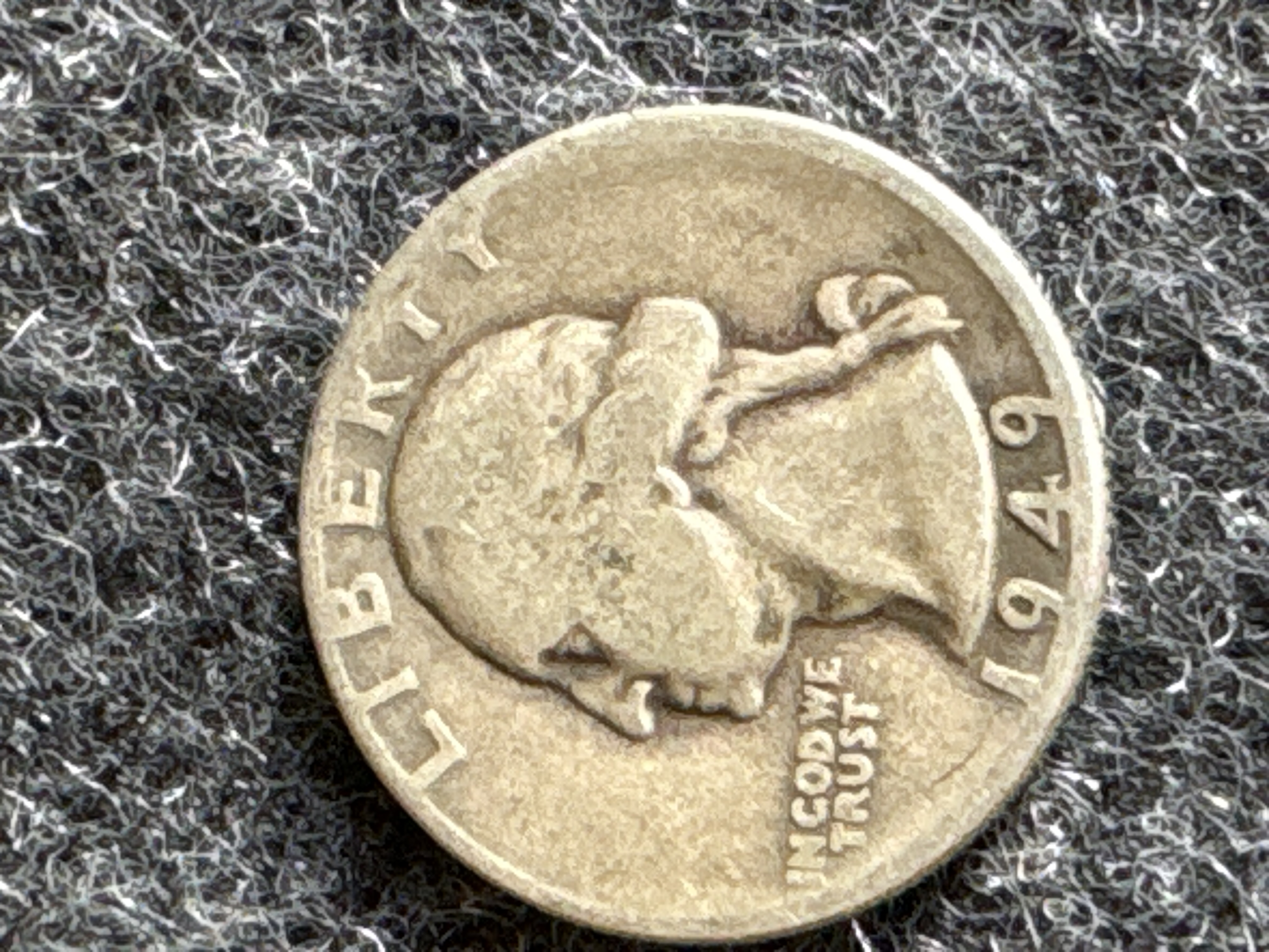 A pair of United States Washington silver quarters dated 1939 and 1949 featuring the profile of George Washington on the obverse and an eagle on the reverse.