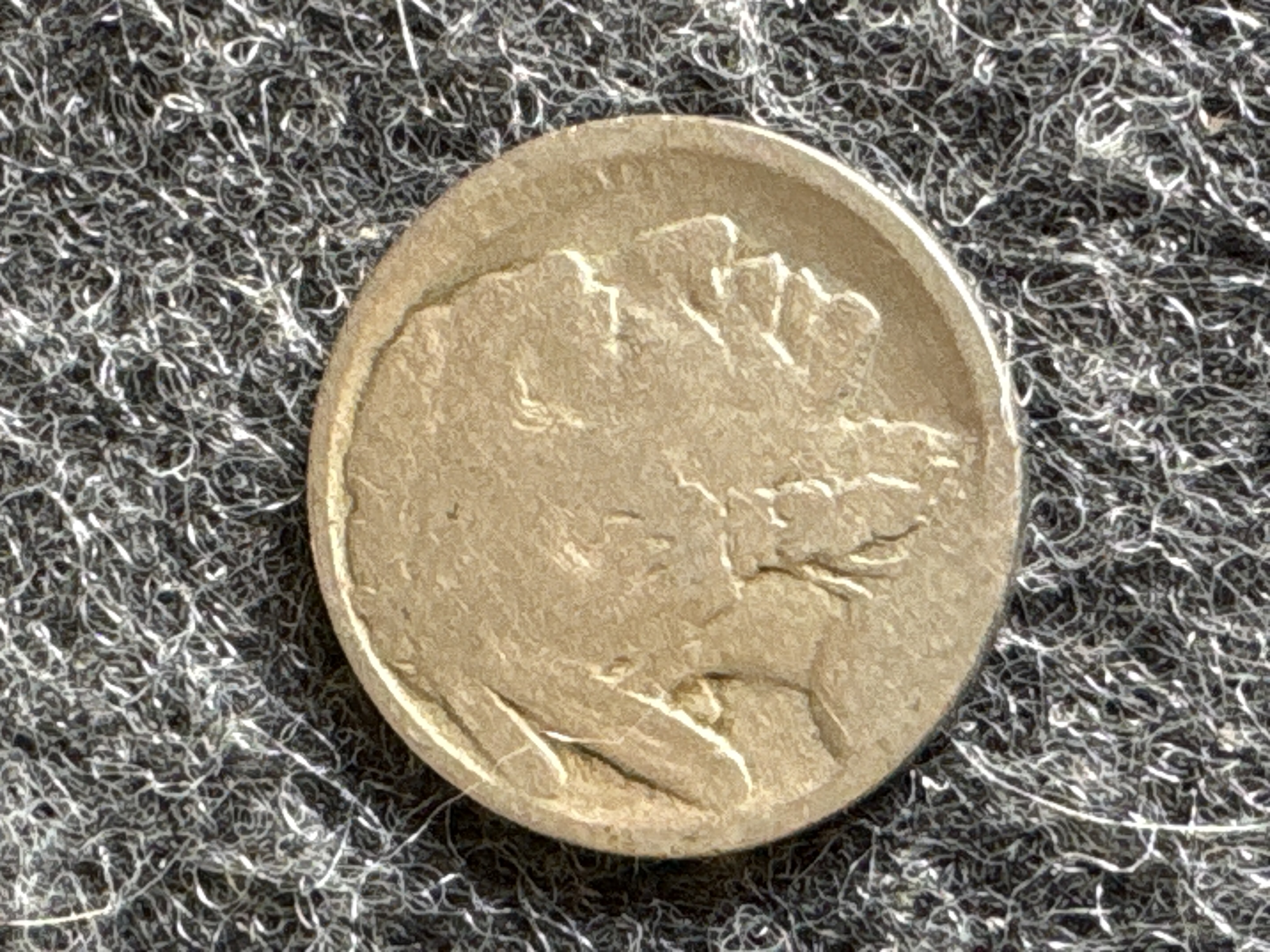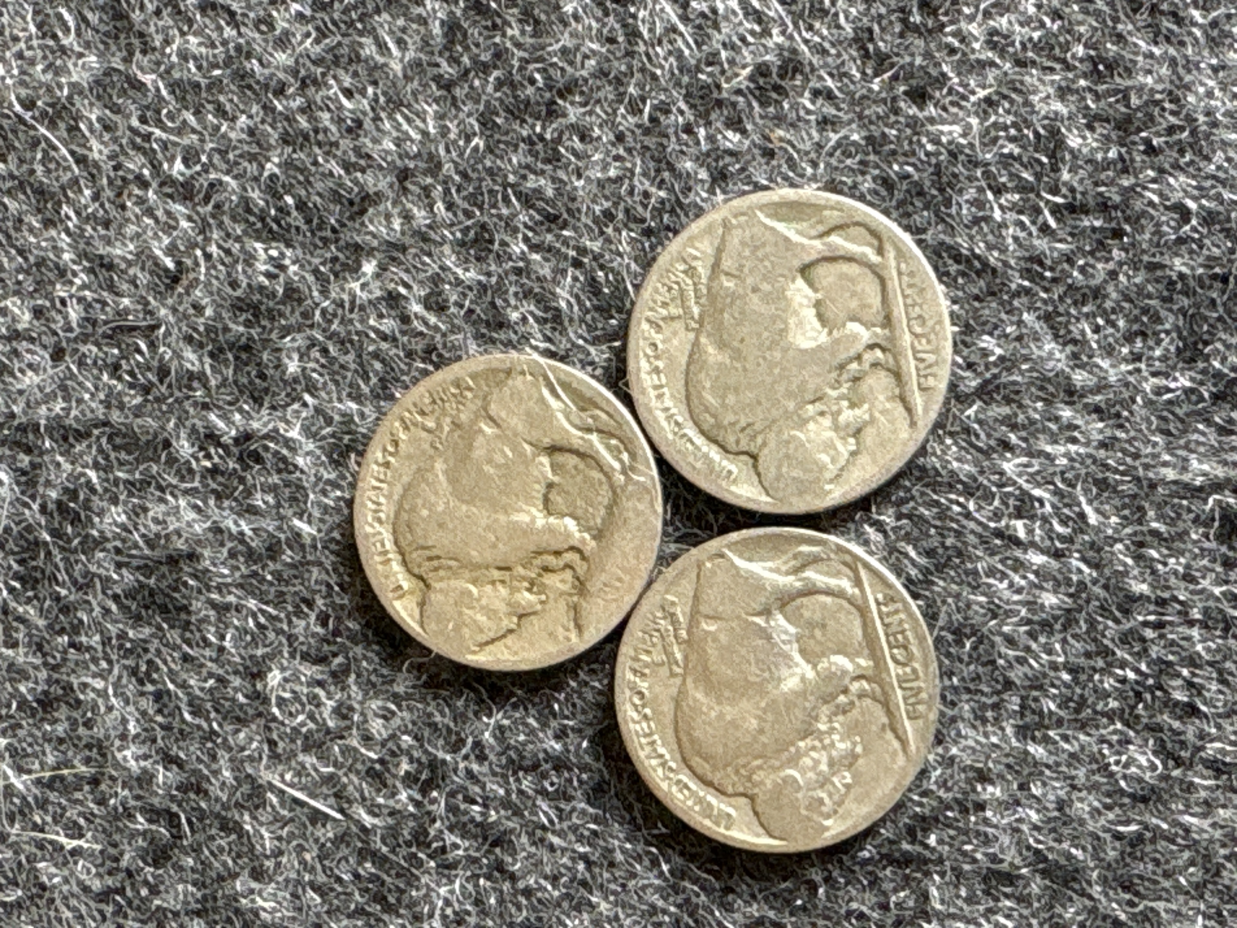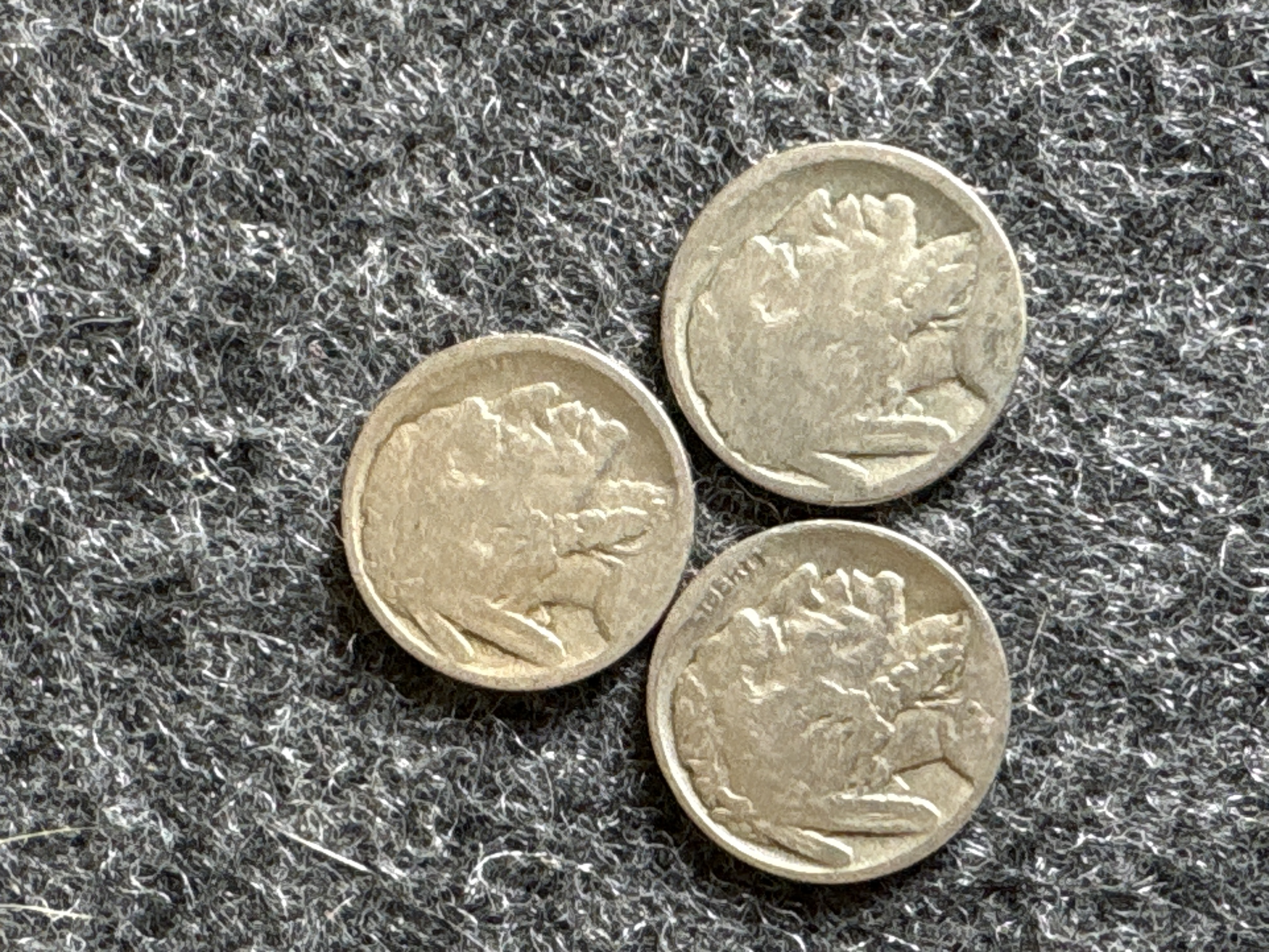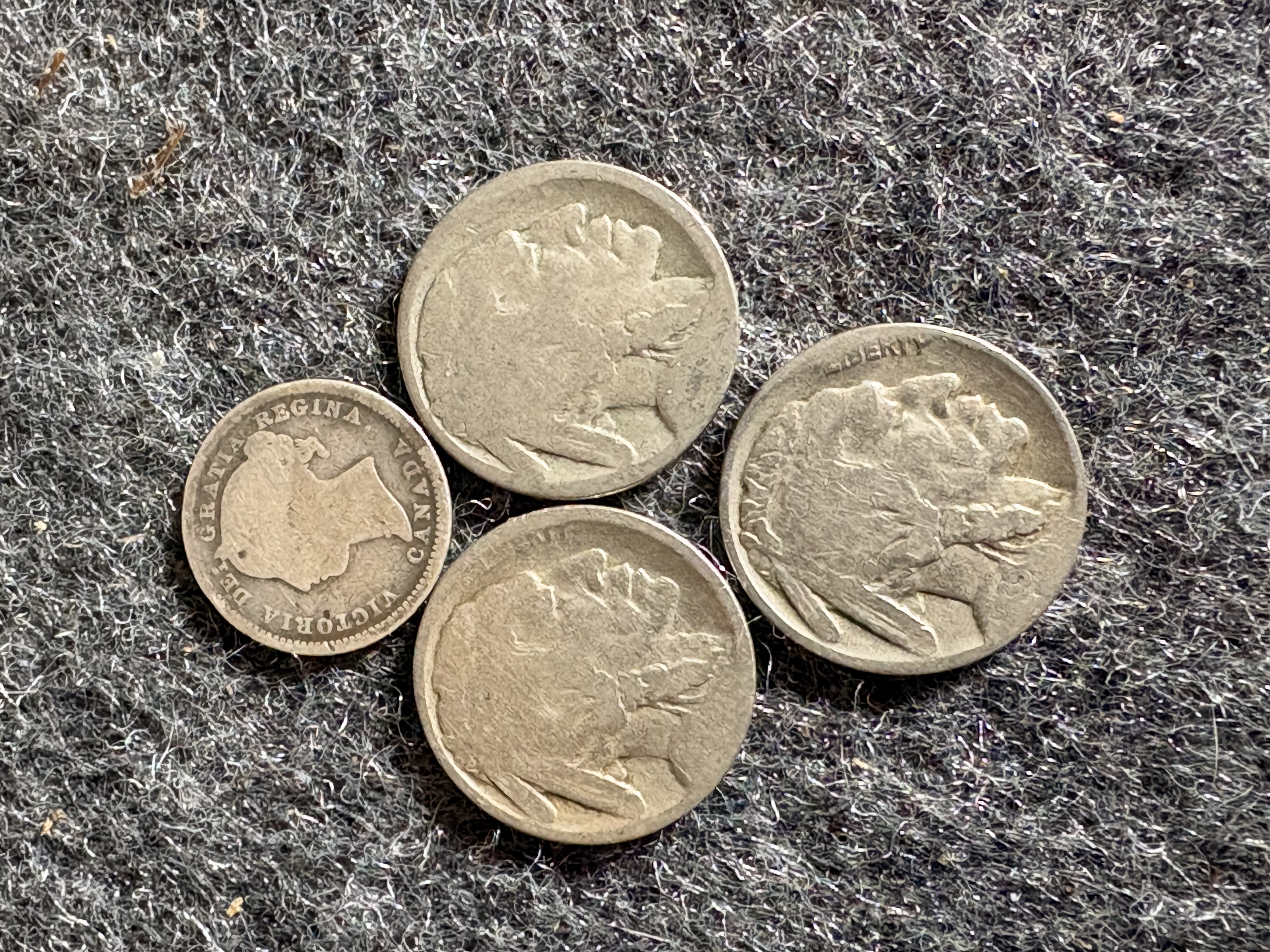 A collection of United States Buffalo nickels and a Canadian 925 coin inscribed Victoria Dei Gratia Regina Canada.