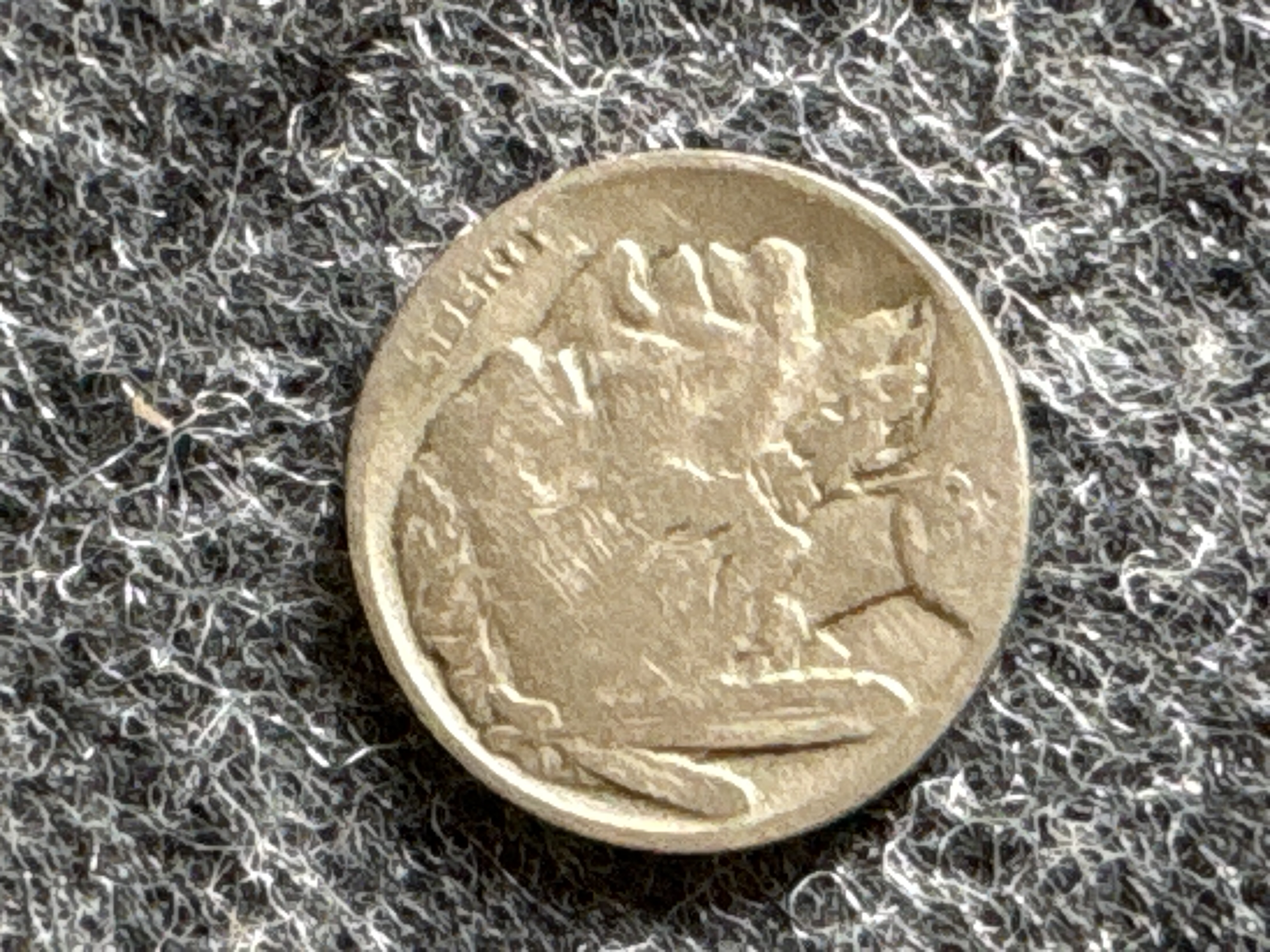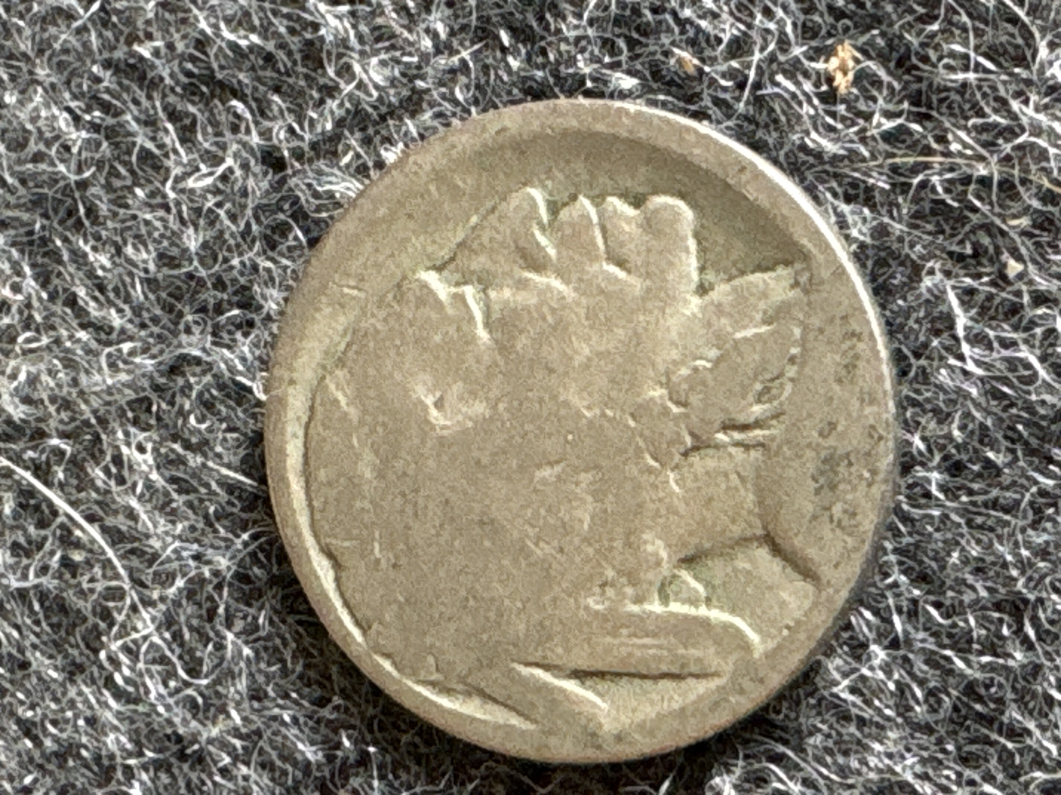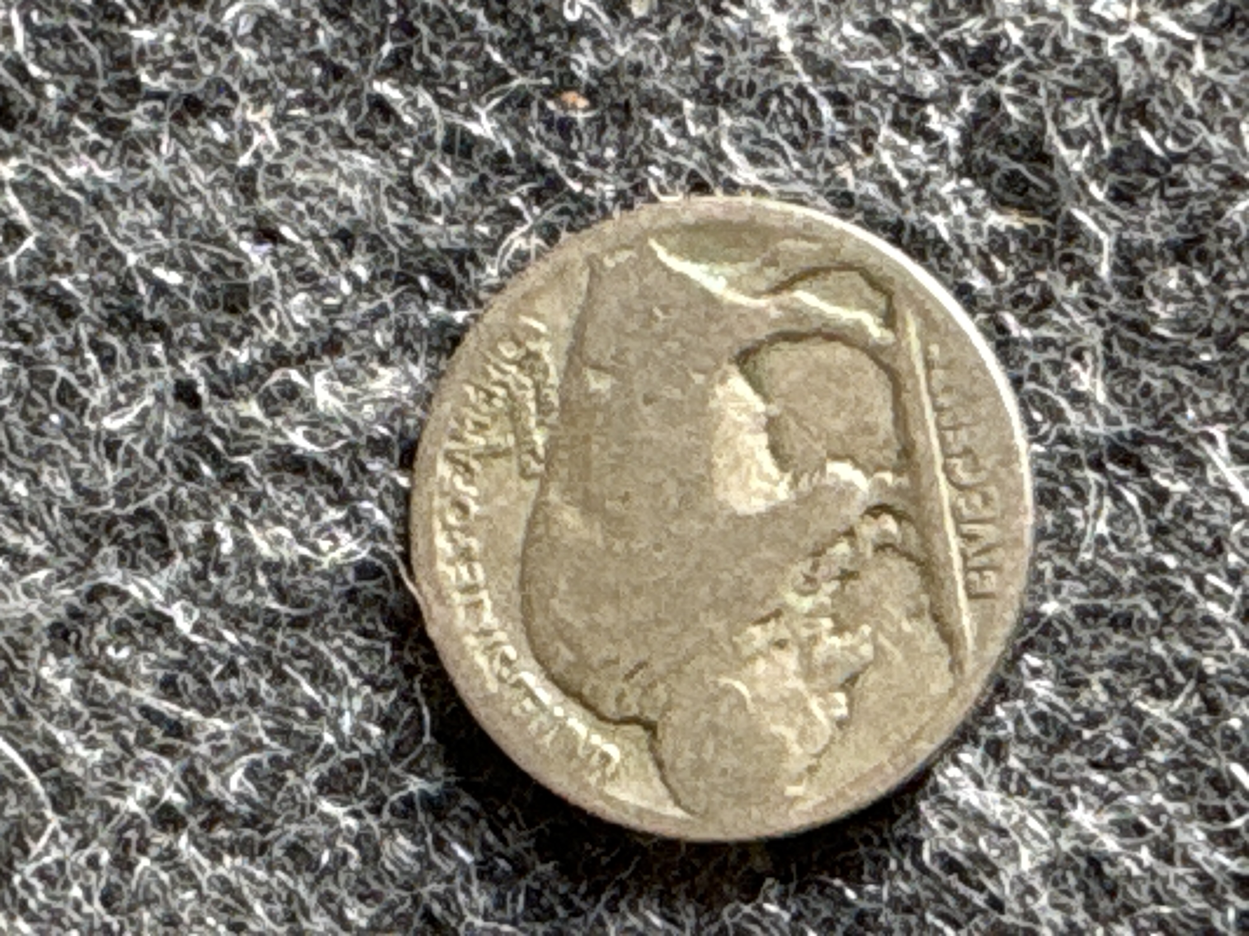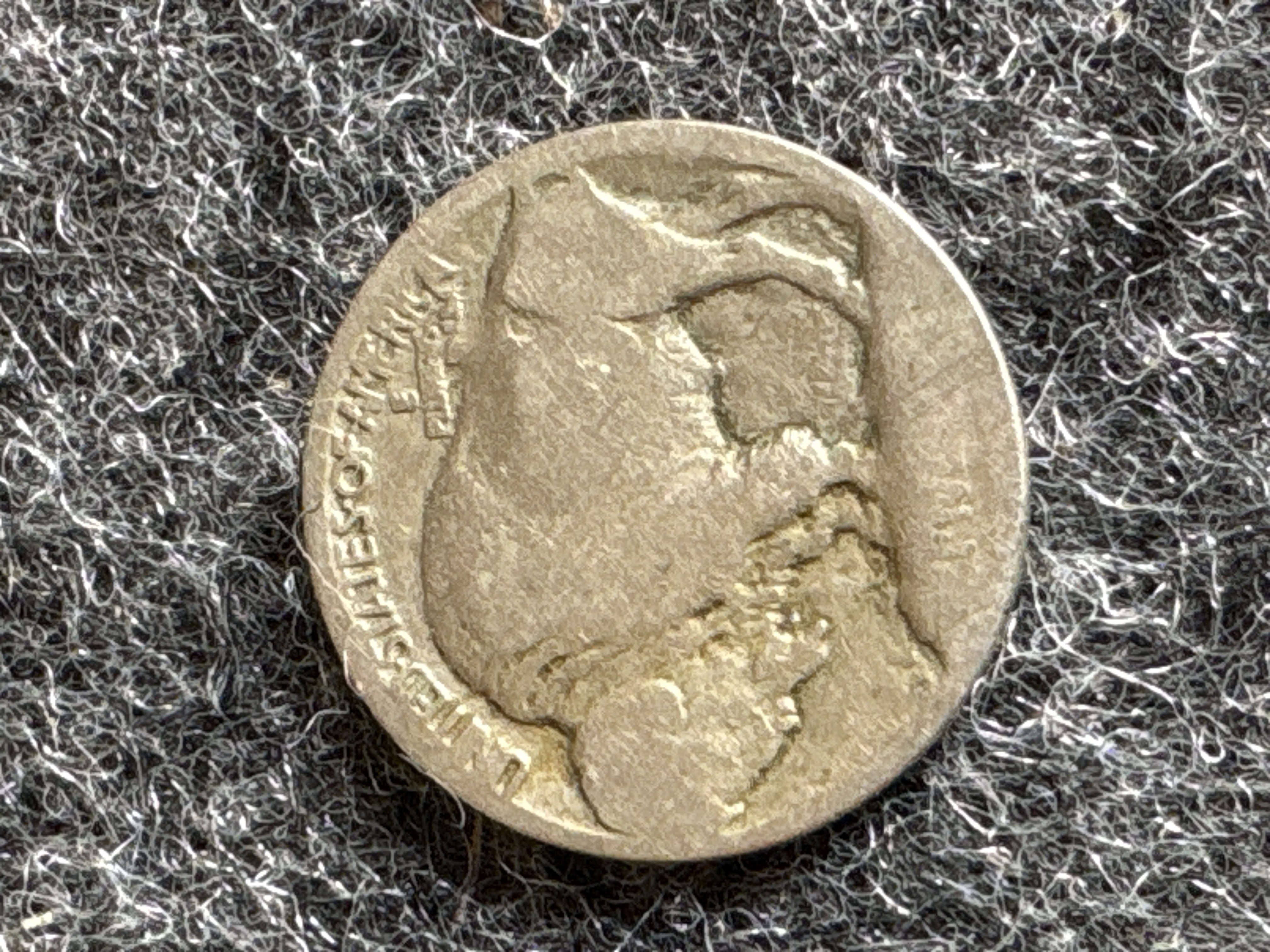 A collection of United States Buffalo nickels and a Canadian 925 coin inscribed Victoria Dei Gratia Regina Canada.