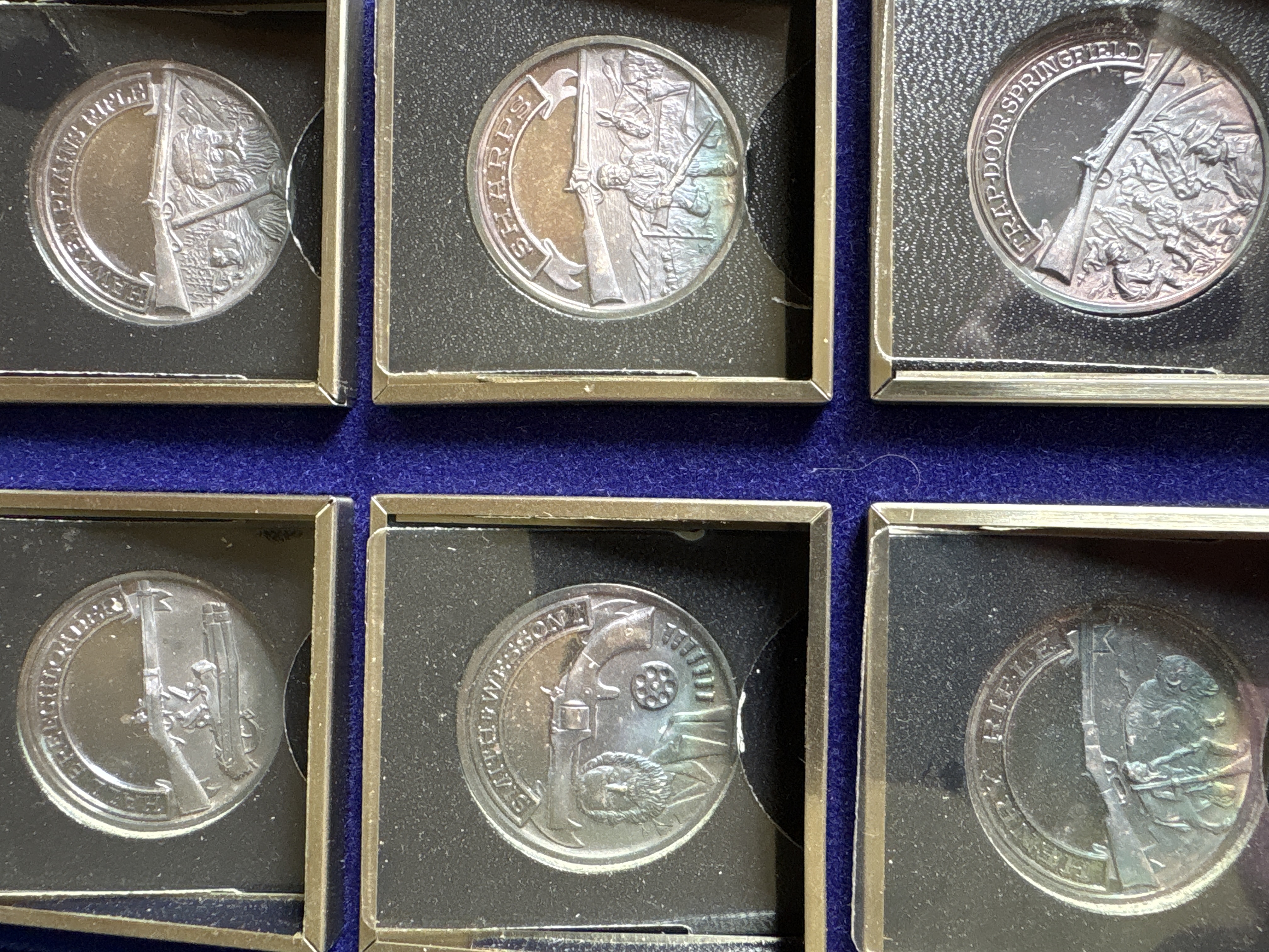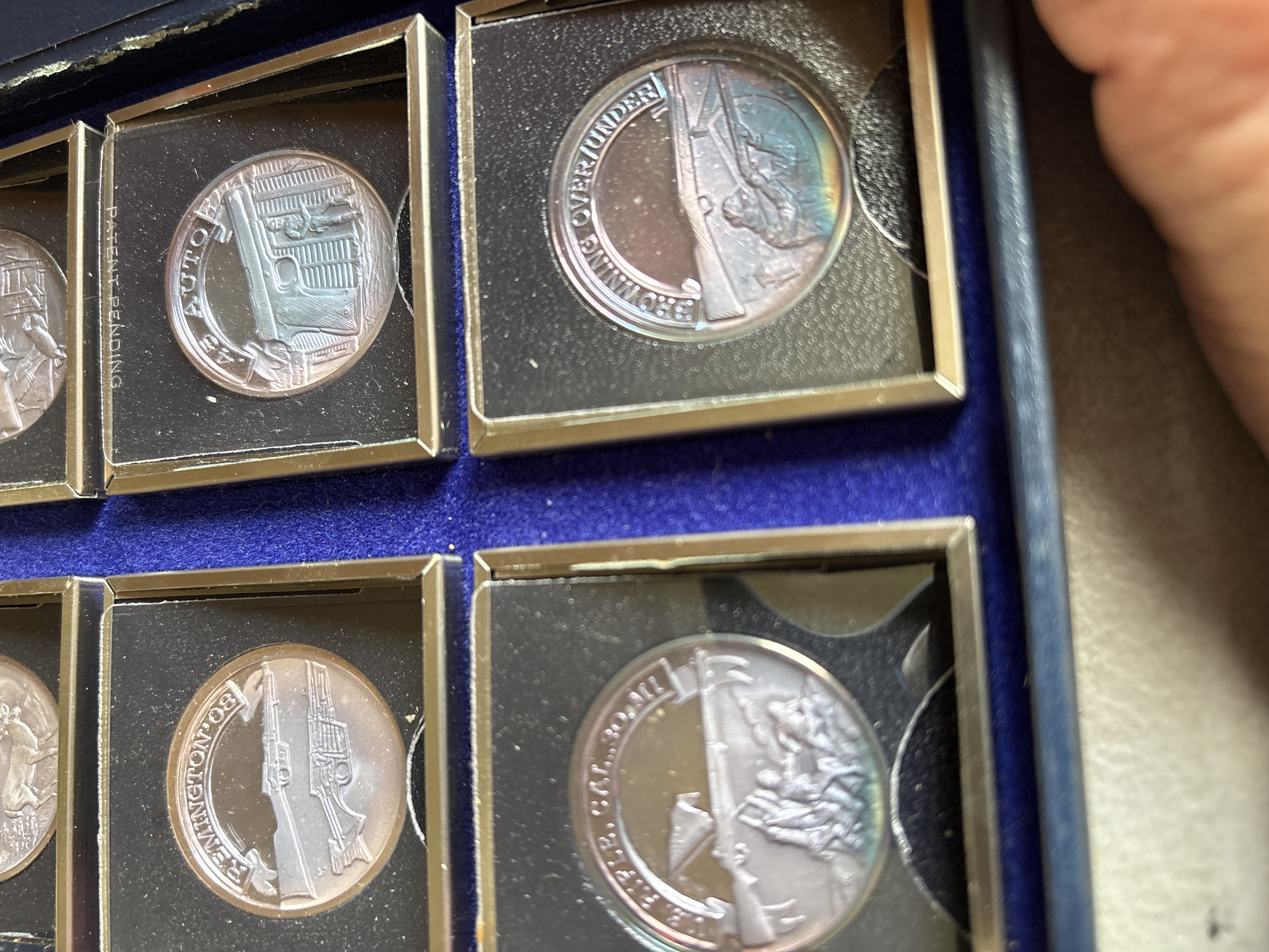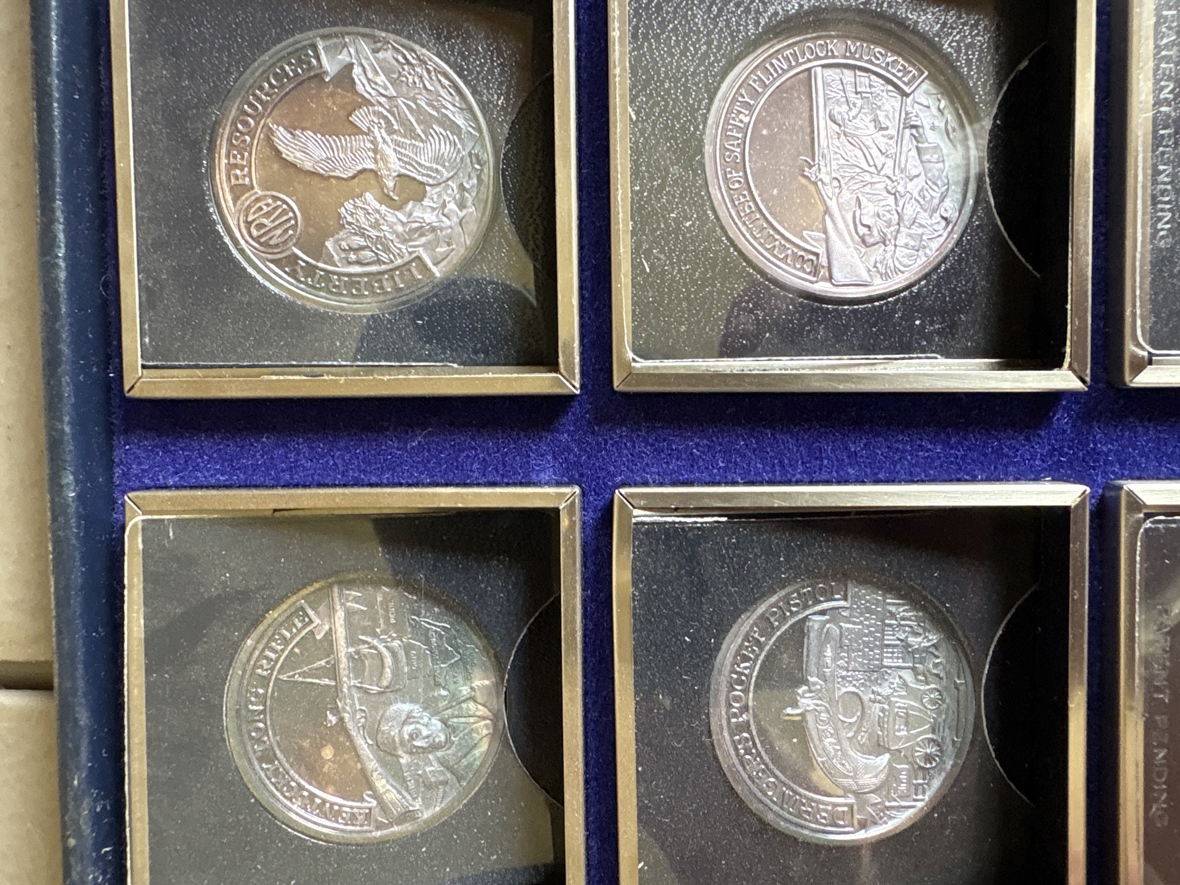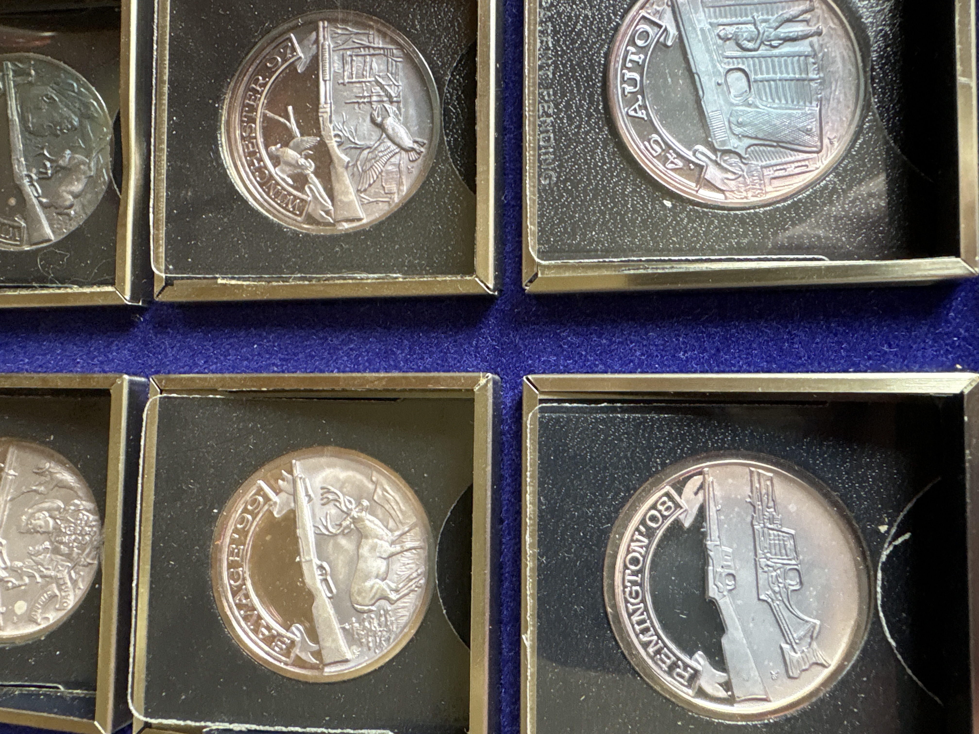 The complete set was sanctioned by the NRA and titled “A Nation of Rifleman”. A complete collection of solid .999 fine silver proof medallions. Issued in late 70’s. There are 30 solid silver proofs depicting great guns of history and comes in an album. The detailing on these coins is fantastic. Each coin is .999 fine silver and is about 21 grams, or ¾ of an ounce and is about the size of an old half dollar only a little thicker. Stamped on the rim of each medal are .999 fine silver and also the number of the set issued. This was a limited edition set came from the International Mint. This is a fantastic addition to any NRA, gun, coin, or silver collection. It is very rare and very beautiful. The front of the album has the NRA insignia and the title “A NATION OF RIFLEMAN”. The album opens up into two halves and is lined with a blue velvet type material. Each half has 15 of the proofs and each medal has its own removable 2inch by 2-inch case. The medals are protected with a plastic cover. The face of each medal has a 3D look and the back has the Liberty Bell, the NRA eagle, and a statement about the gun.
