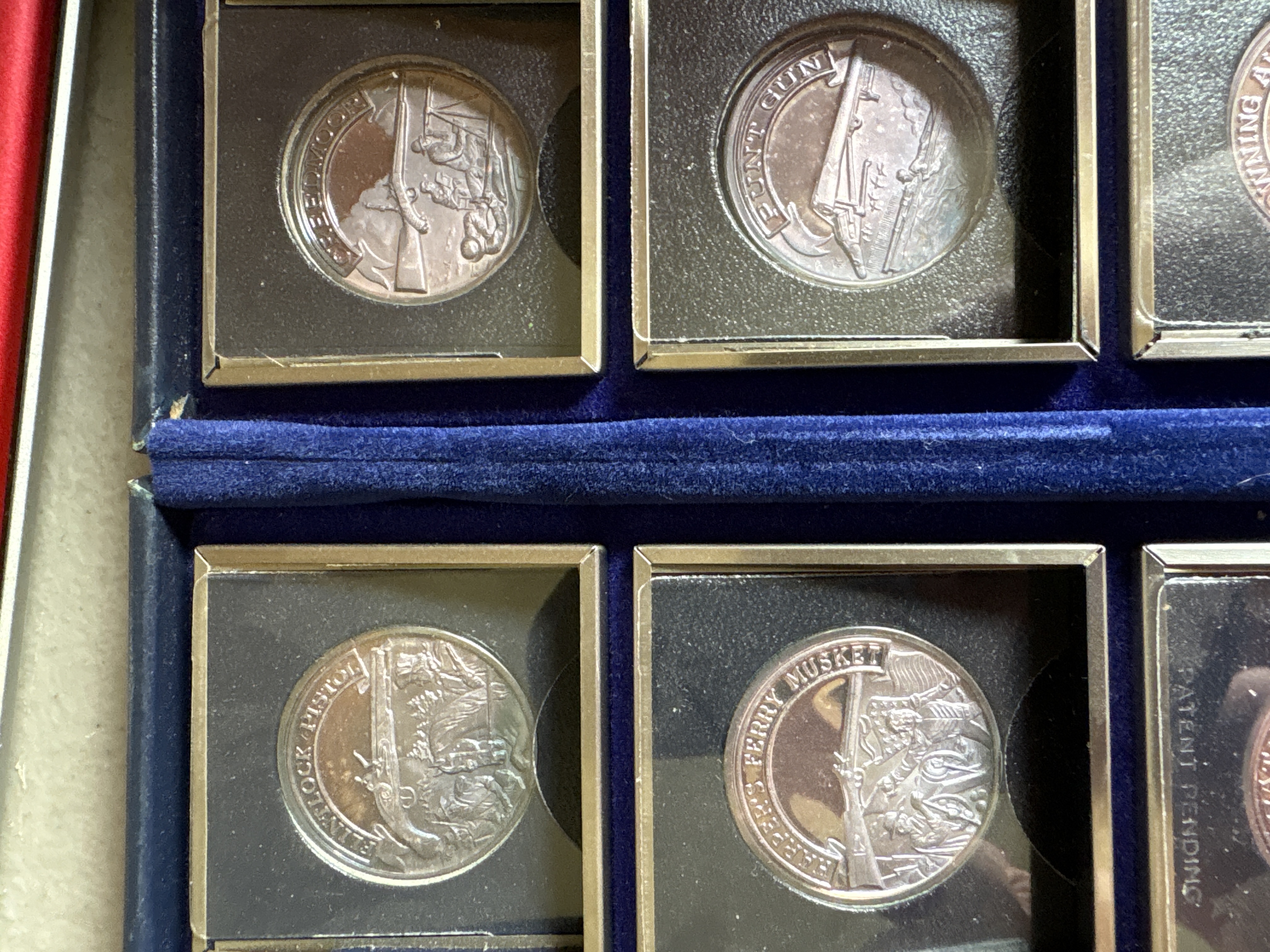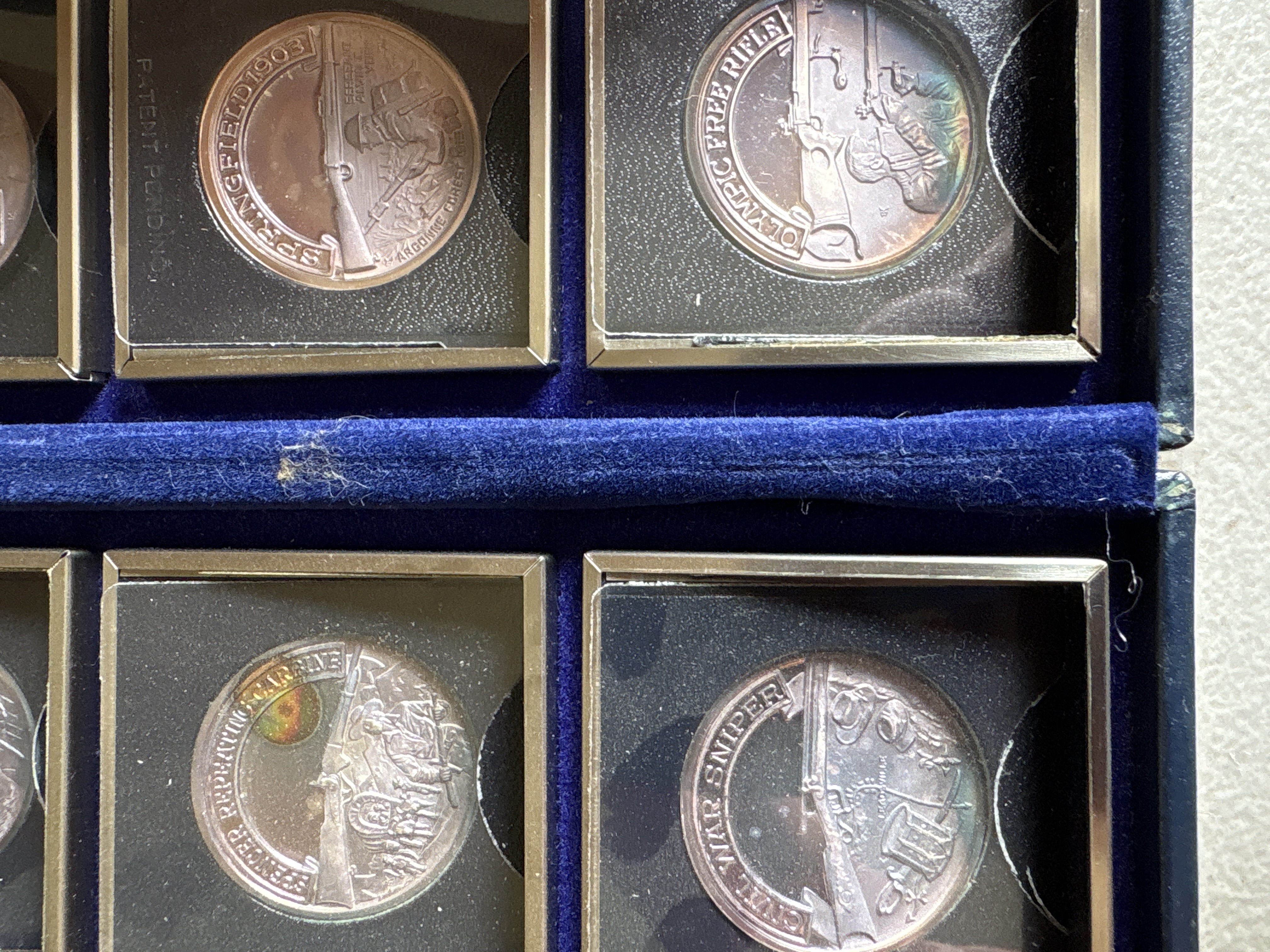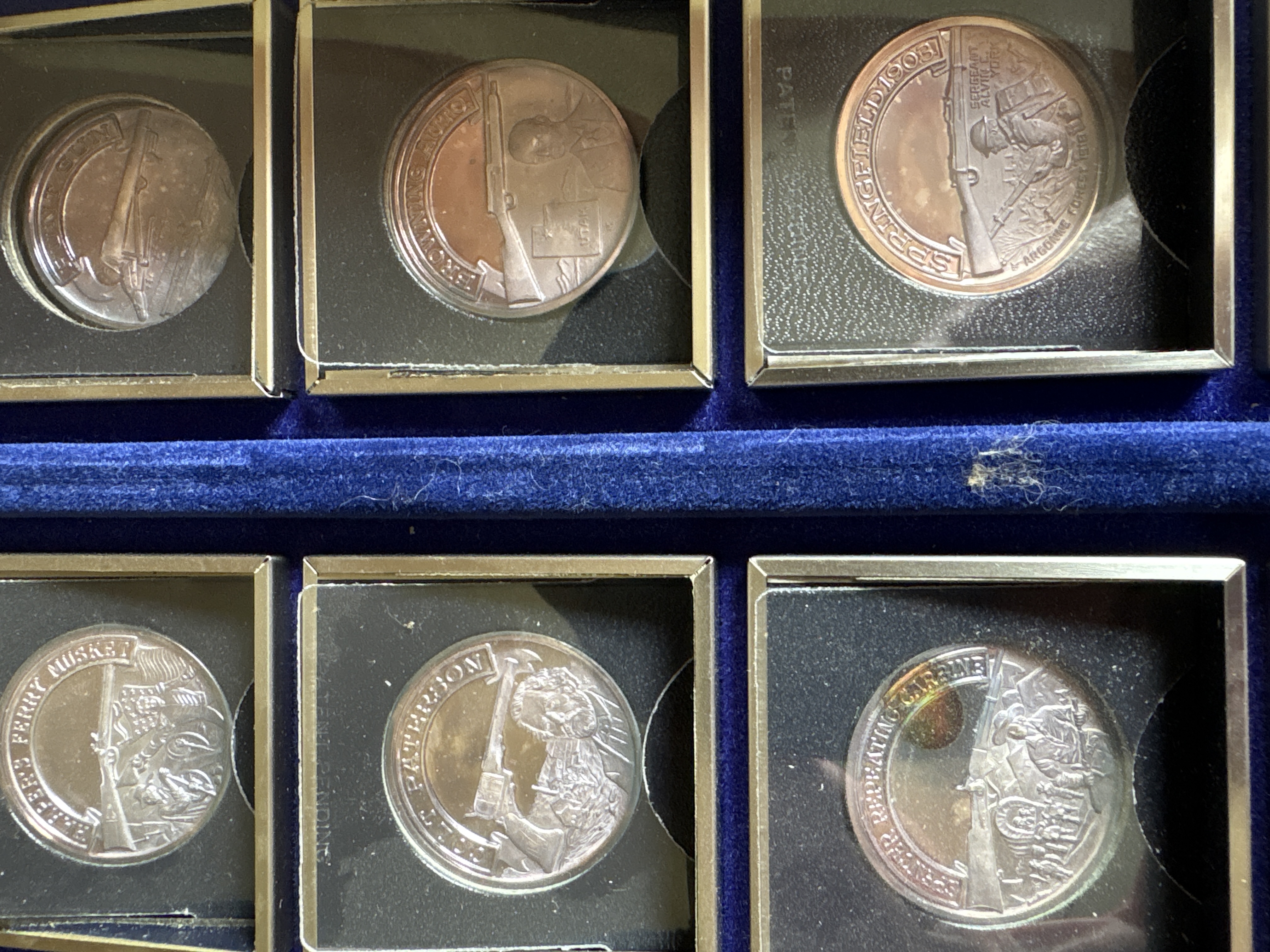 The complete set was sanctioned by the NRA and titled “A Nation of Rifleman”. A complete collection of solid .999 fine silver proof medallions. Issued in late 70’s. There are 30 solid silver proofs depicting great guns of history and comes in an album. The detailing on these coins is fantastic. Each coin is .999 fine silver and is about 21 grams, or ¾ of an ounce and is about the size of an old half dollar only a little thicker. Stamped on the rim of each medal are .999 fine silver and also the number of the set issued. This was a limited edition set came from the International Mint. This is a fantastic addition to any NRA, gun, coin, or silver collection. It is very rare and very beautiful. The front of the album has the NRA insignia and the title “A NATION OF RIFLEMAN”. The album opens up into two halves and is lined with a blue velvet type material. Each half has 15 of the proofs and each medal has its own removable 2inch by 2-inch case. The medals are protected with a plastic cover. The face of each medal has a 3D look and the back has the Liberty Bell, the NRA eagle, and a statement about the gun.