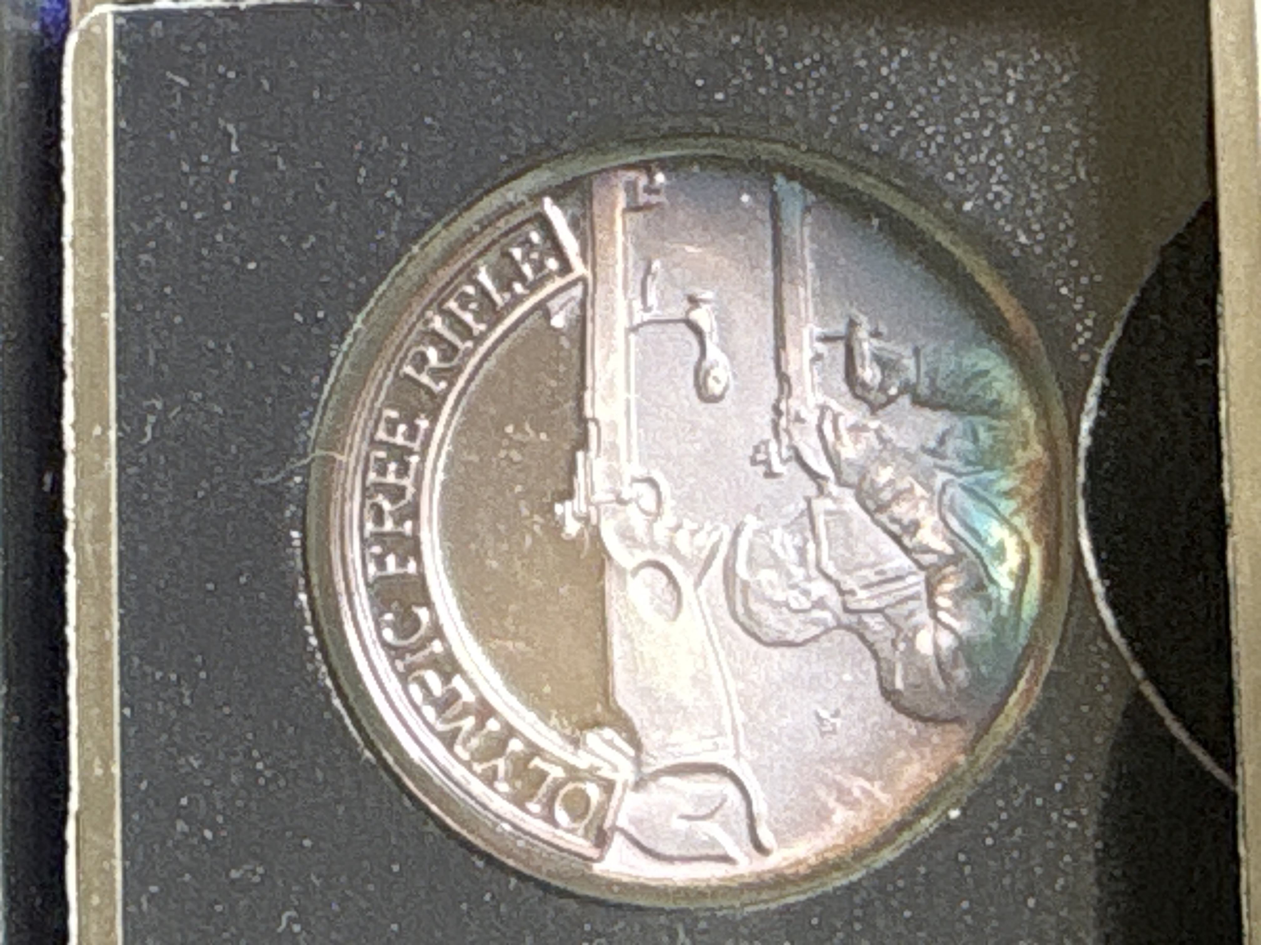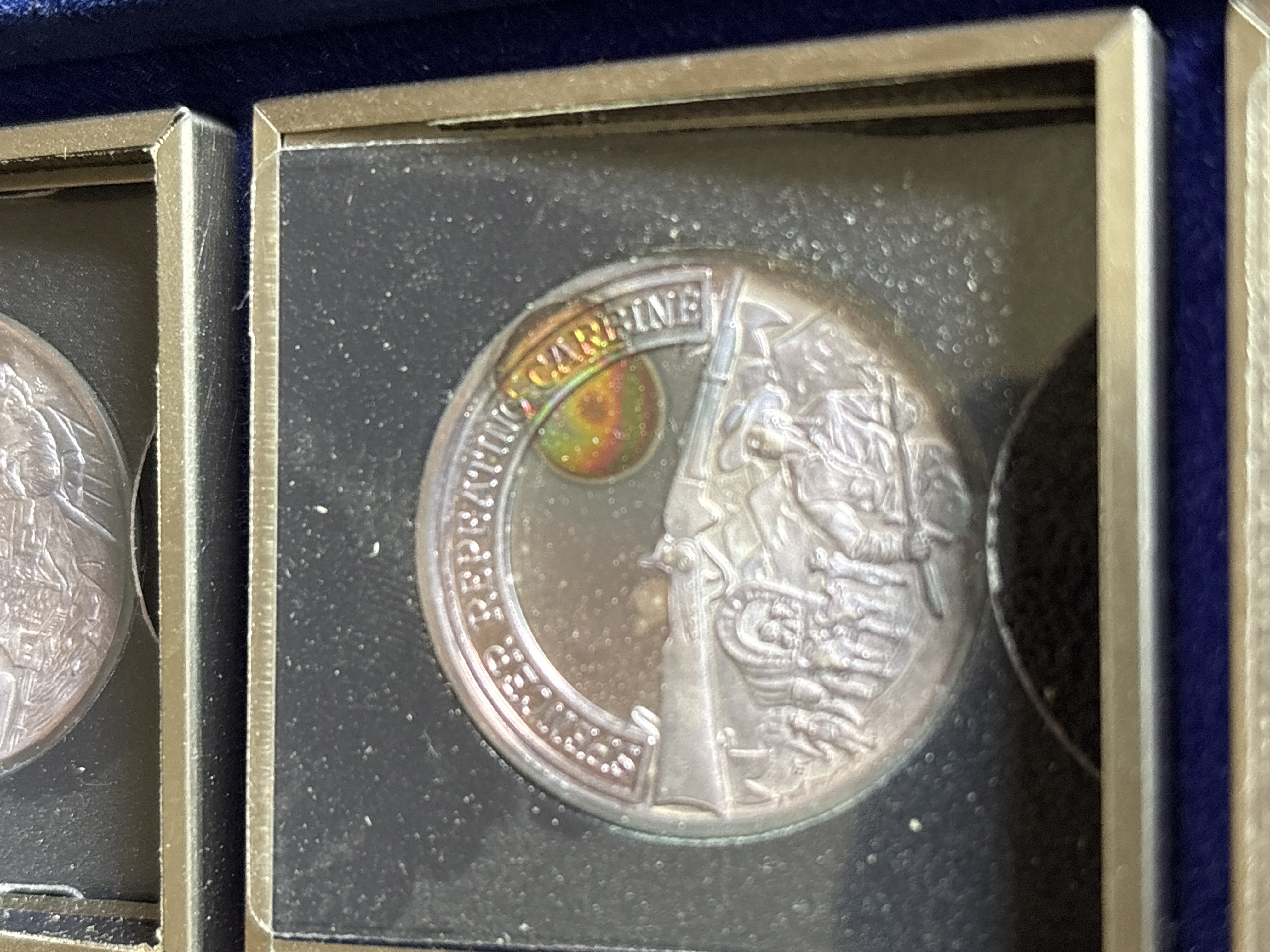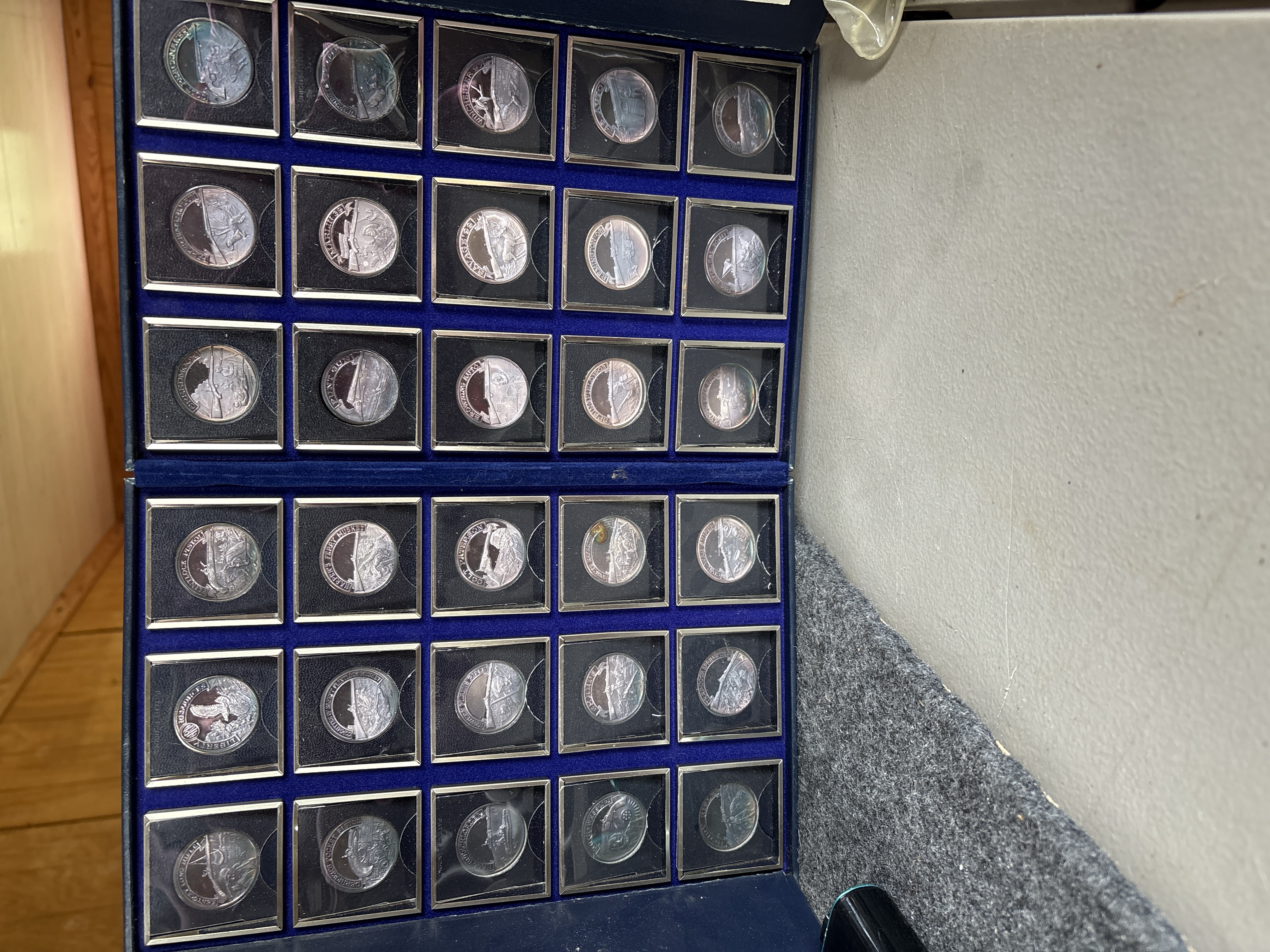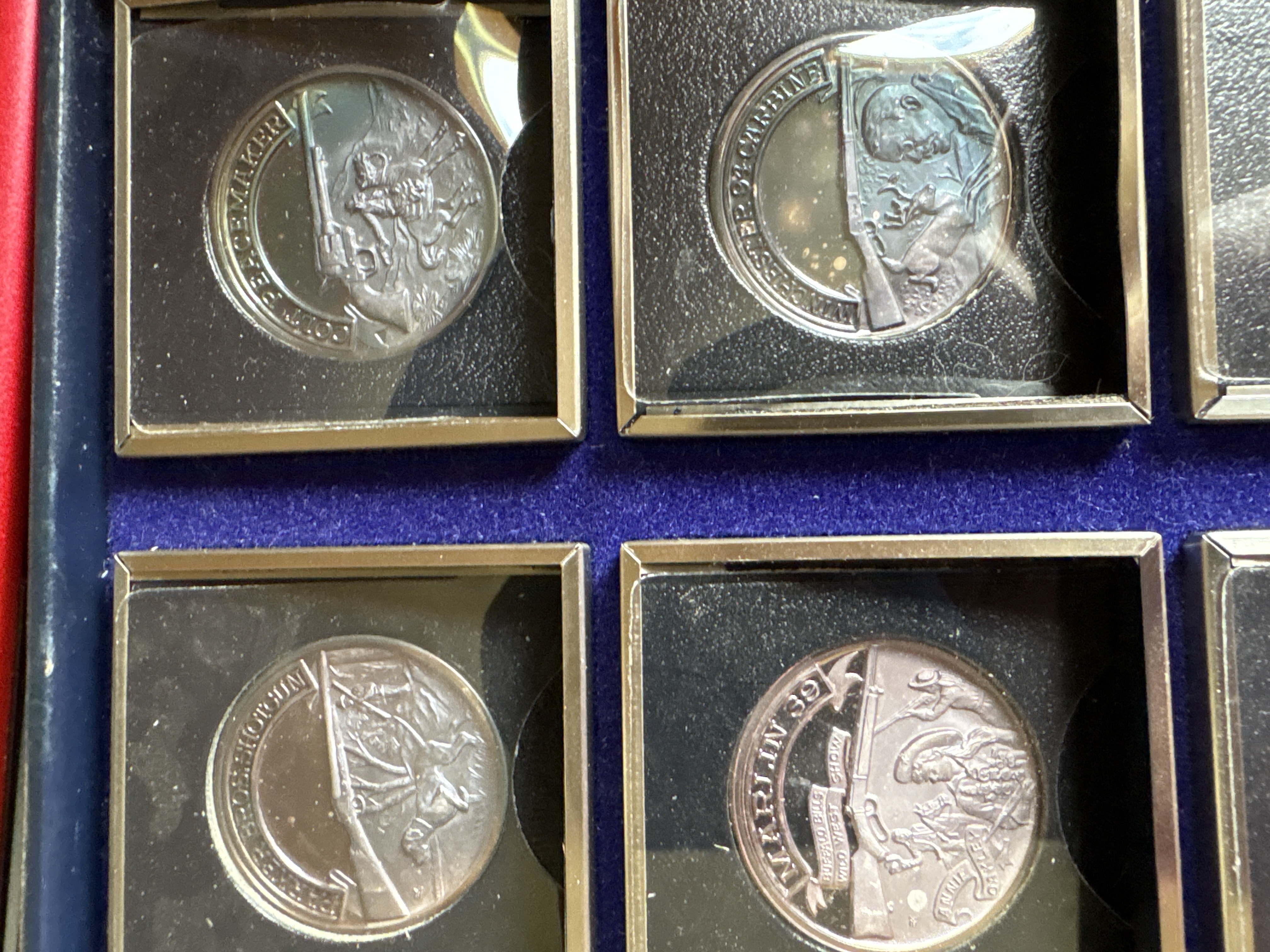 The complete set was sanctioned by the NRA and titled “A Nation of Rifleman”. A complete collection of solid .999 fine silver proof medallions. Issued in late 70’s. There are 30 solid silver proofs depicting great guns of history and comes in an album. The detailing on these coins is fantastic. Each coin is .999 fine silver and is about 21 grams, or ¾ of an ounce and is about the size of an old half dollar only a little thicker. Stamped on the rim of each medal are .999 fine silver and also the number of the set issued. This was a limited edition set came from the International Mint. This is a fantastic addition to any NRA, gun, coin, or silver collection. It is very rare and very beautiful. The front of the album has the NRA insignia and the title “A NATION OF RIFLEMAN”. The album opens up into two halves and is lined with a blue velvet type material. Each half has 15 of the proofs and each medal has its own removable 2inch by 2-inch case. The medals are protected with a plastic cover. The face of each medal has a 3D look and the back has the Liberty Bell, the NRA eagle, and a statement about the gun.