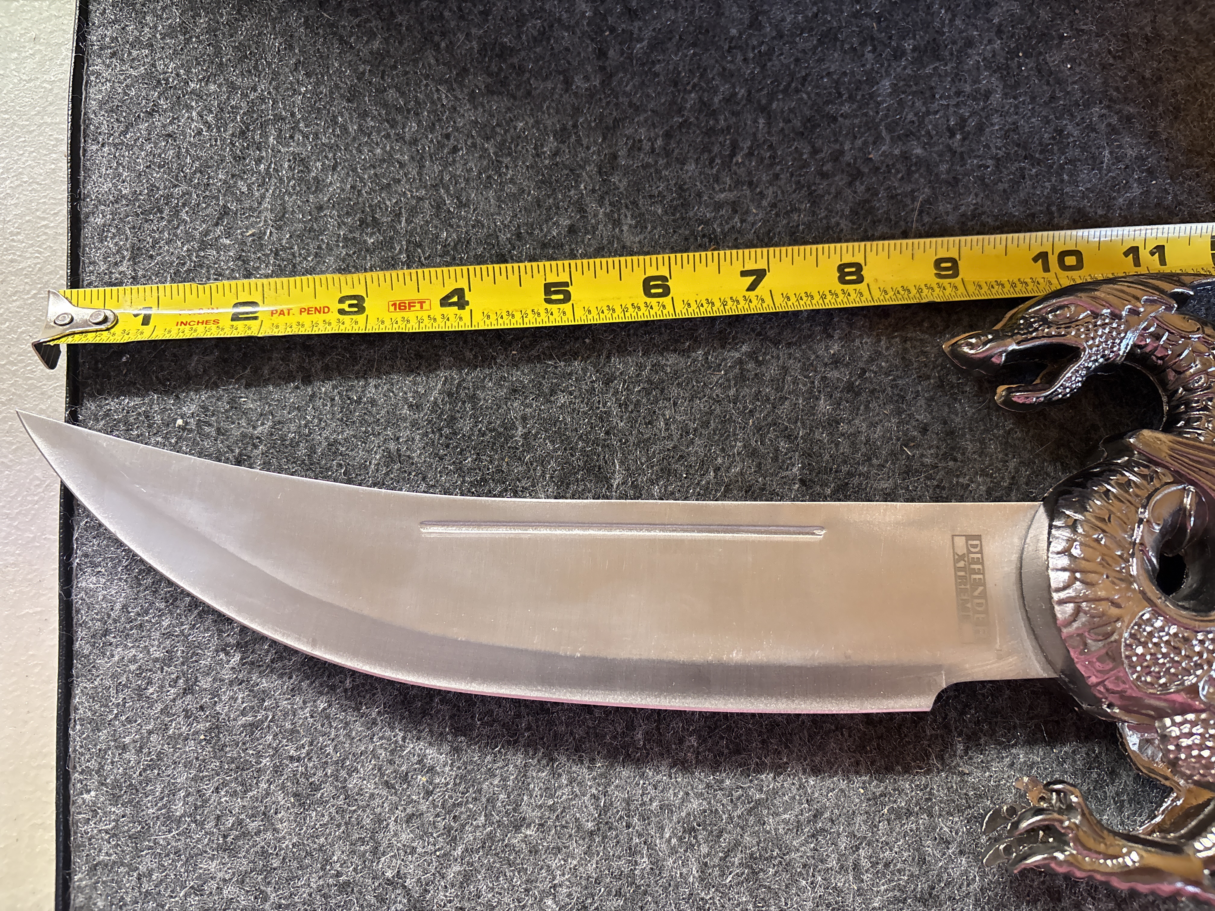 A silver-toned stainless steel decorative fantasy dagger by Defender Xtreme featuring an ornate dragon-shaped hilt and matching sheath with red accents, with a blade measuring approximately 9.5 inches.