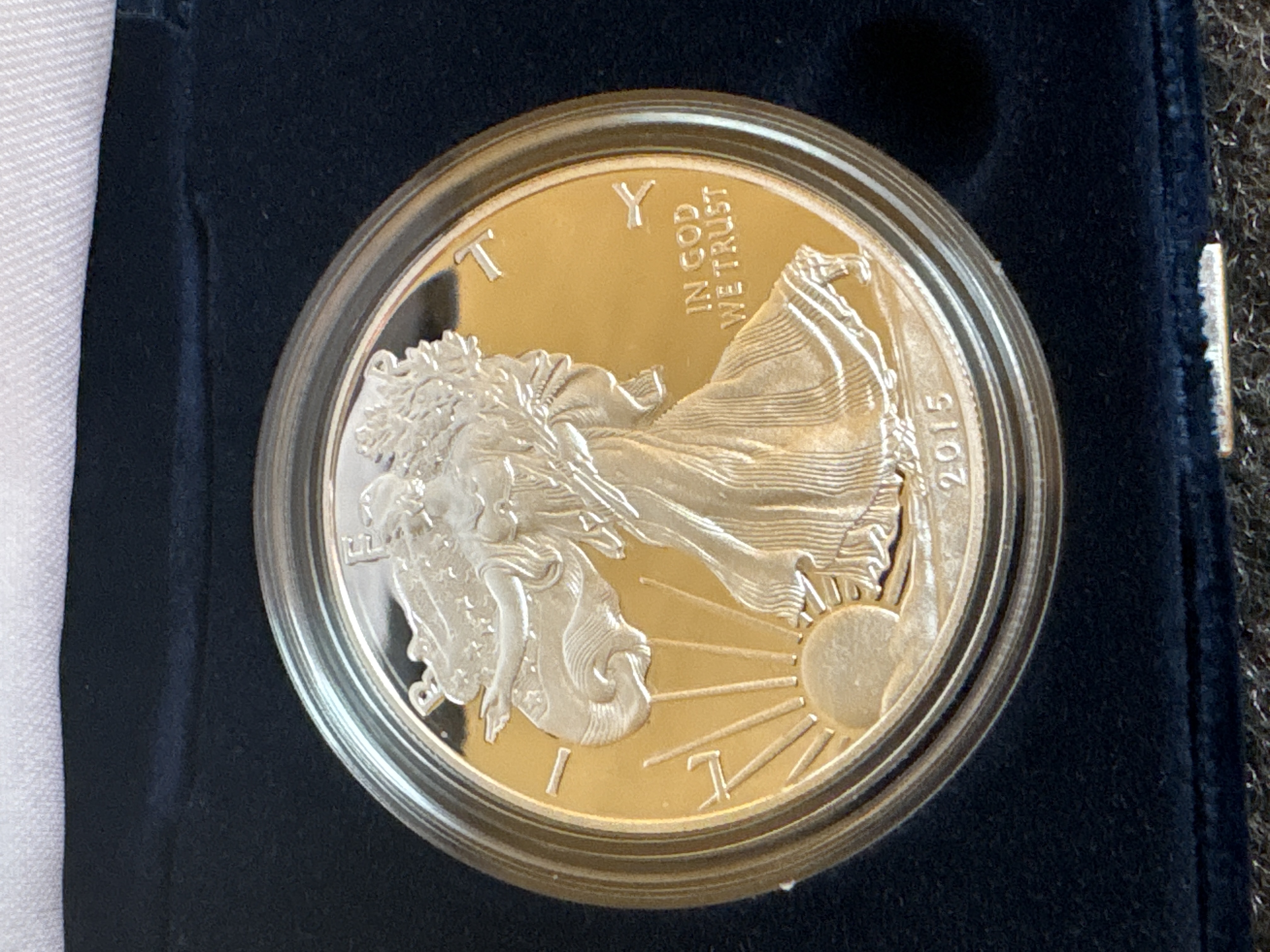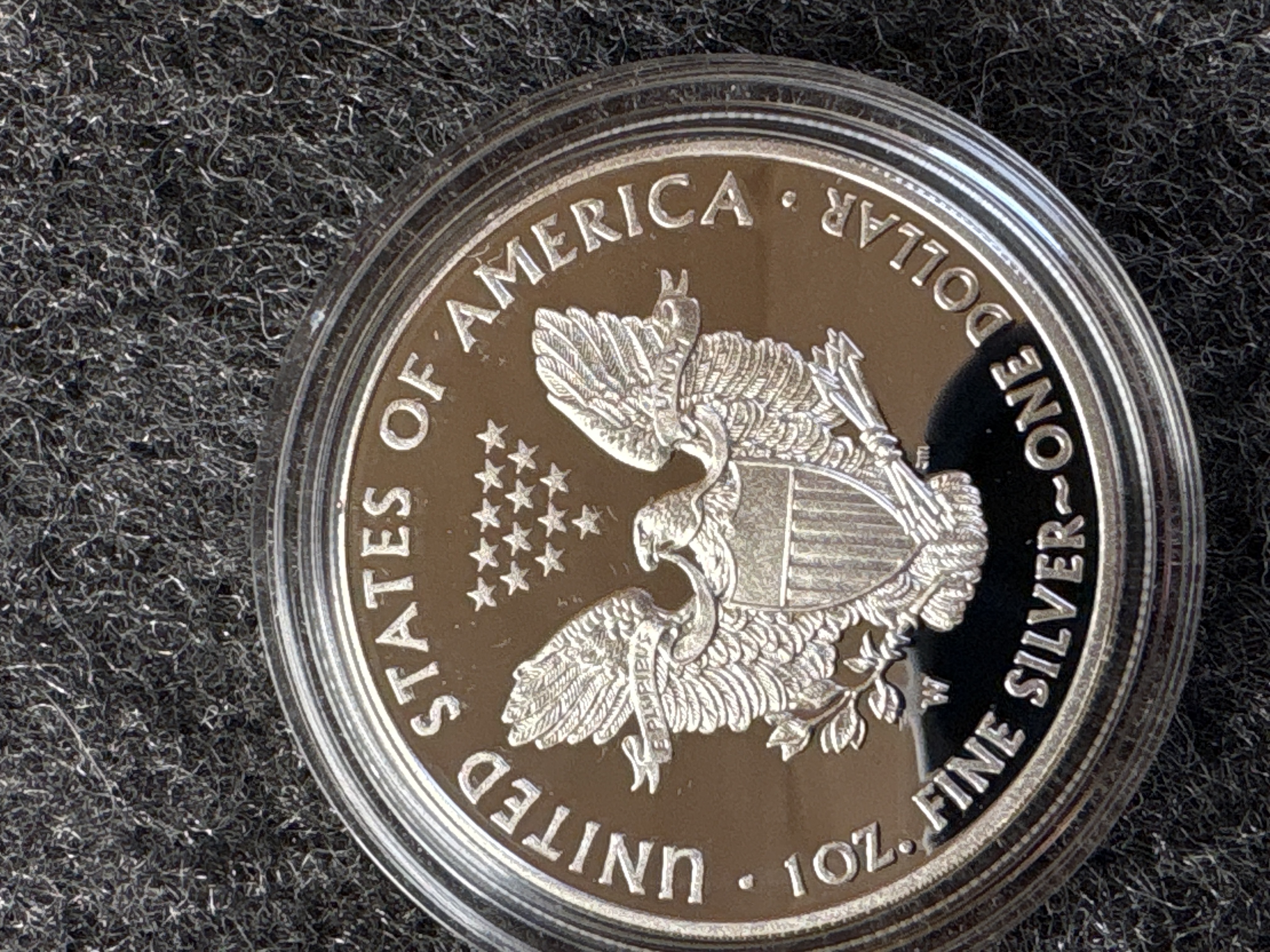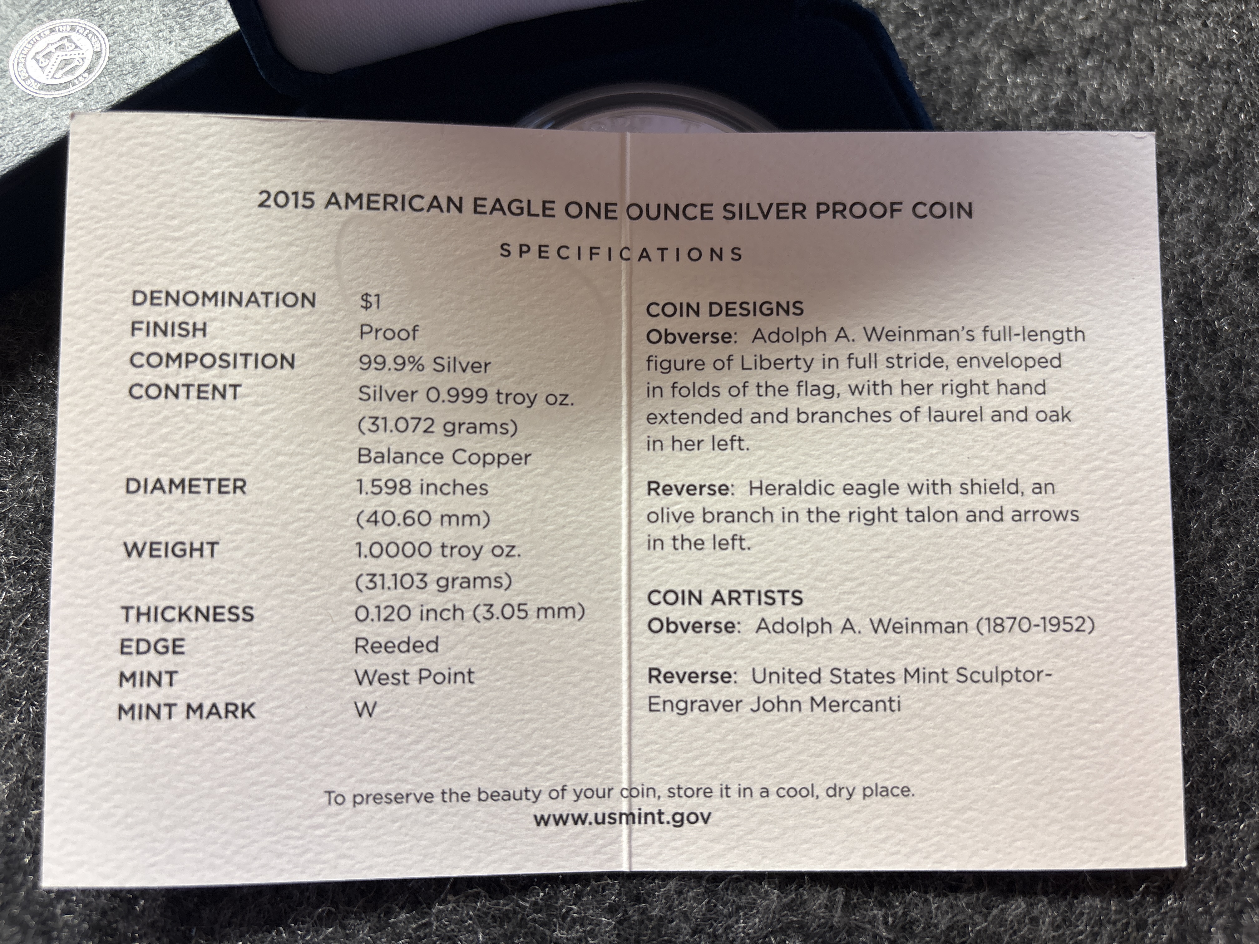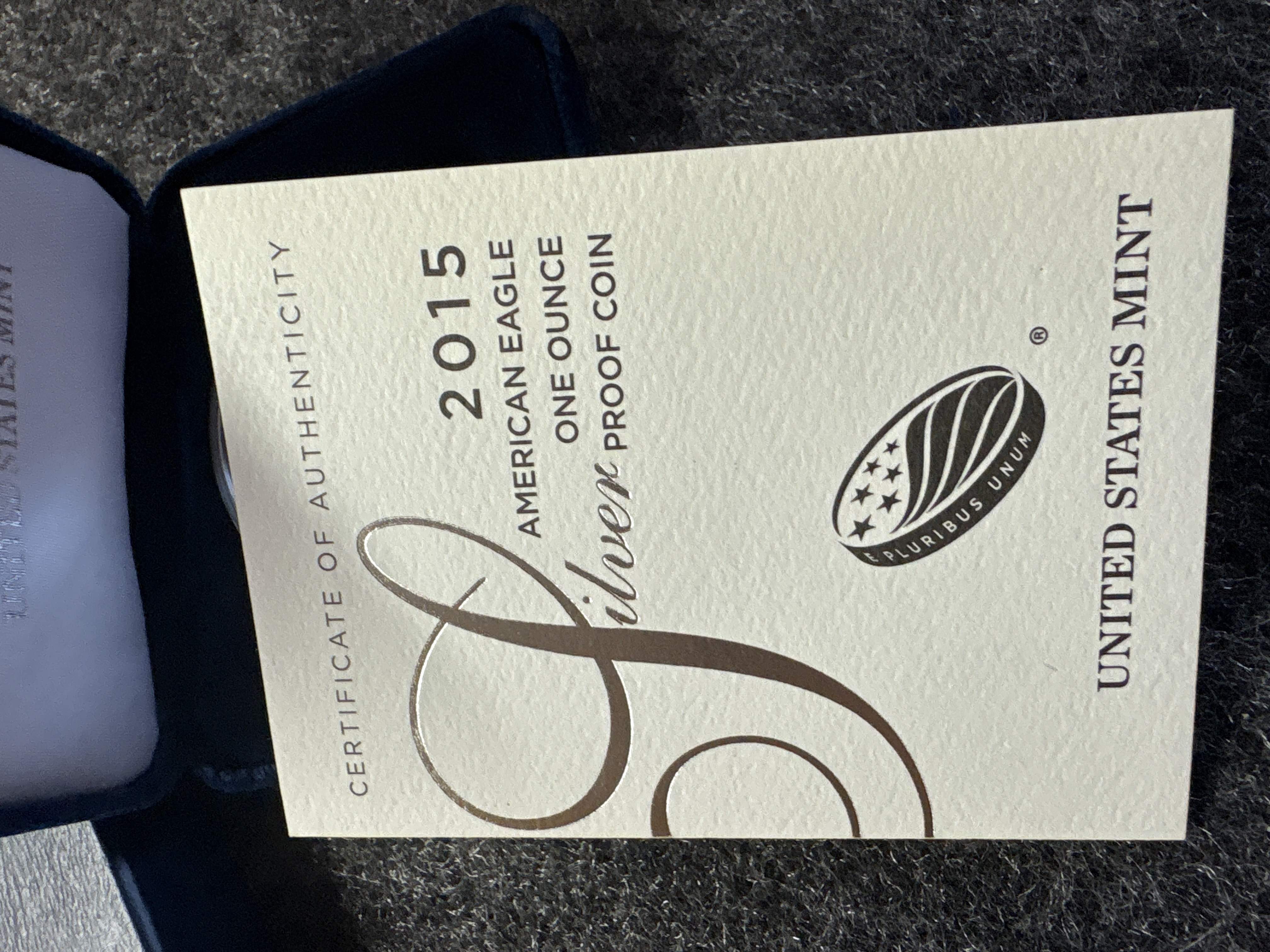 A 2015-W American Eagle one ounce silver proof coin weighing 1.0000 troy oz and measuring 1.598 inches in diameter, accompanied by its original box and certificate of authenticity.