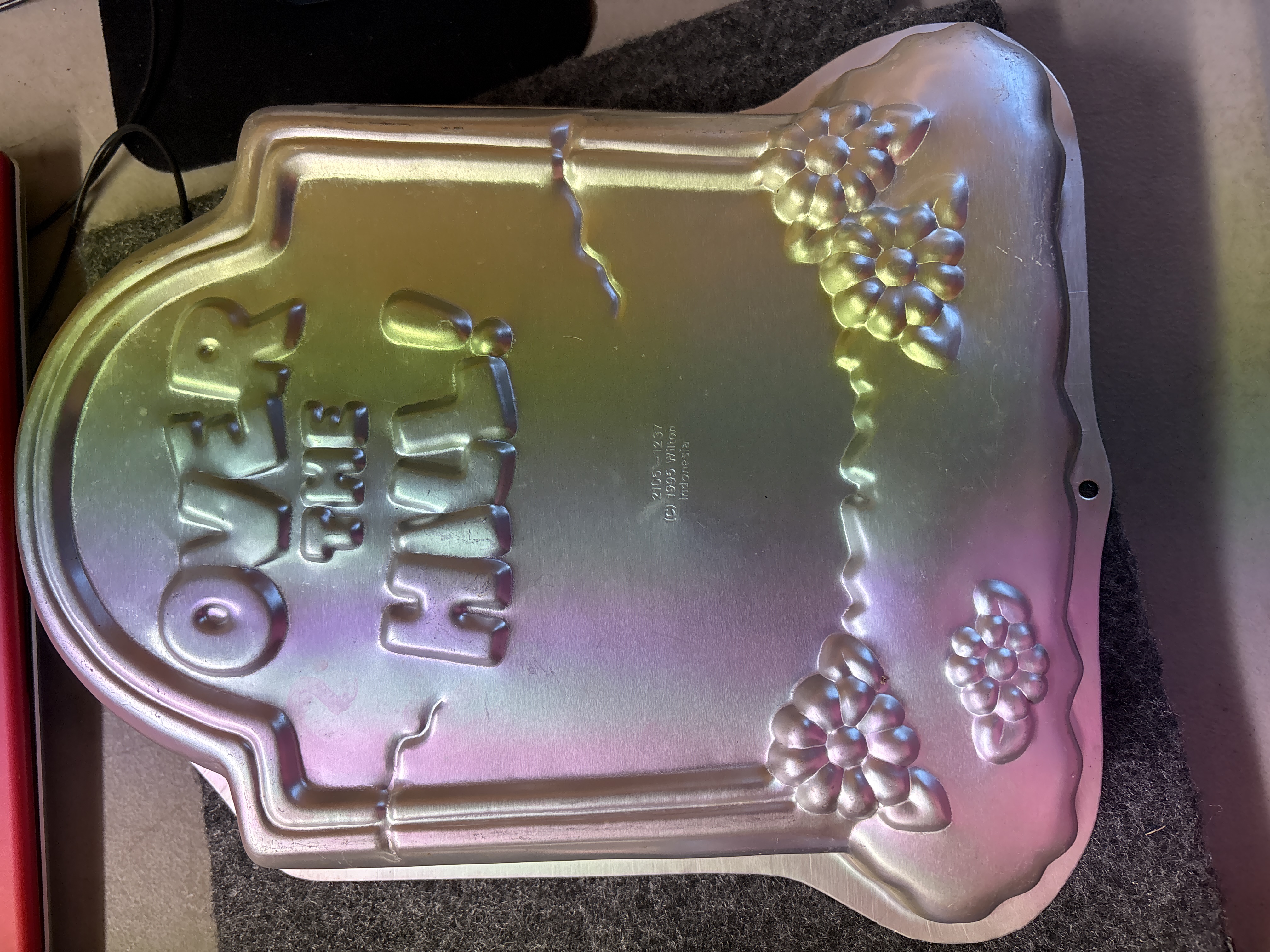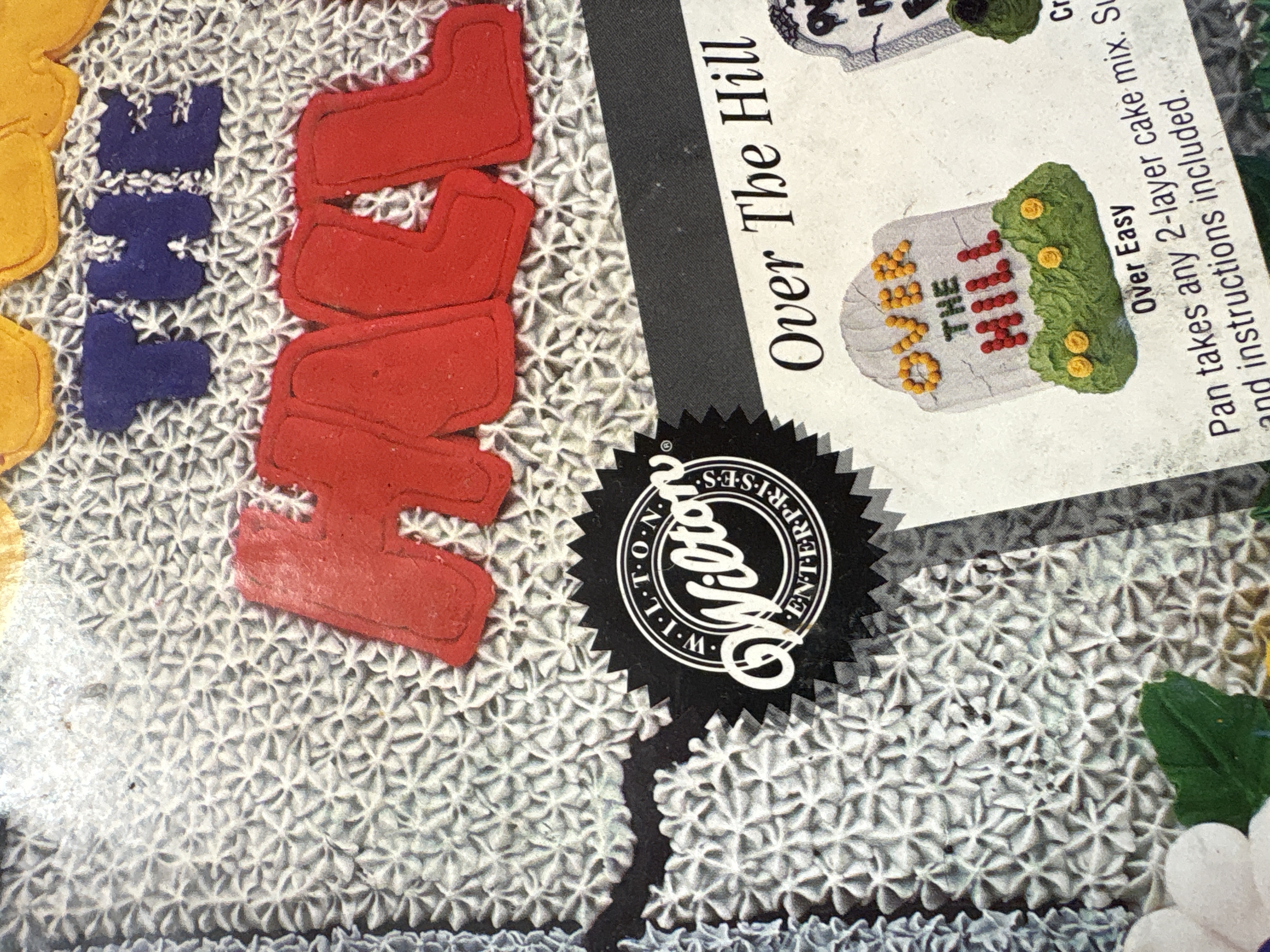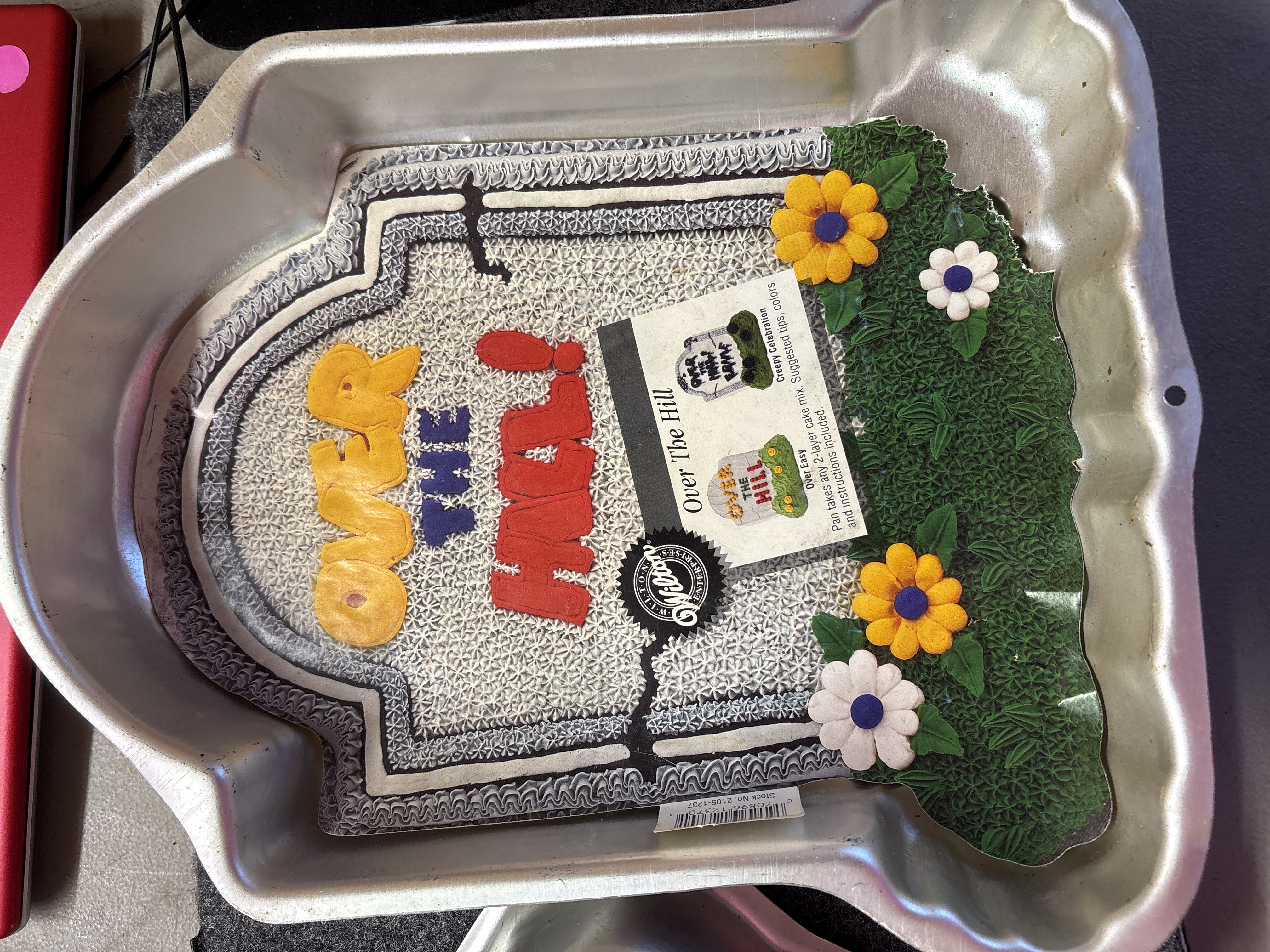 Two silver-colored aluminum cake pans by Wilton featuring a Superman character bust with DC Comics branding and a tombstone shape inscribed with Over The Hill.
