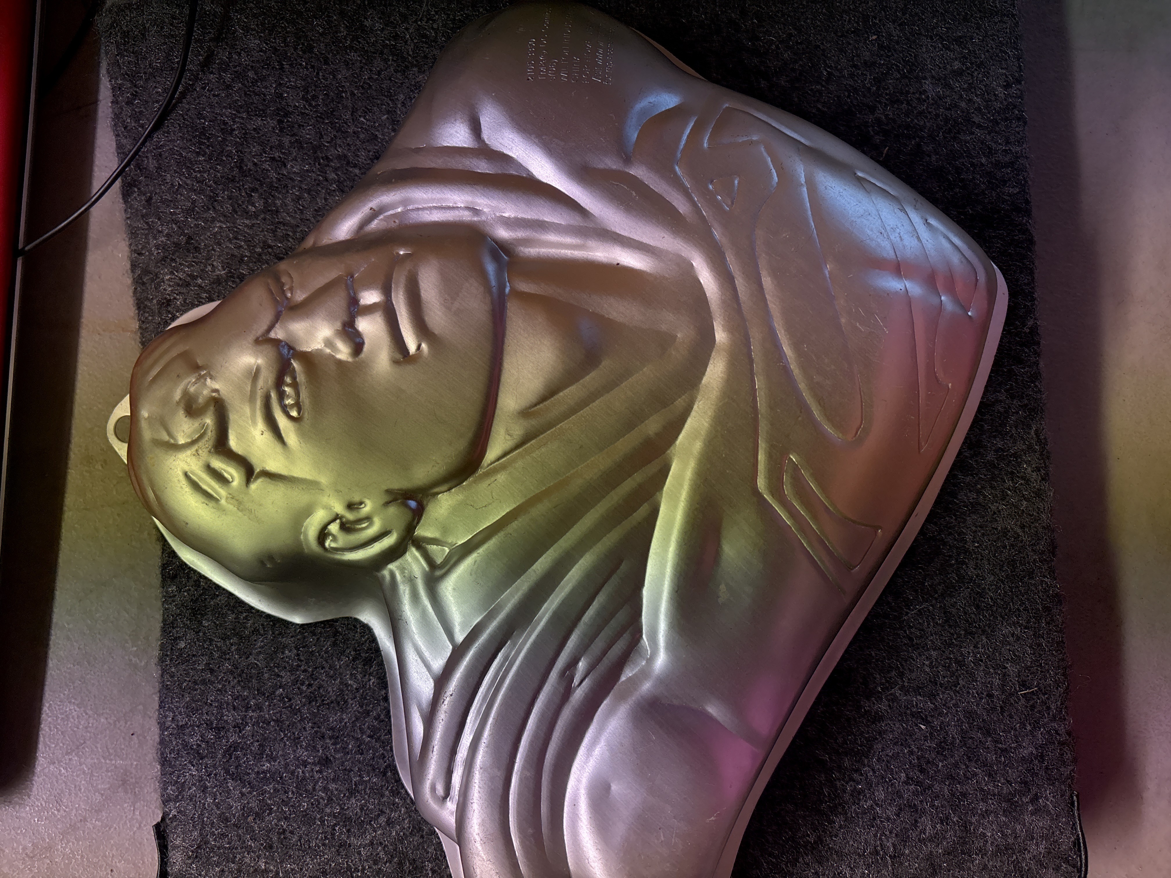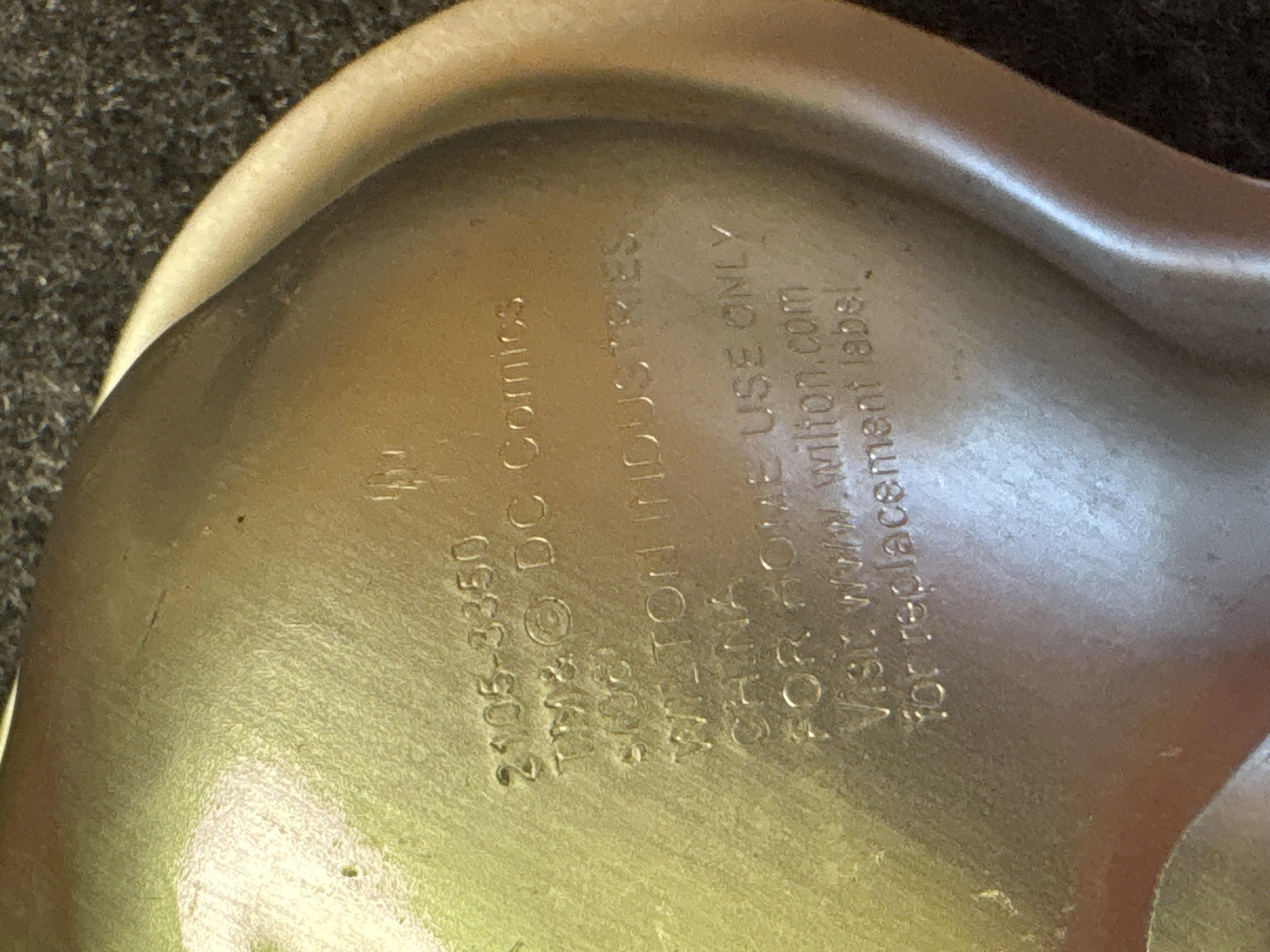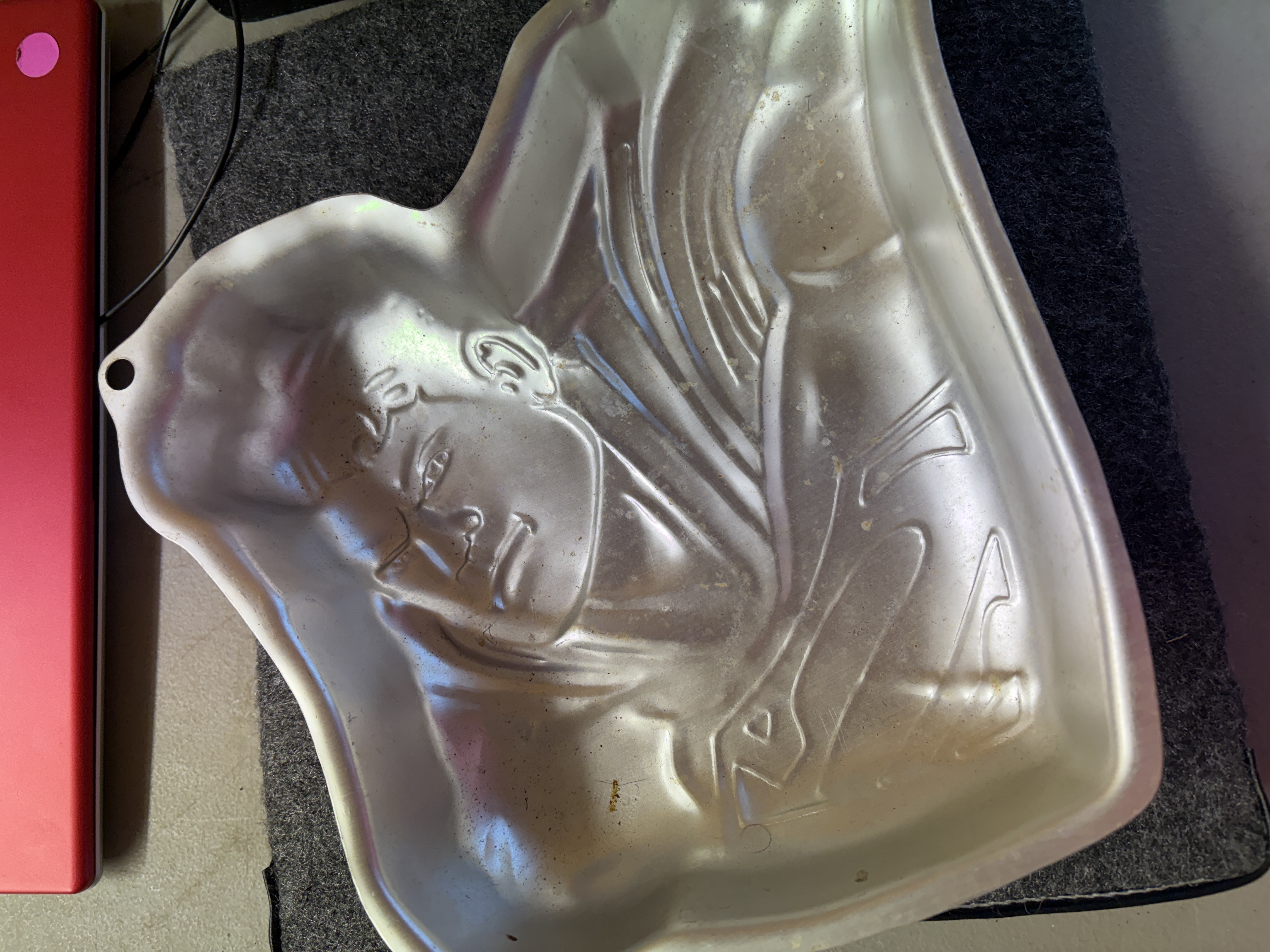 Two silver-colored aluminum cake pans by Wilton featuring a Superman character bust with DC Comics branding and a tombstone shape inscribed with Over The Hill.