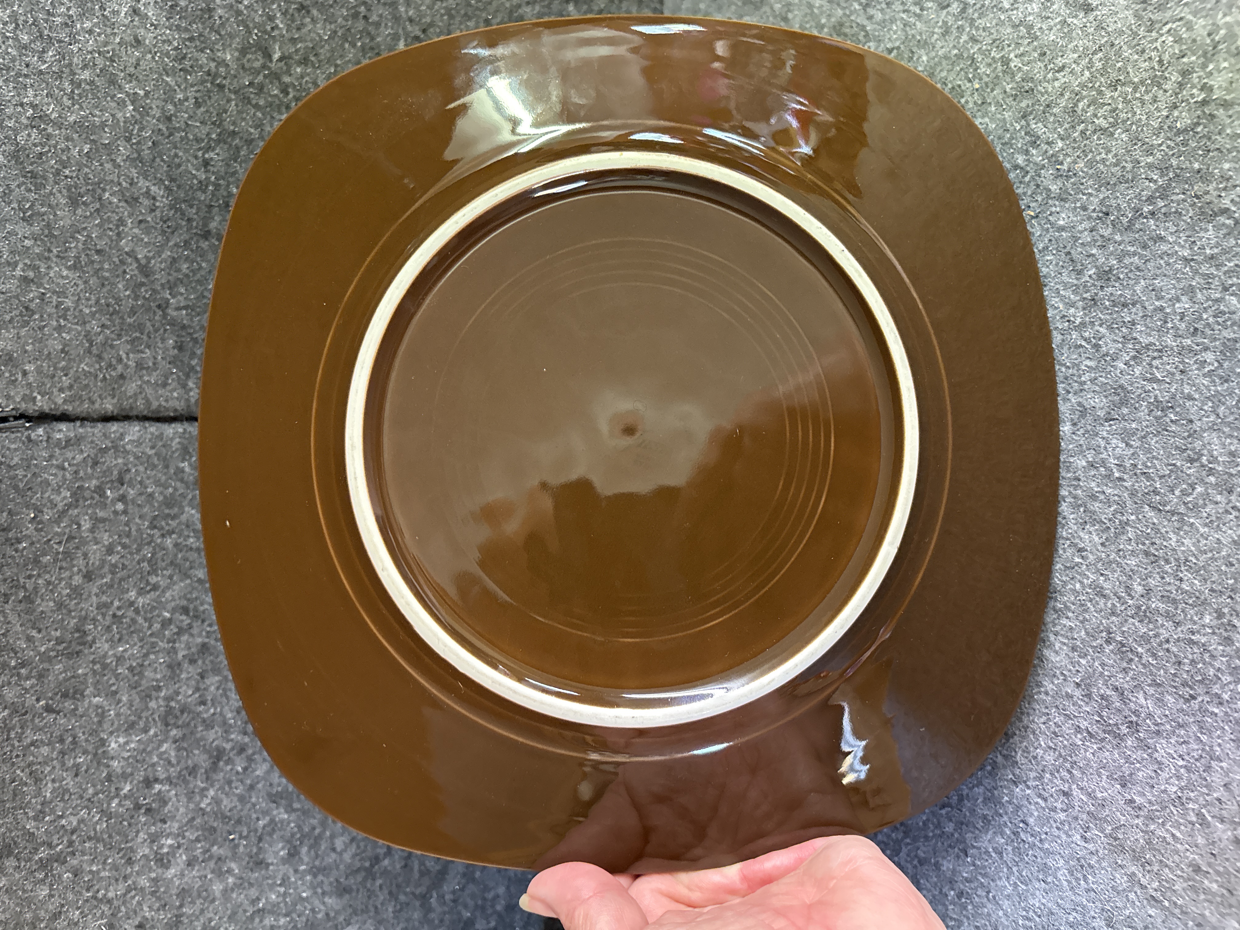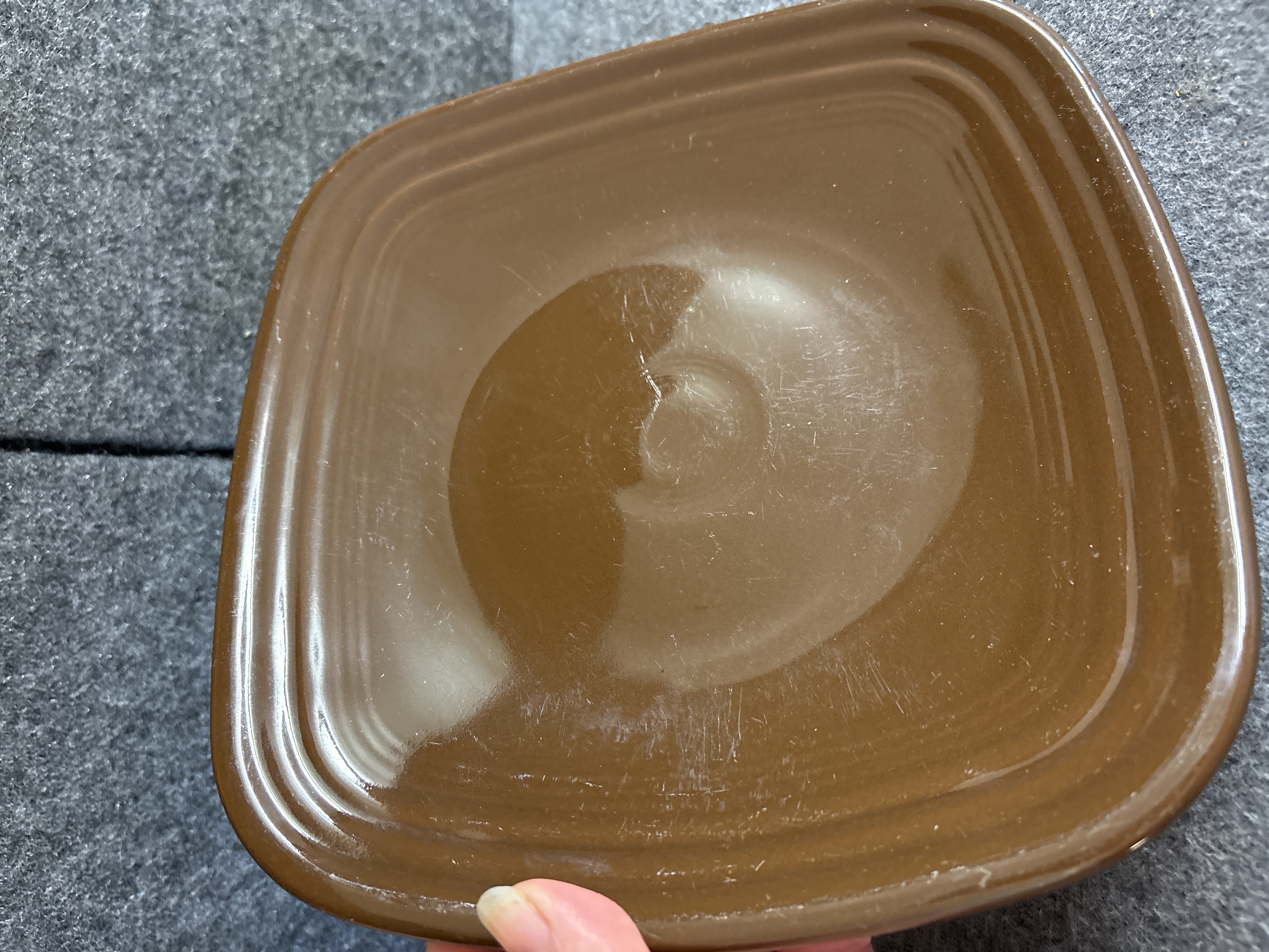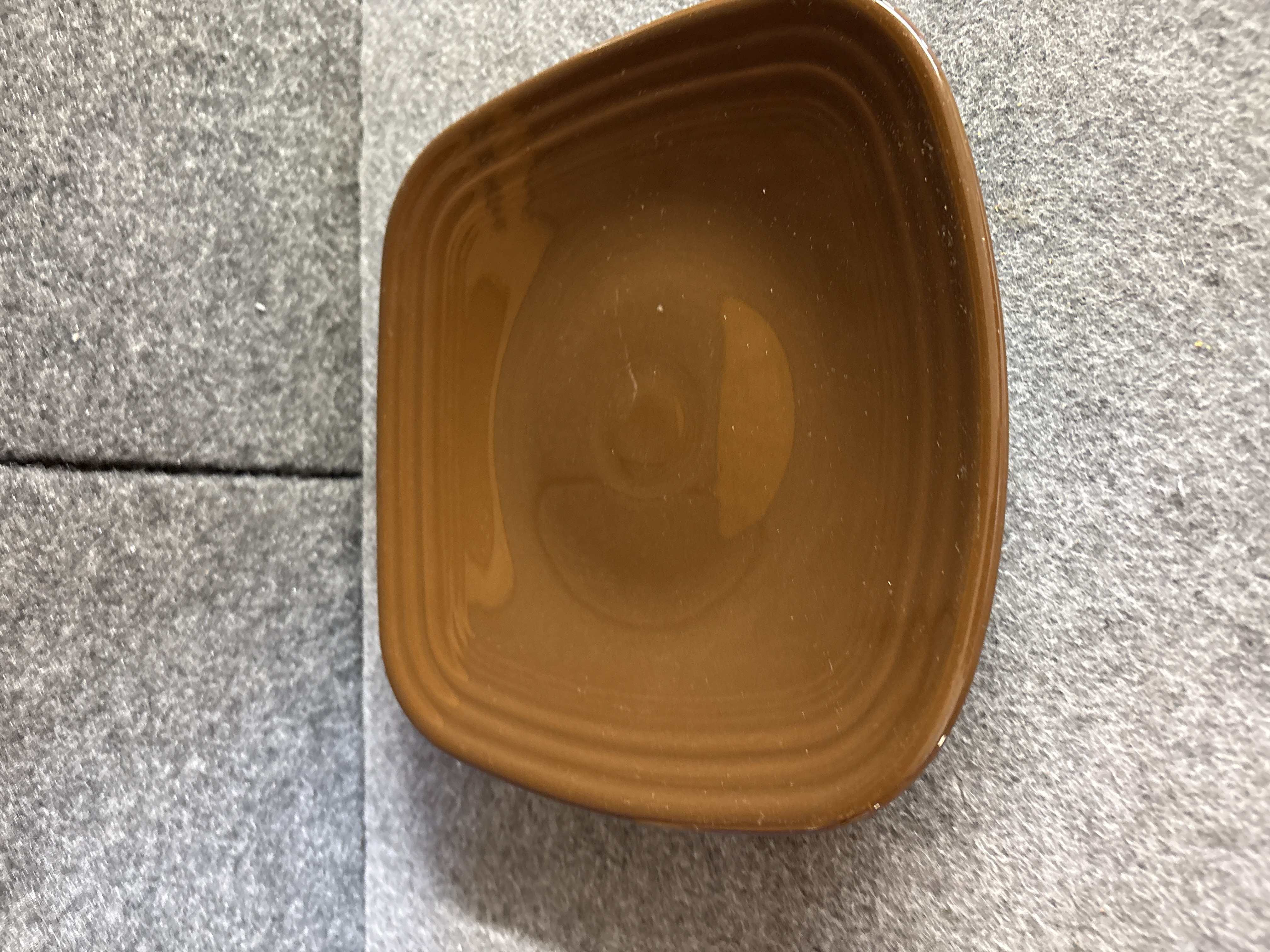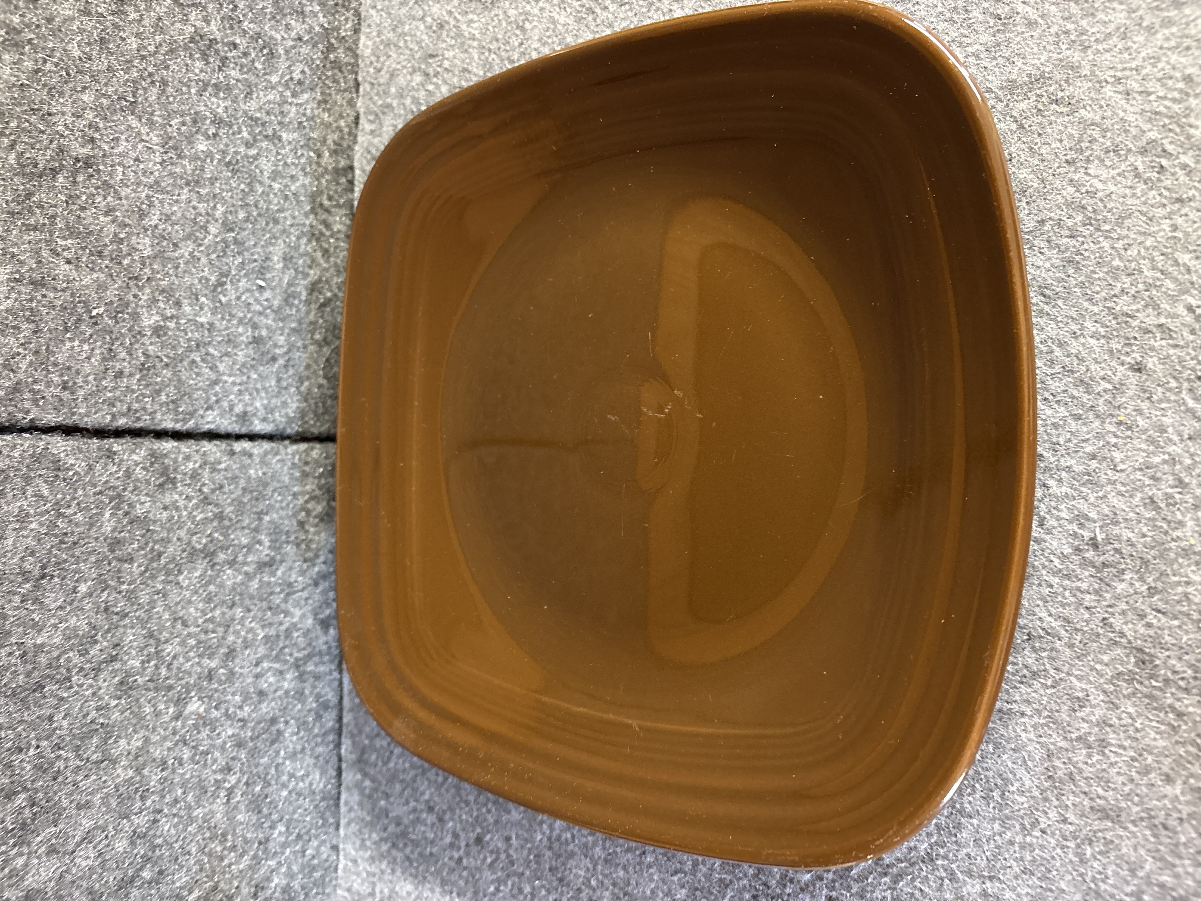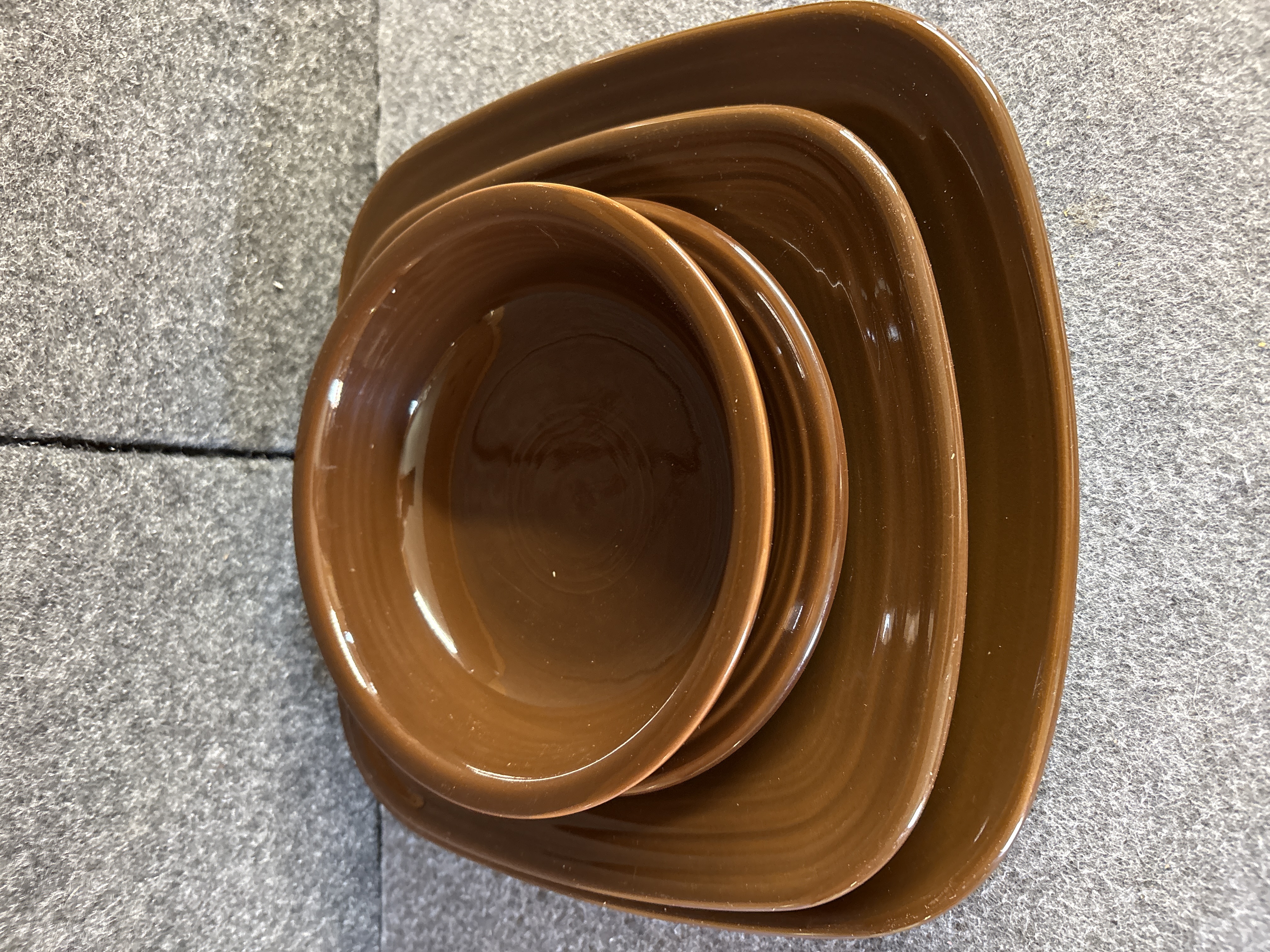 A collection of brown ceramic square plates and round bowls featuring concentric ring designs and markings for Homer Laughlin Fiesta USA.