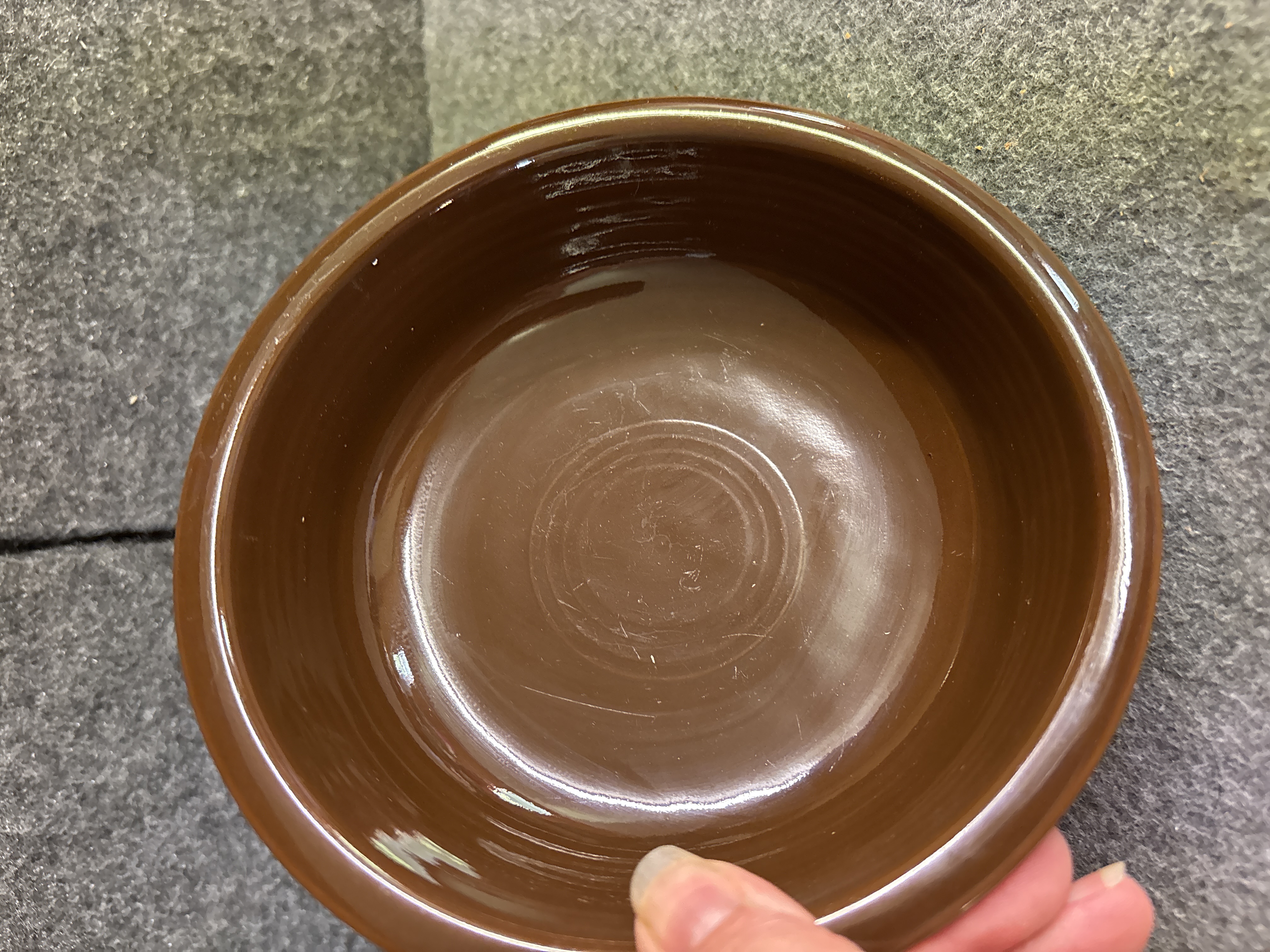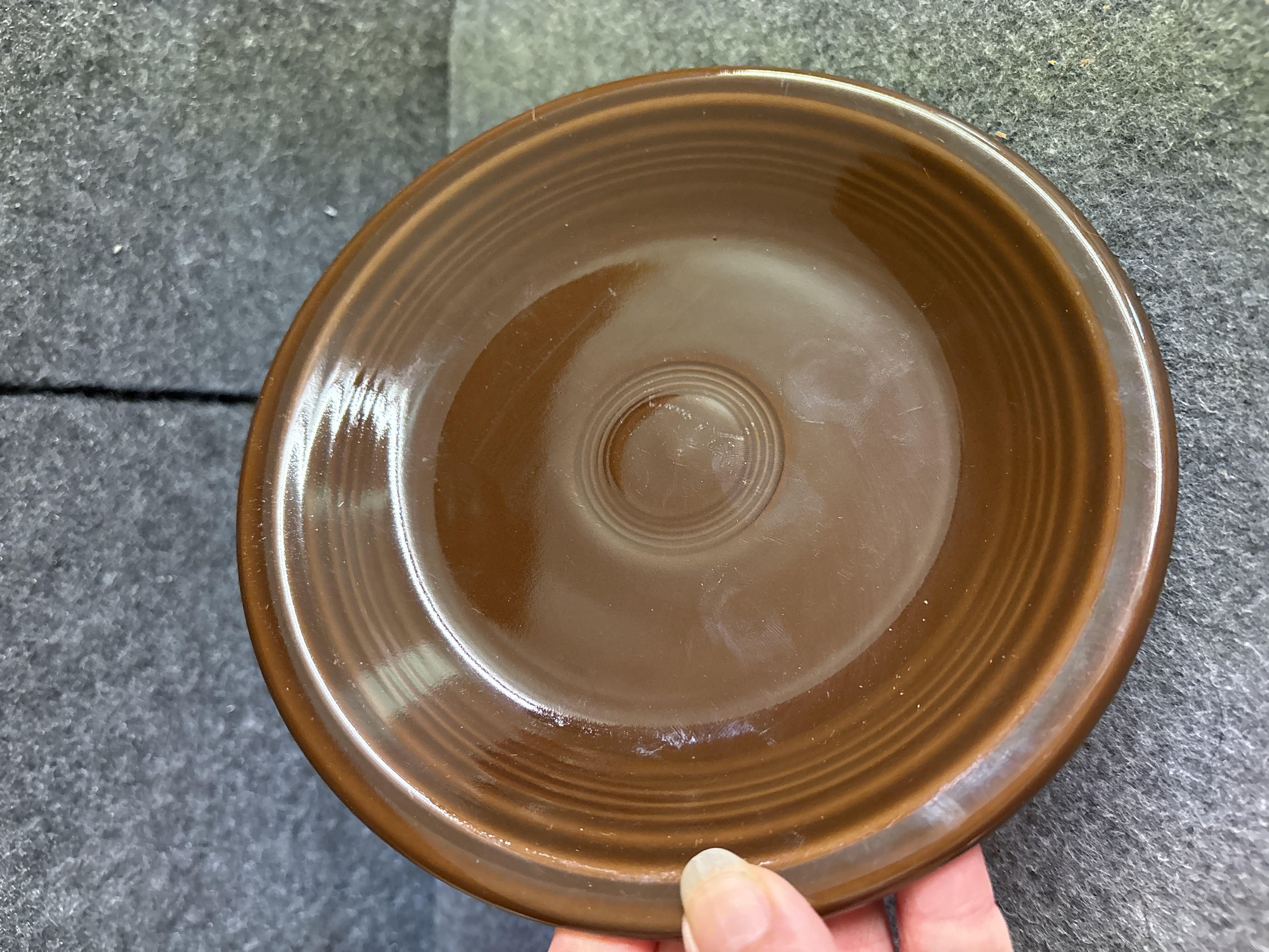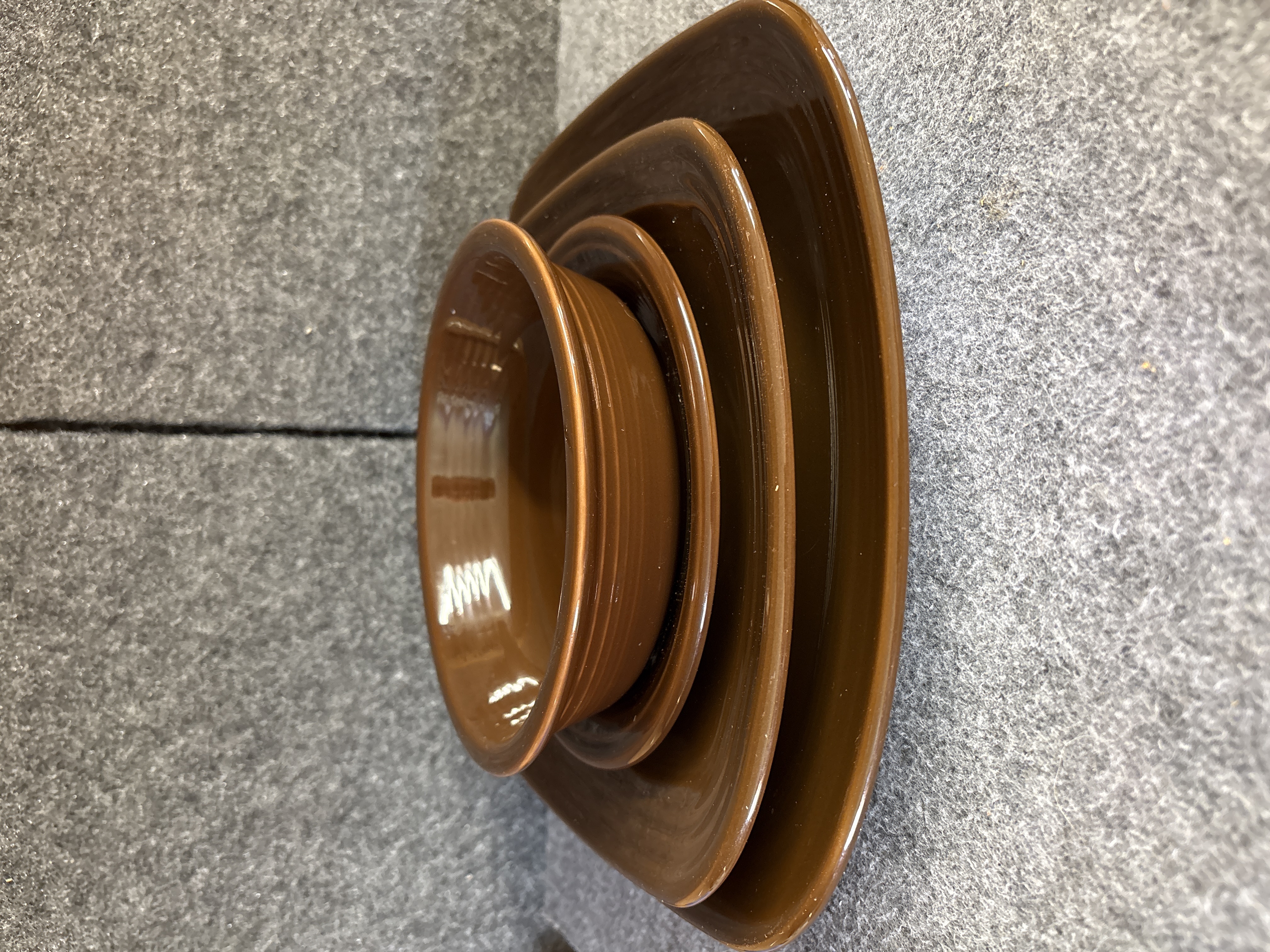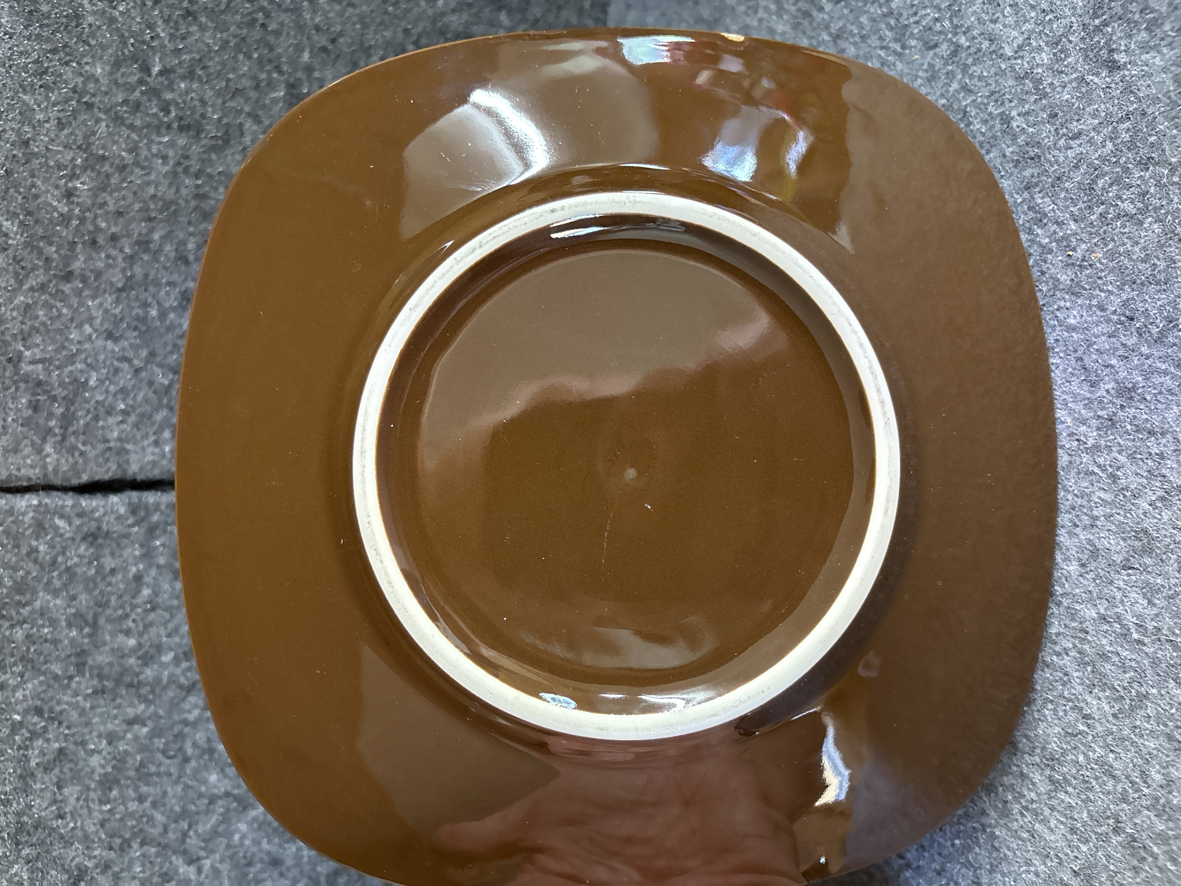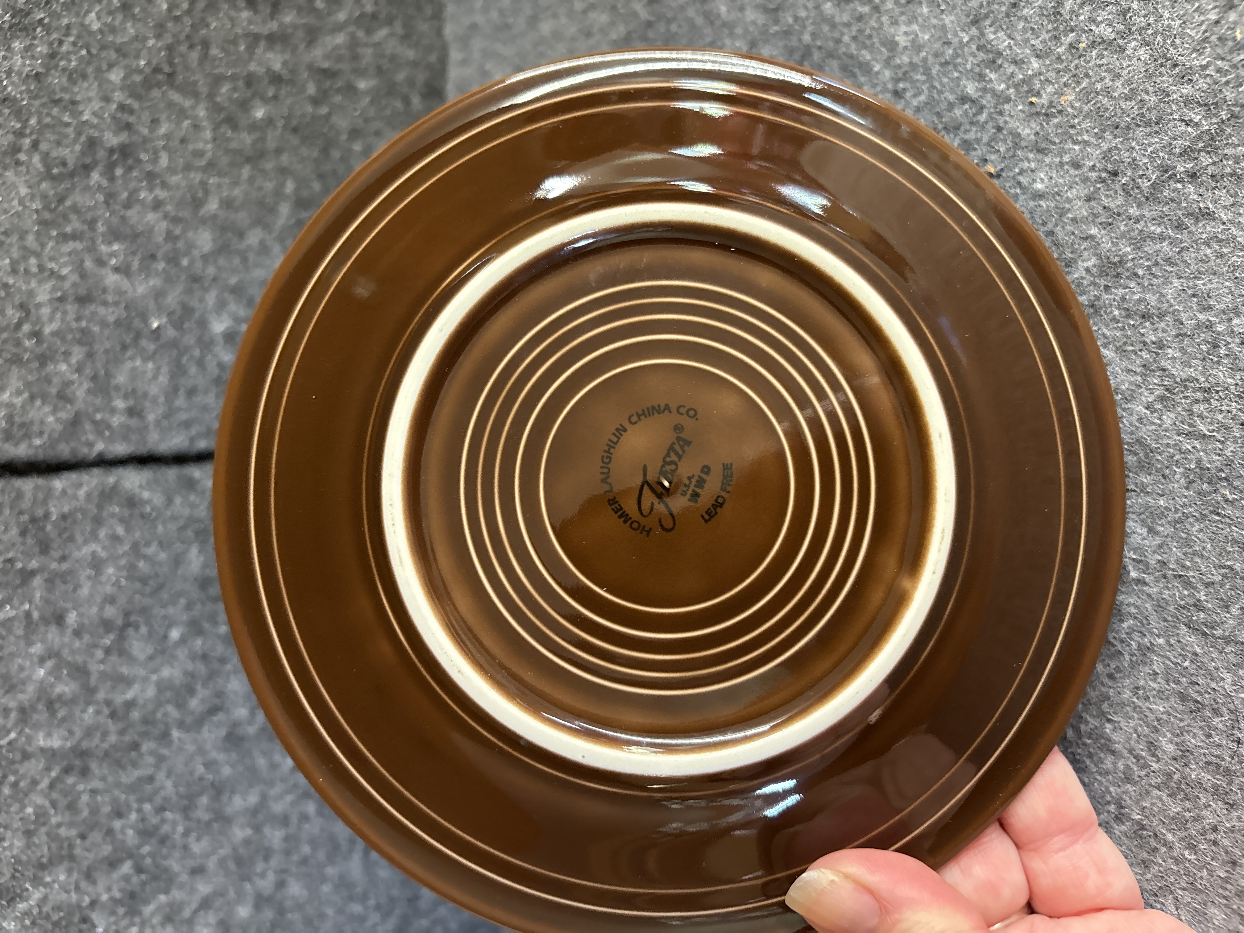 A collection of brown ceramic square plates and round bowls featuring concentric ring designs and markings for Homer Laughlin Fiesta USA.