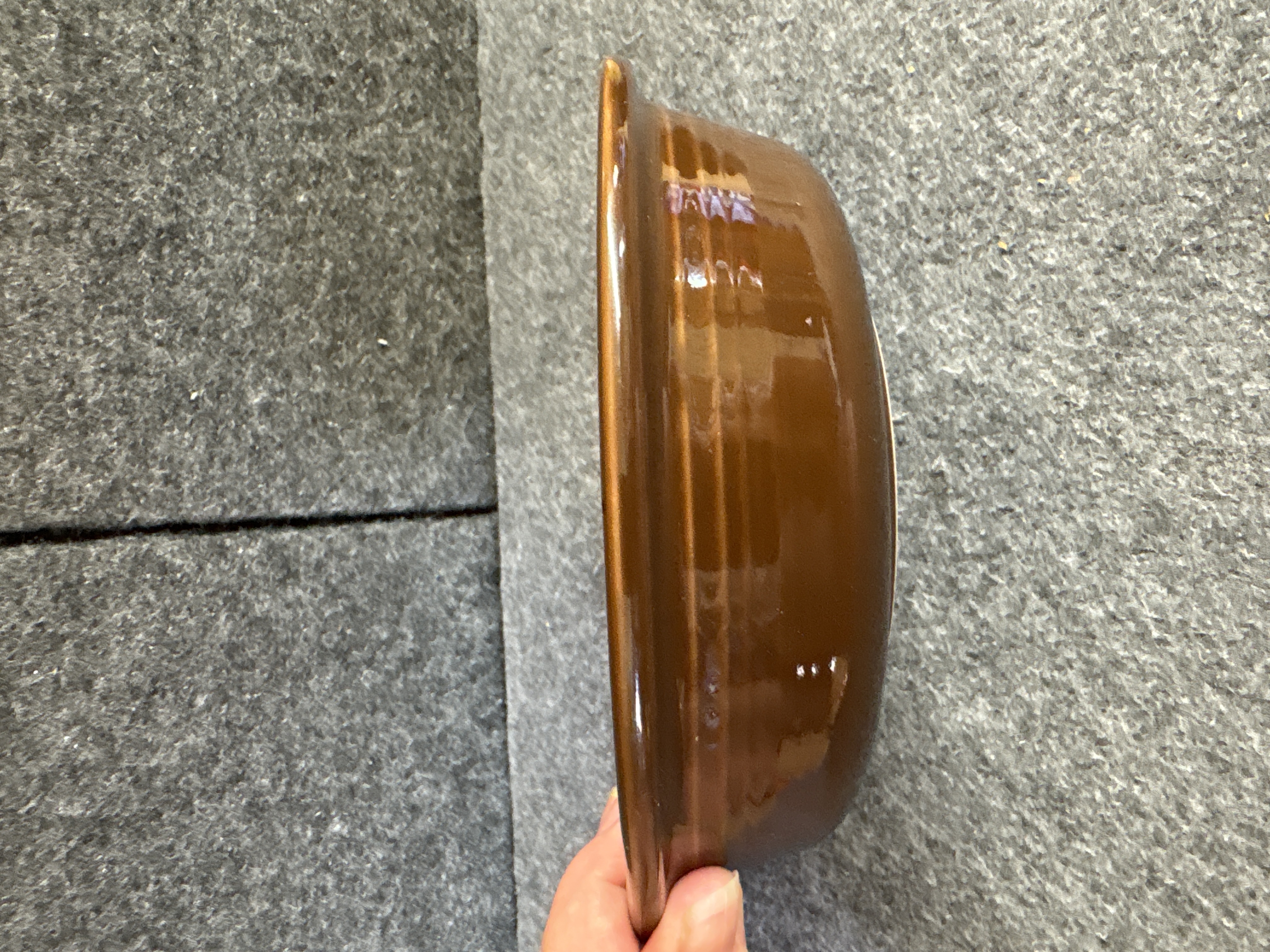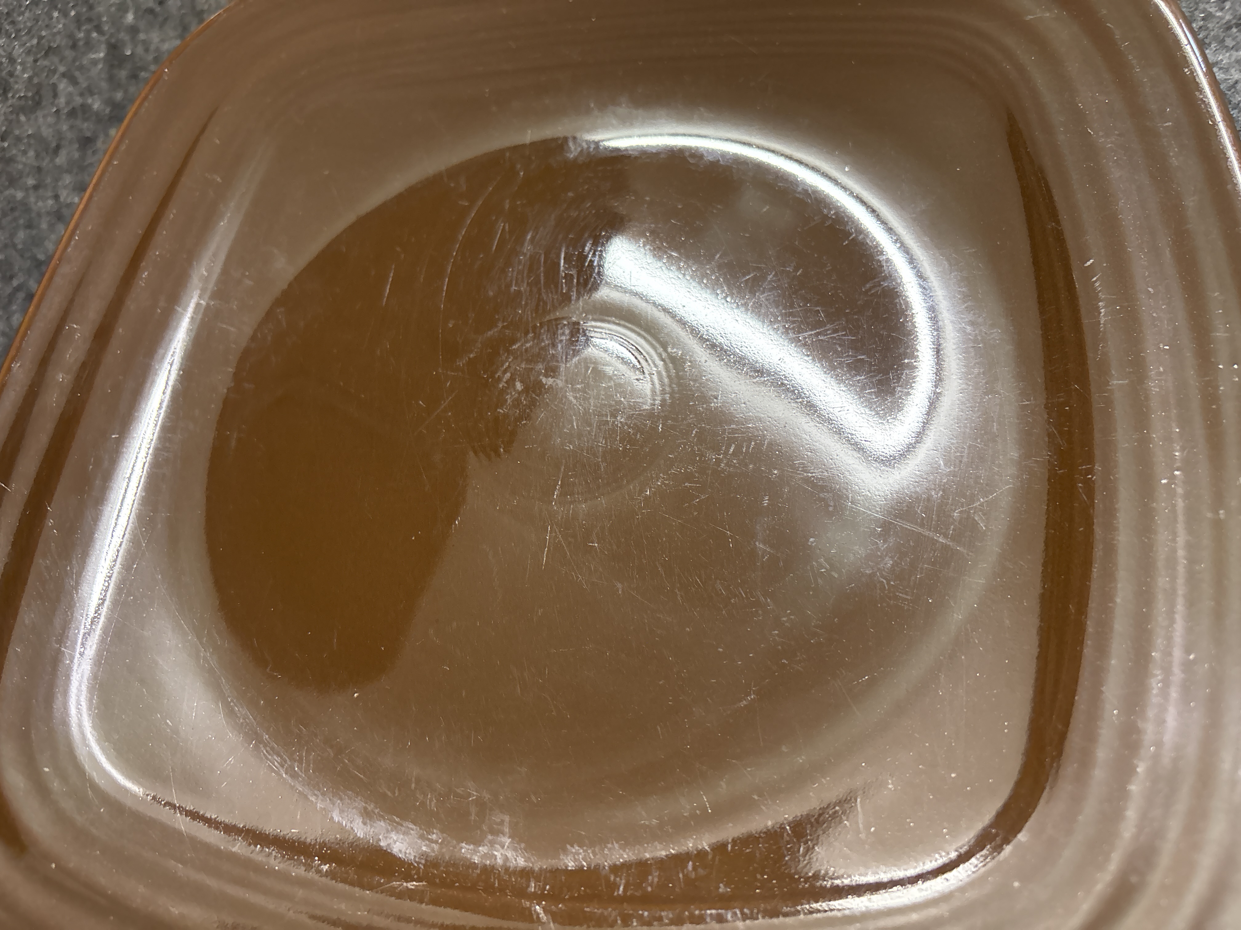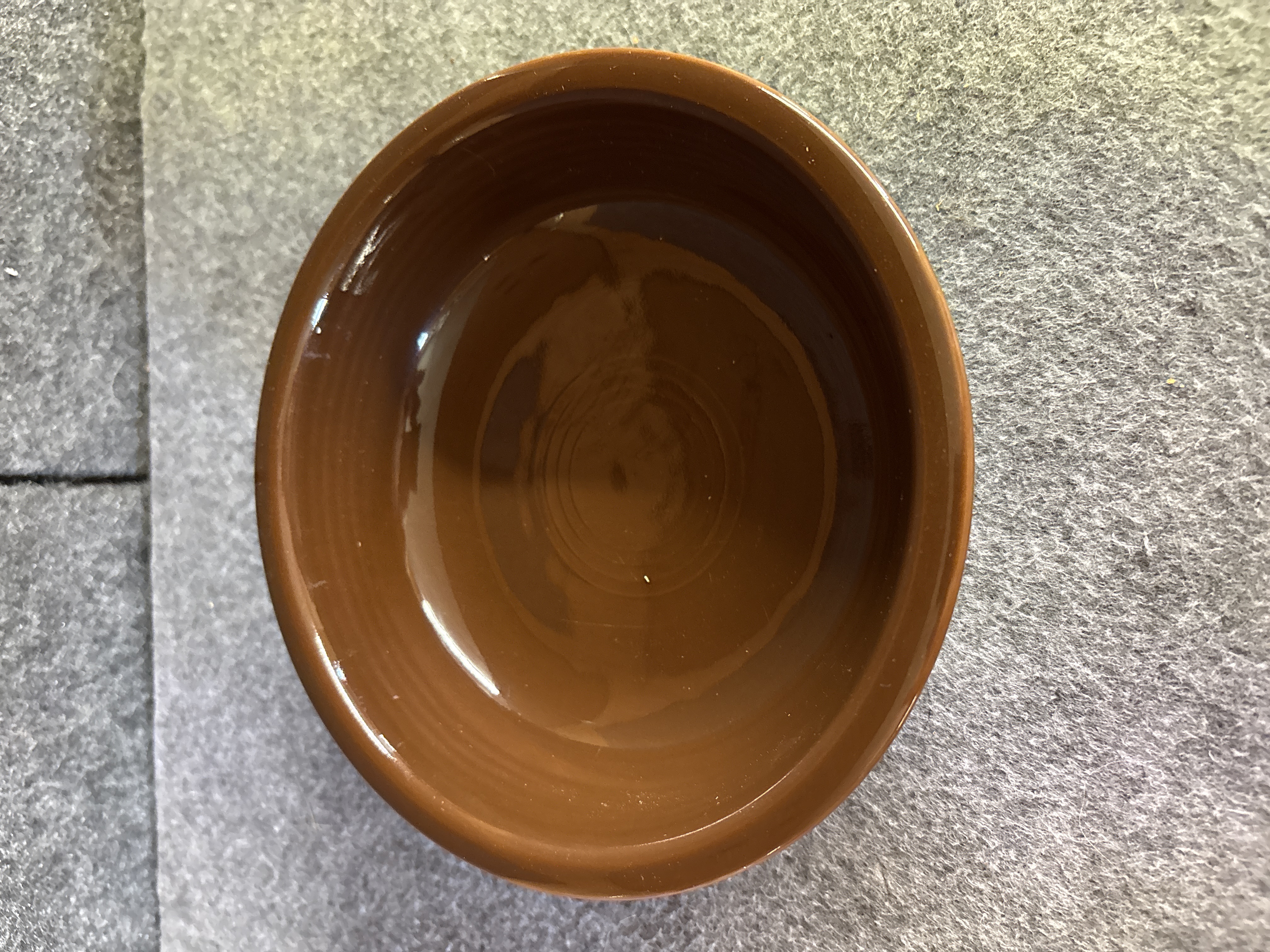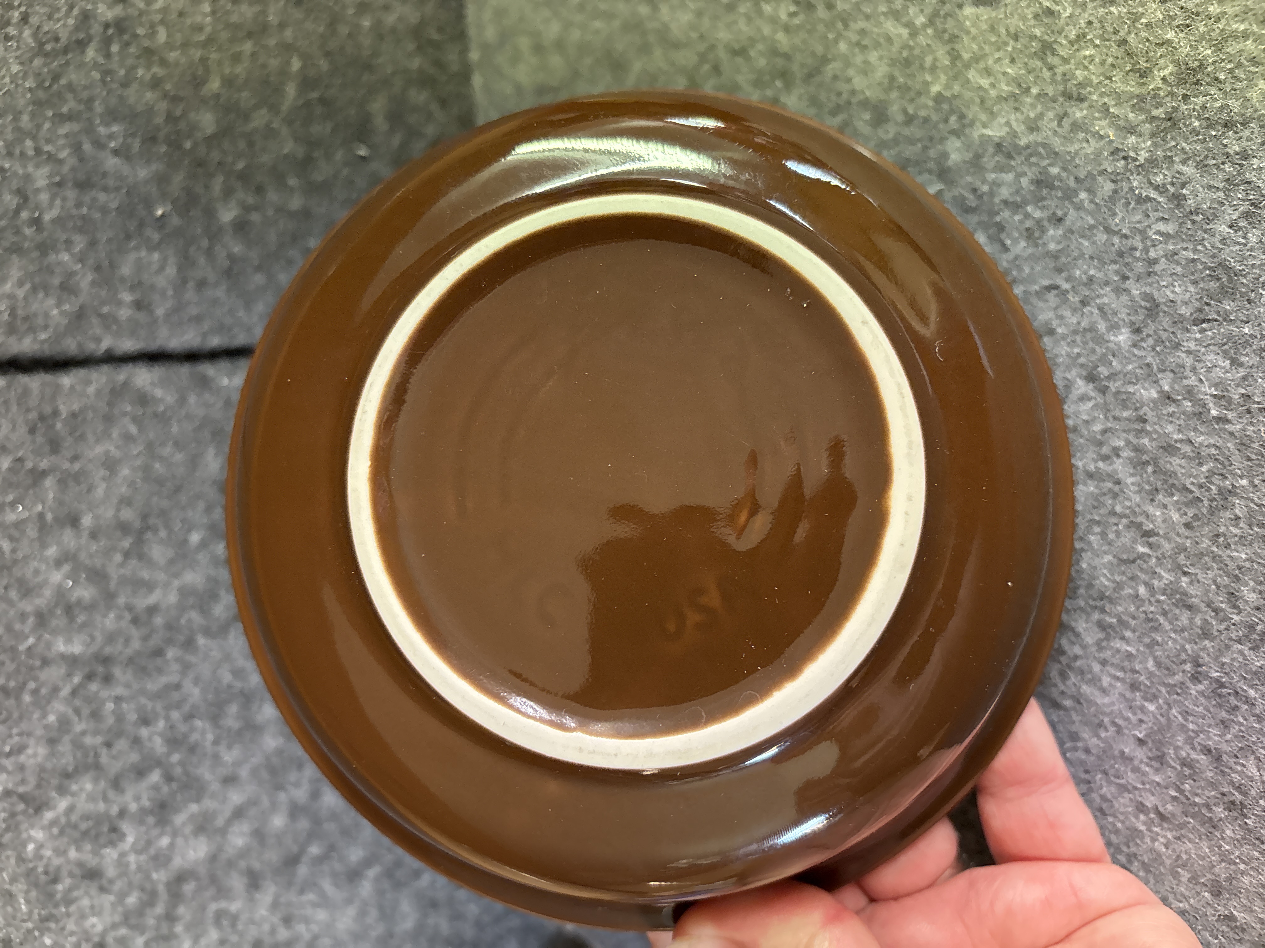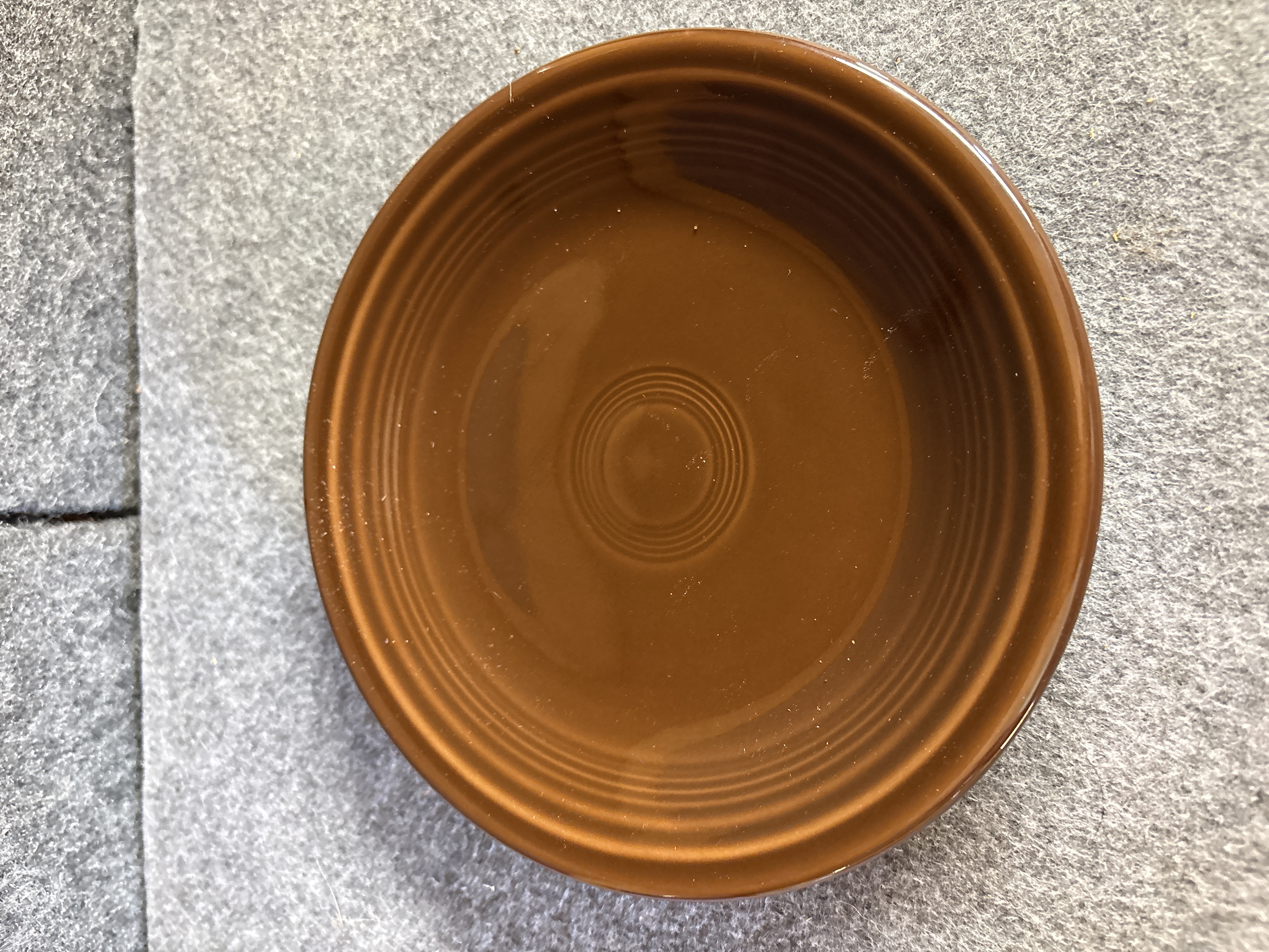 A collection of brown ceramic square plates and round bowls featuring concentric ring designs and markings for Homer Laughlin Fiesta USA.