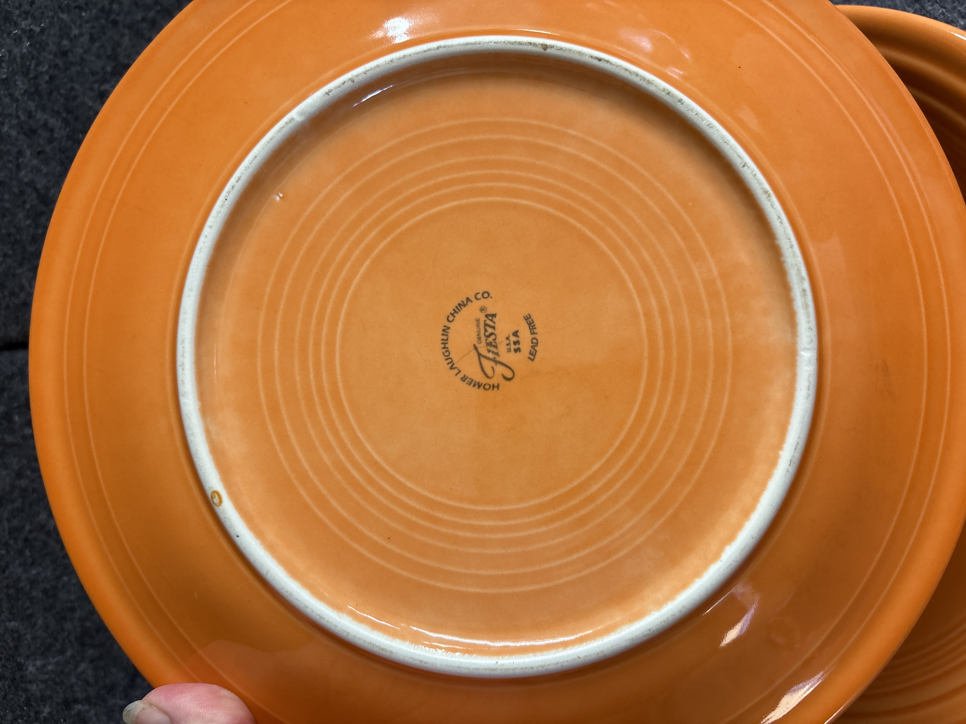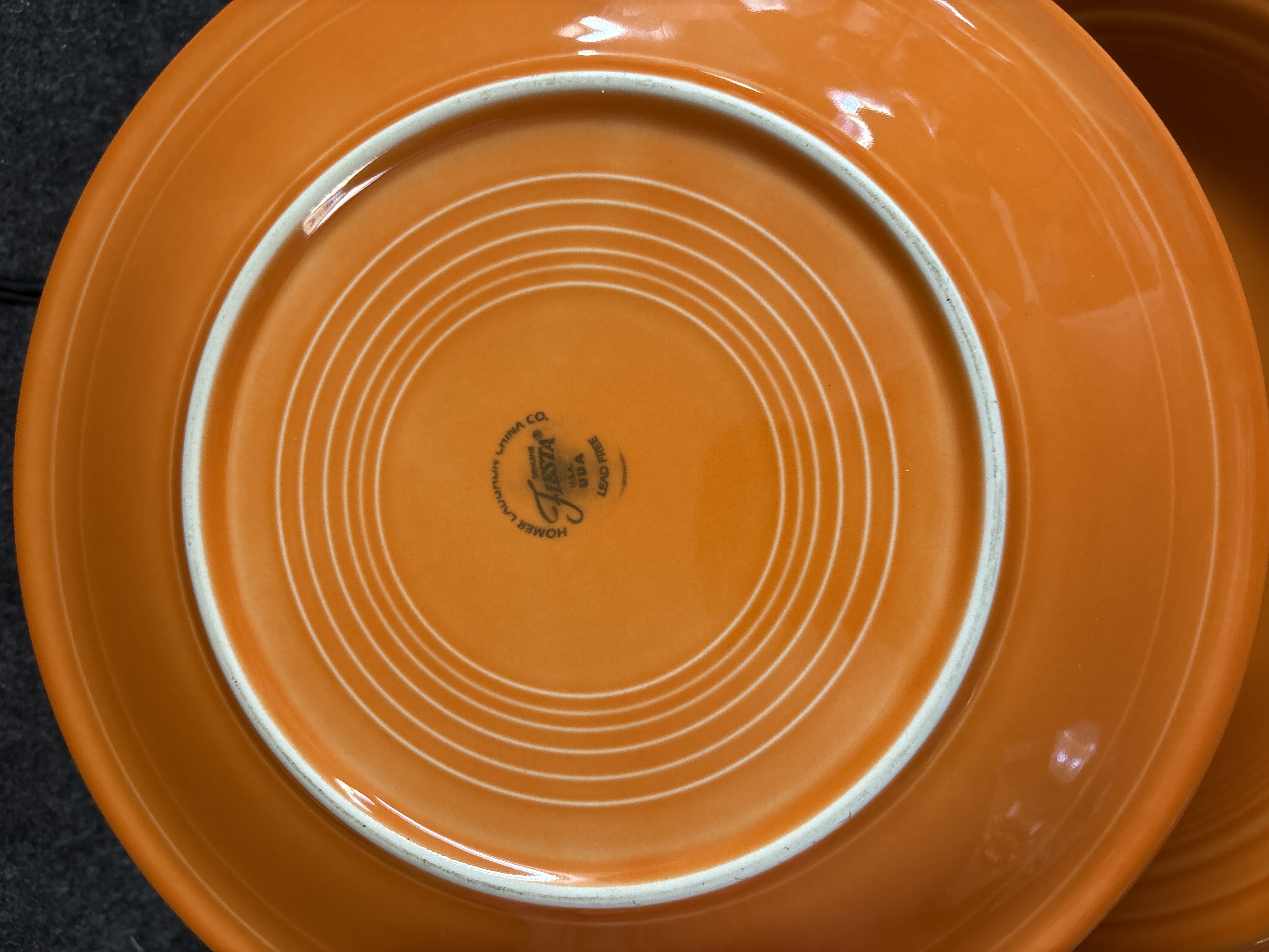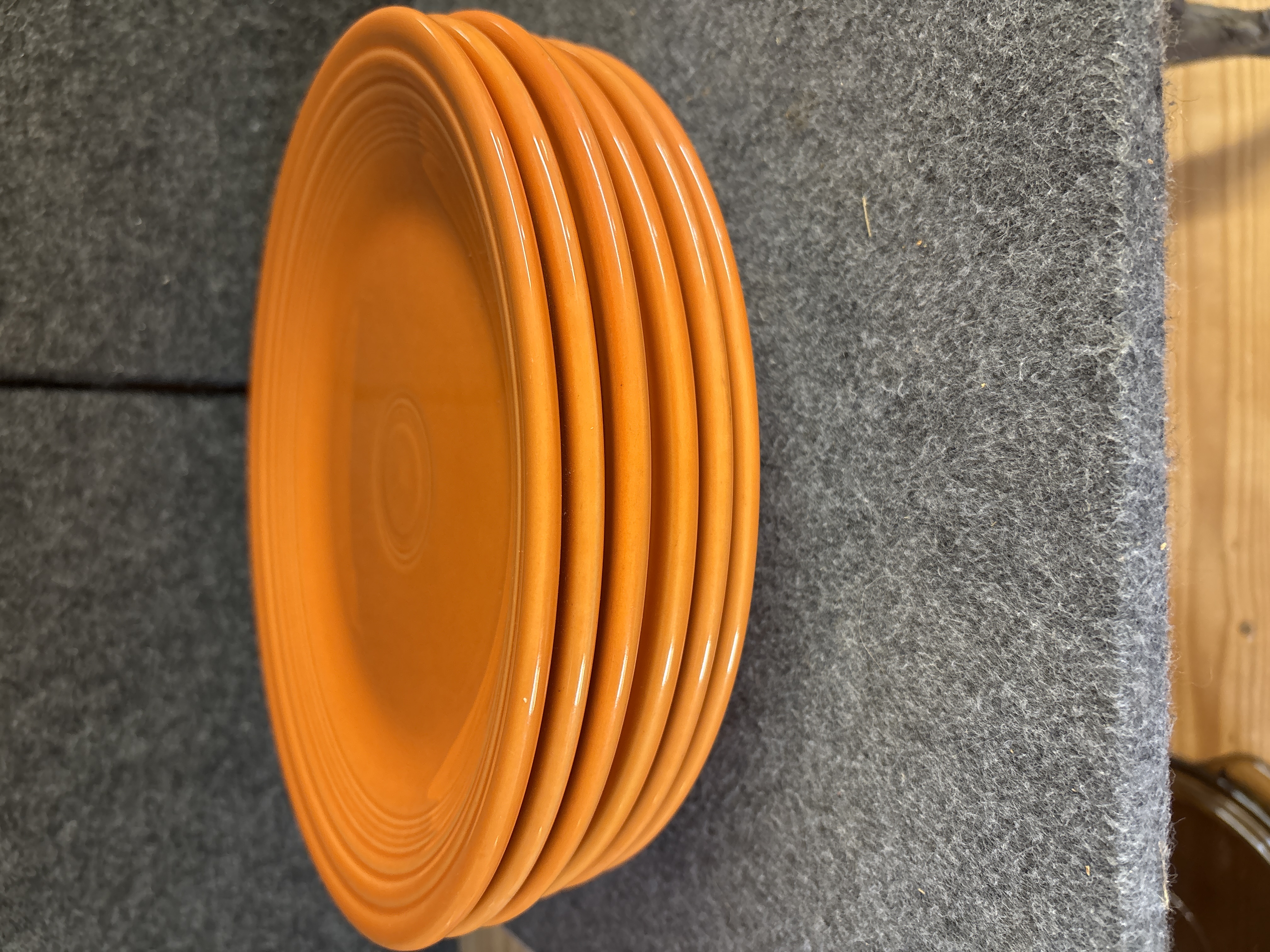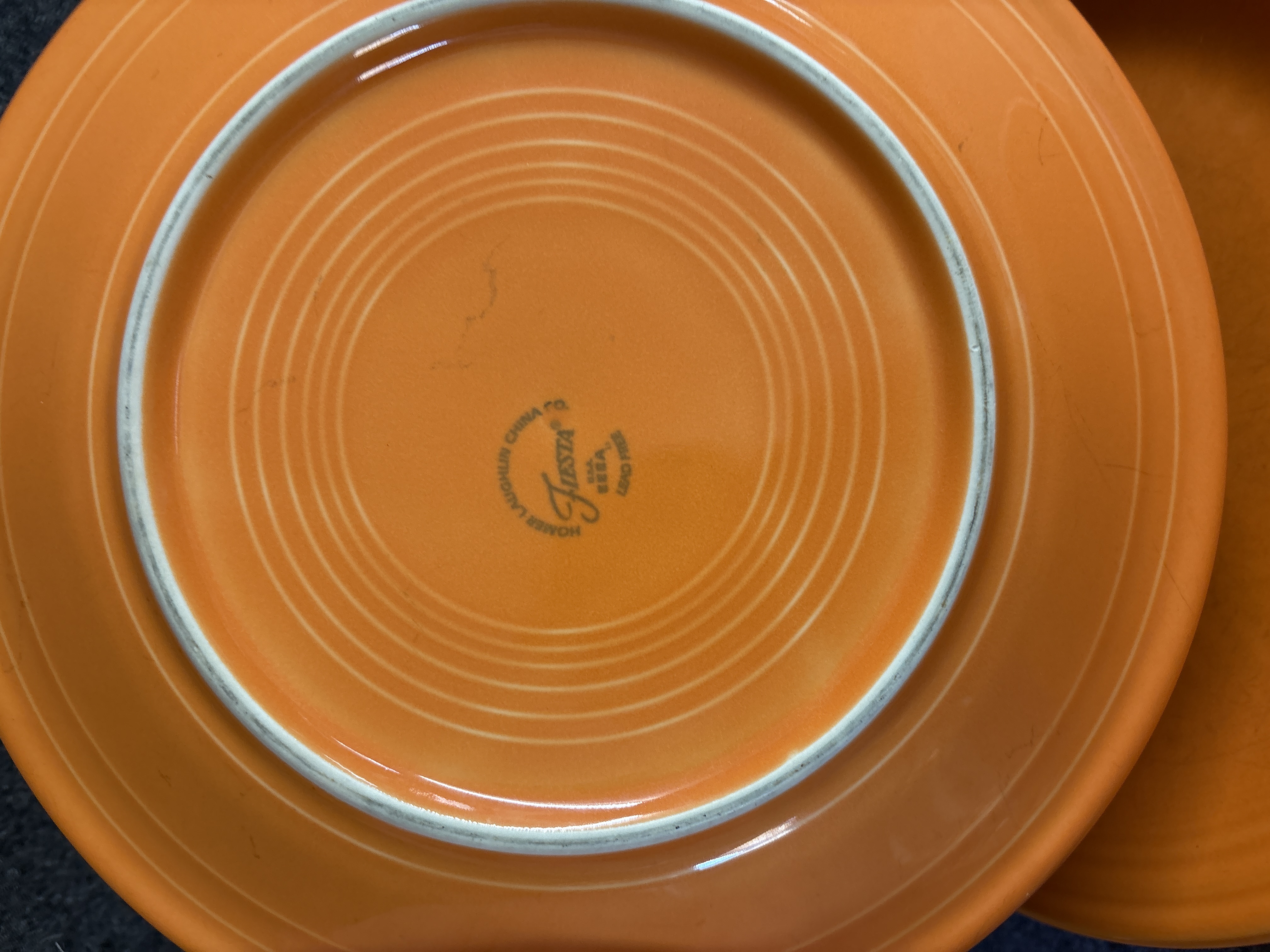 A collection of orange ceramic dinner plates featuring the signature concentric ring pattern and Homer Laughlin backstamps on the undersides.