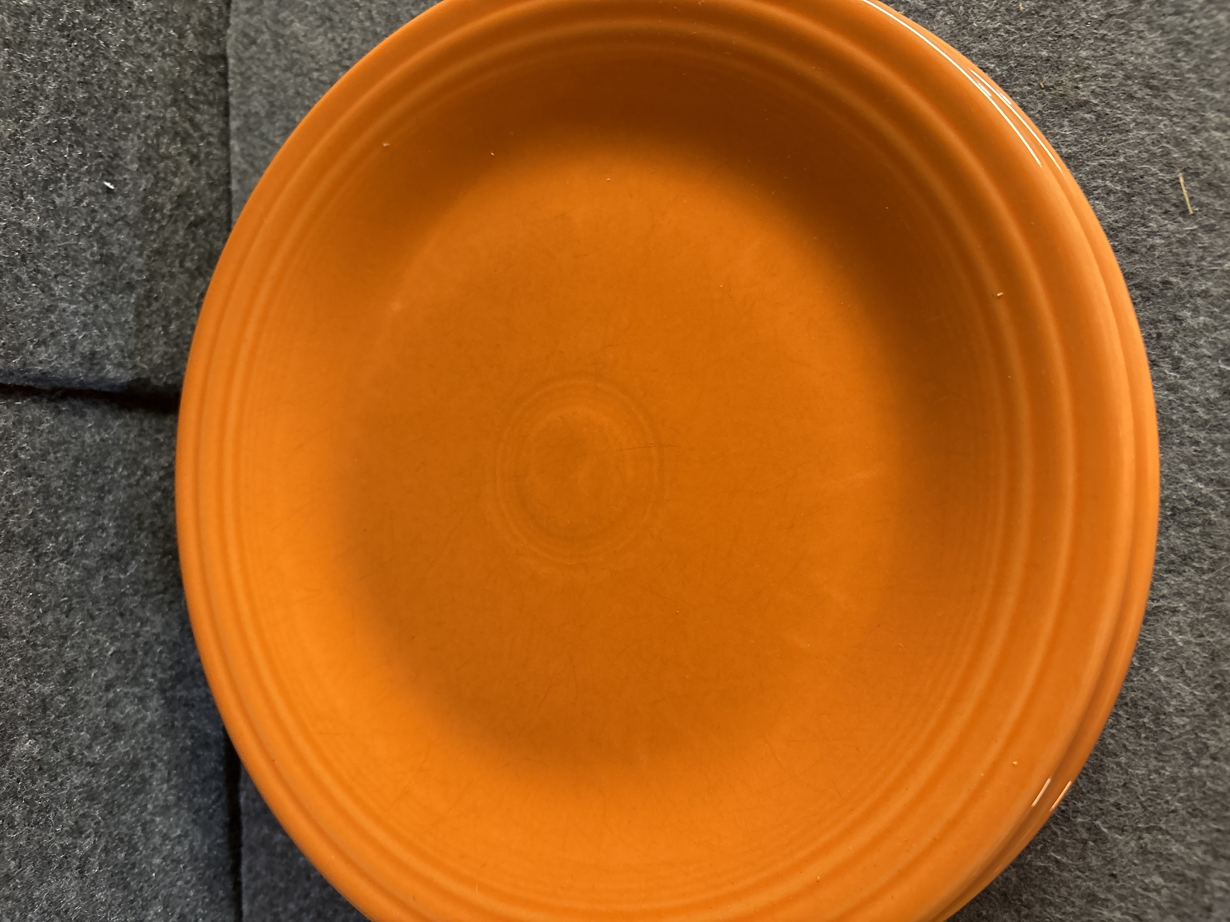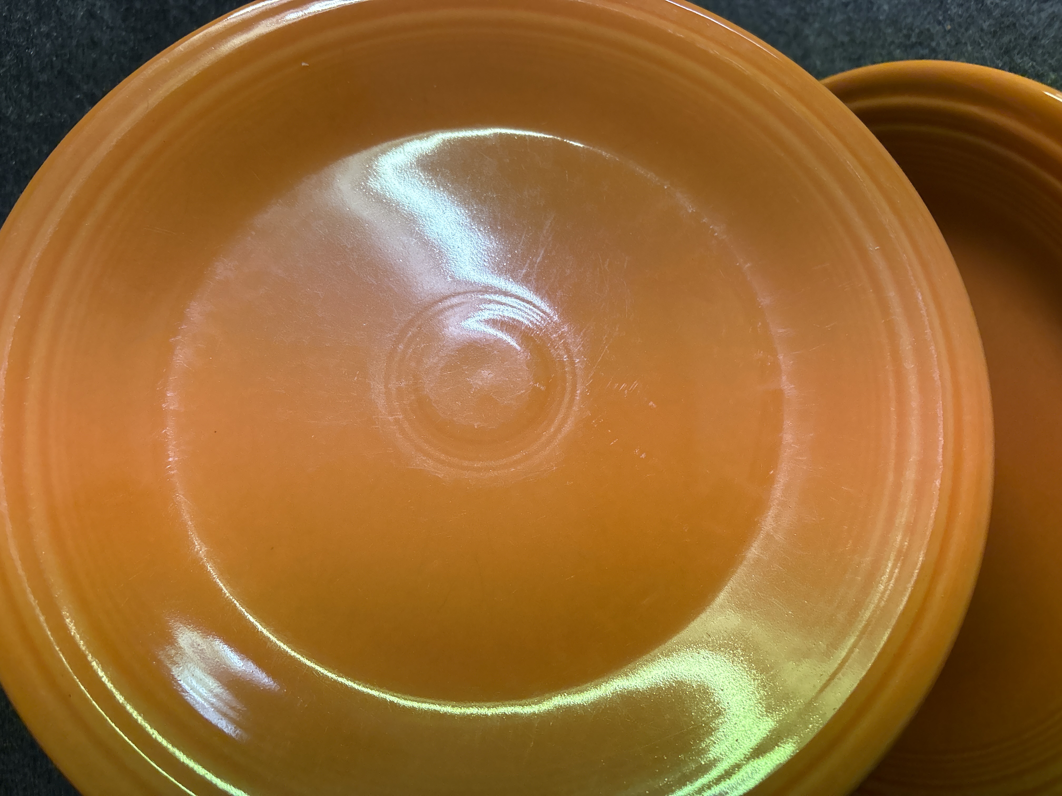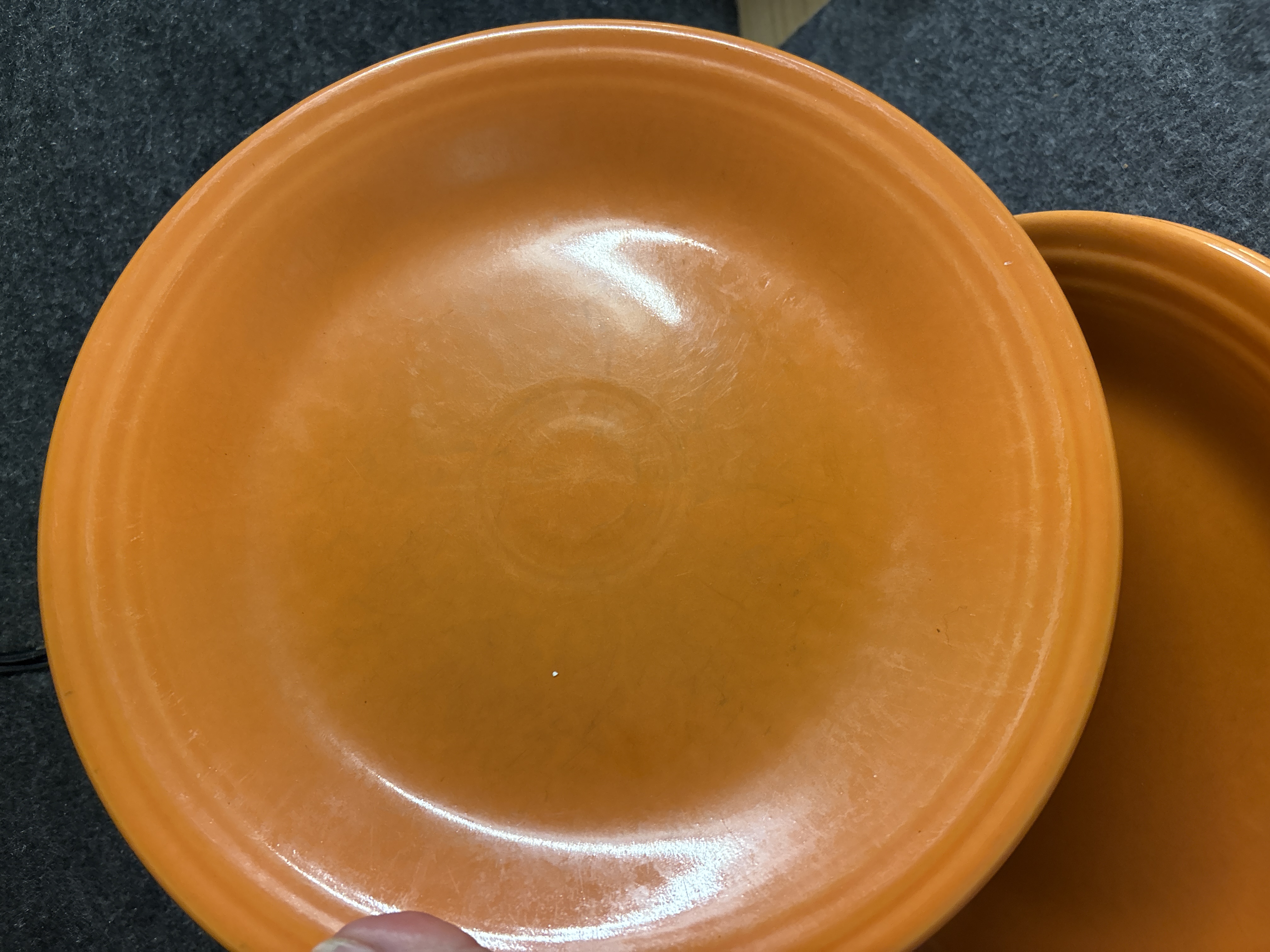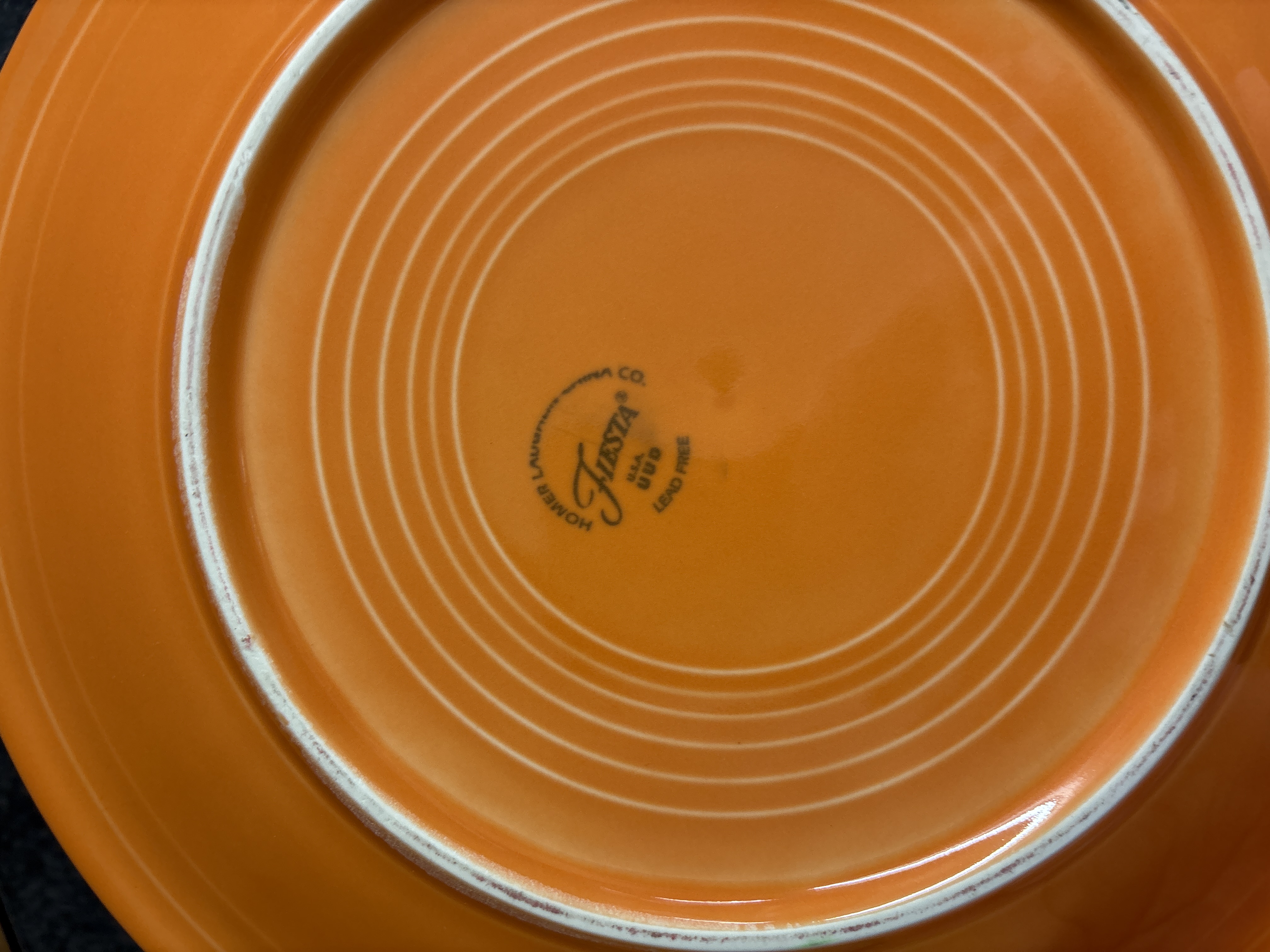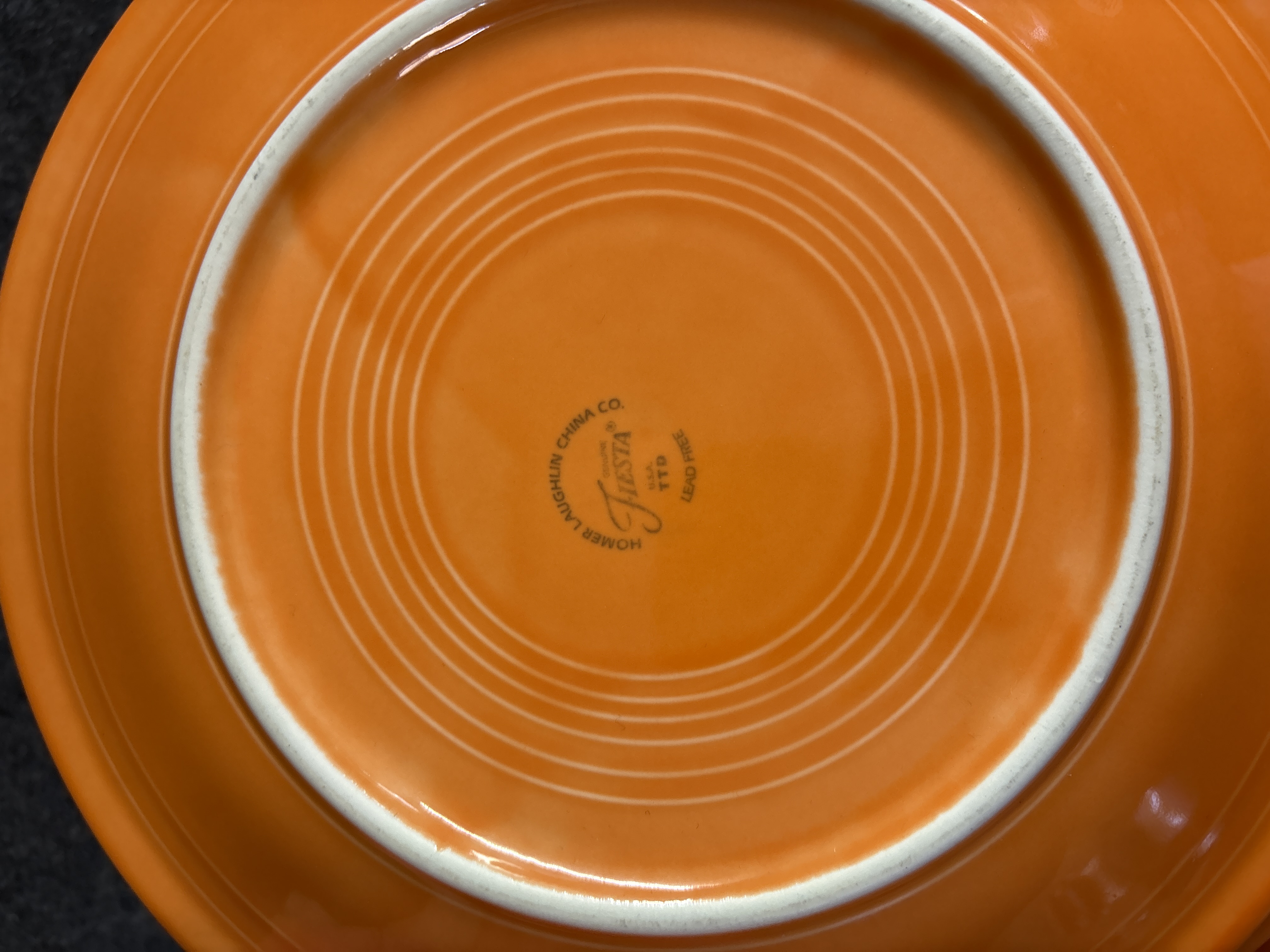 A collection of orange ceramic dinner plates featuring the signature concentric ring pattern and Homer Laughlin backstamps on the undersides.