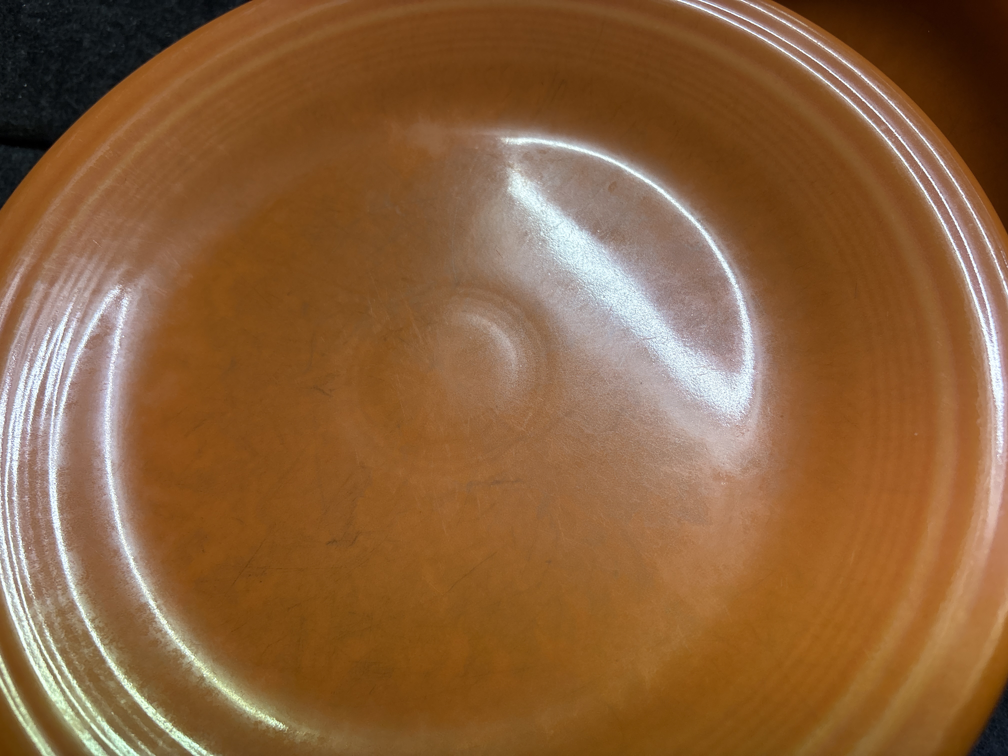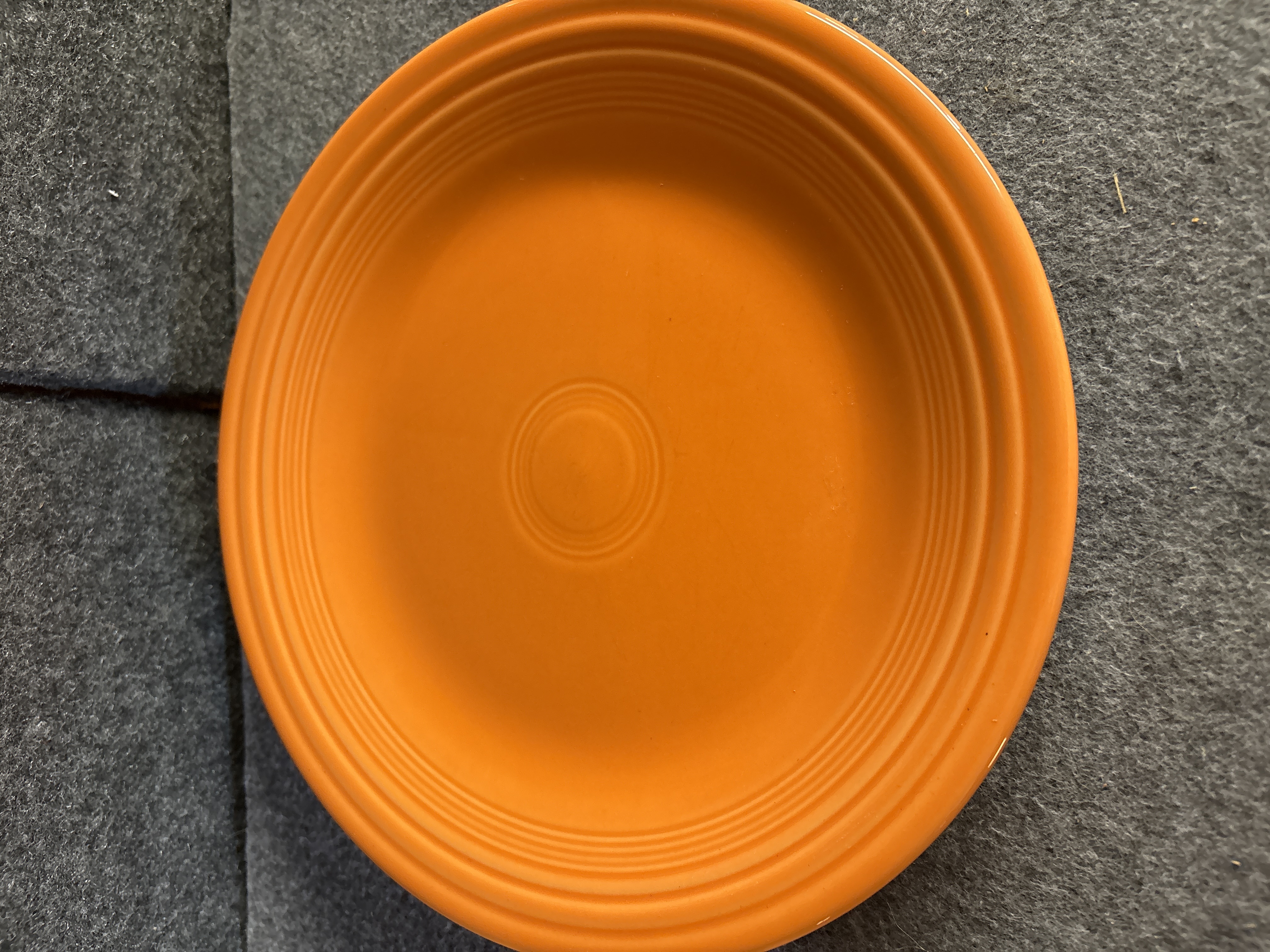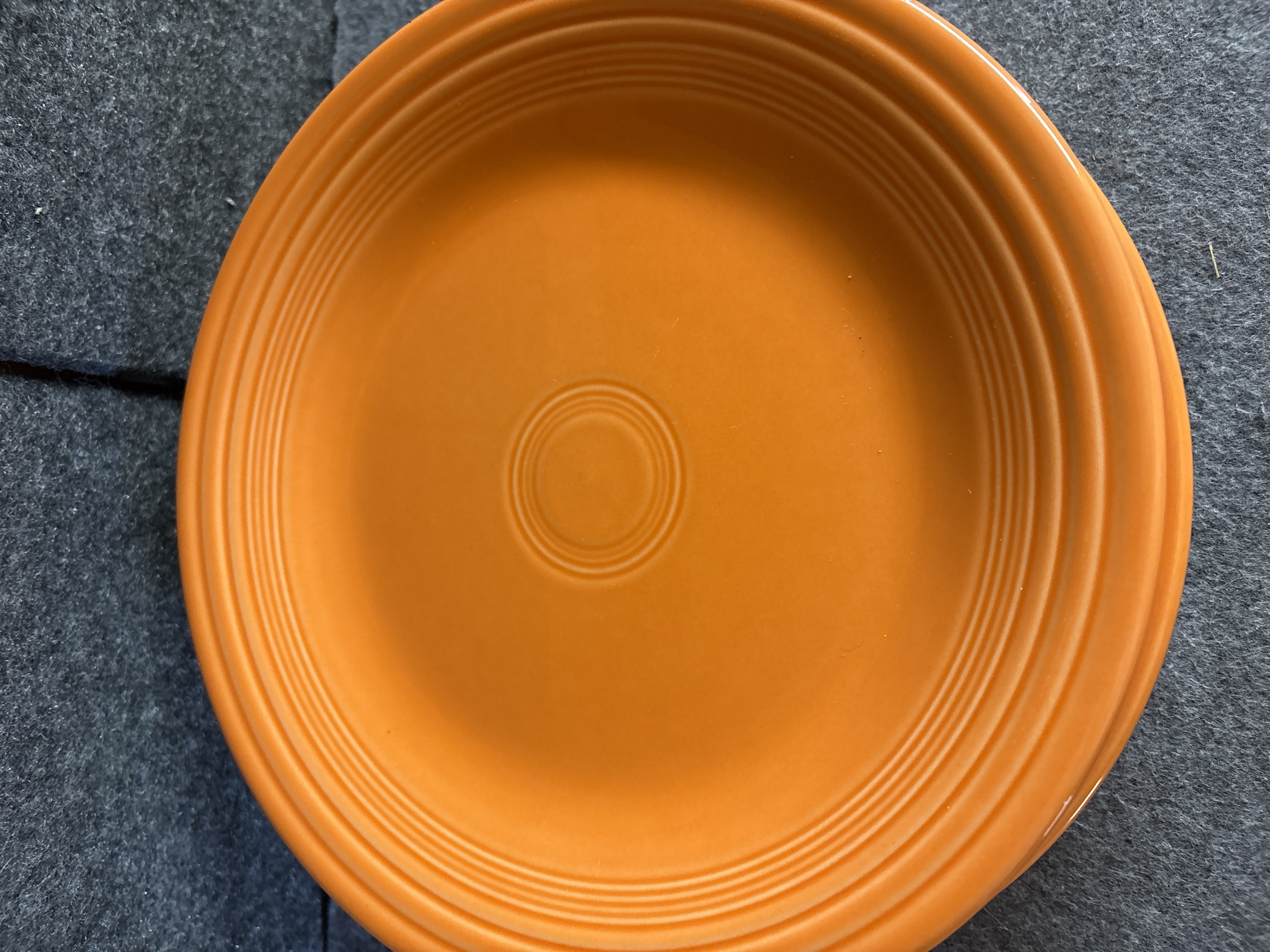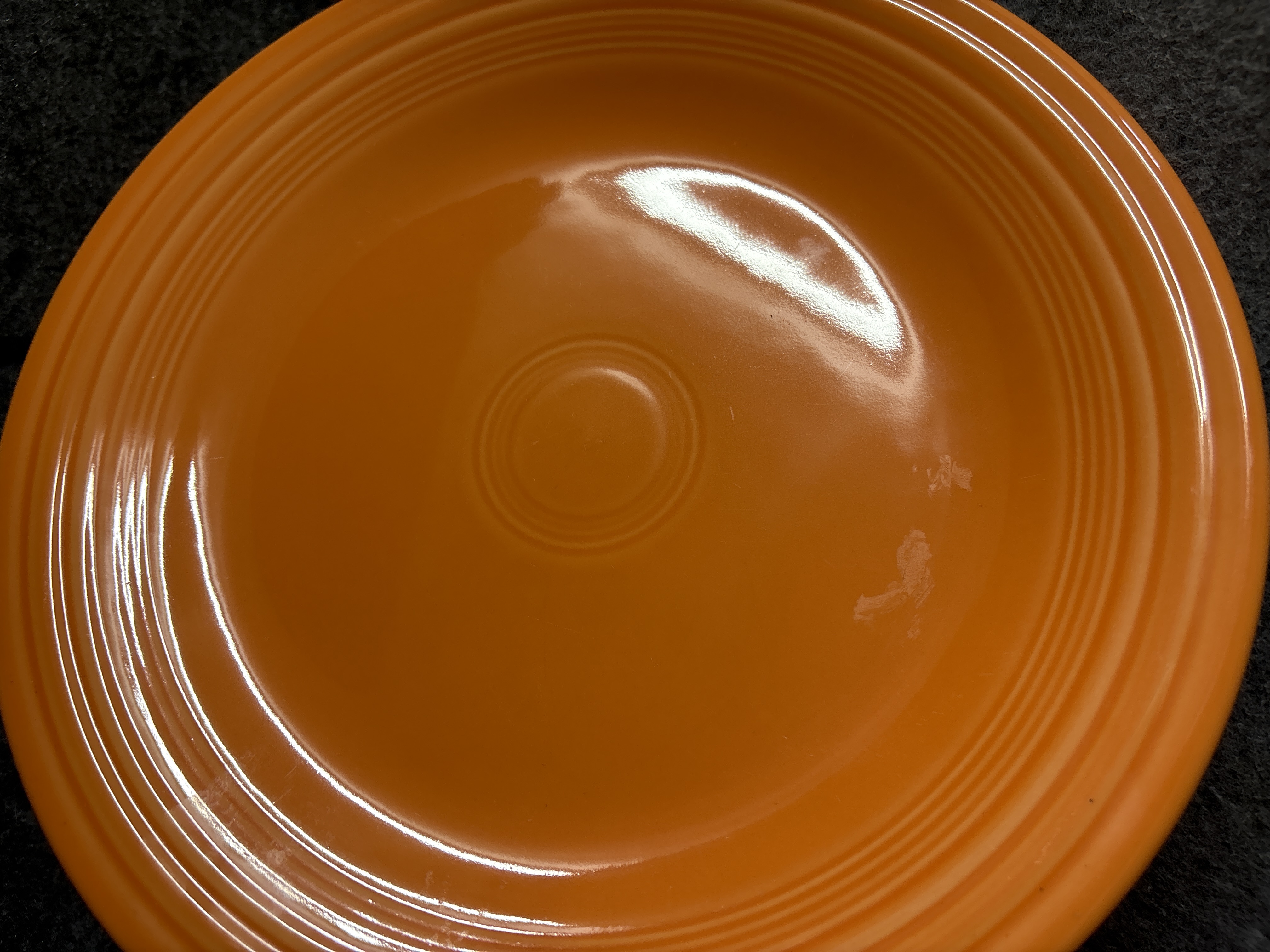 A collection of orange ceramic dinner plates featuring the signature concentric ring pattern and Homer Laughlin backstamps on the undersides.