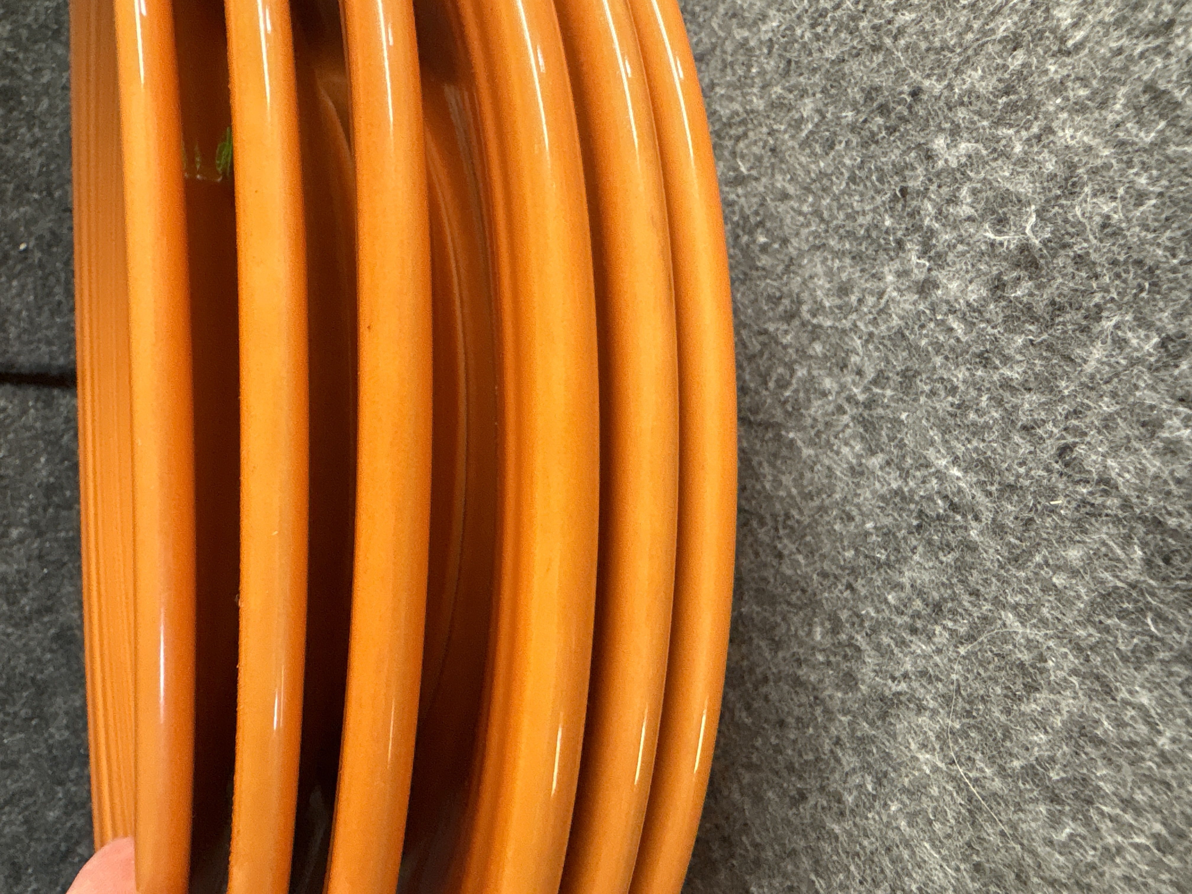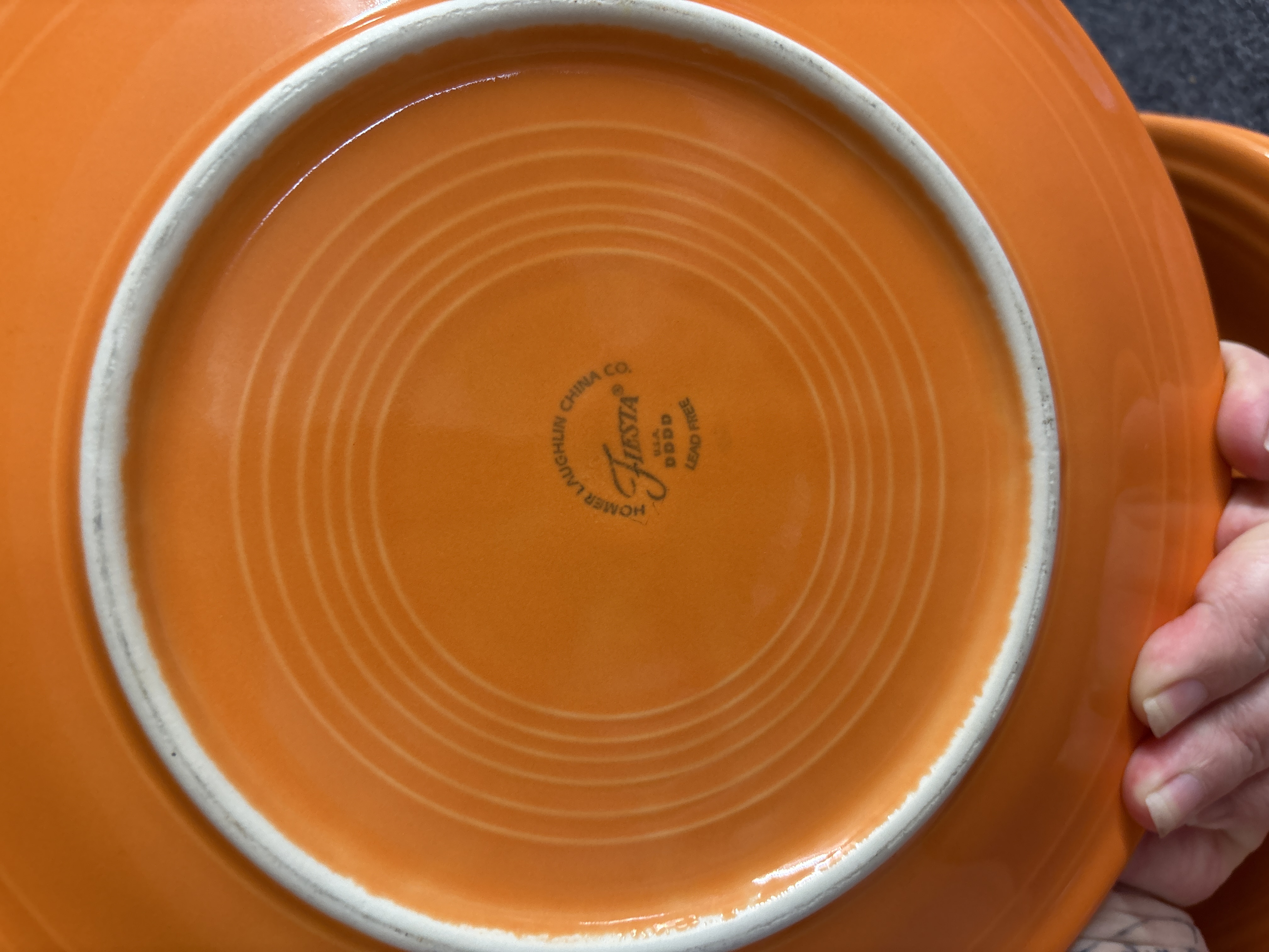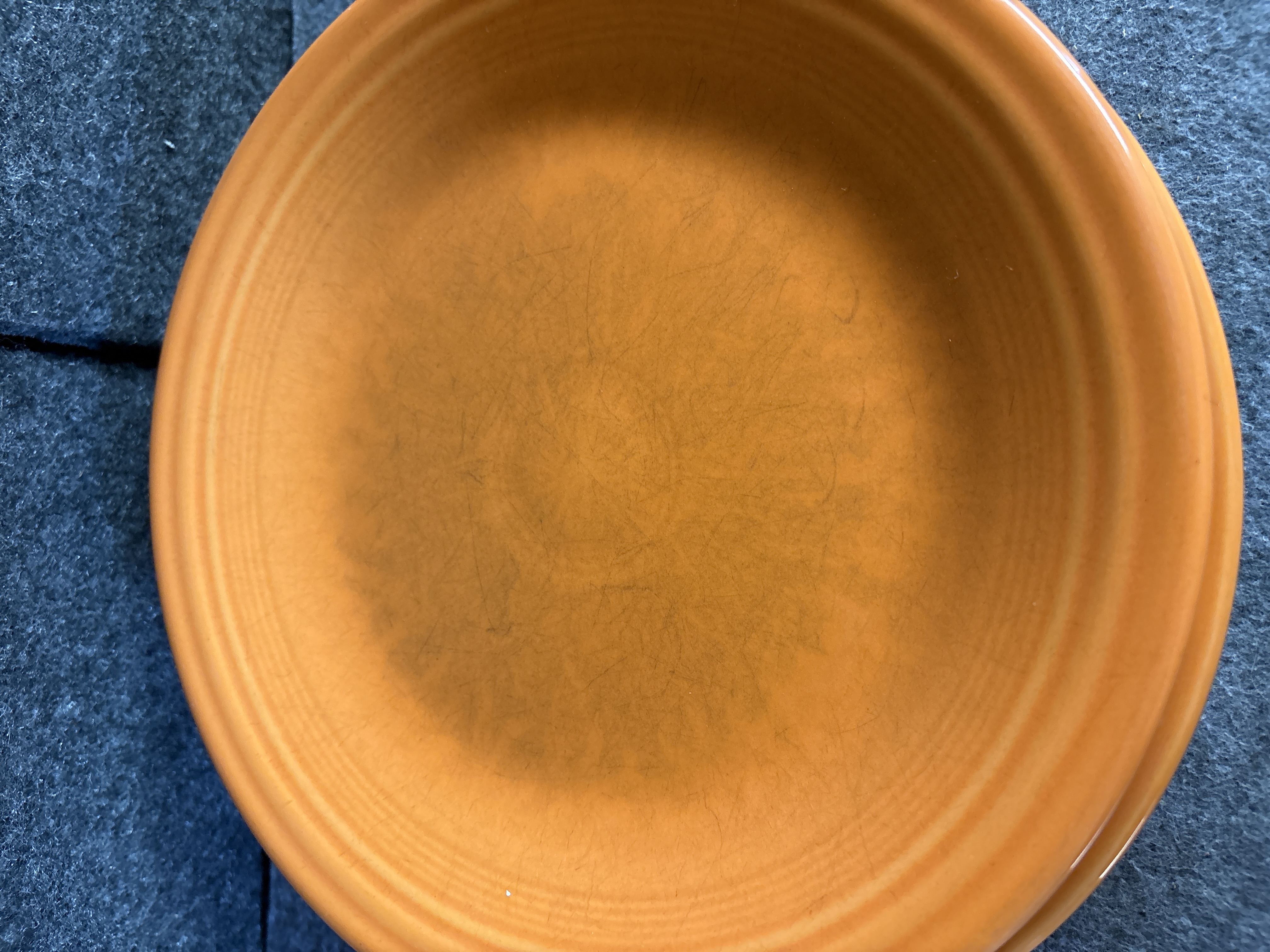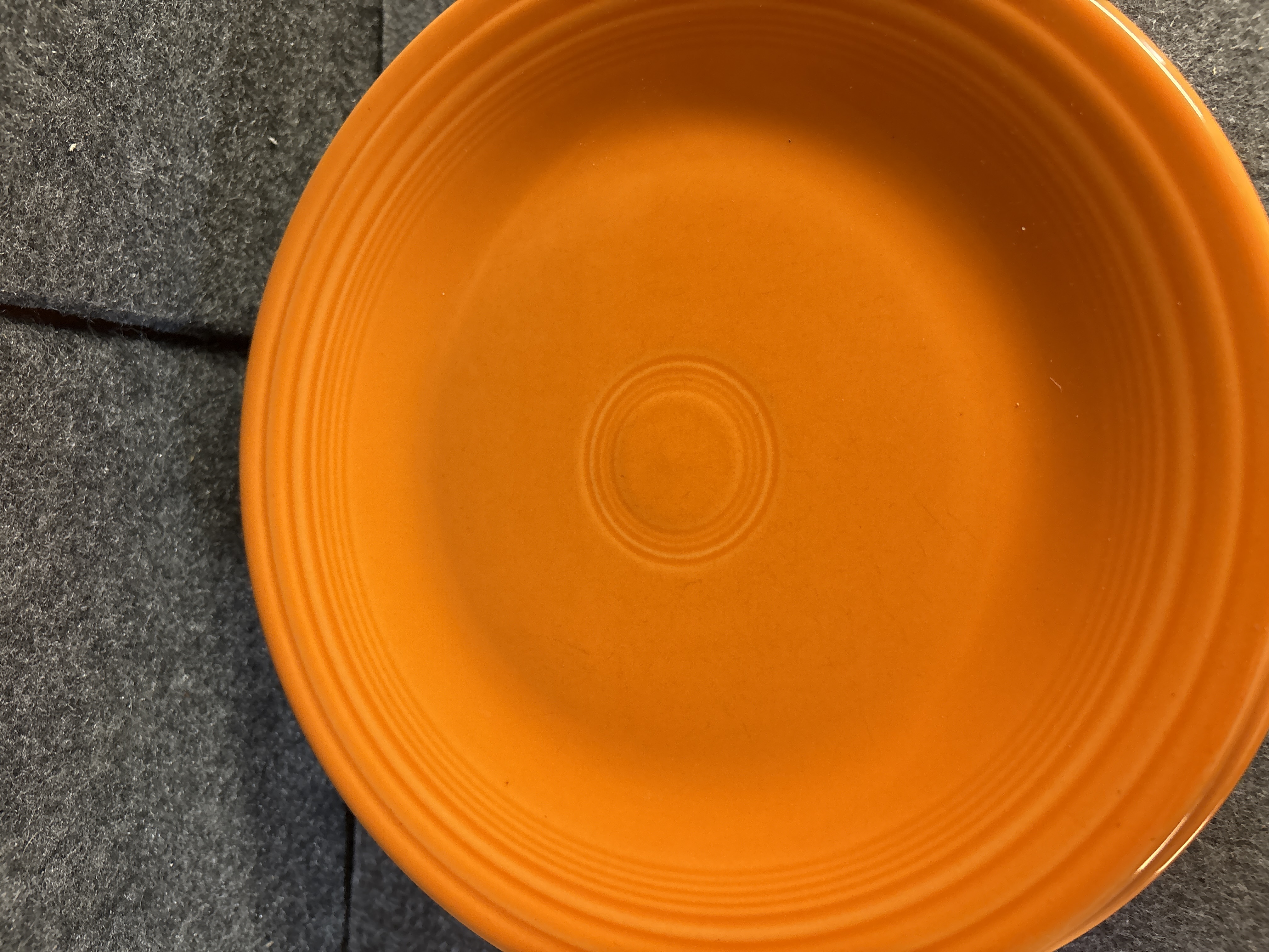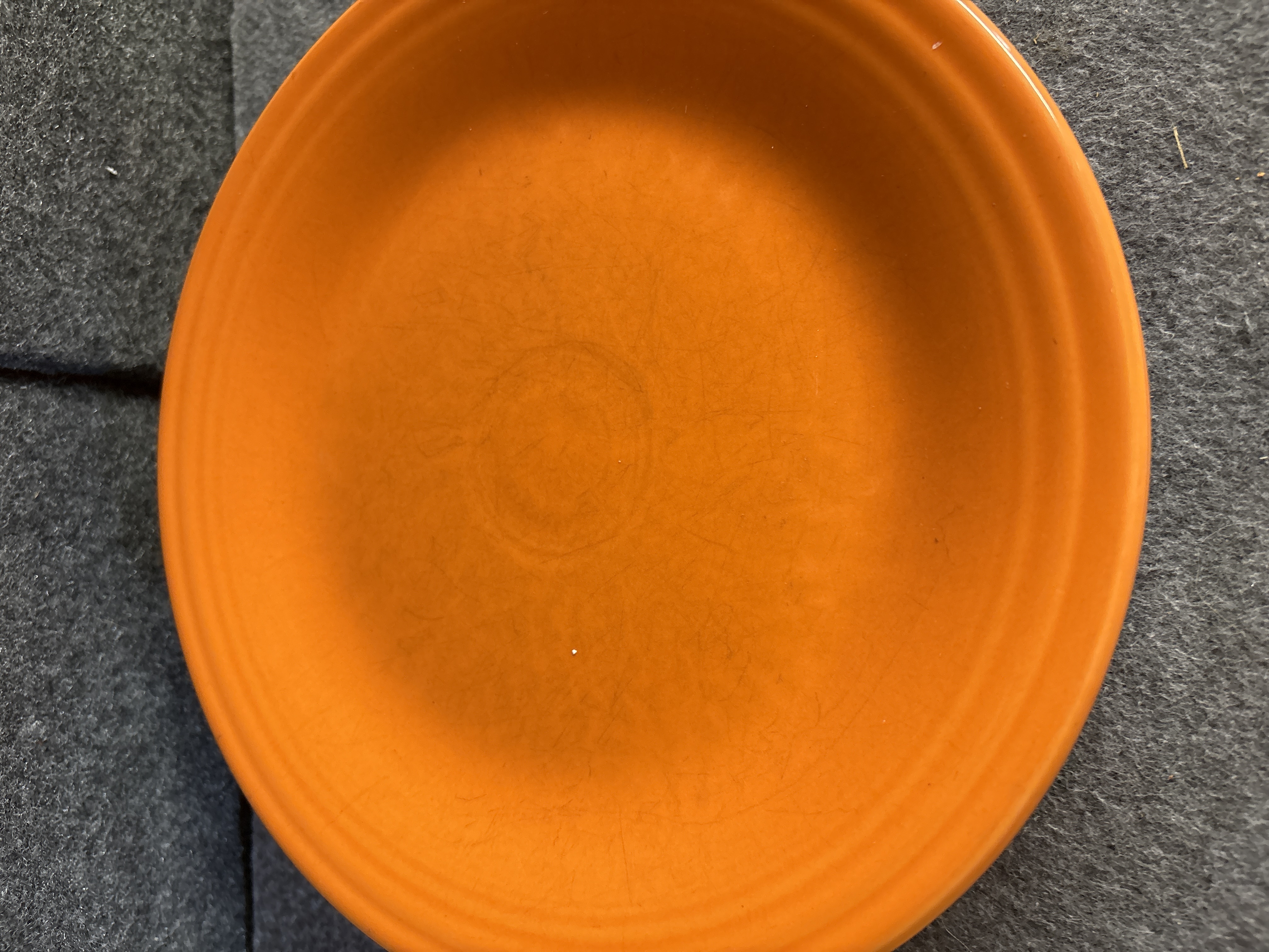 A collection of orange ceramic dinner plates featuring the signature concentric ring pattern and Homer Laughlin backstamps on the undersides.