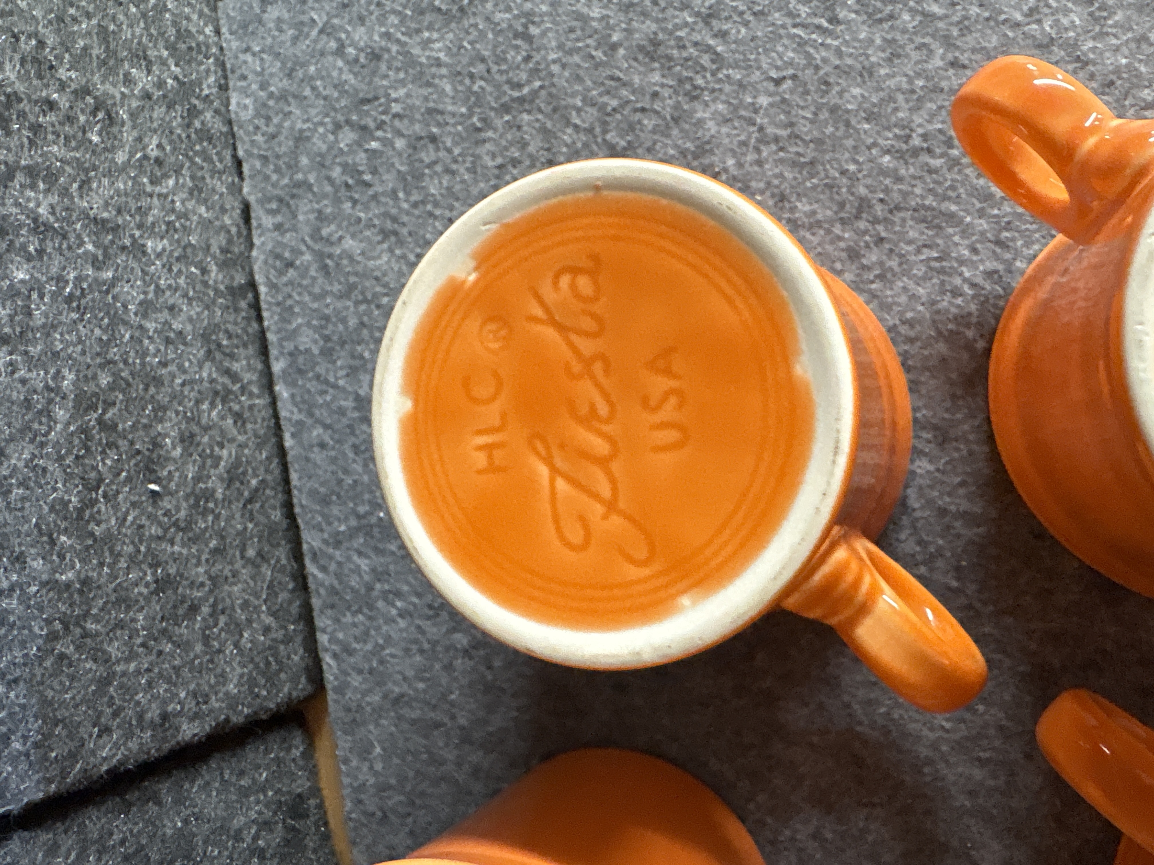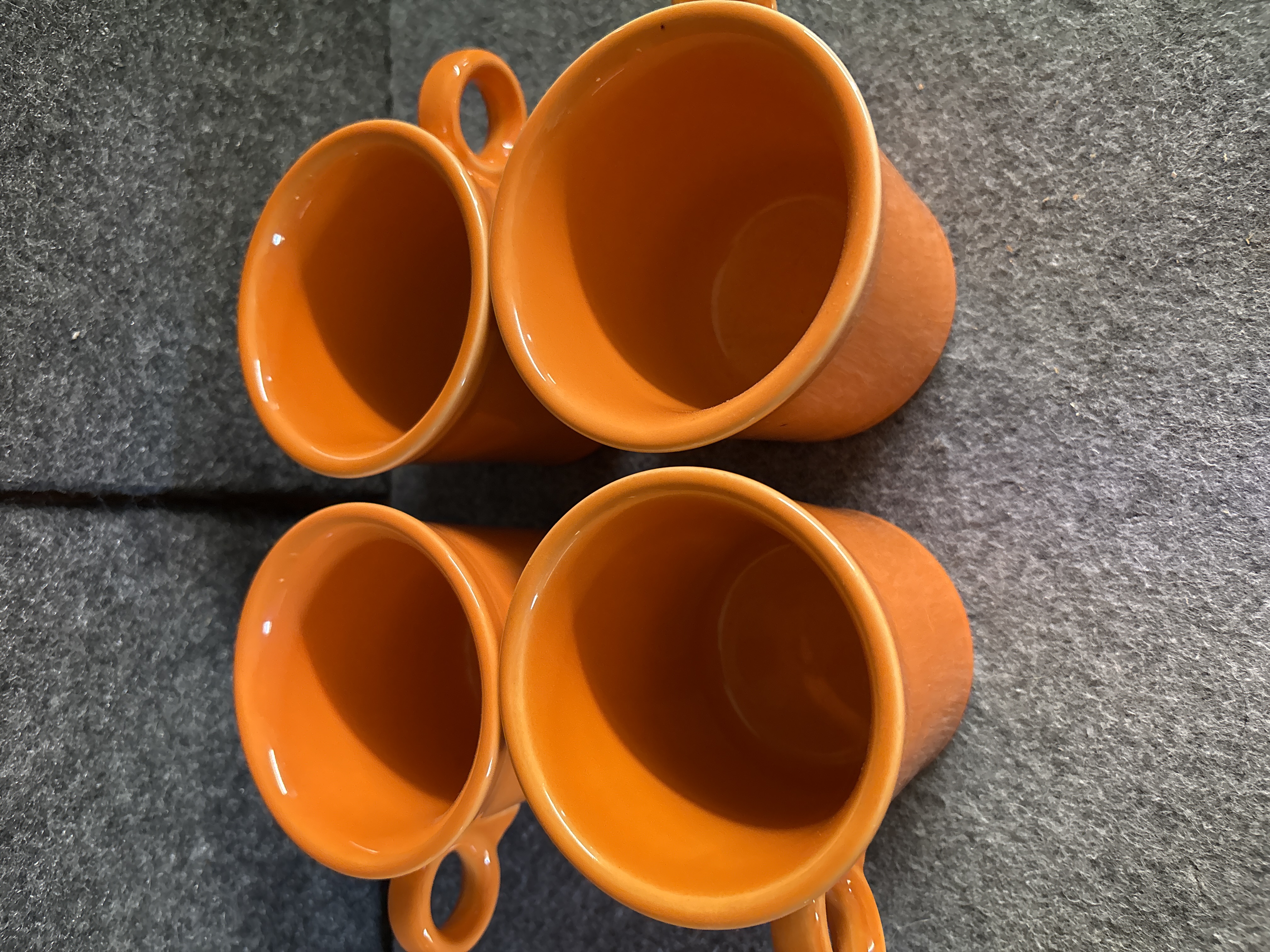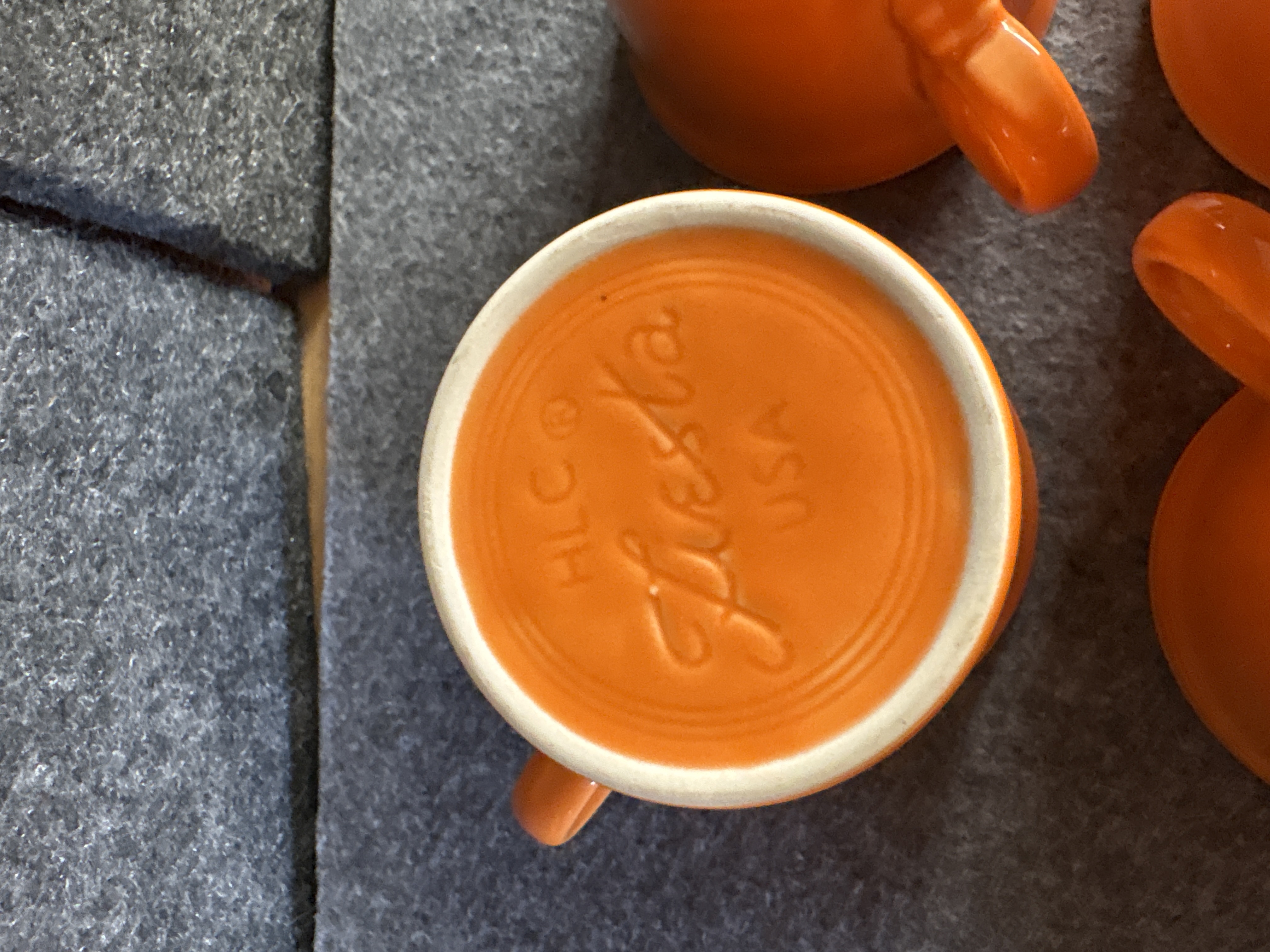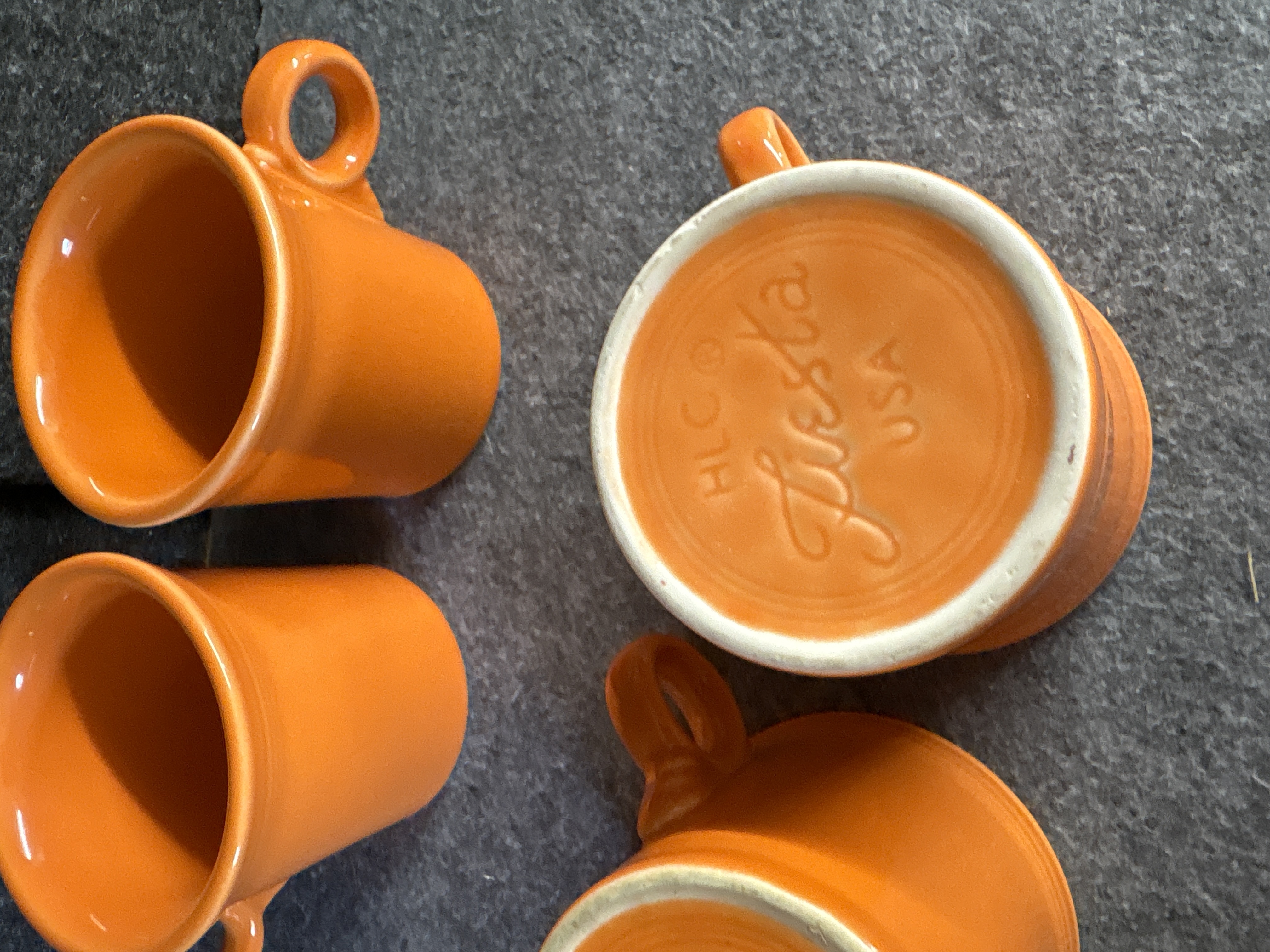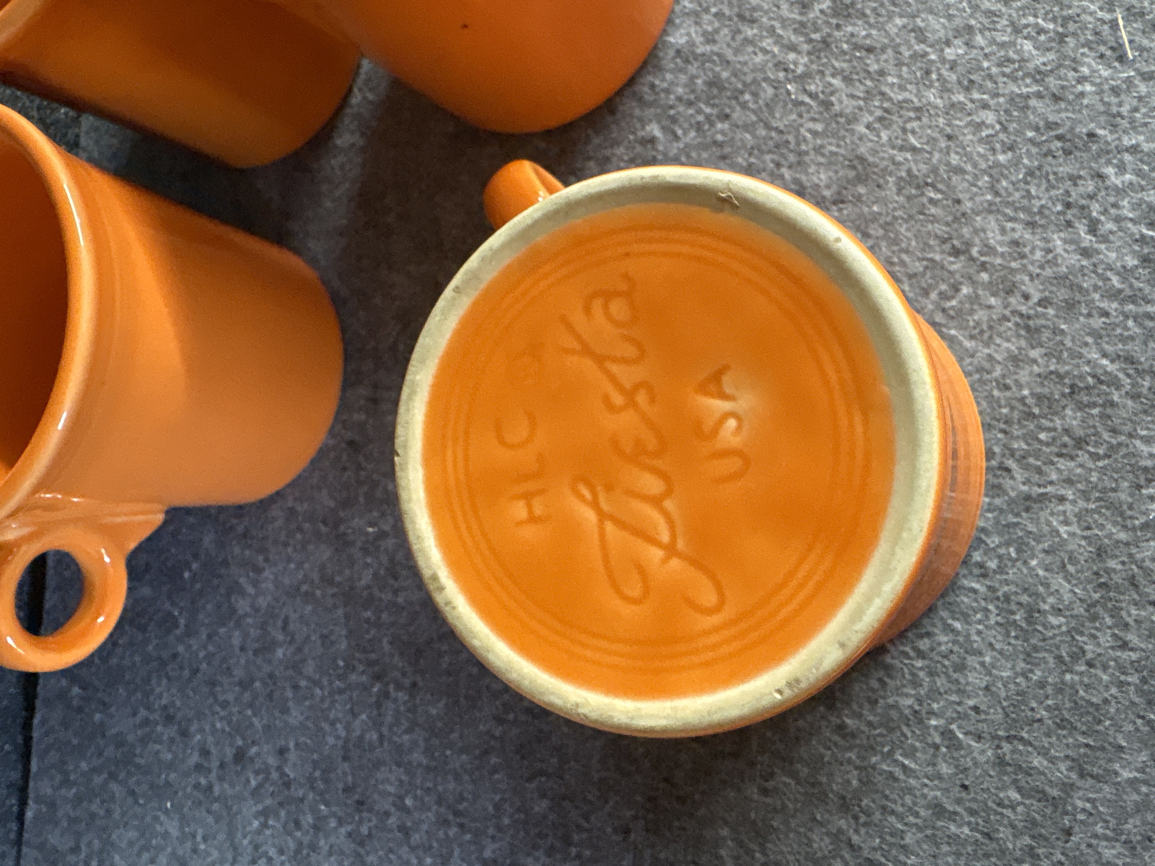 Several tangerine orange ceramic mugs featuring classic ring handles and embossed HLC Fiesta USA maker’s marks on the undersides.