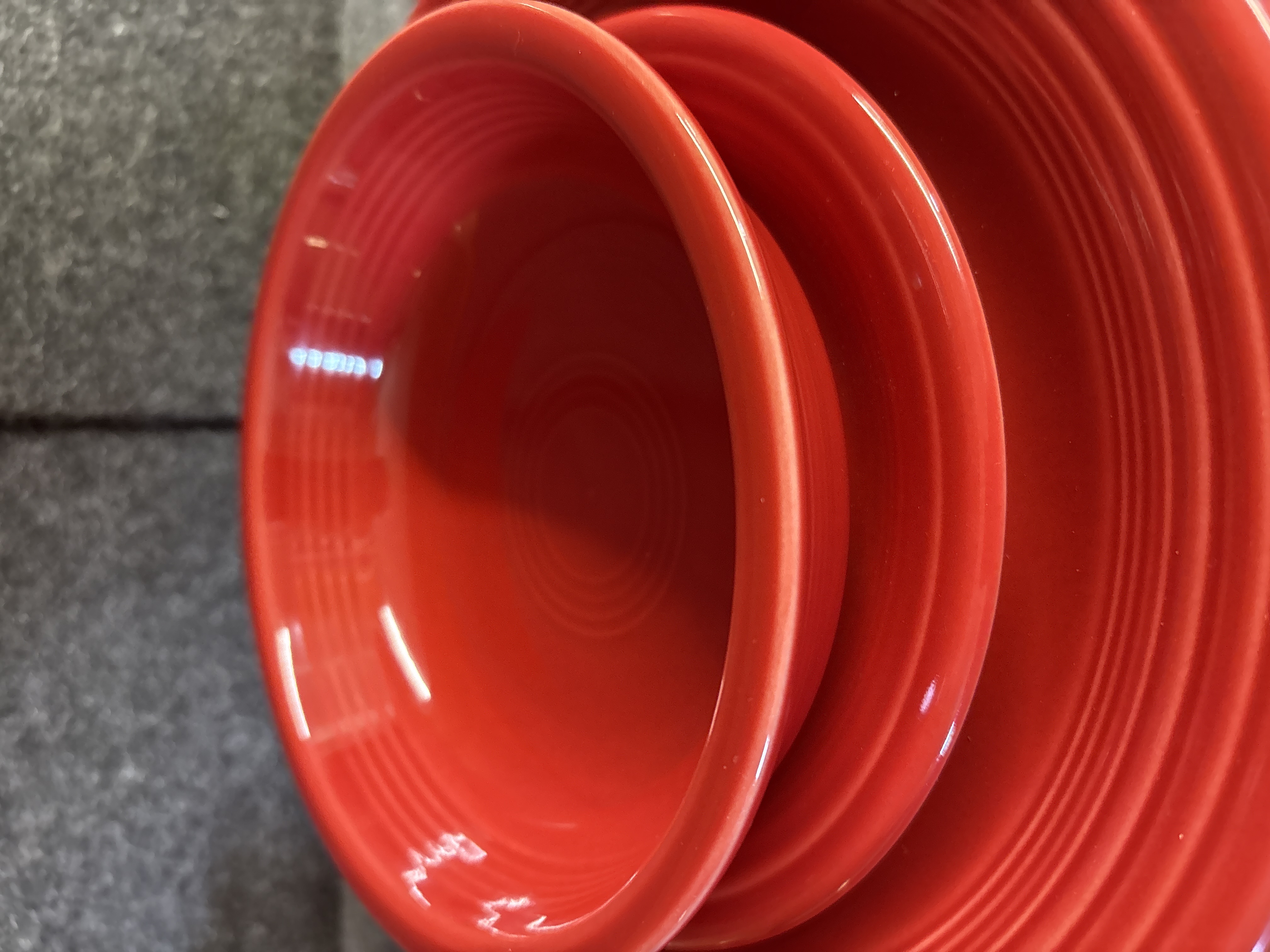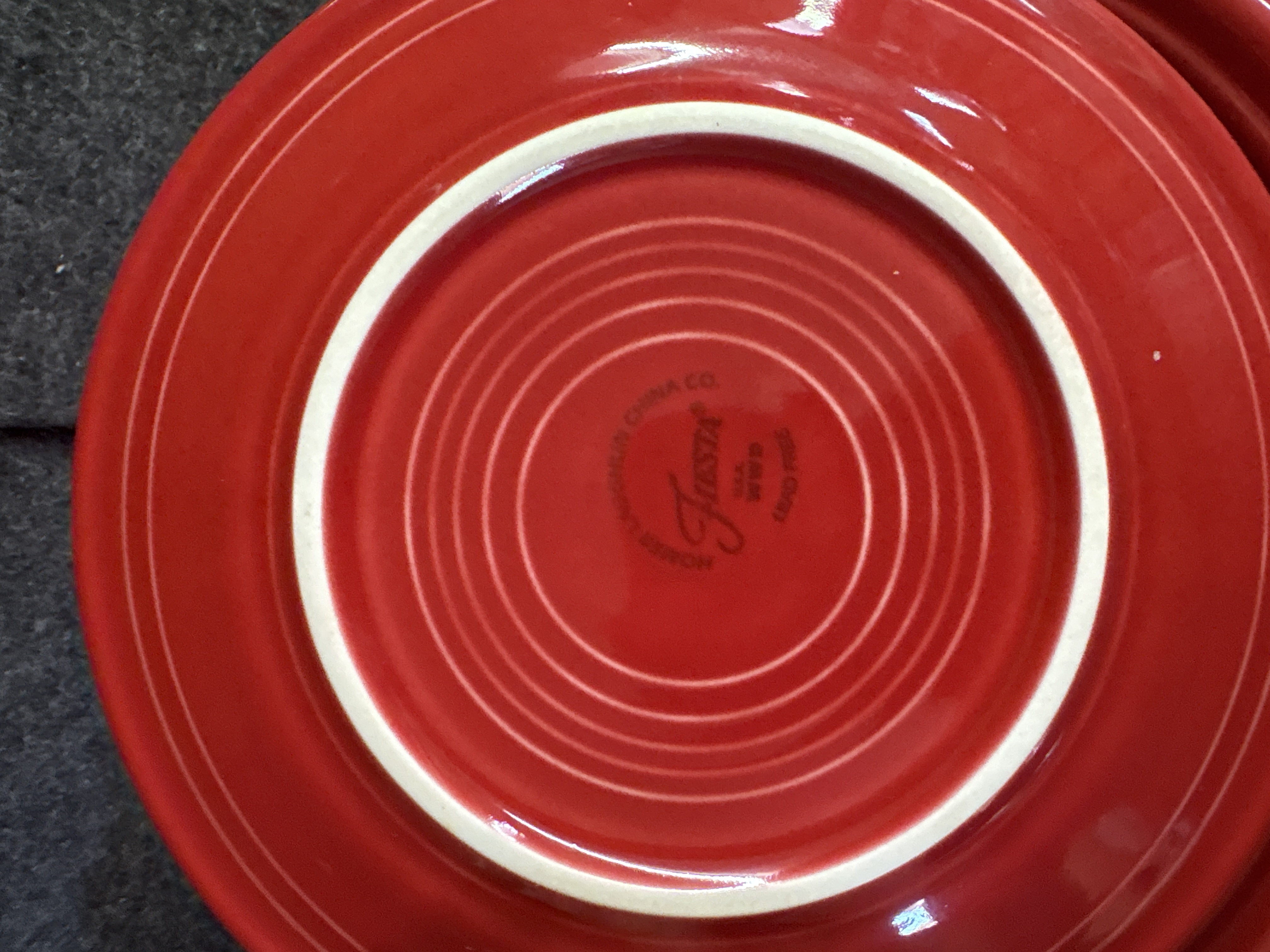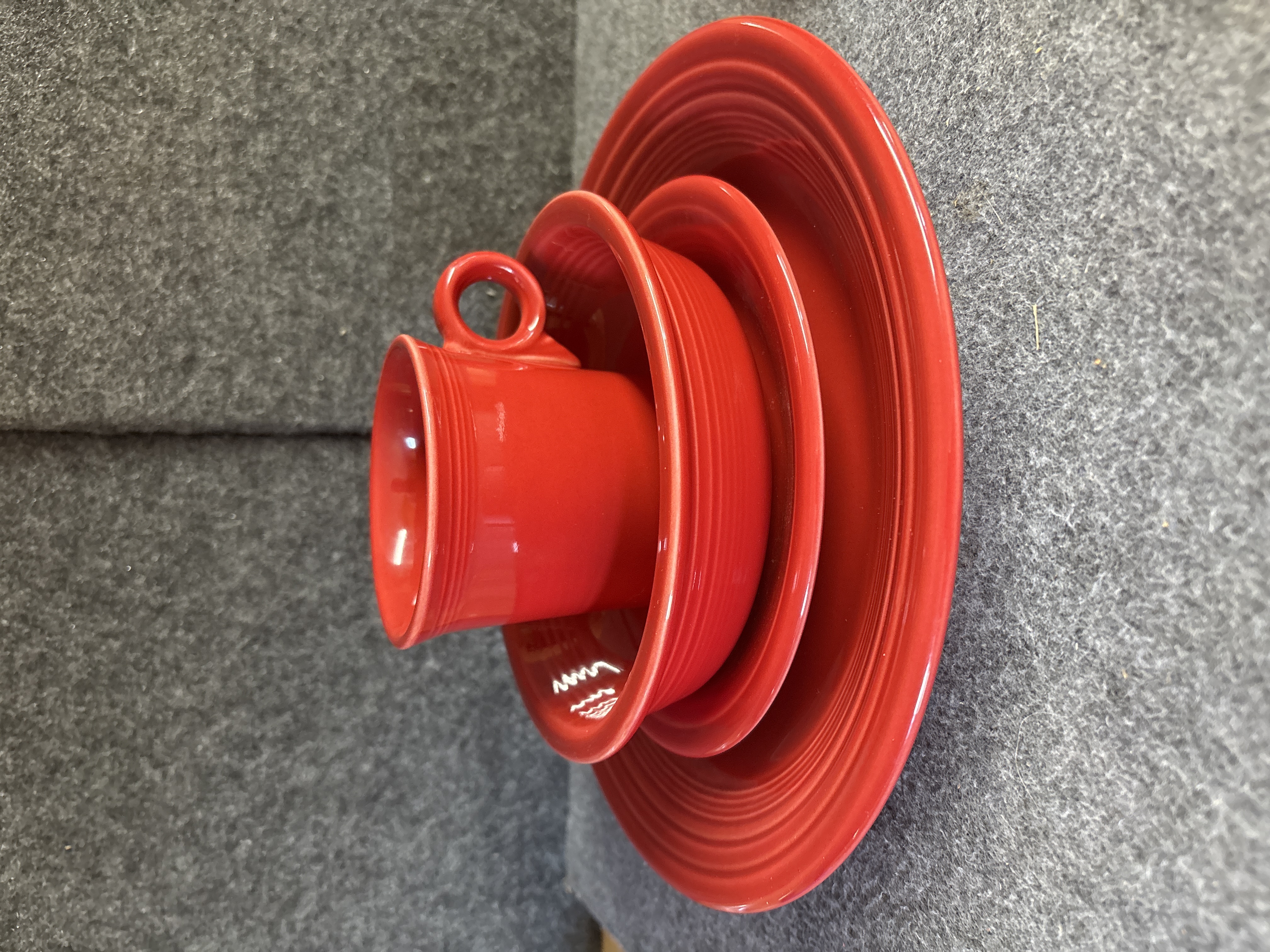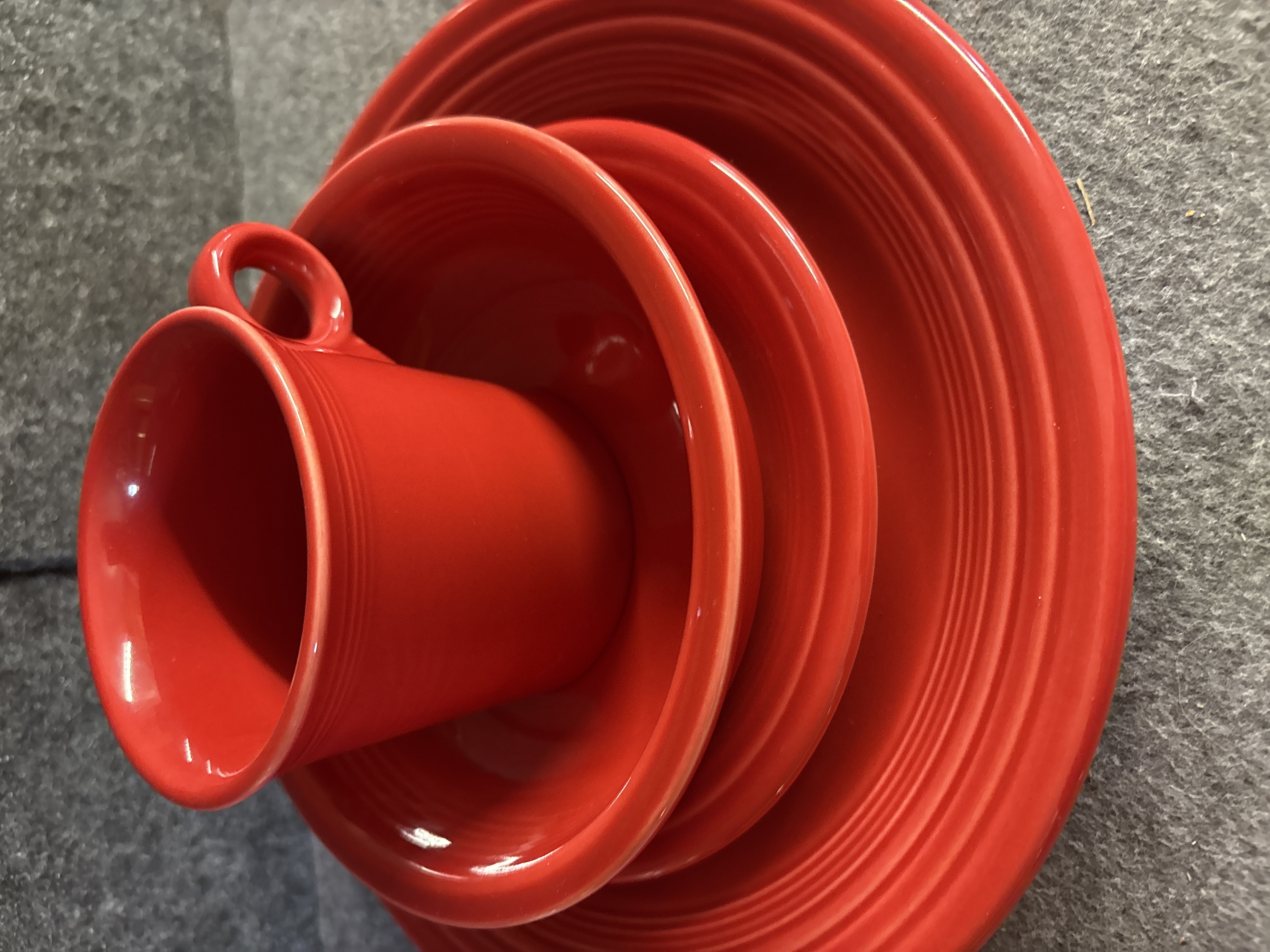A group of Homer Laughlin ceramic dishware in the Fiesta pattern featuring a Scarlet red glaze. The assortment consists of several pieces including a cup with a circular ring handle, a bowl, and plates of various diameters. Each item is decorated with the signature concentric ring pattern characteristic of the line. The pieces are constructed of glazed ceramic. The undersides bear various maker marks including HOMER LAUGHLIN CHINA CO. GENUINE FIESTA USA LEAD FREE and HLC Fiesta USA.