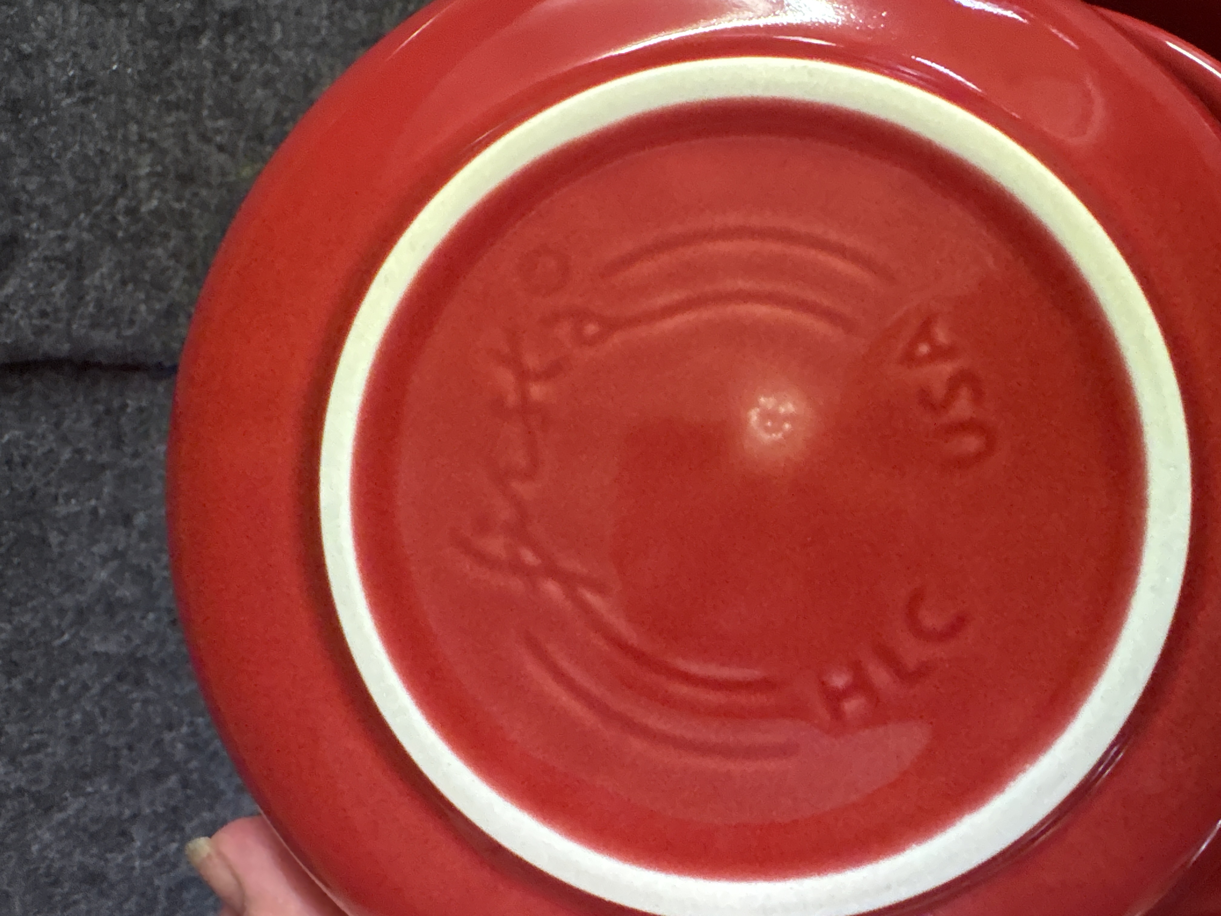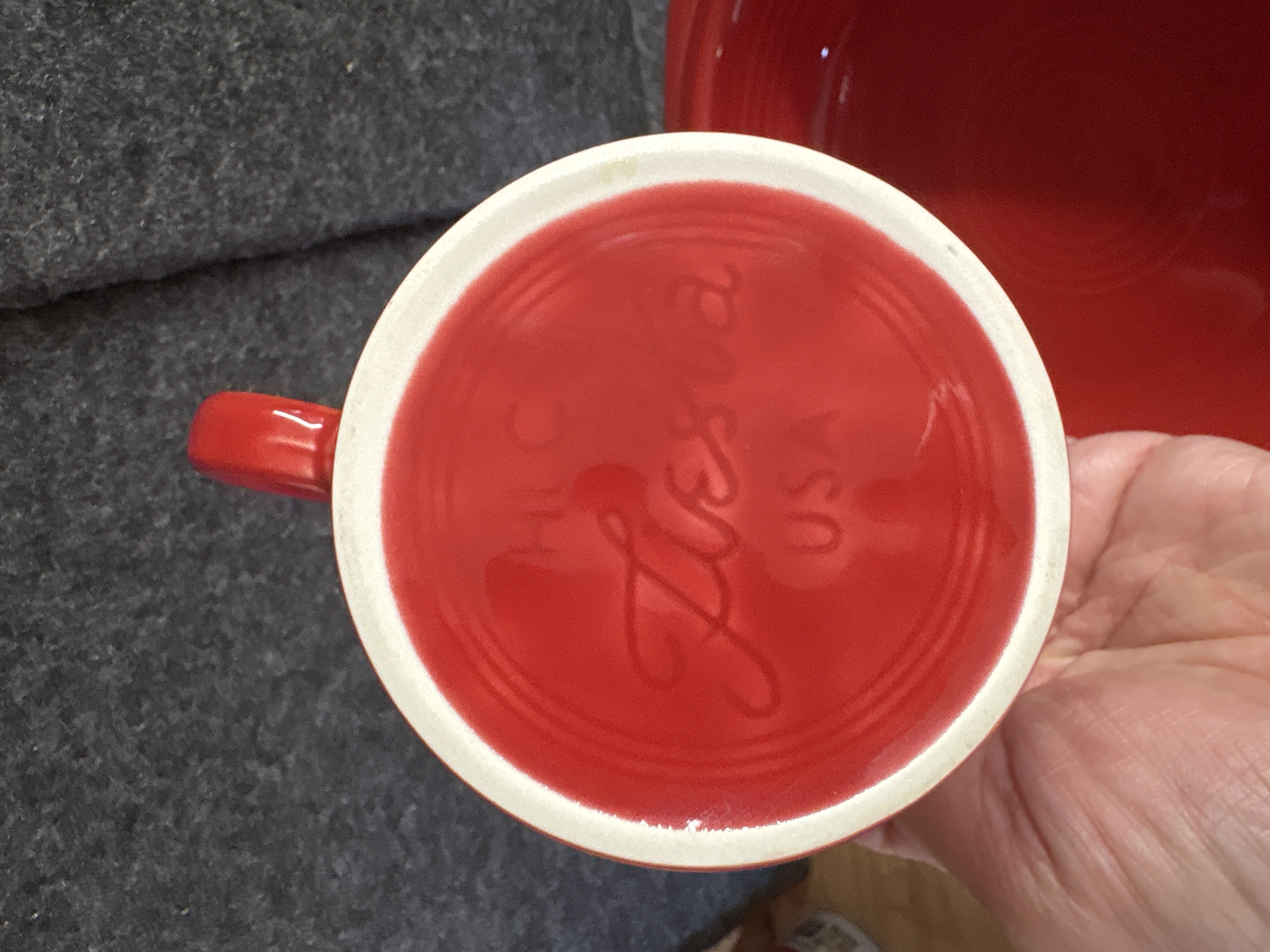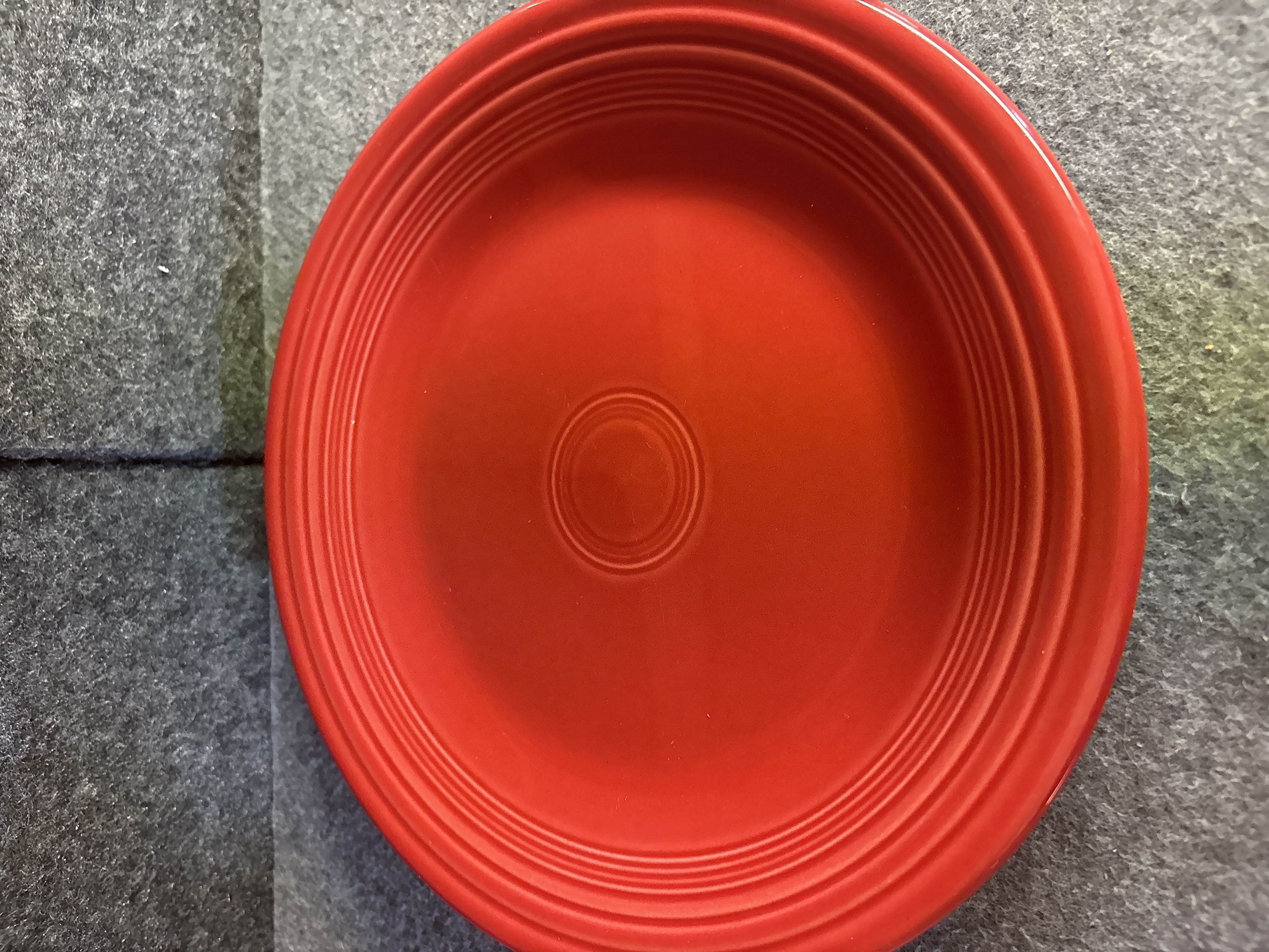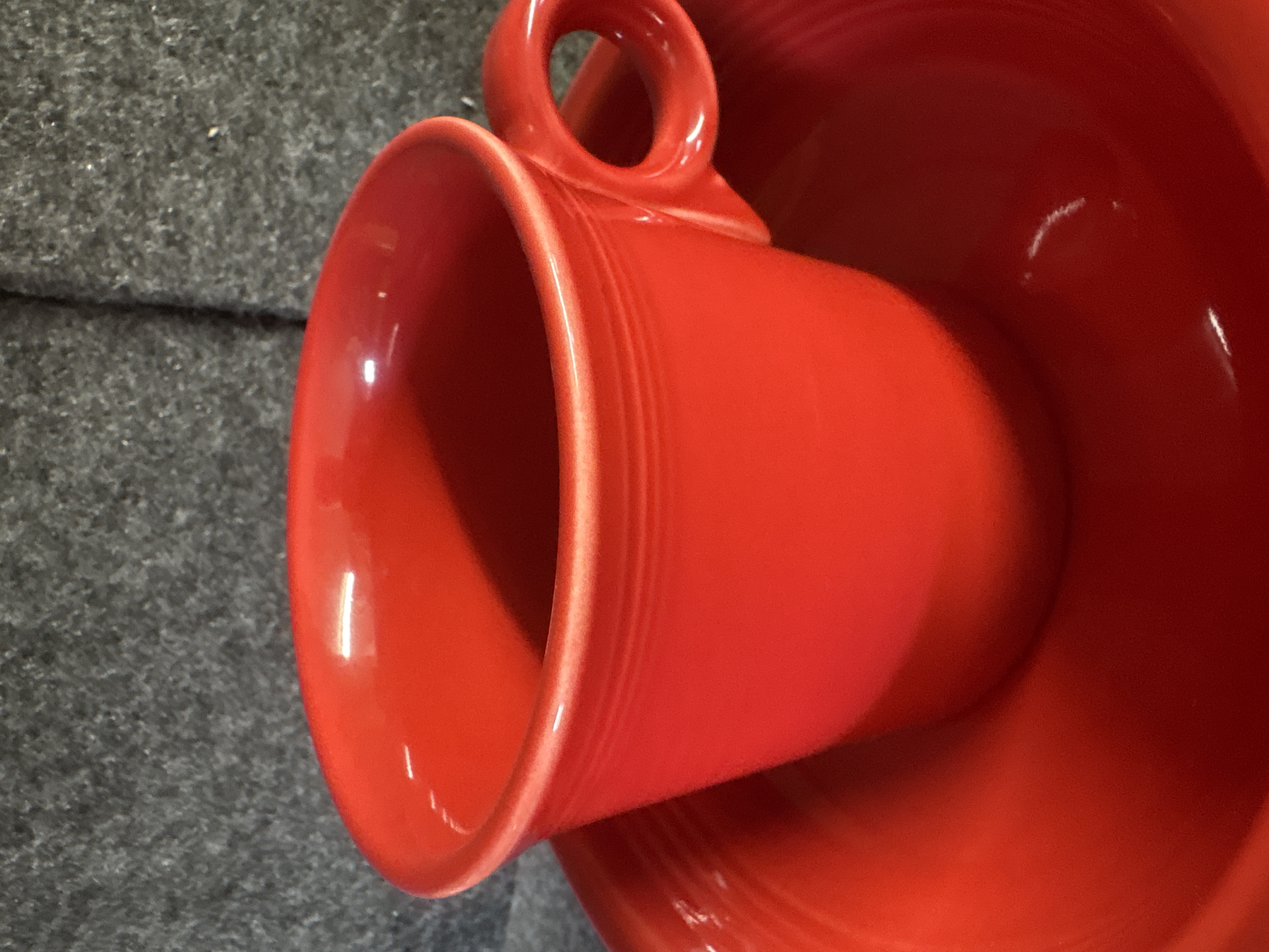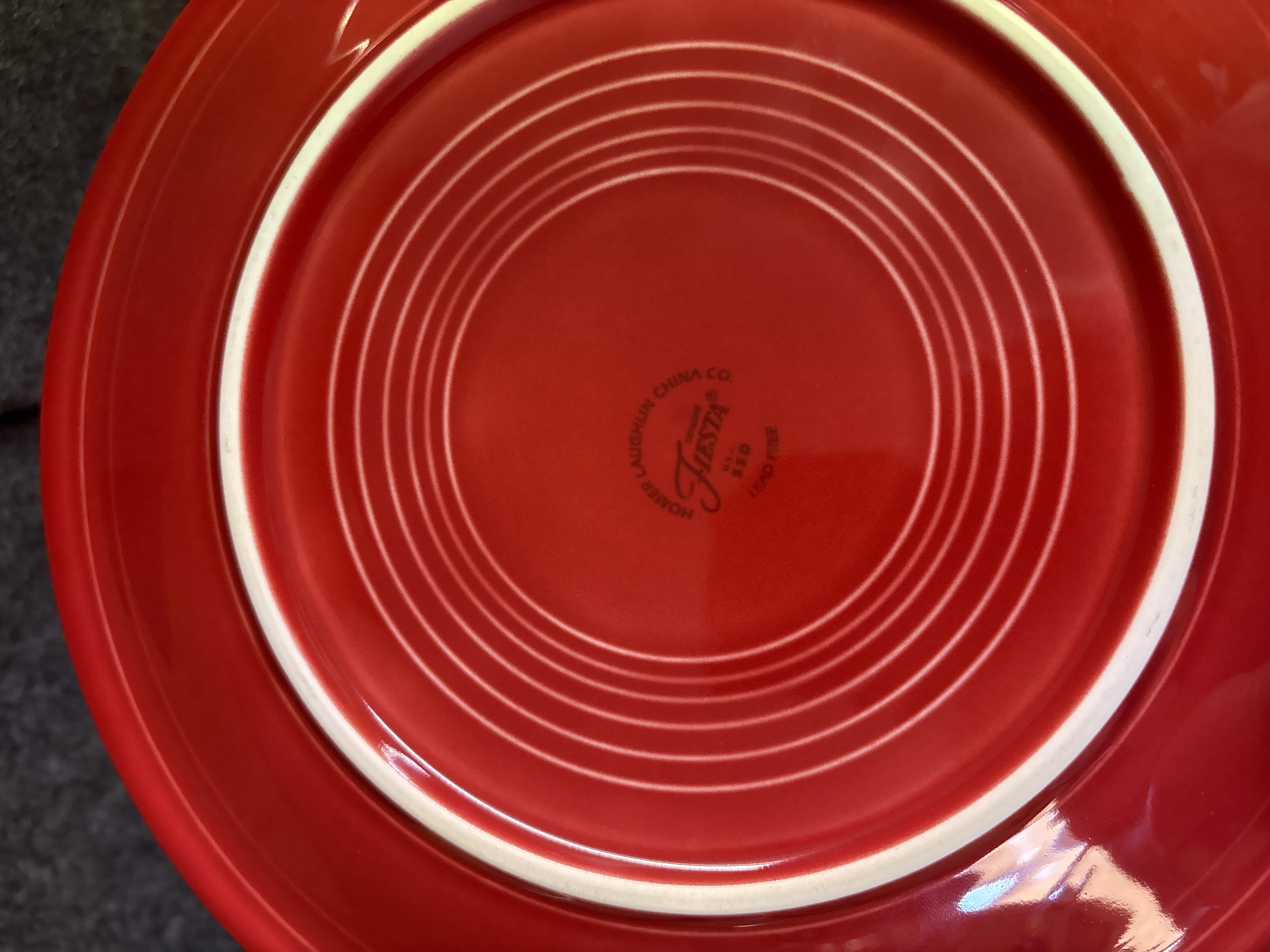 A group of Homer Laughlin ceramic dishware in the Fiesta pattern featuring a Scarlet red glaze. The assortment consists of several pieces including a cup with a circular ring handle, a bowl, and plates of various diameters. Each item is decorated with the signature concentric ring pattern characteristic of the line. The pieces are constructed of glazed ceramic. The undersides bear various maker marks including HOMER LAUGHLIN CHINA CO. GENUINE FIESTA USA LEAD FREE and HLC Fiesta USA.