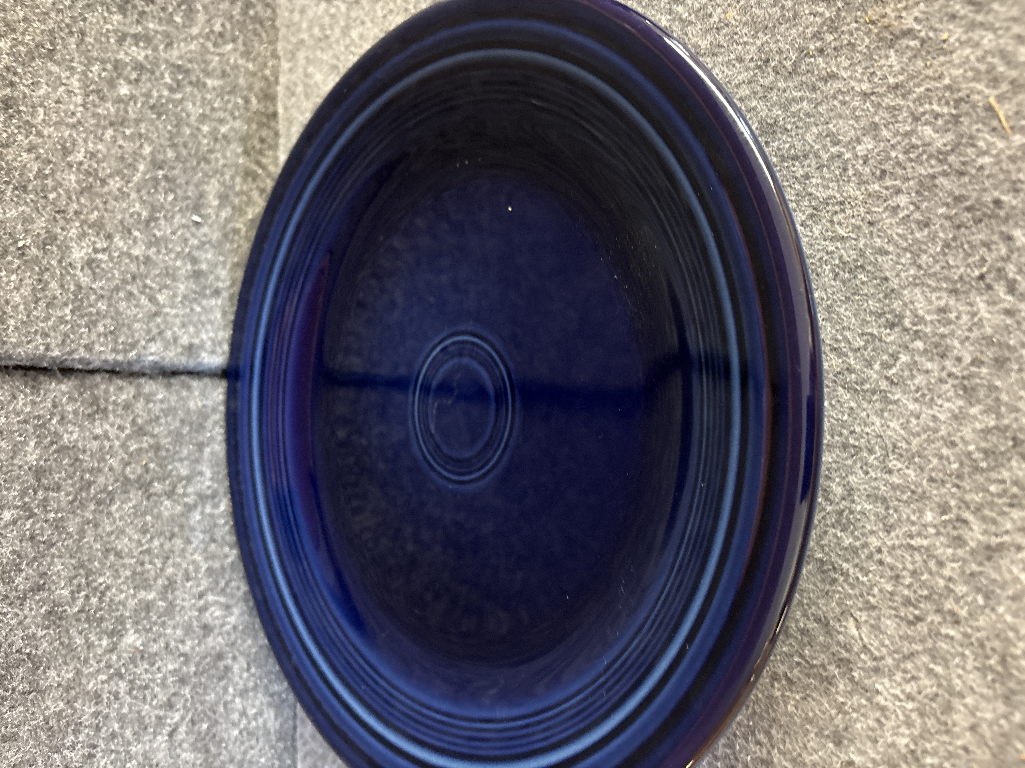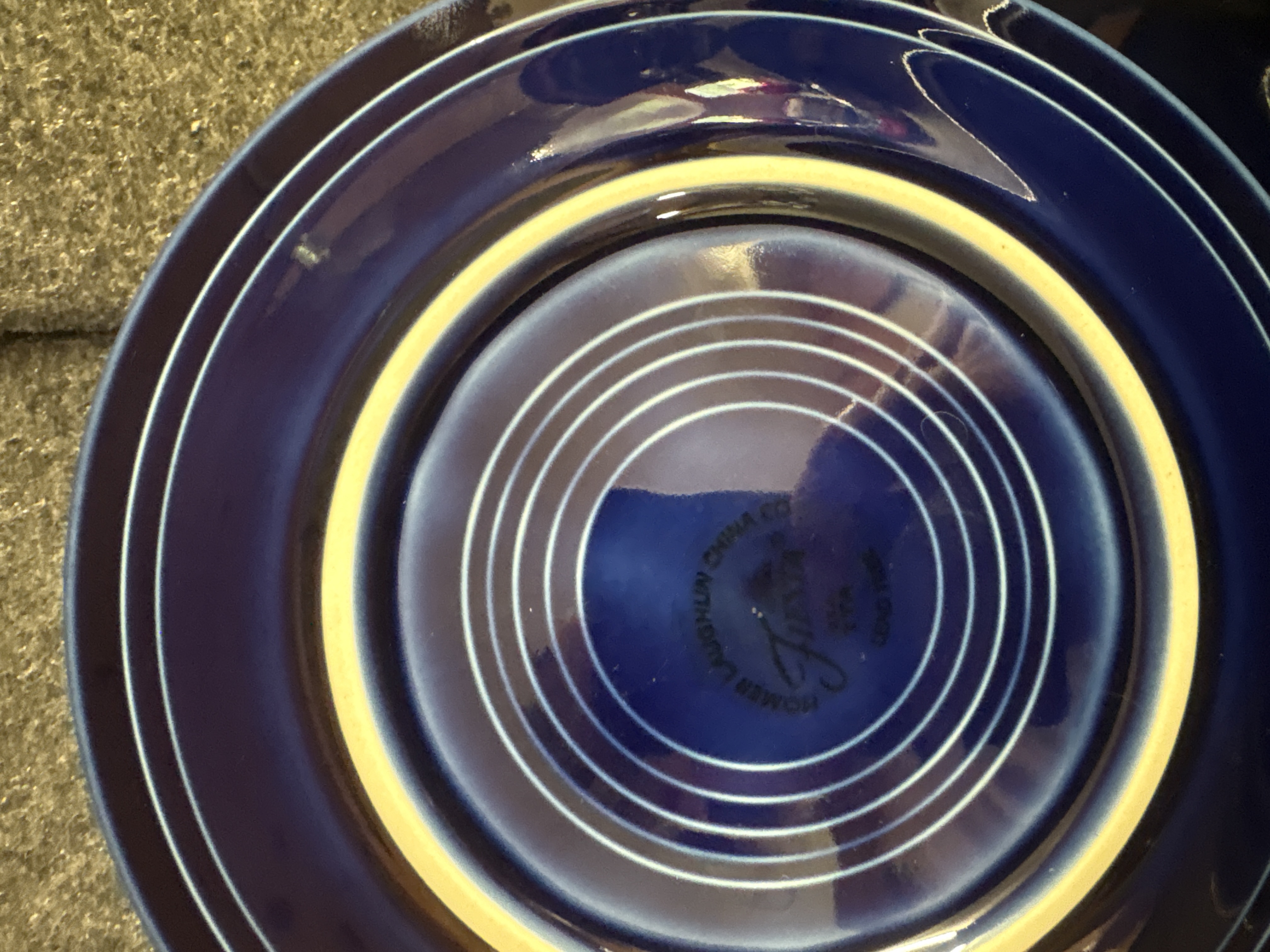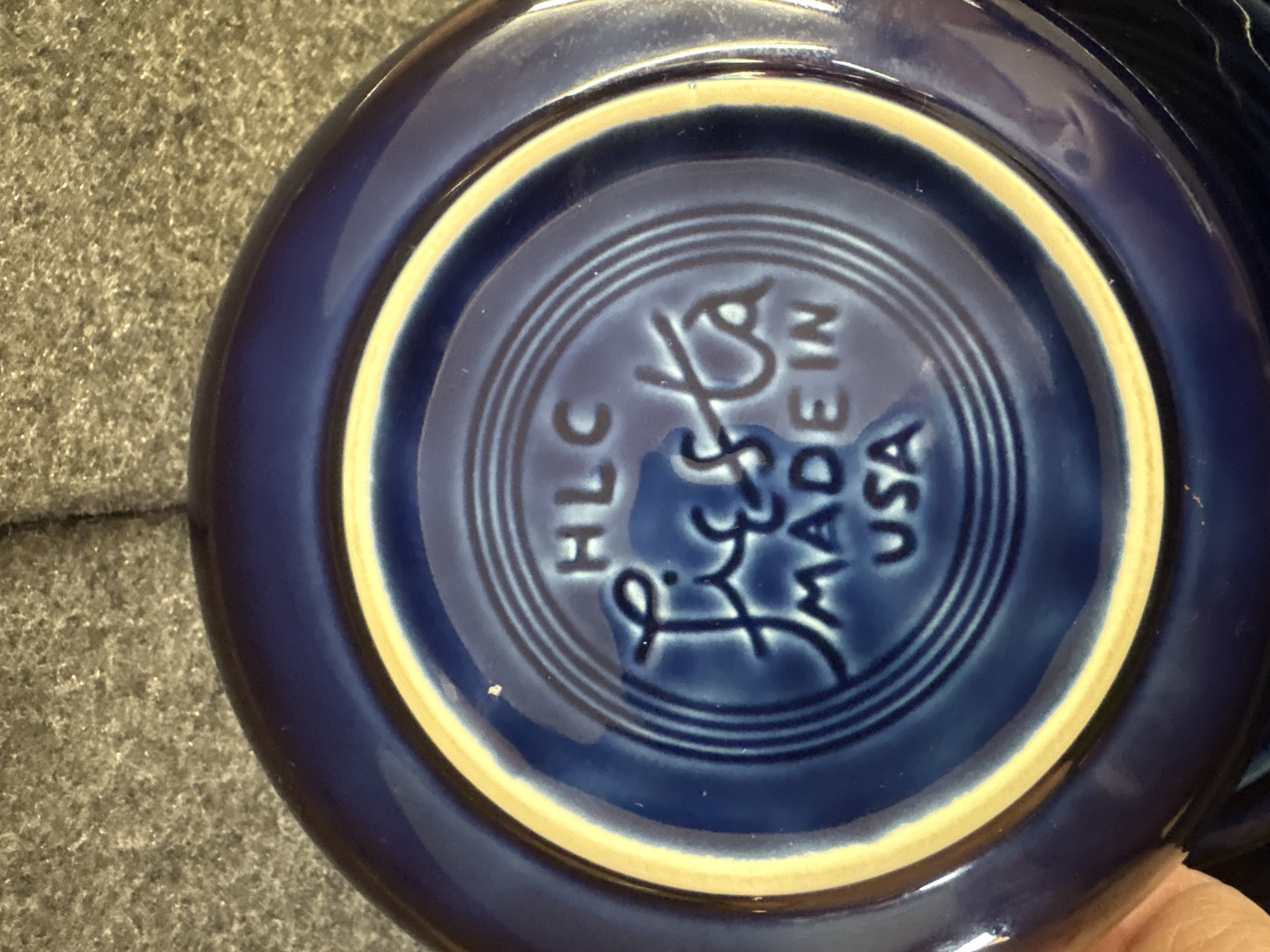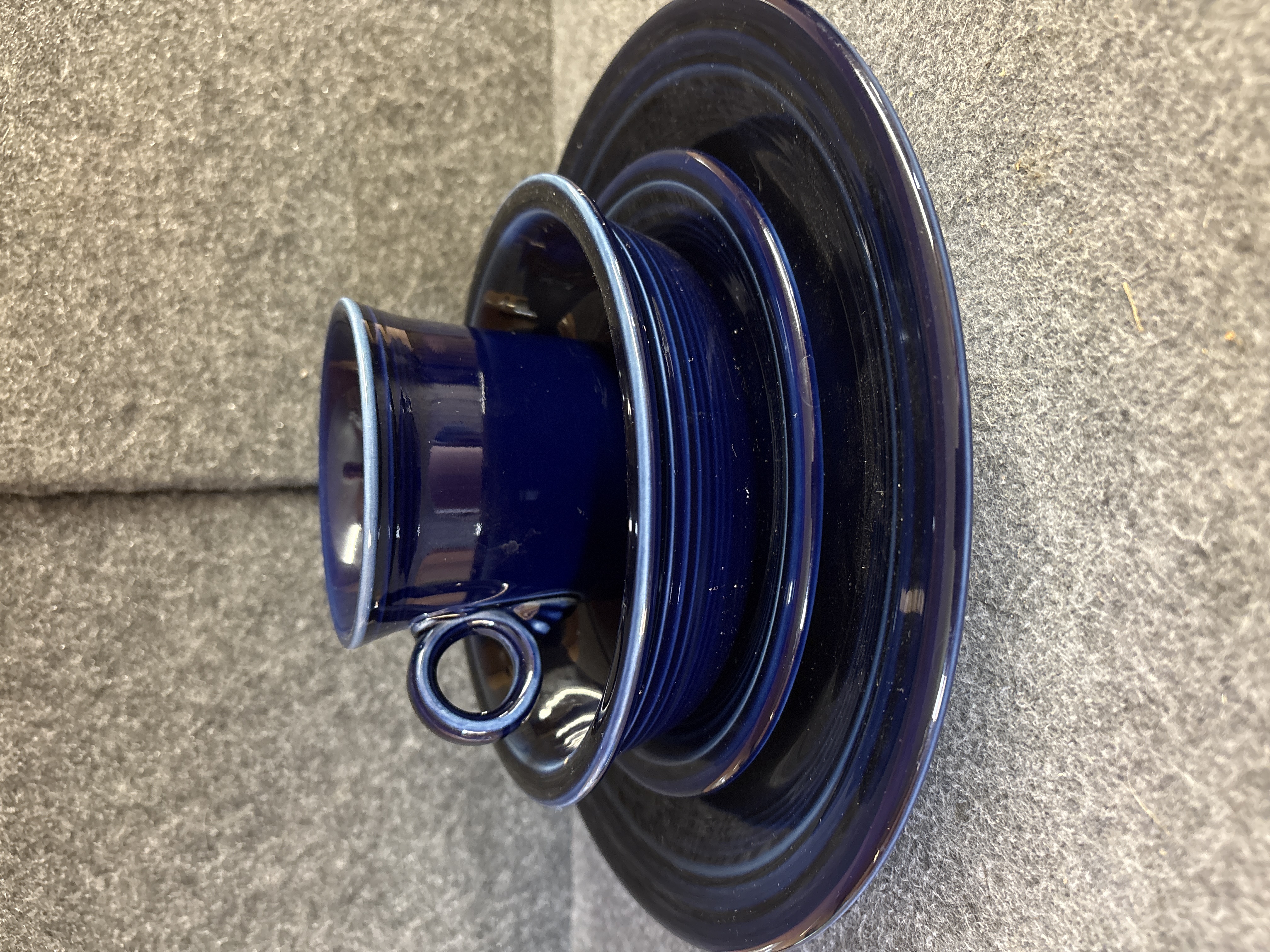 This collection of cobalt blue glazed ceramic tableware is manufactured by the Homer Laughlin China Co. in the USA under the Fiesta brand name. The group features the signature Art Deco-inspired concentric ring design characteristic of the pattern. The assortment includes a mug with a circular handle, a saucer, and various plates or shallow bowls of differing diameters. The underside of the pieces displays authentic maker’s marks, including circular stamps for HOMER LAUGHLIN CHINA CO. FIESTA USA, HLC Fiesta MADE IN USA, and Fiesta USA in a cursive script.
