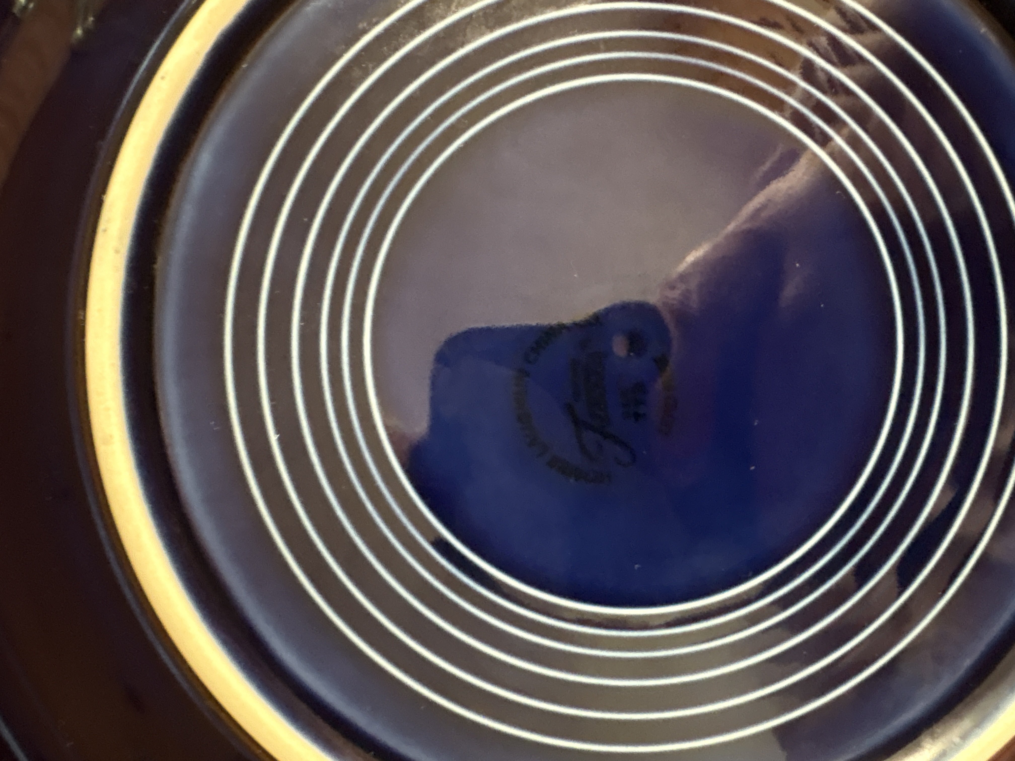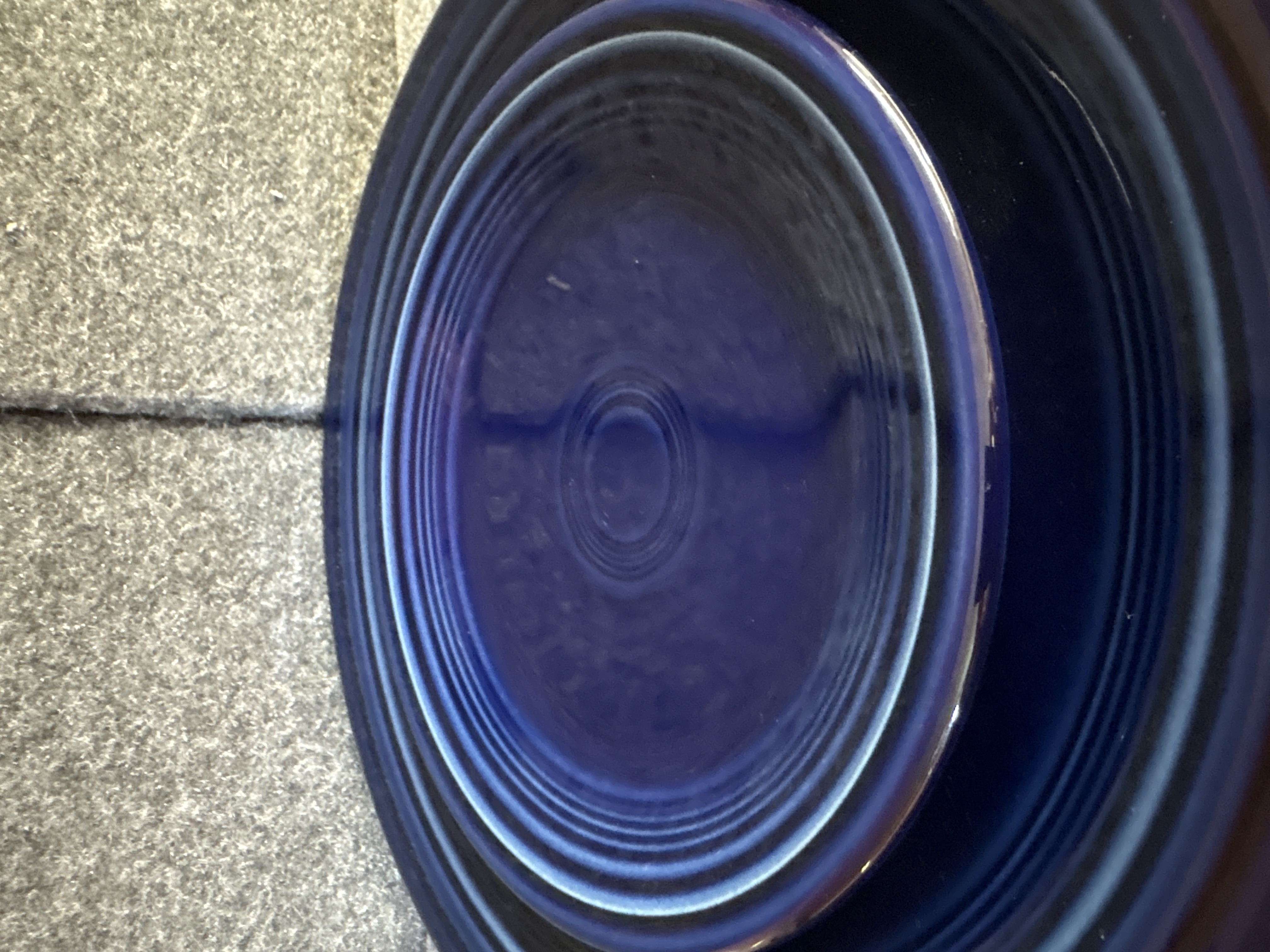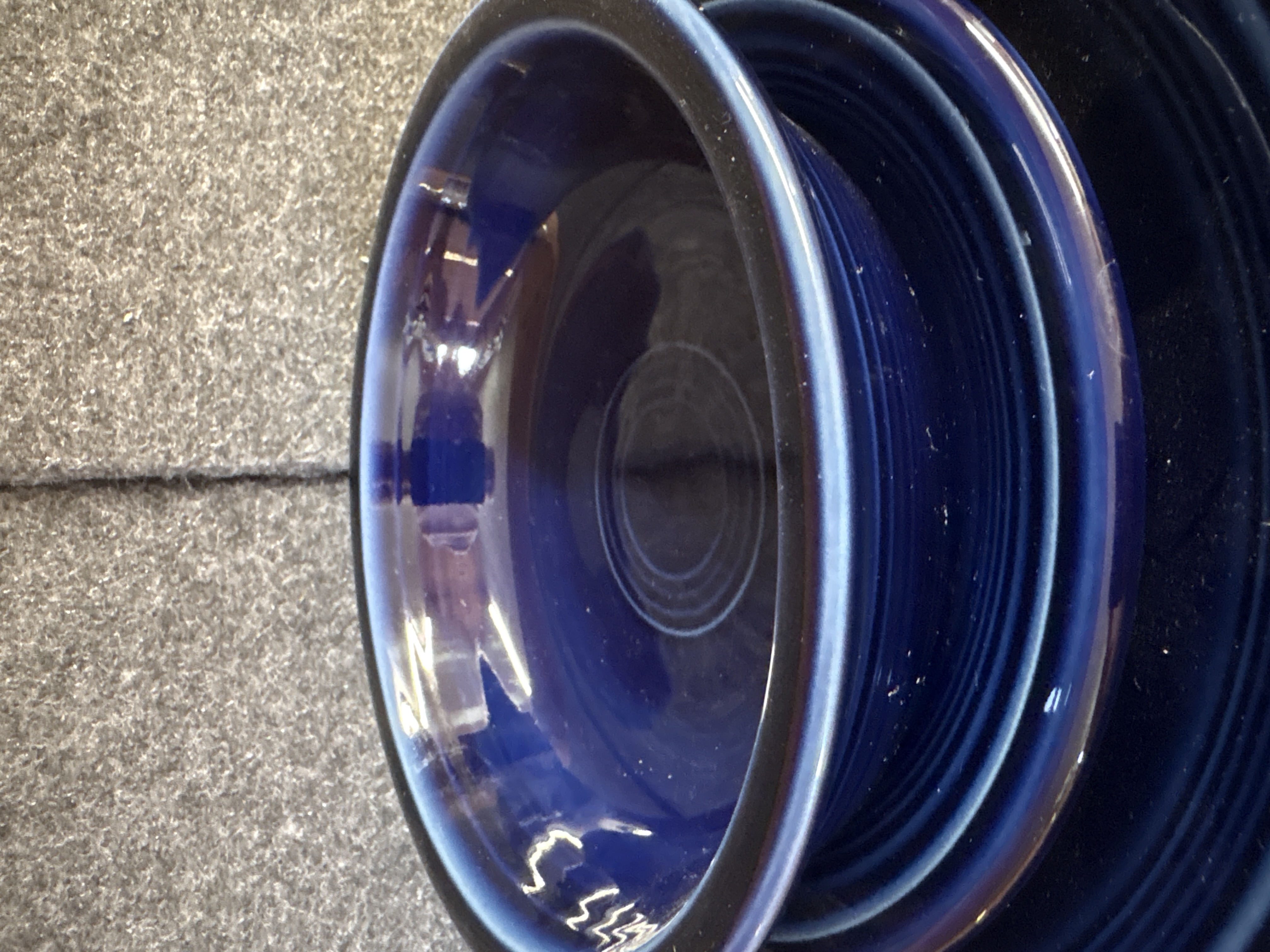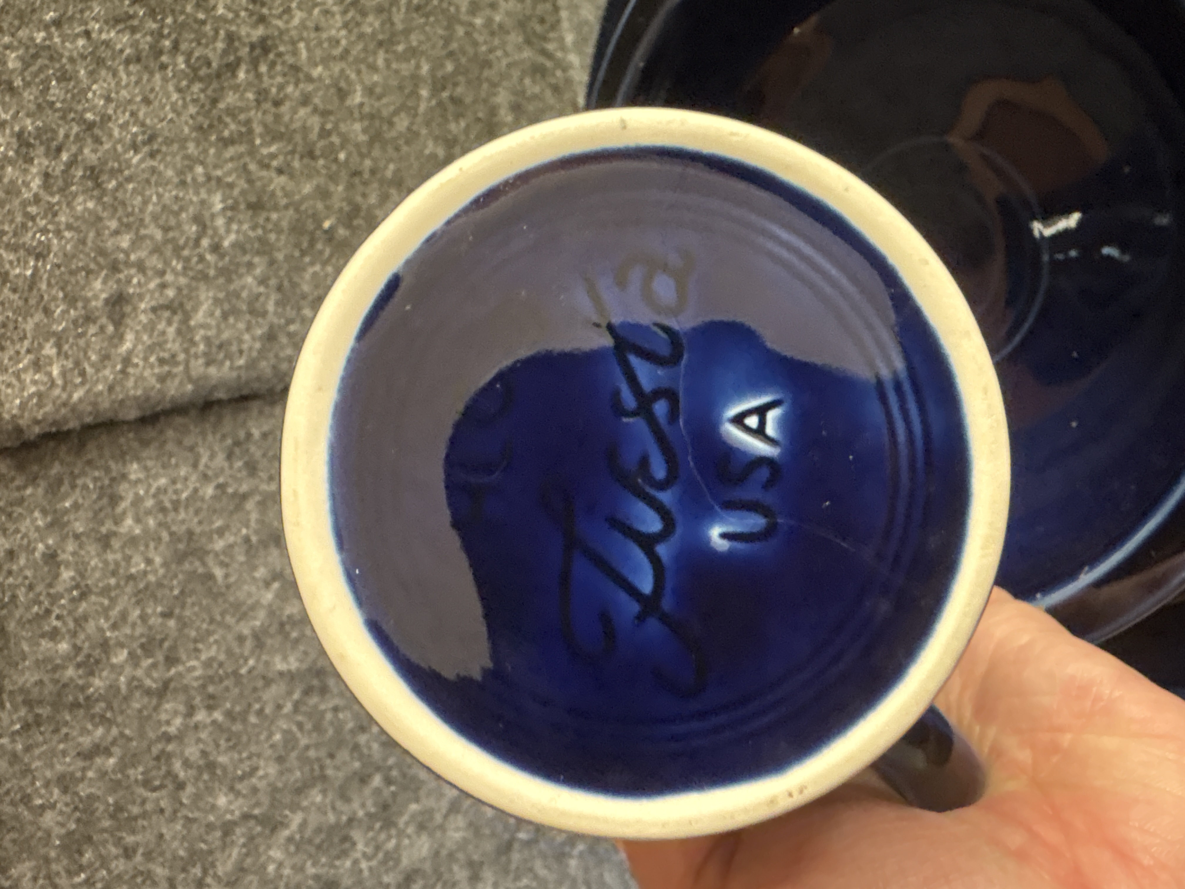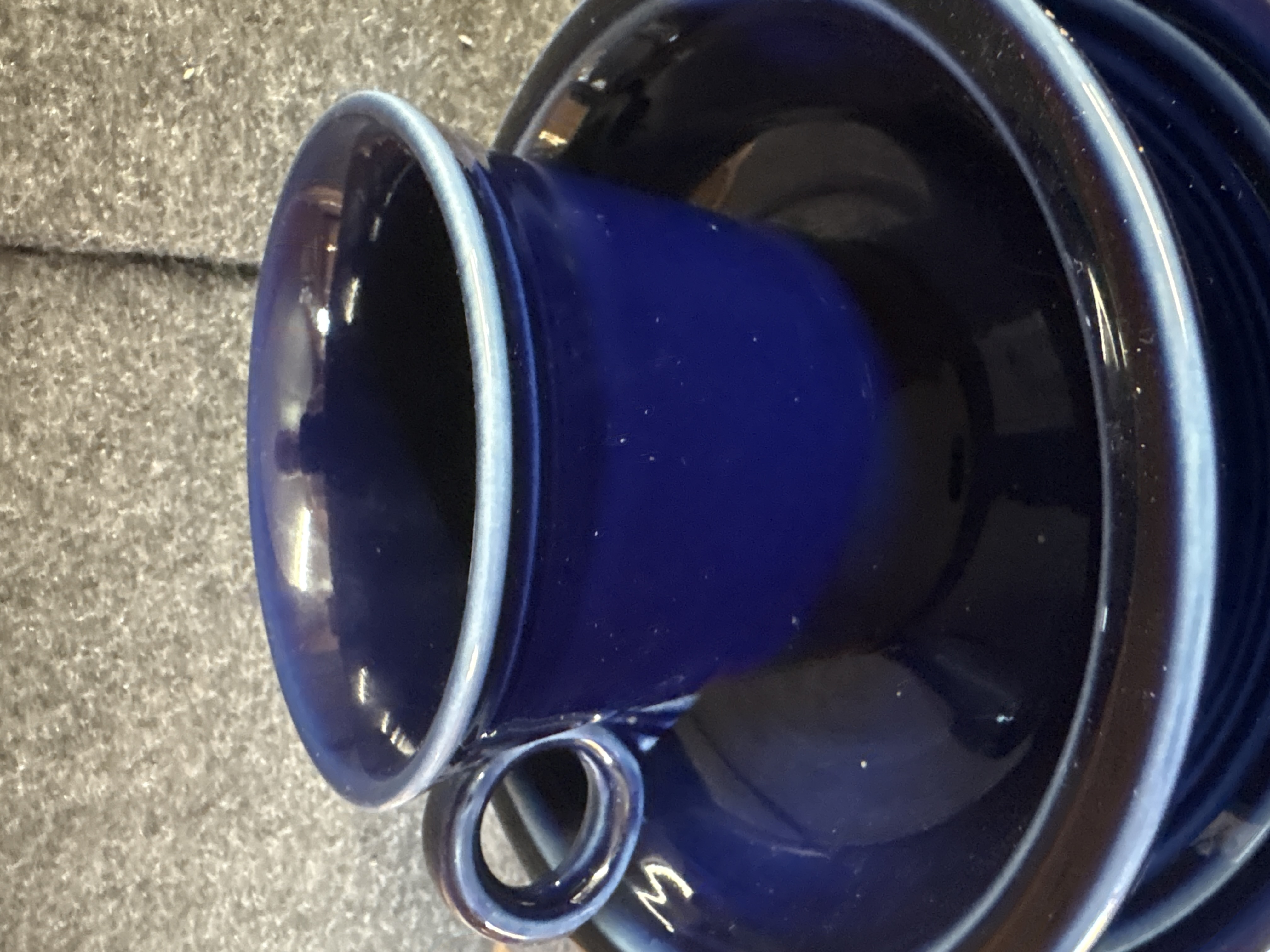 This collection of cobalt blue glazed ceramic tableware is manufactured by the Homer Laughlin China Co. in the USA under the Fiesta brand name. The group features the signature Art Deco-inspired concentric ring design characteristic of the pattern. The assortment includes a mug with a circular handle, a saucer, and various plates or shallow bowls of differing diameters. The underside of the pieces displays authentic maker’s marks, including circular stamps for HOMER LAUGHLIN CHINA CO. FIESTA USA, HLC Fiesta MADE IN USA, and Fiesta USA in a cursive script.