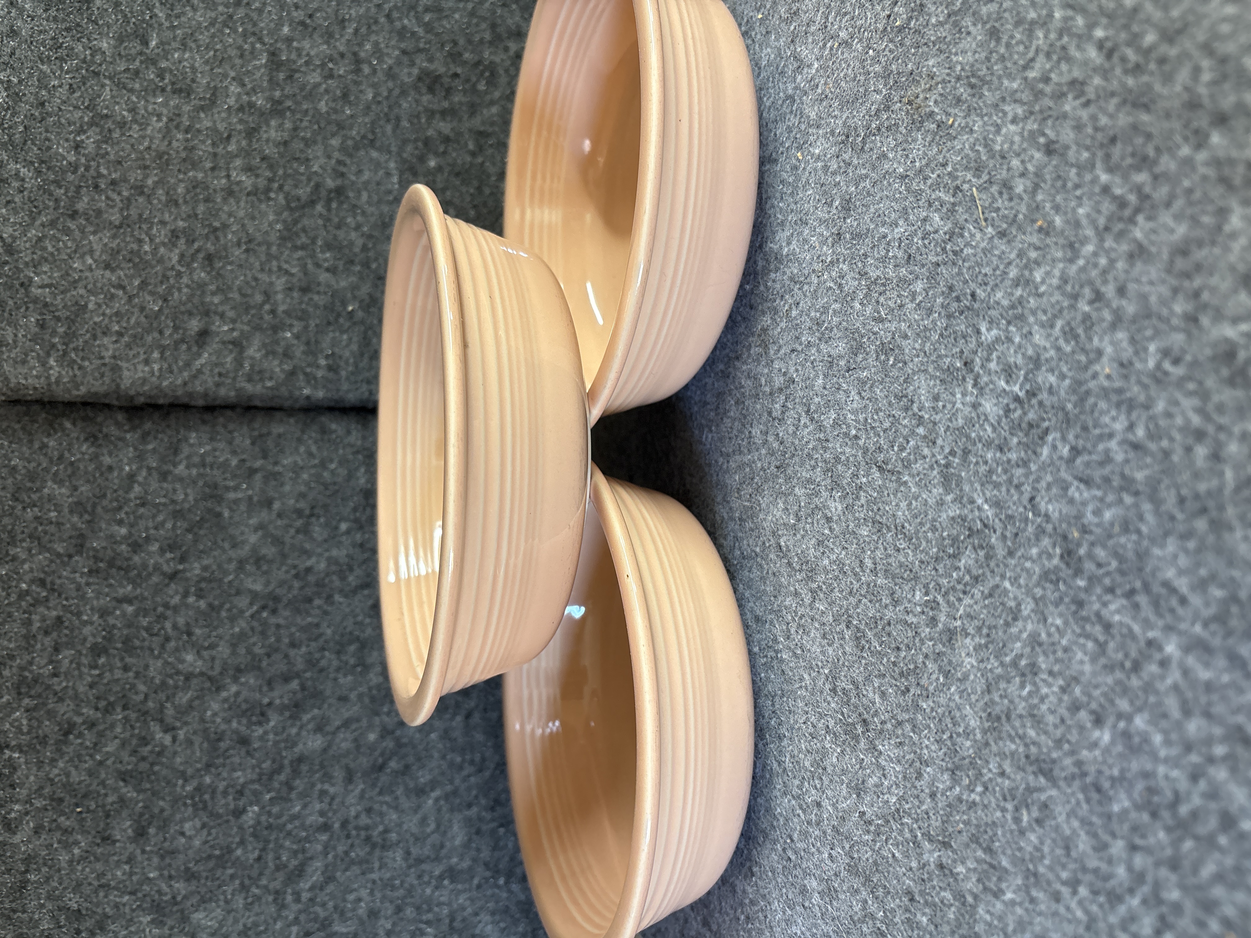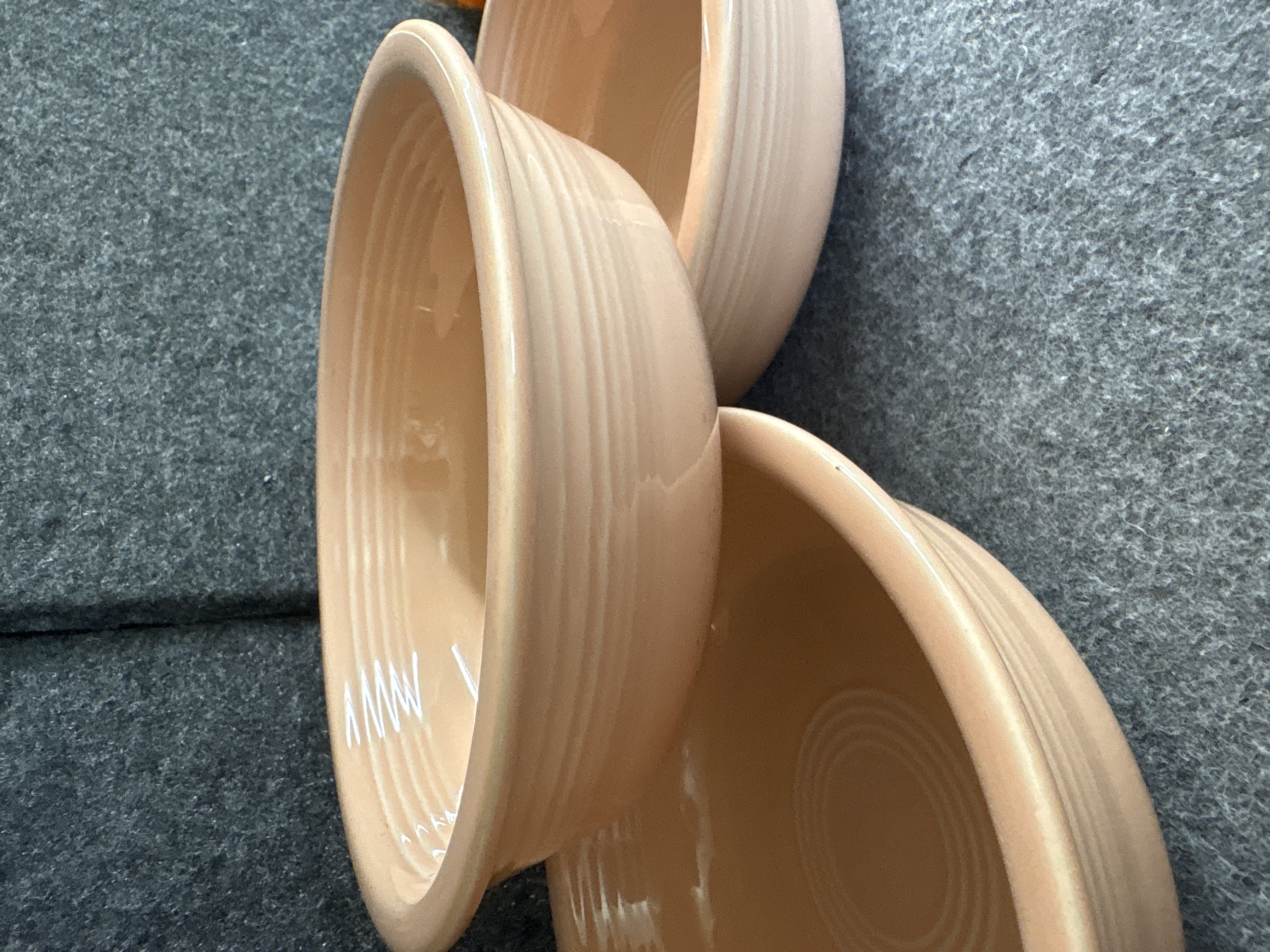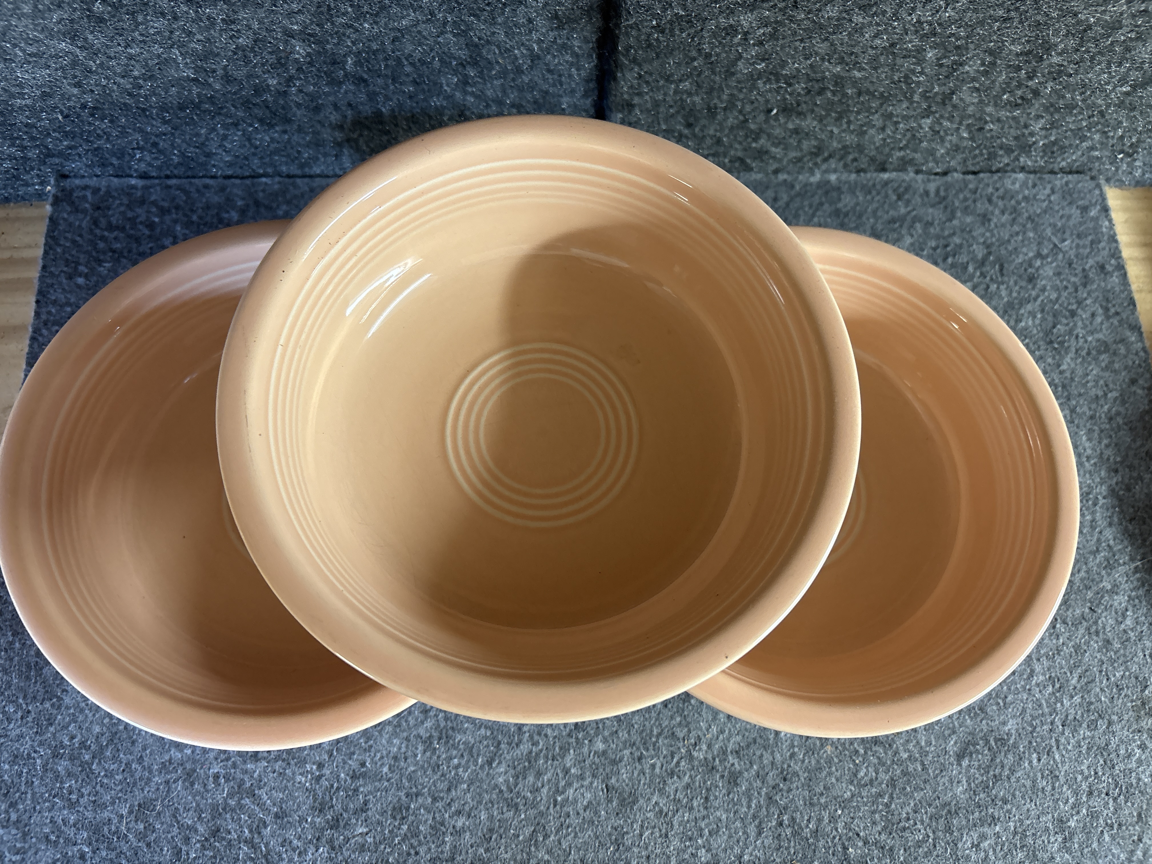 A trio of ceramic bowls produced by the Homer Laughlin China Company in the Fiesta pattern. These pieces feature a peach-toned glaze, identified by market consensus as the Apricot colorway introduced in 1986. The bowls are designed in a modern Art Deco style characterized by a series of concentric rings around the interior rim and base. Each bowl is marked on the underside with an embossed backstamp reading HLC fiesta MADE IN USA.