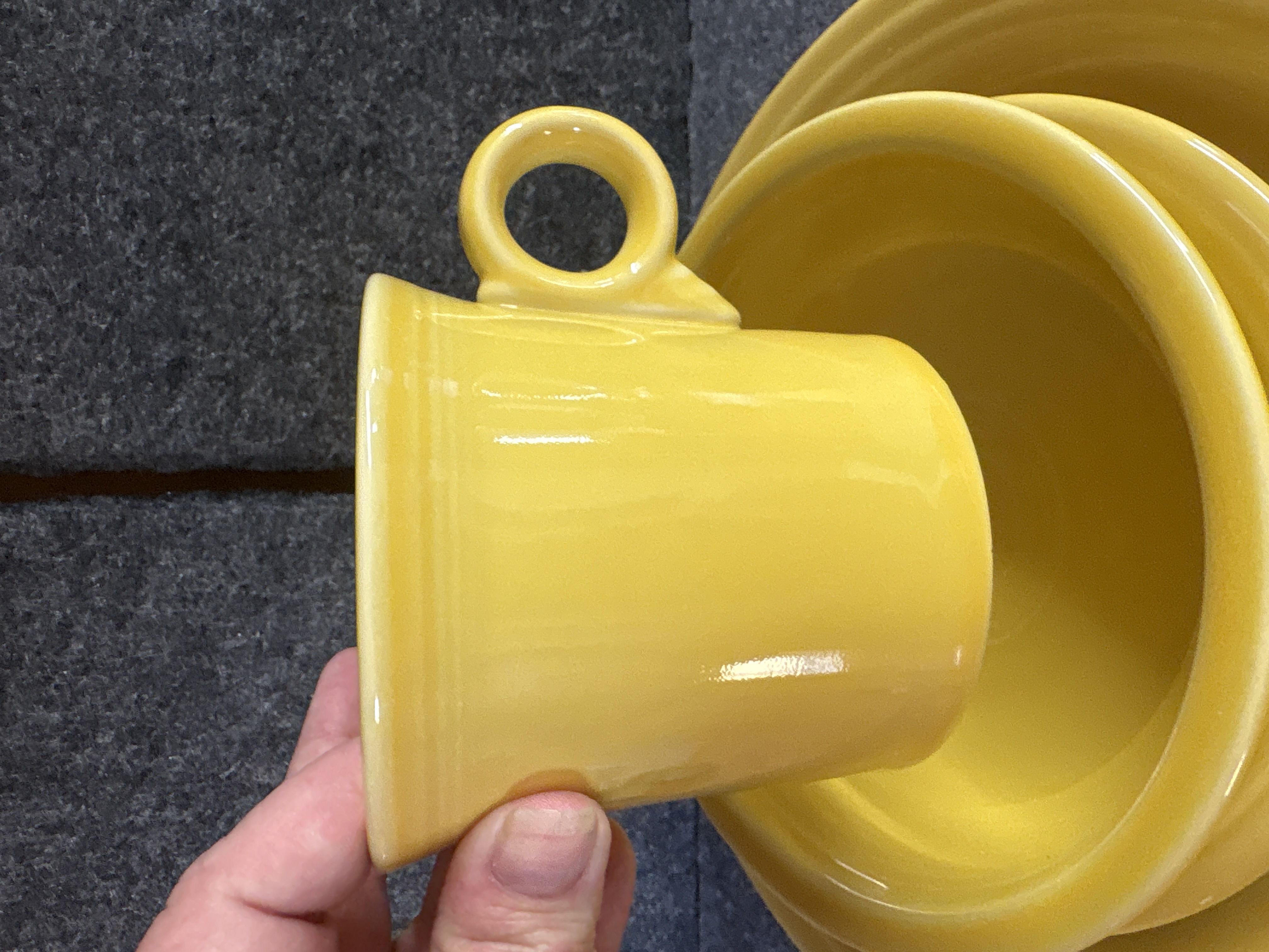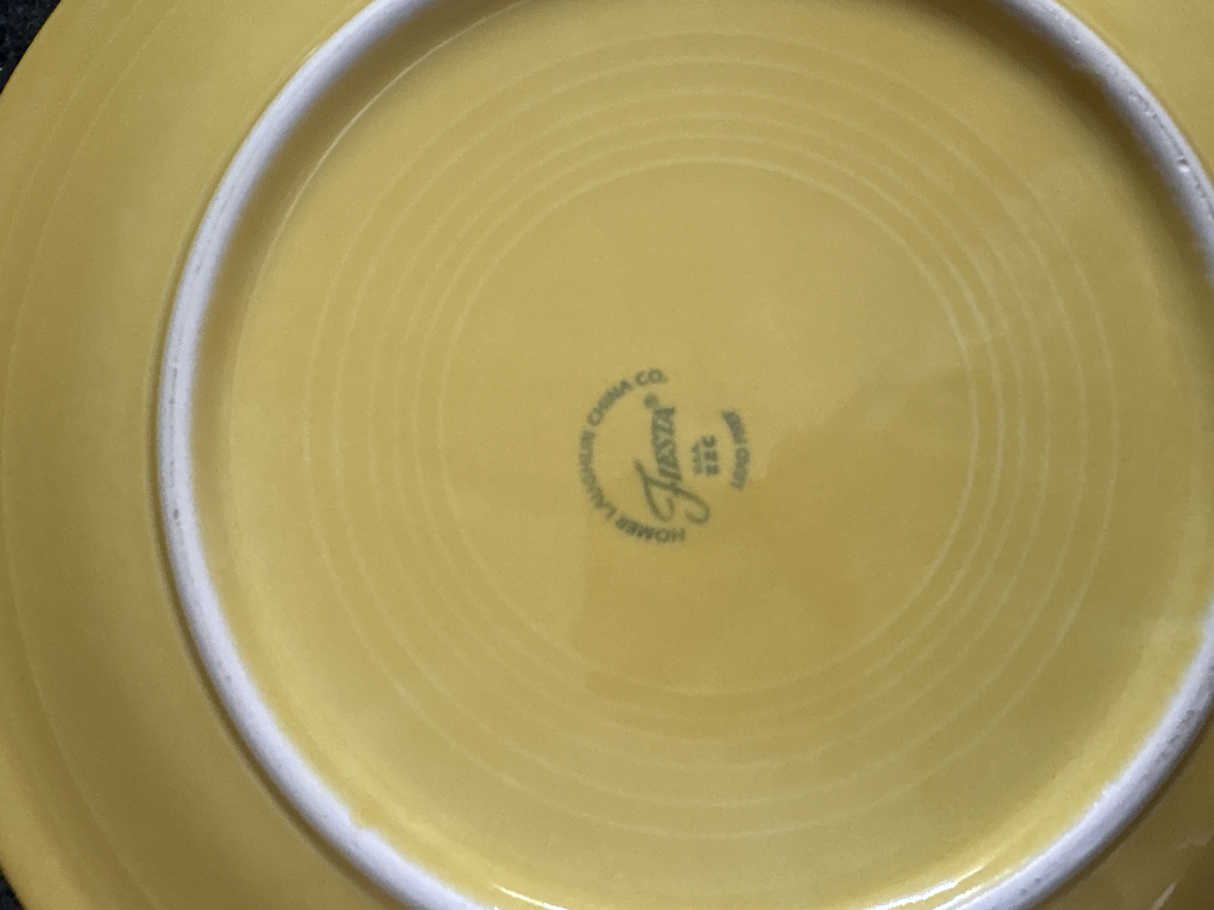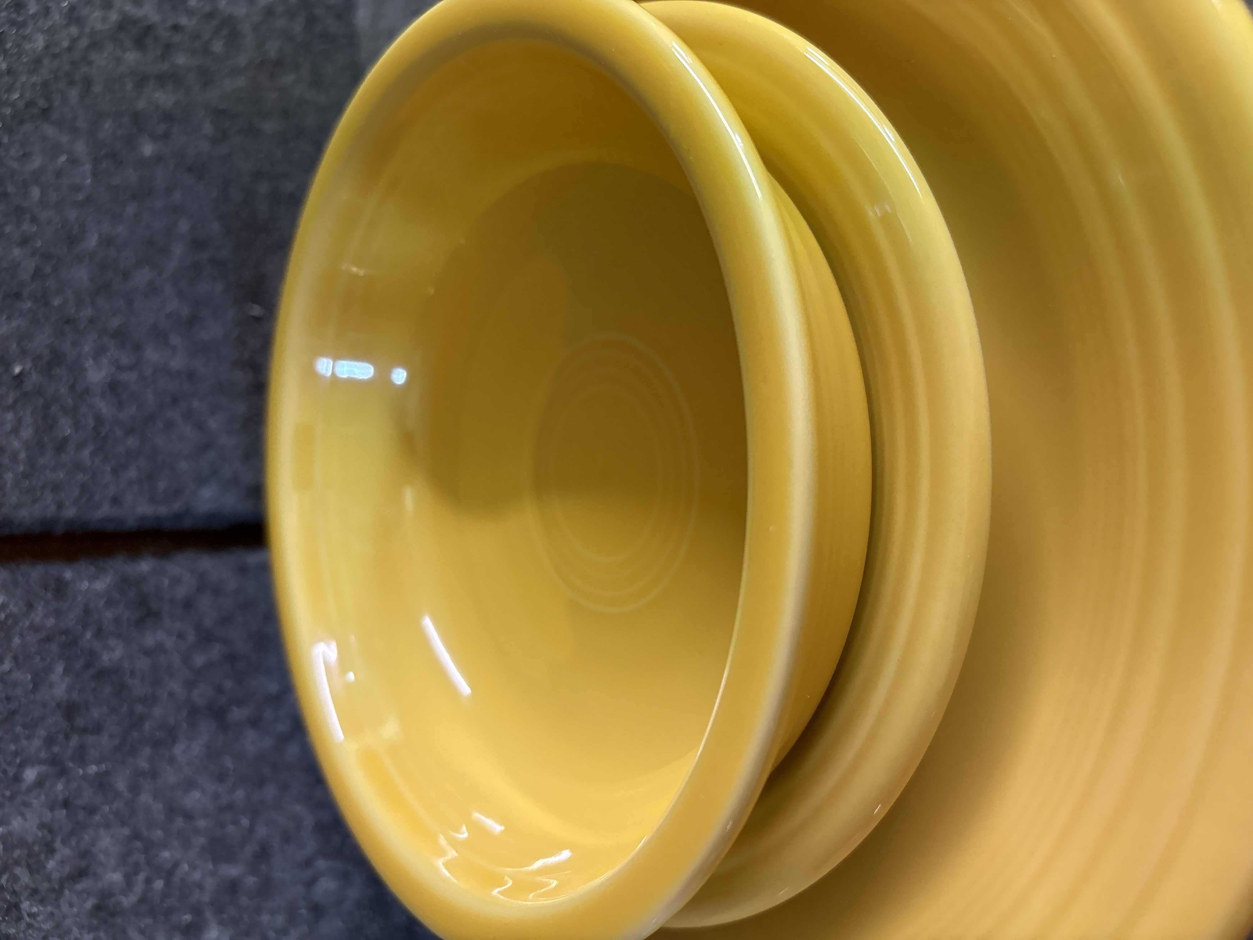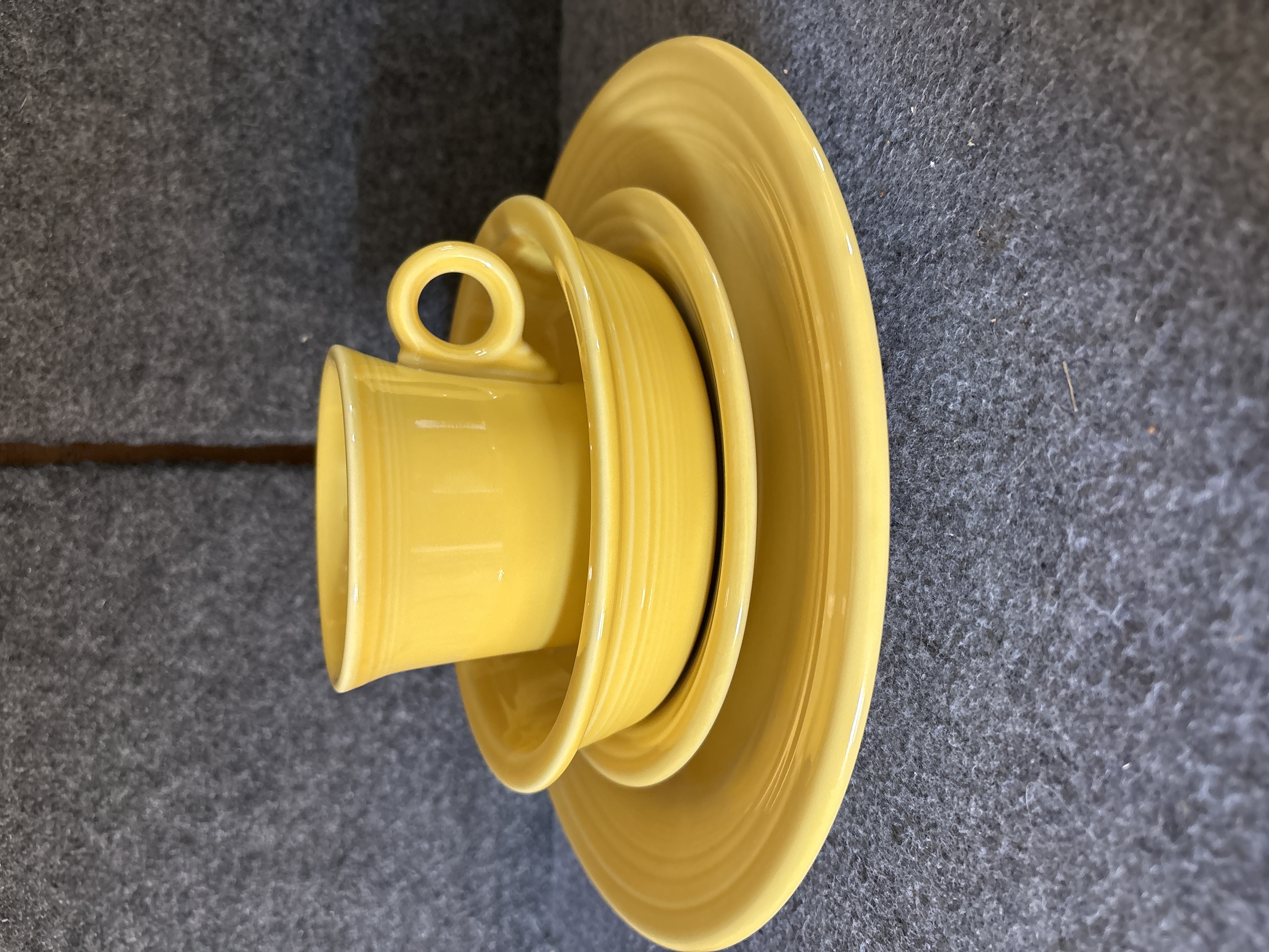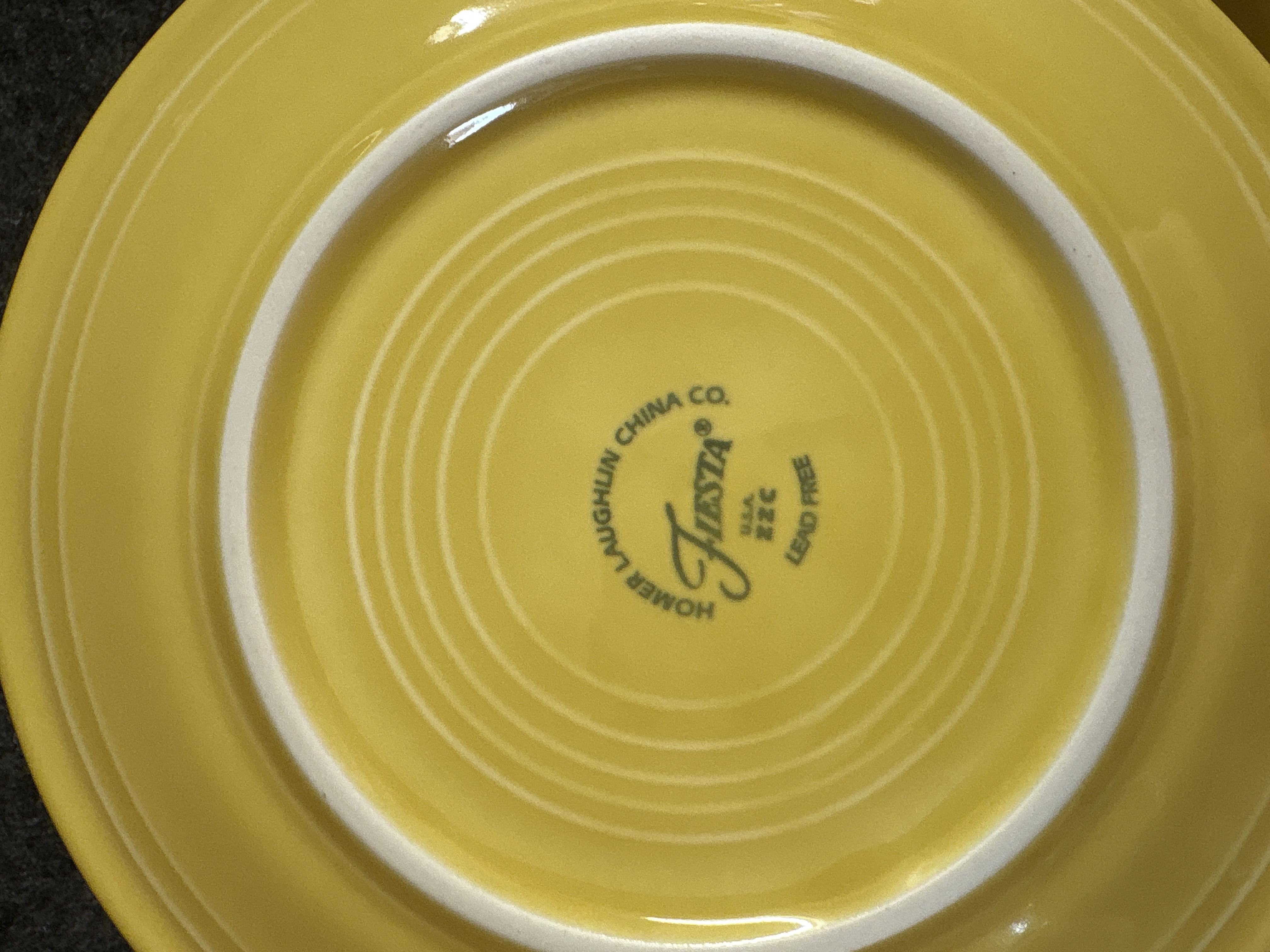 A collection of yellow glazed ceramic dinnerware manufactured by the Homer Laughlin China Co. in the Fiesta pattern. The group features the signature concentric ring design and a uniform glossy yellow finish. The assortment includes various plates, a shallow bowl, and a mug characterized by a circular ring handle. Manufacturer marks on the undersides include HLC Fiesta MADE IN USA and HOMER LAUGHLIN CHINA CO. Fiesta USA. Certain pieces are further marked LEAD FREE and bear the date code ZZC.
