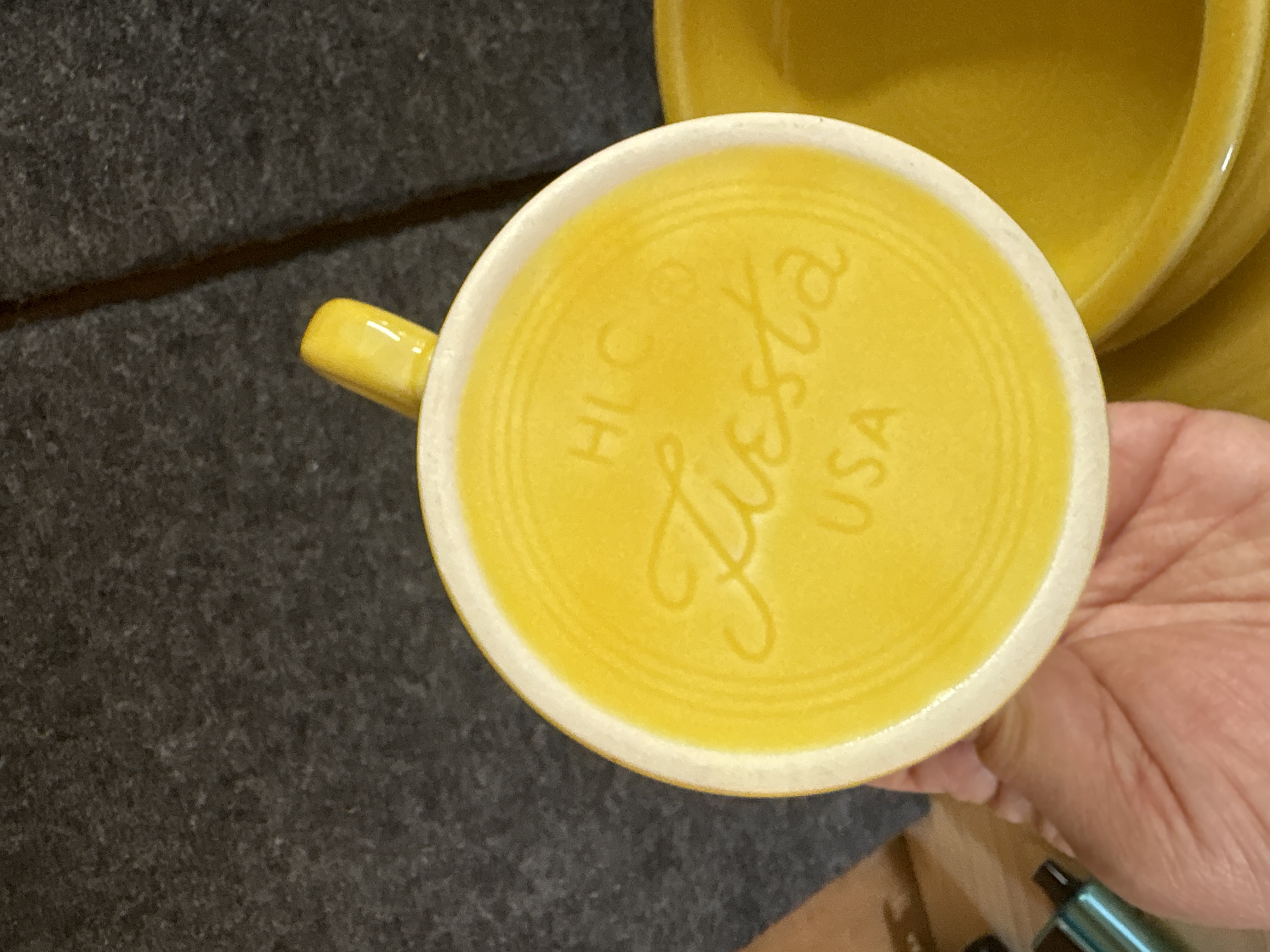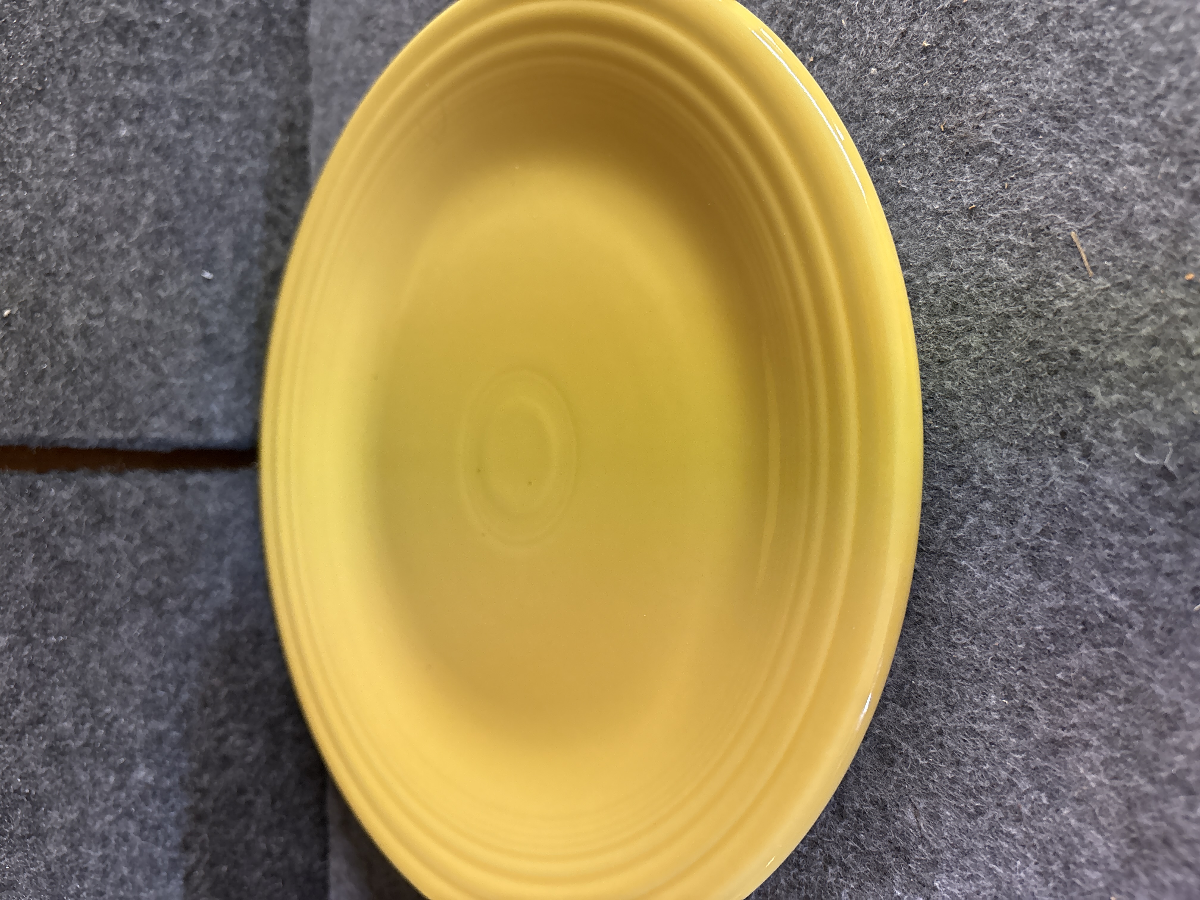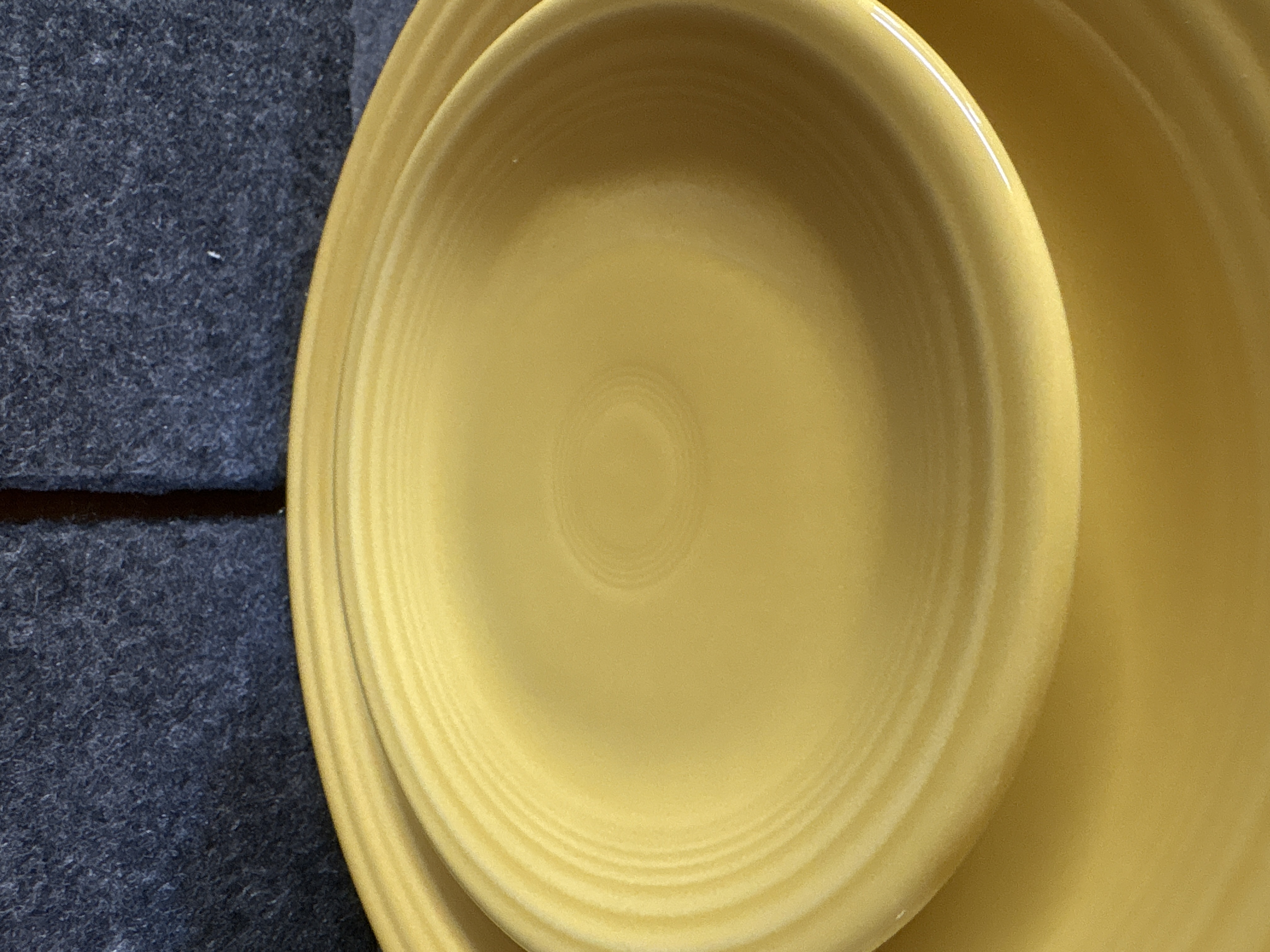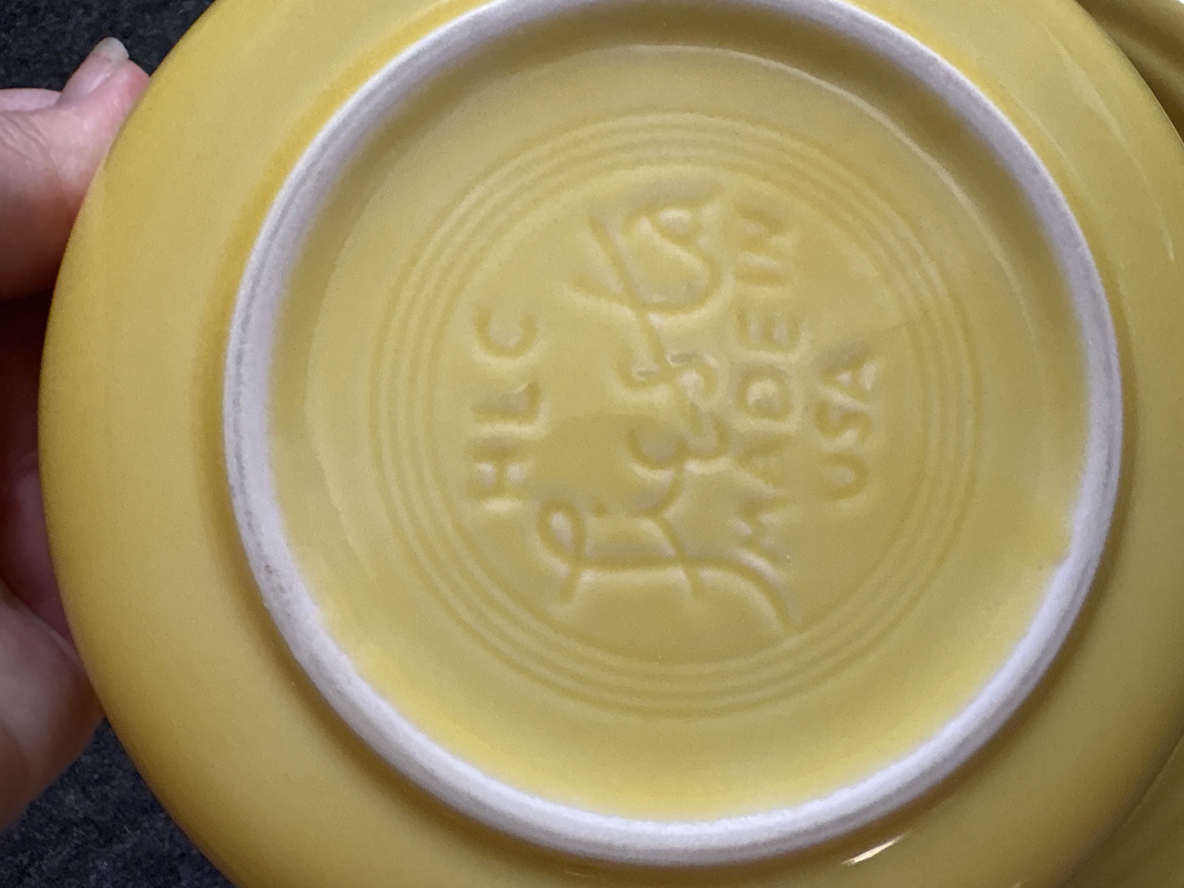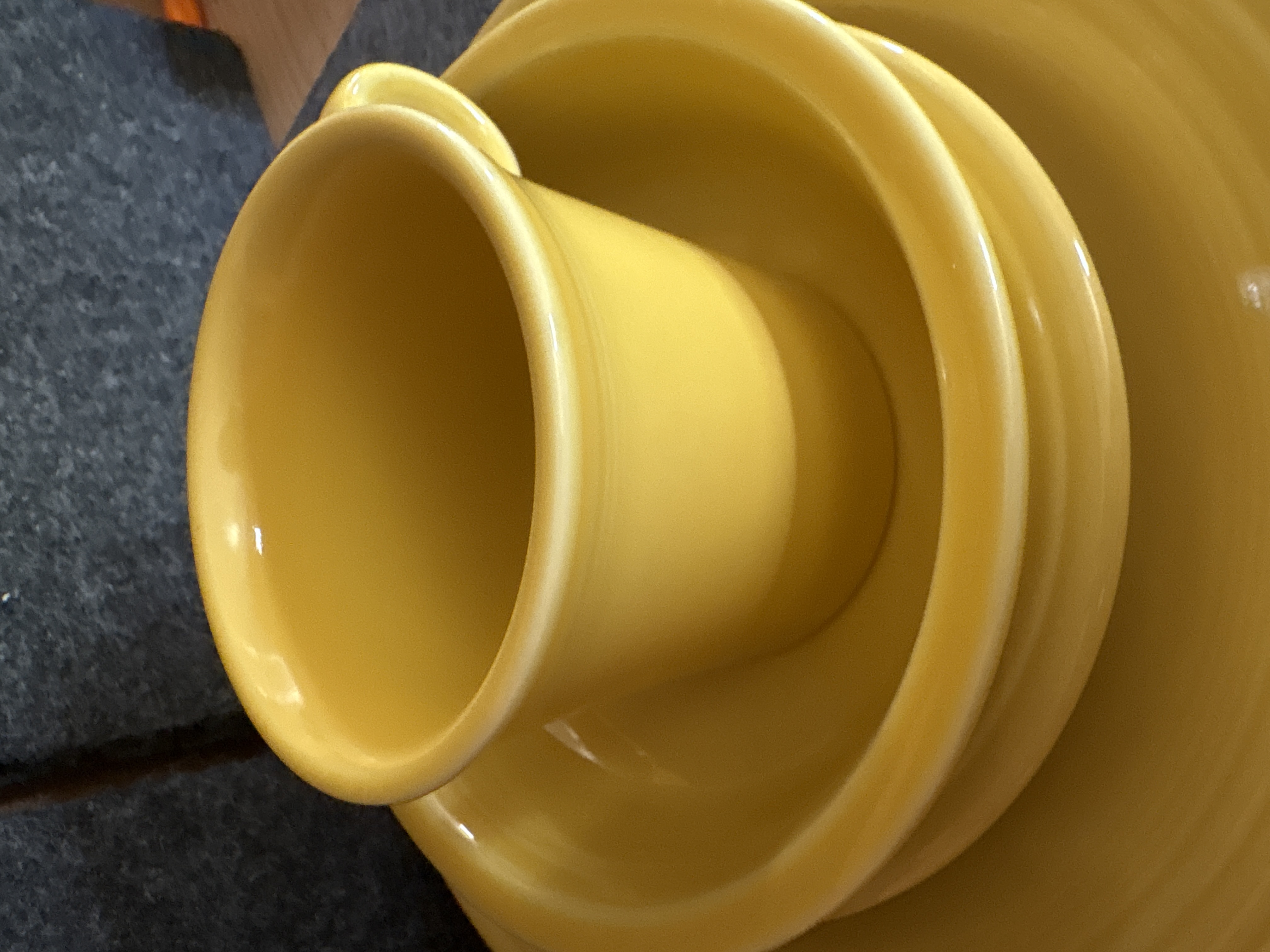A collection of yellow glazed ceramic dinnerware manufactured by the Homer Laughlin China Co. in the Fiesta pattern. The group features the signature concentric ring design and a uniform glossy yellow finish. The assortment includes various plates, a shallow bowl, and a mug characterized by a circular ring handle. Manufacturer marks on the undersides include HLC Fiesta MADE IN USA and HOMER LAUGHLIN CHINA CO. Fiesta USA. Certain pieces are further marked LEAD FREE and bear the date code ZZC.