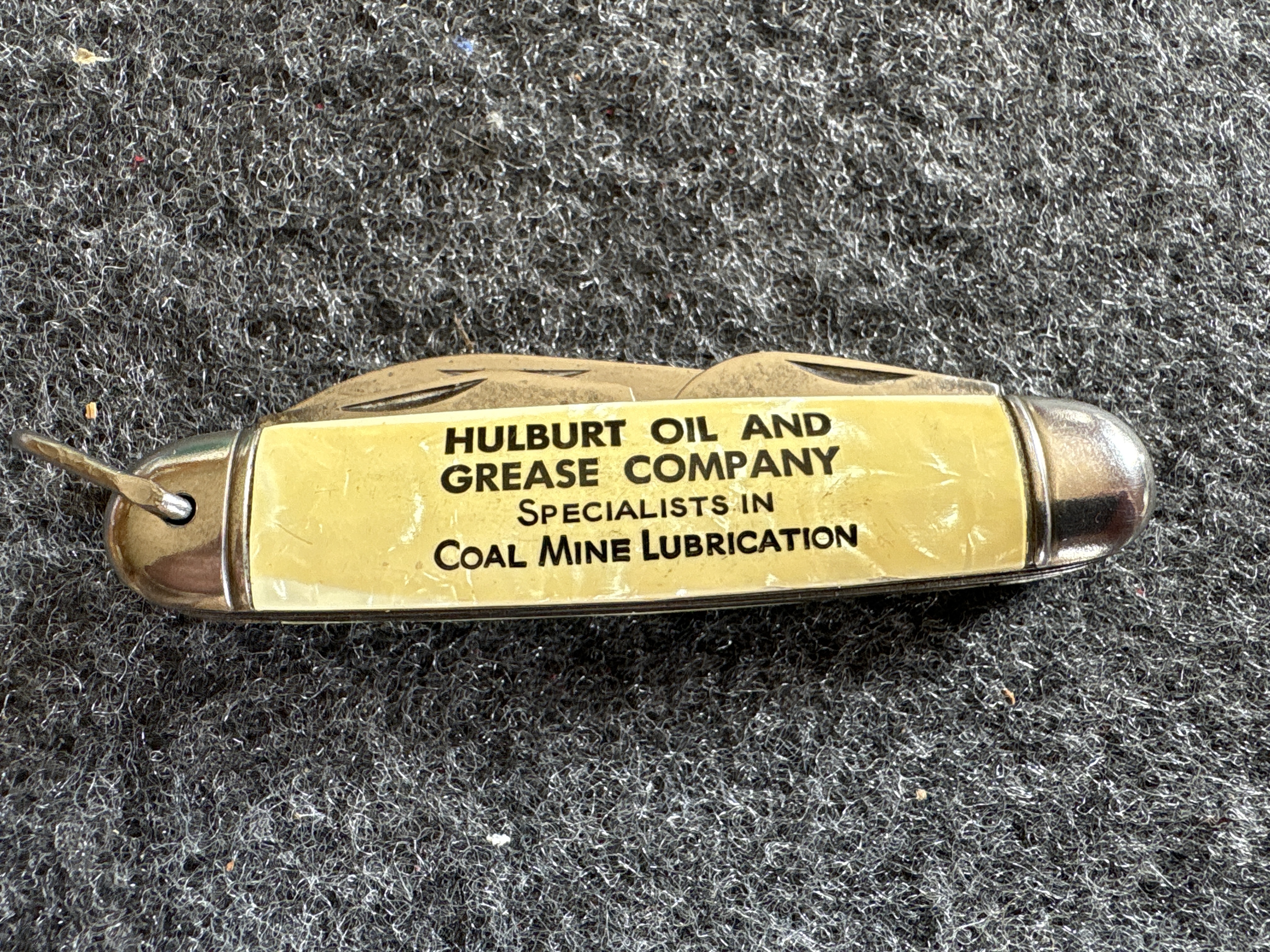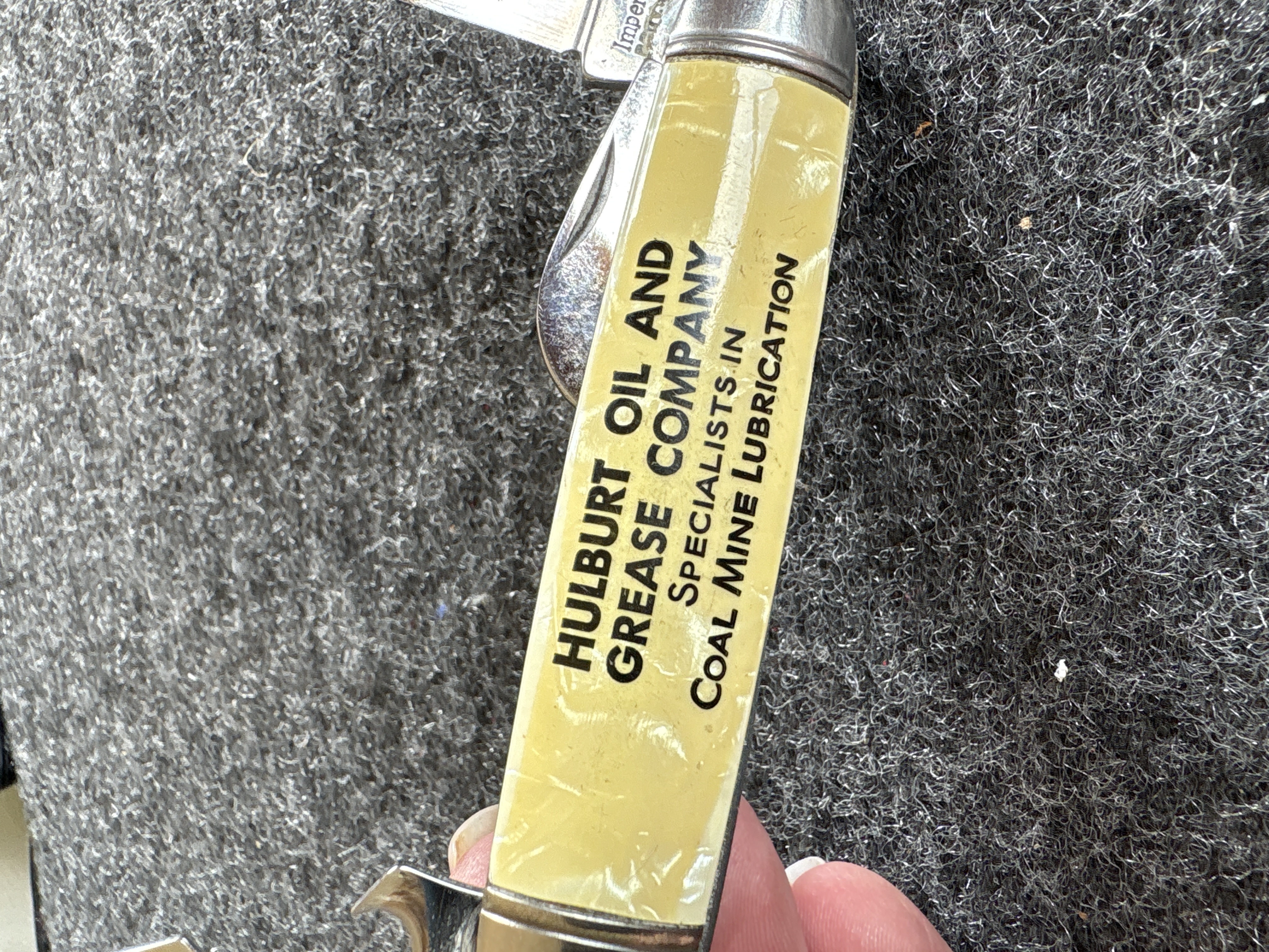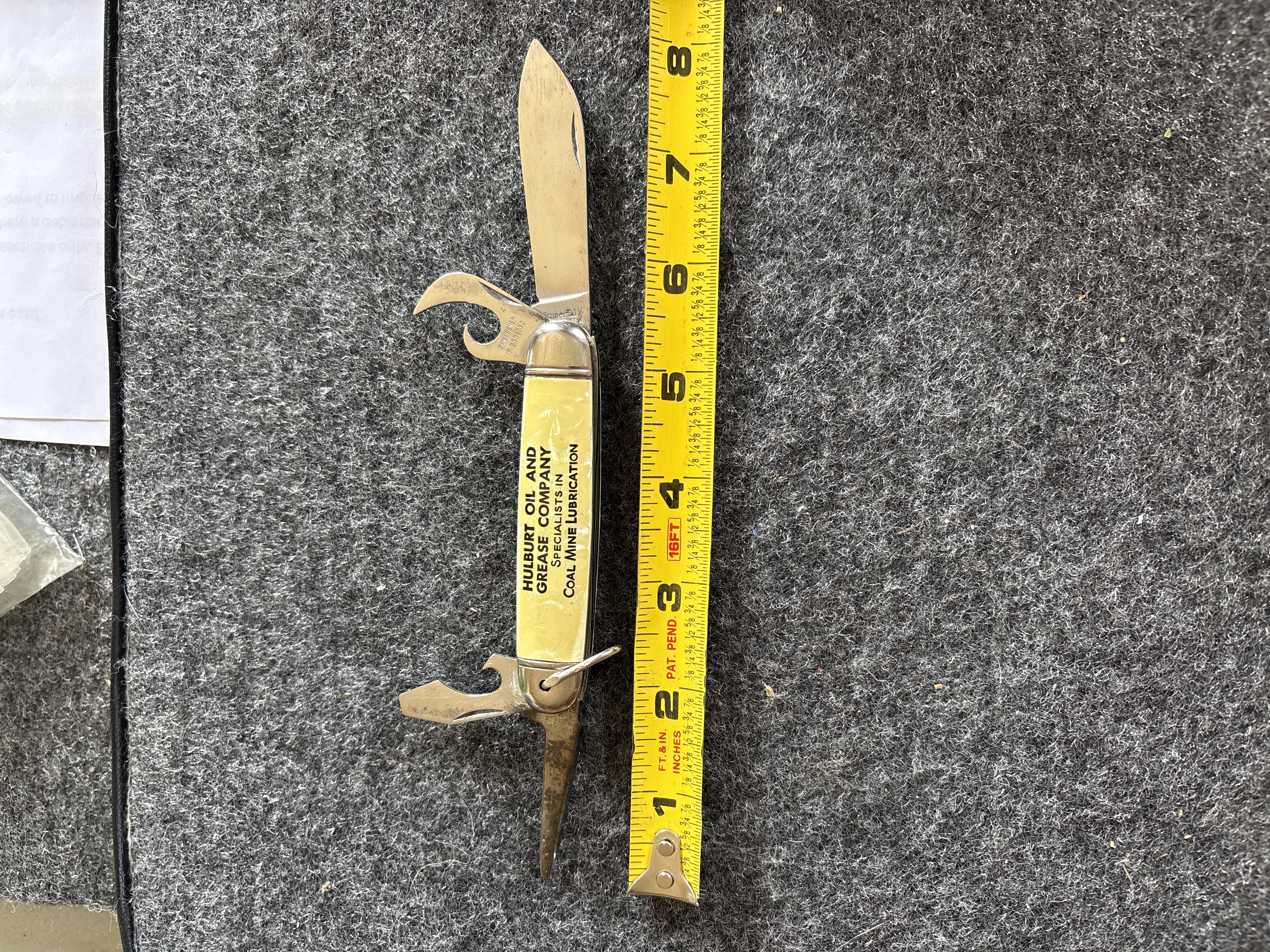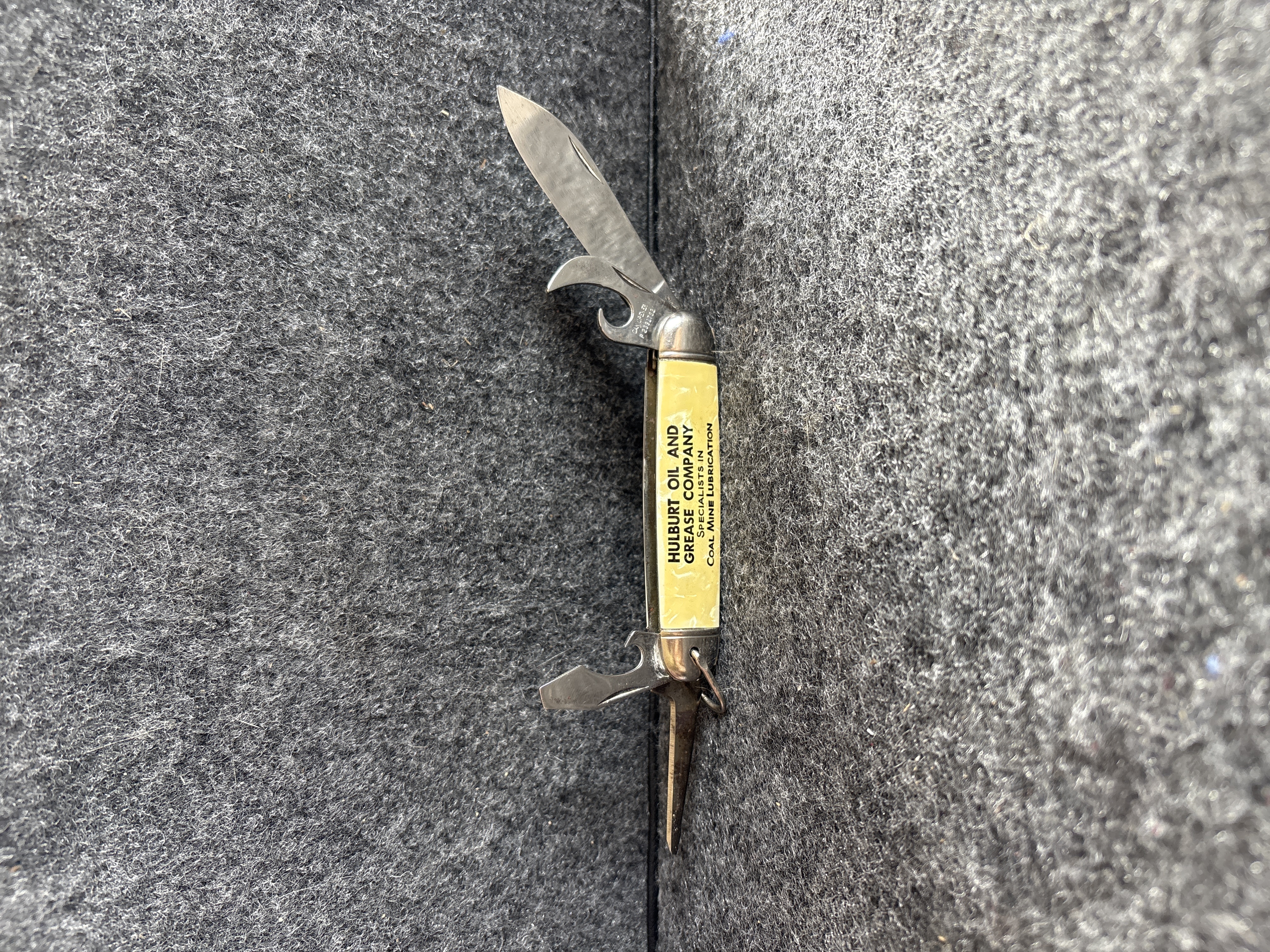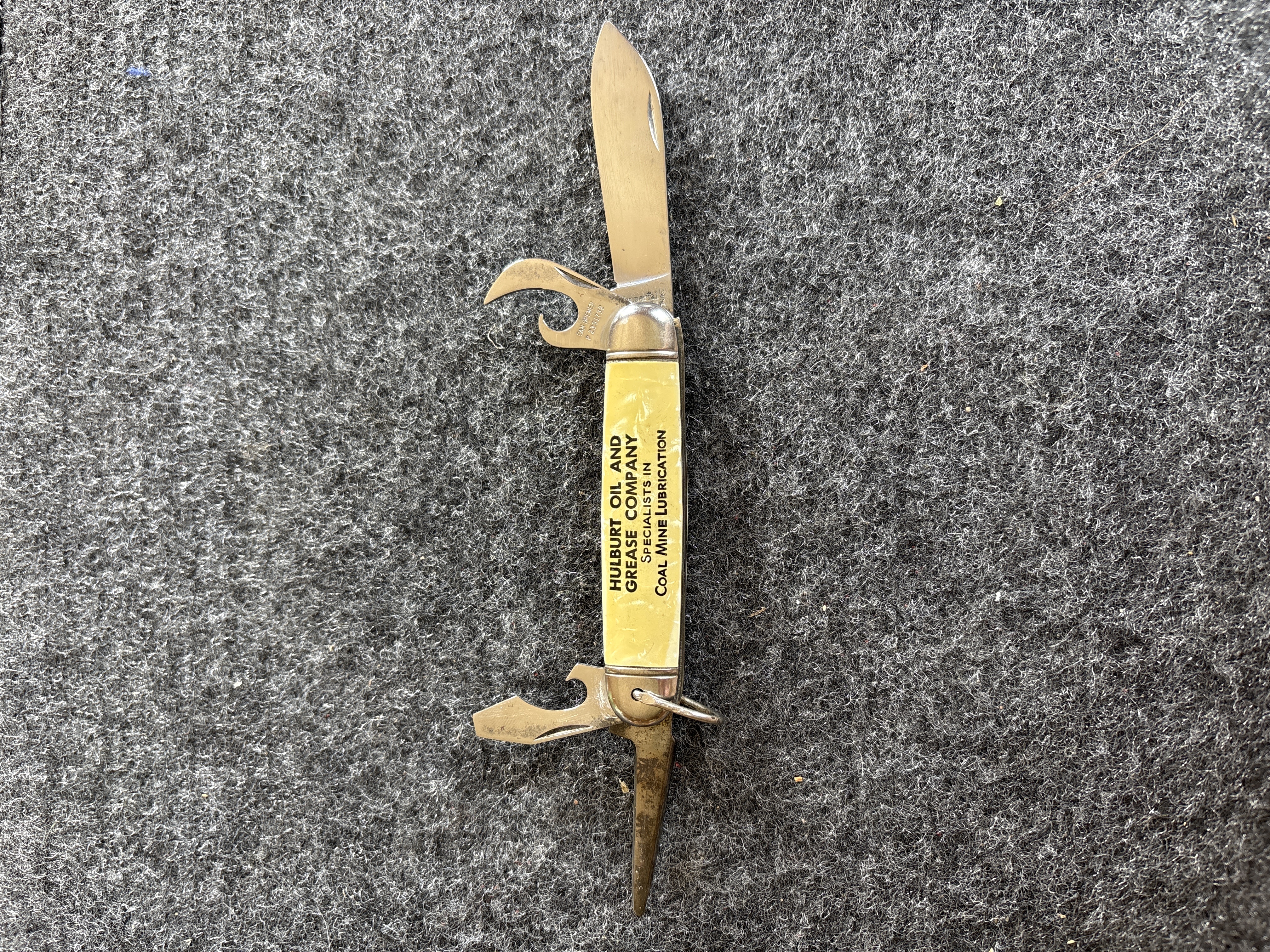 A vintage four-blade multi-tool folding pocket knife manufactured by the Imperial Knife Company of Providence, Rhode Island. This utility pattern knife, identified as the KampKing model, features a spear-point main blade, a can opener, a combination bottle opener and flathead screwdriver, and a tapered punch or awl. The main blade tang bears the Imperial crown logo and is stamped PROV. R.I. U.S.A. The can opener blade is marked CAN OPENER and P 2391732. The construction includes yellow cracked-ice celluloid handle scales over metal liners with polished metal bolsters and a steel bail. The handle scales are printed with black text for the Hulburt Oil and Grease Company Specialists in Coal Mine Lubrication.