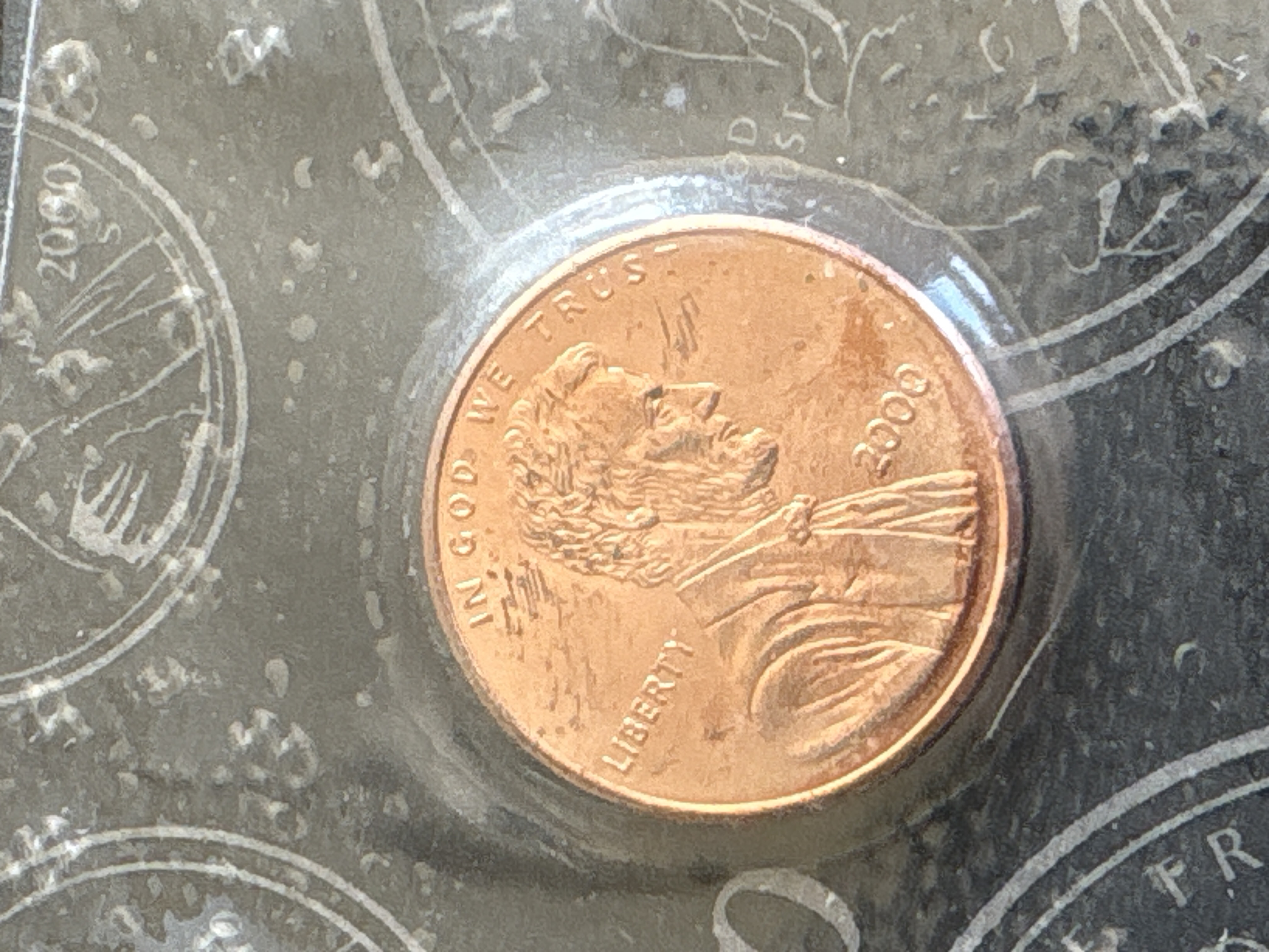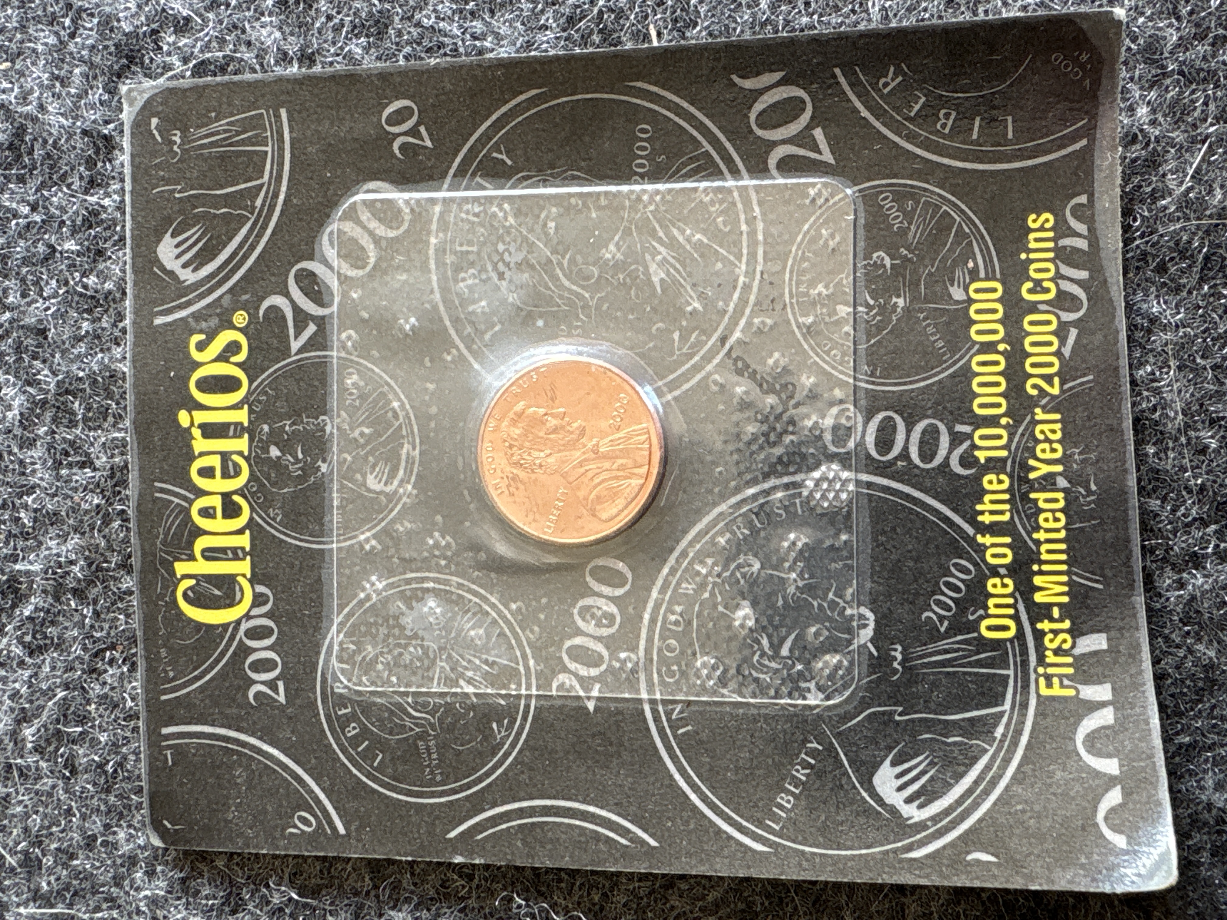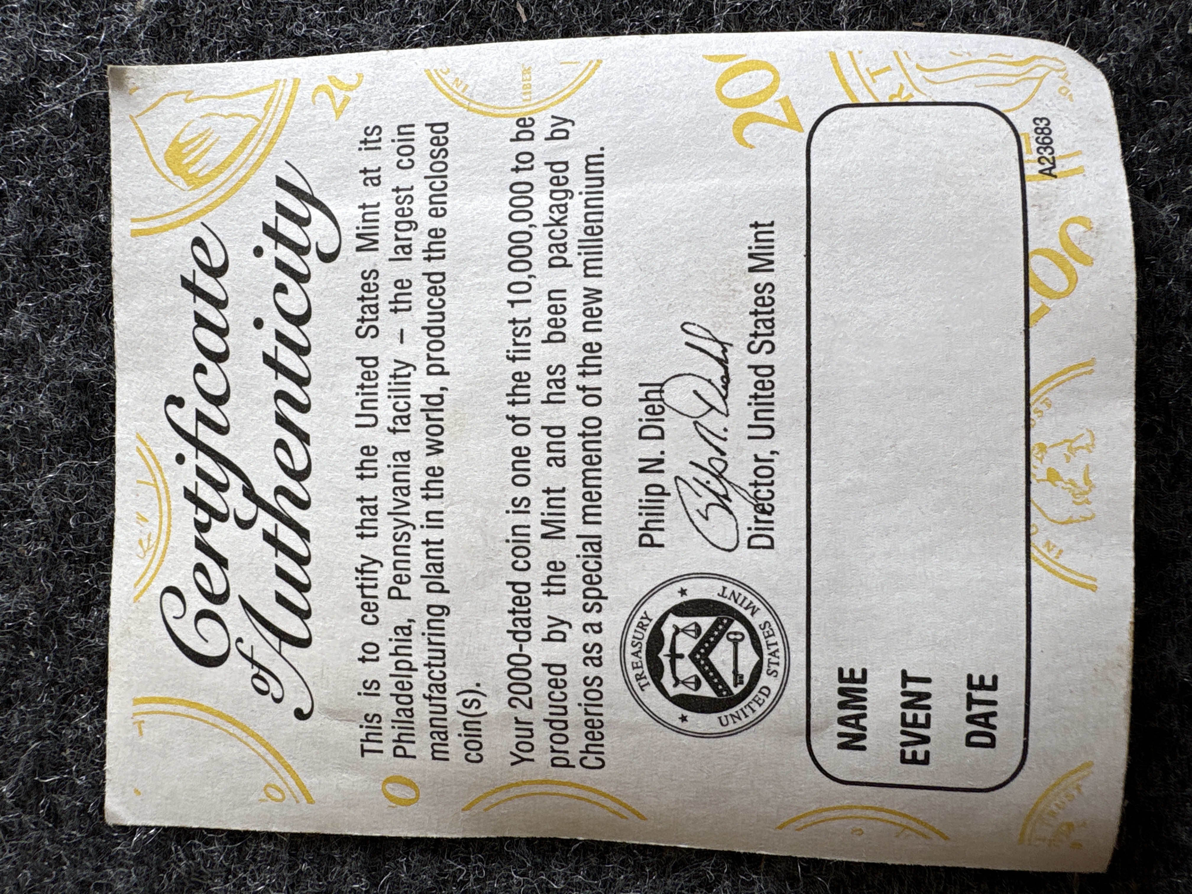 US 2000 Lincoln cent struck at the Philadelphia Mint, identified by the absence of a mint mark, presented in the original Cheerios cereal promotional packaging. The coin features the Lincoln obverse and is composed of copper-plated zinc. It is housed in a clear plastic blister on a dark gray card printed with the Cheerios logo and the text One of the 10,000,000 First-Minted Year 2000 Coins. The reverse of the card includes a Certificate of Authenticity signed by US Mint Director Philip N. Diehl with serial number A23683. This coin was part of a mass-market promotion to introduce the new millennium coinage.