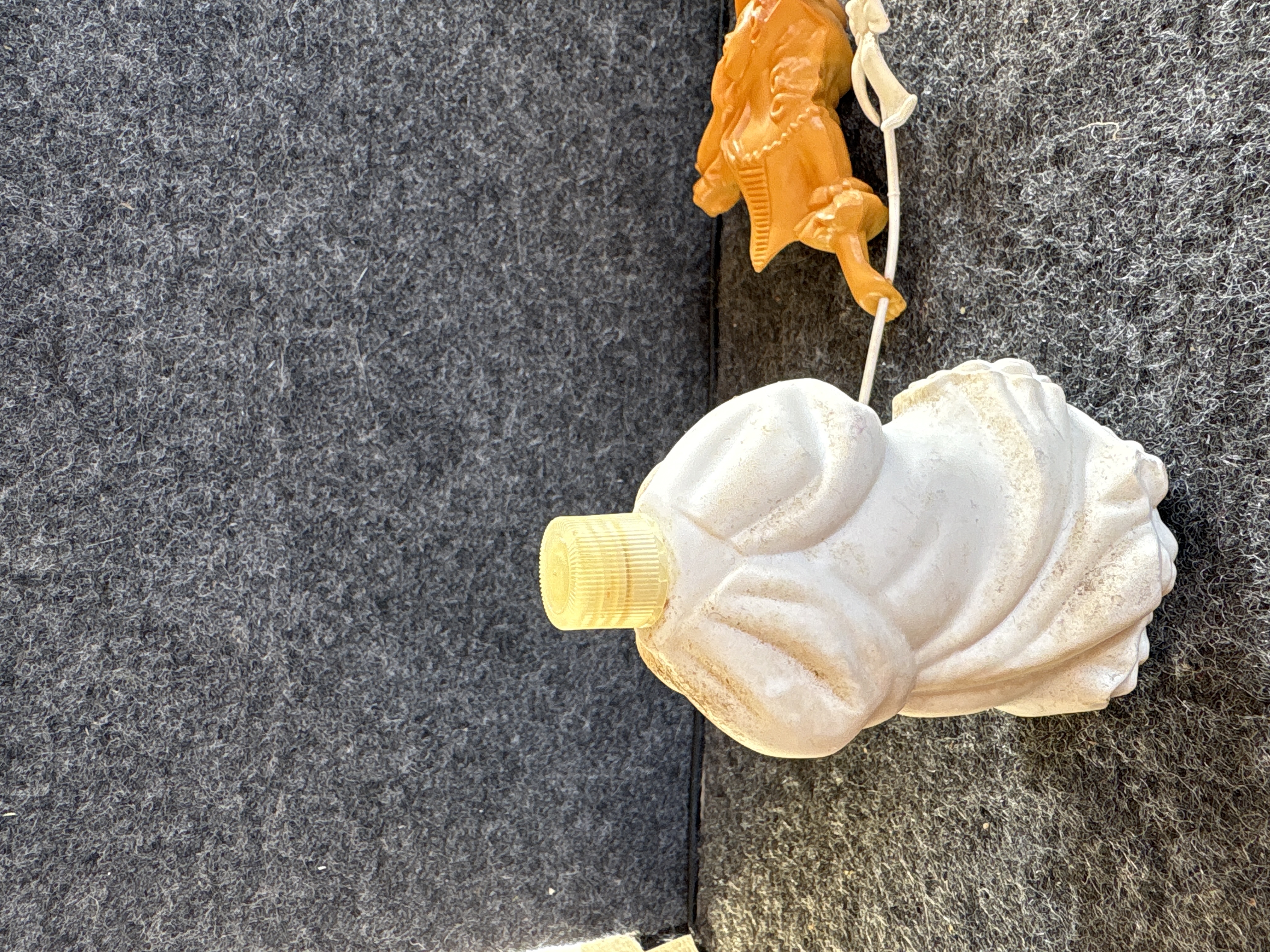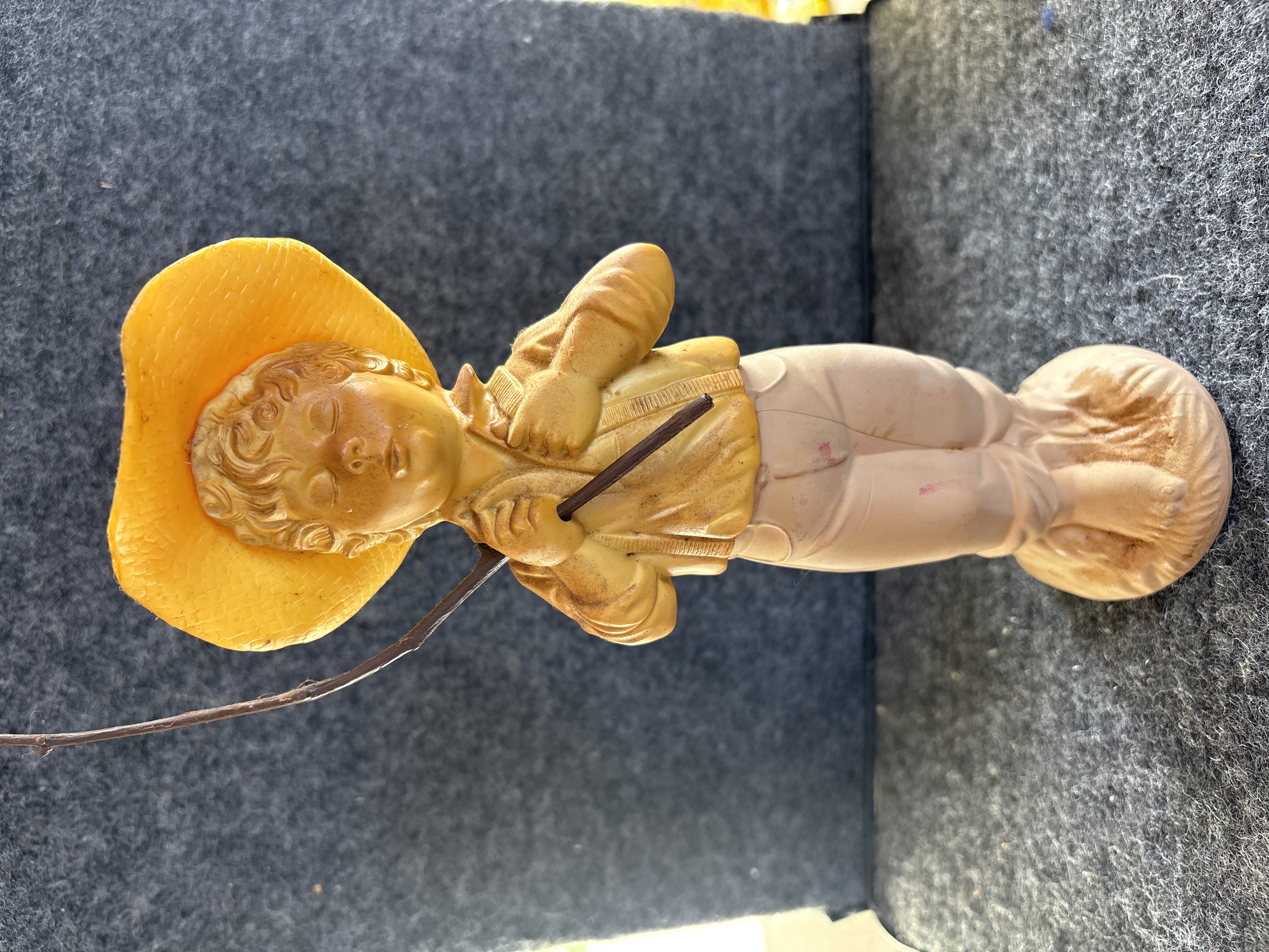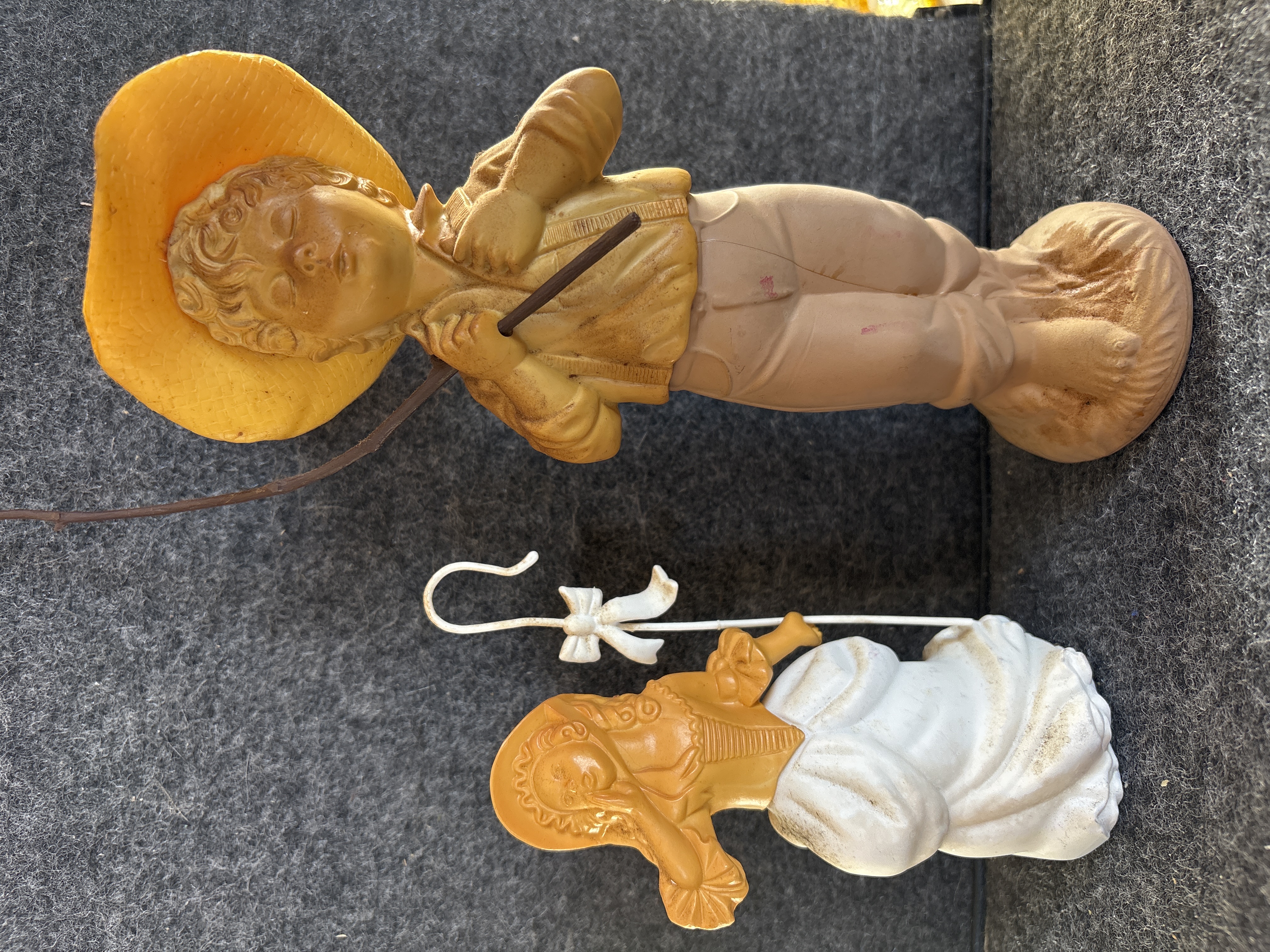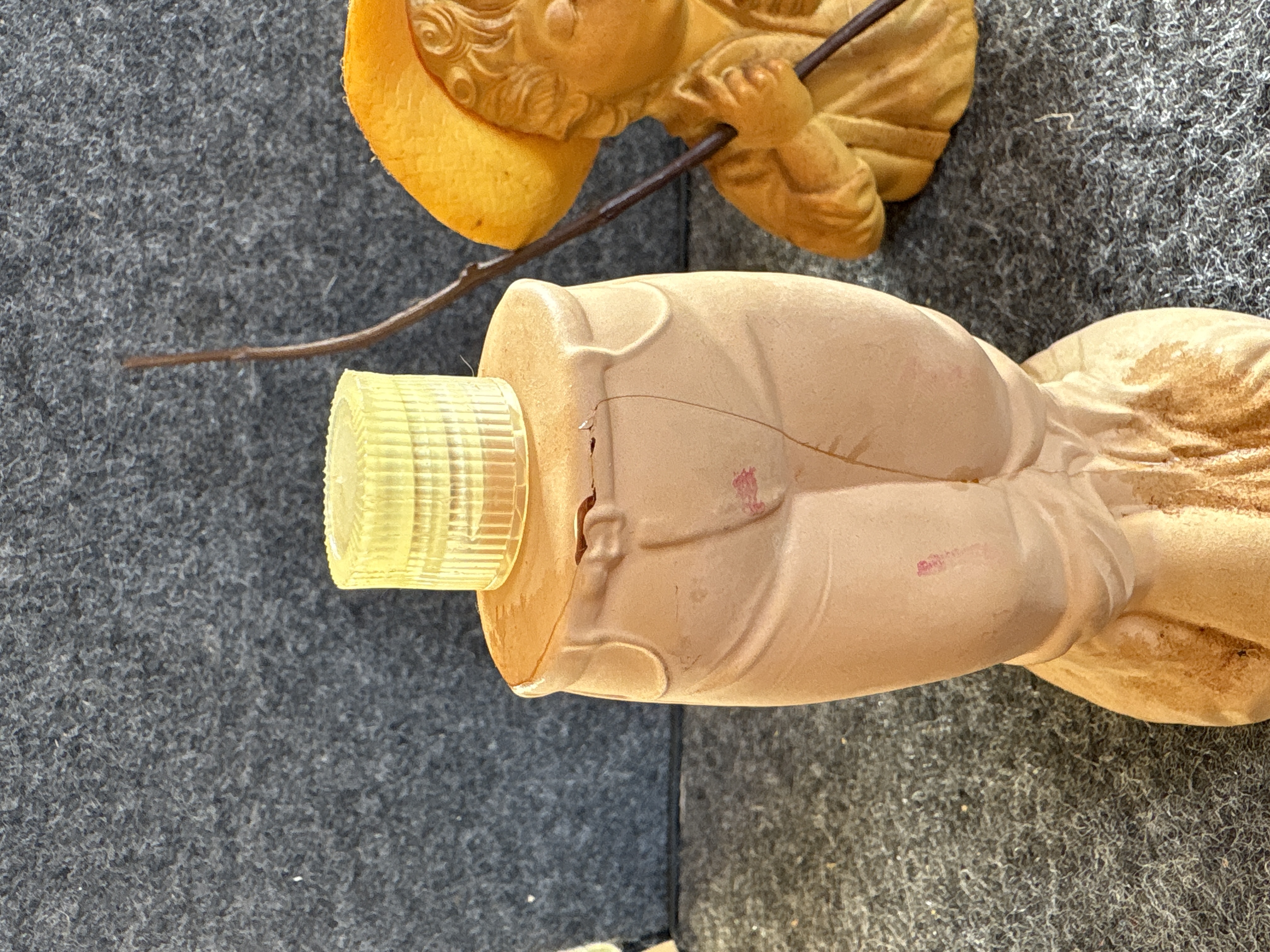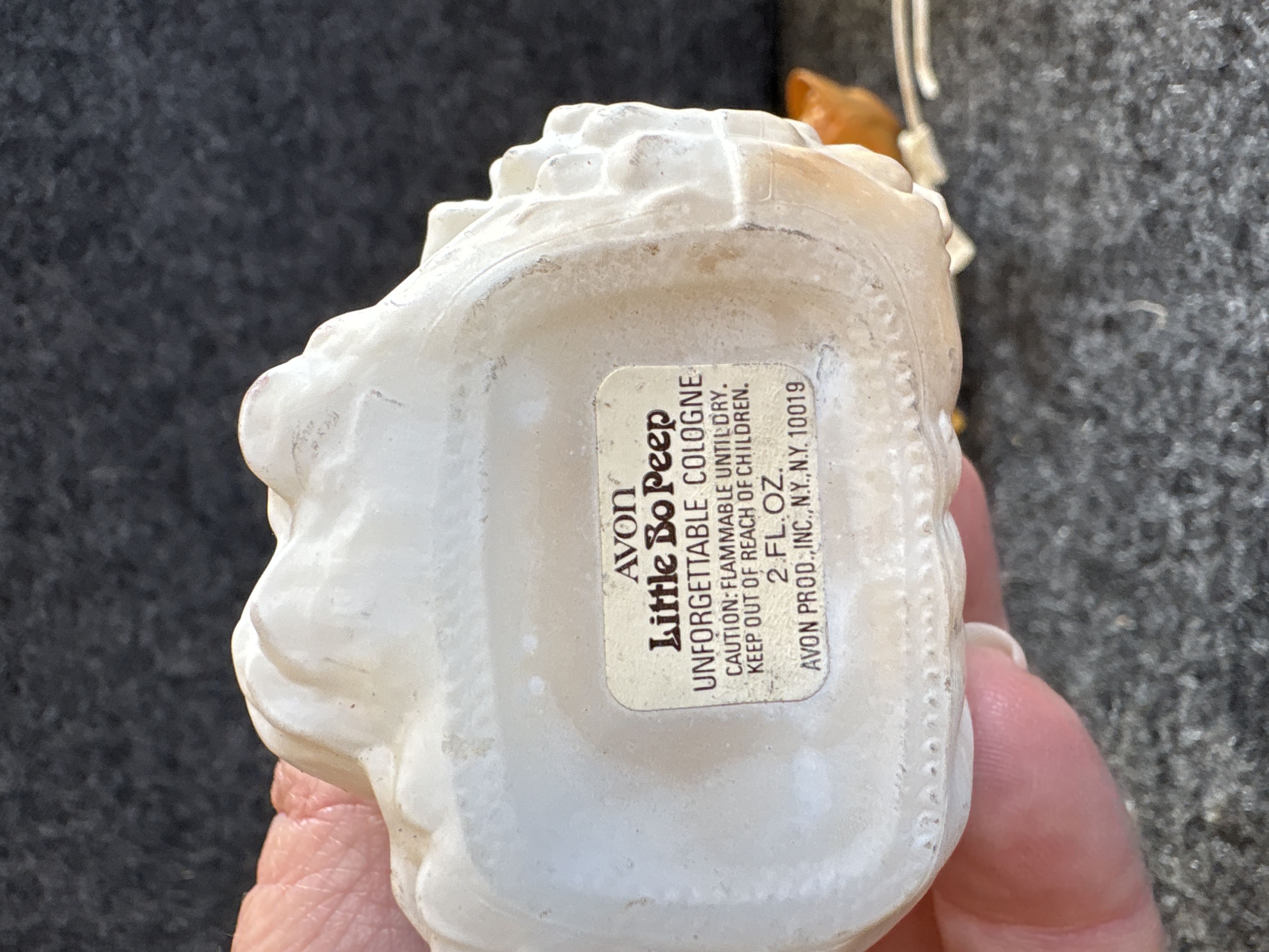 This lot consists of two vintage character-themed cologne bottles produced by Avon Products, Inc. The first bottle, identified as Catch A Fish, is a molded plastic figurine of a boy wearing a wide-brimmed hat, suspenders, and trousers, holding a thin twig as a fishing pole. The figurine is designed as a two-piece vessel where the upper torso acts as the removable cap. The base retains a partial paper label with the Avon Products, Inc. name and New York, N.Y. 10019 address. The second bottle depicts the nursery rhyme character Little Bo Peep. She is modeled in a seated pose wearing a wide-brimmed hat and a full white skirt, holding a white plastic shepherd’s crook adorned with a bow. This is also a two-piece bottle with the upper body serving as the cap. The base features a complete paper label identifying the contents as Unforgettable Cologne, 2 Fl. Oz., by Avon Prod., Inc., N.Y., N.Y. 10019.