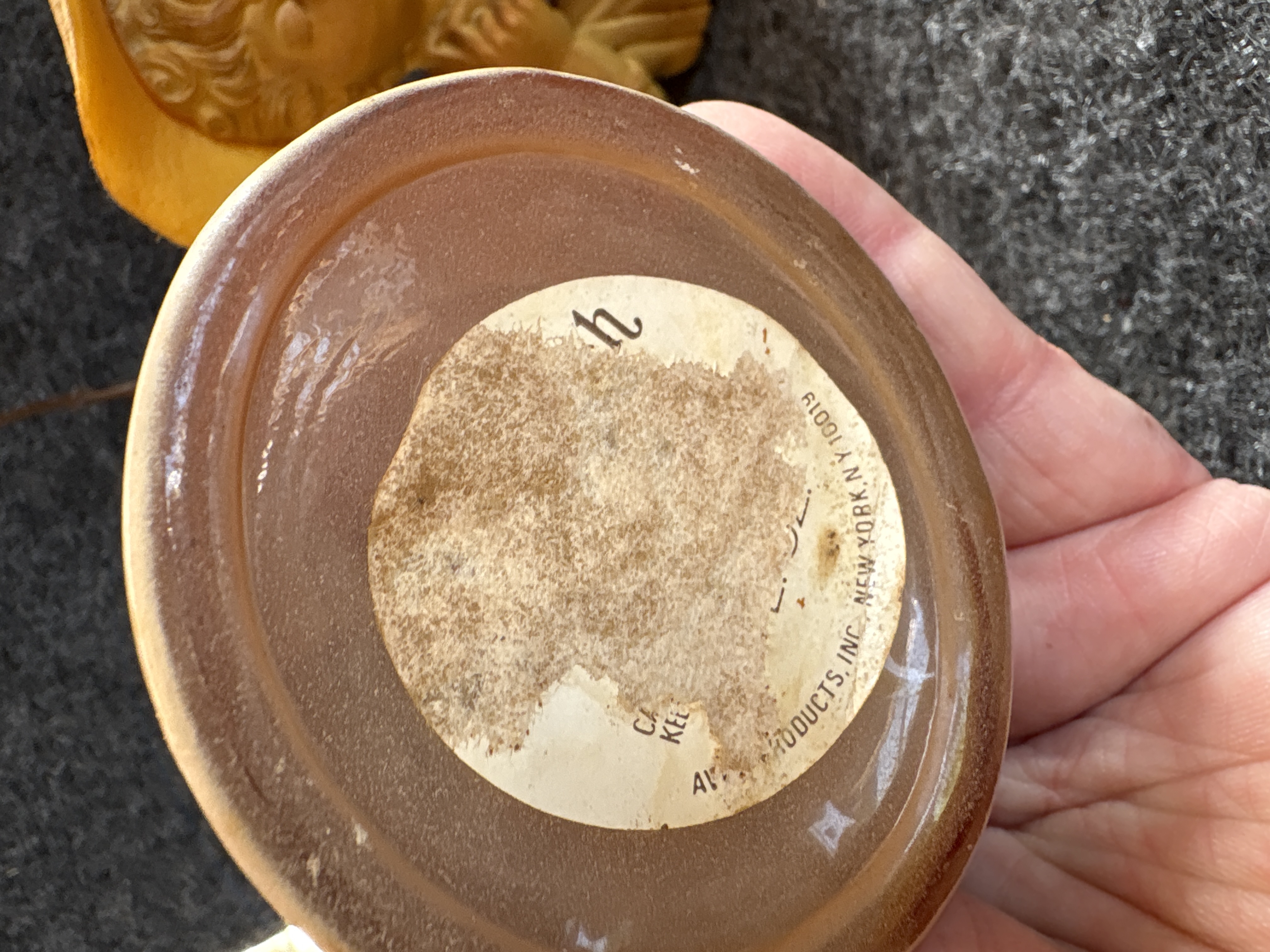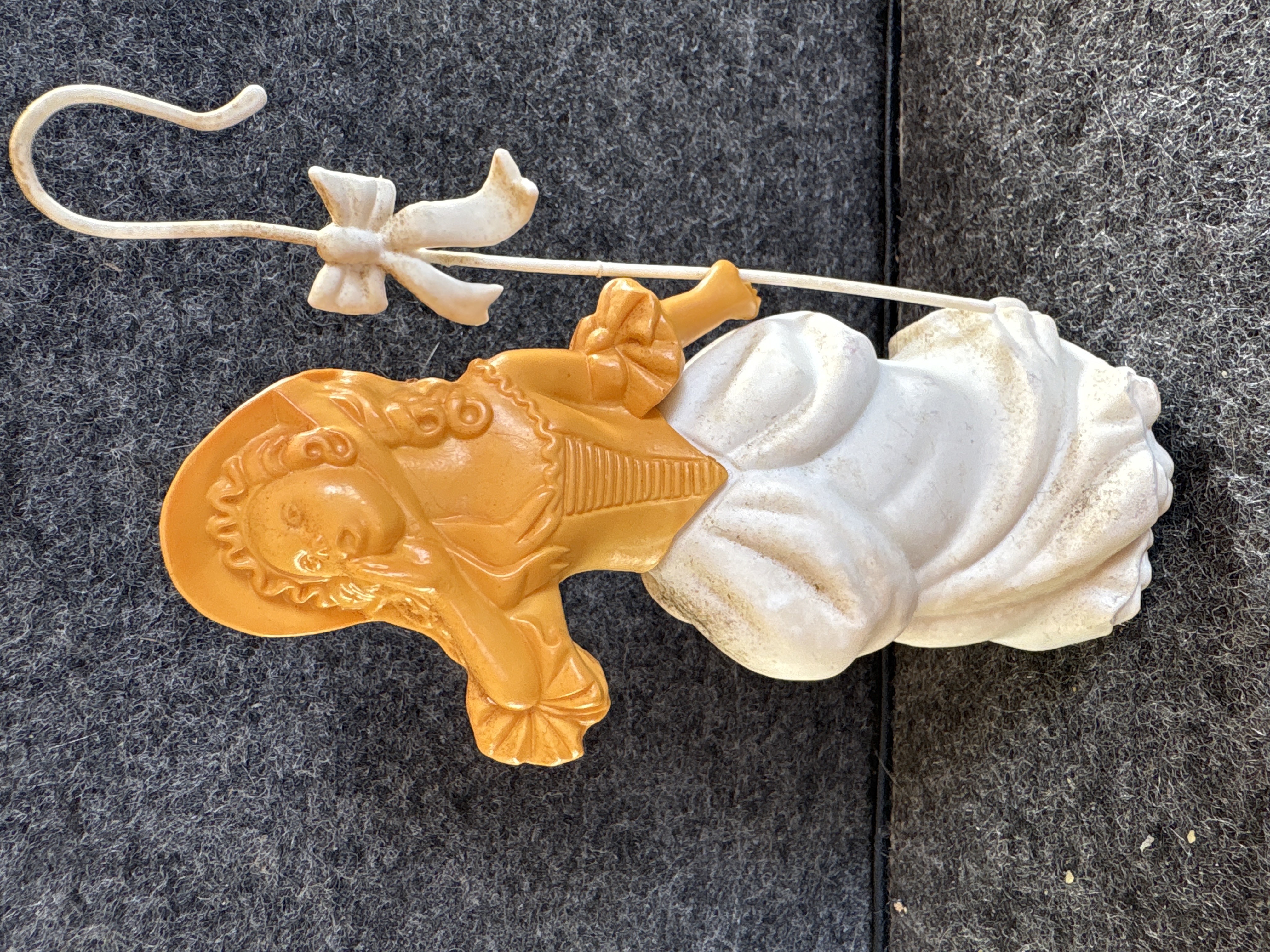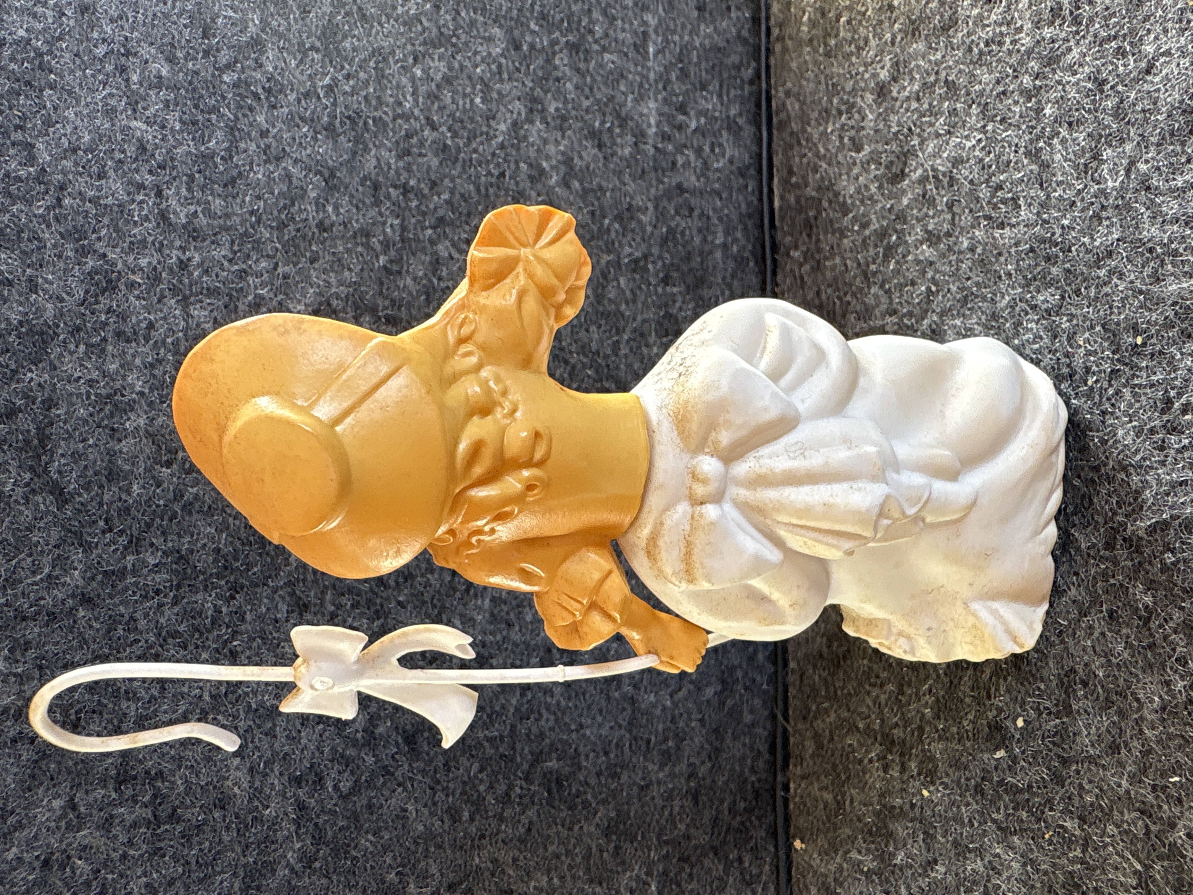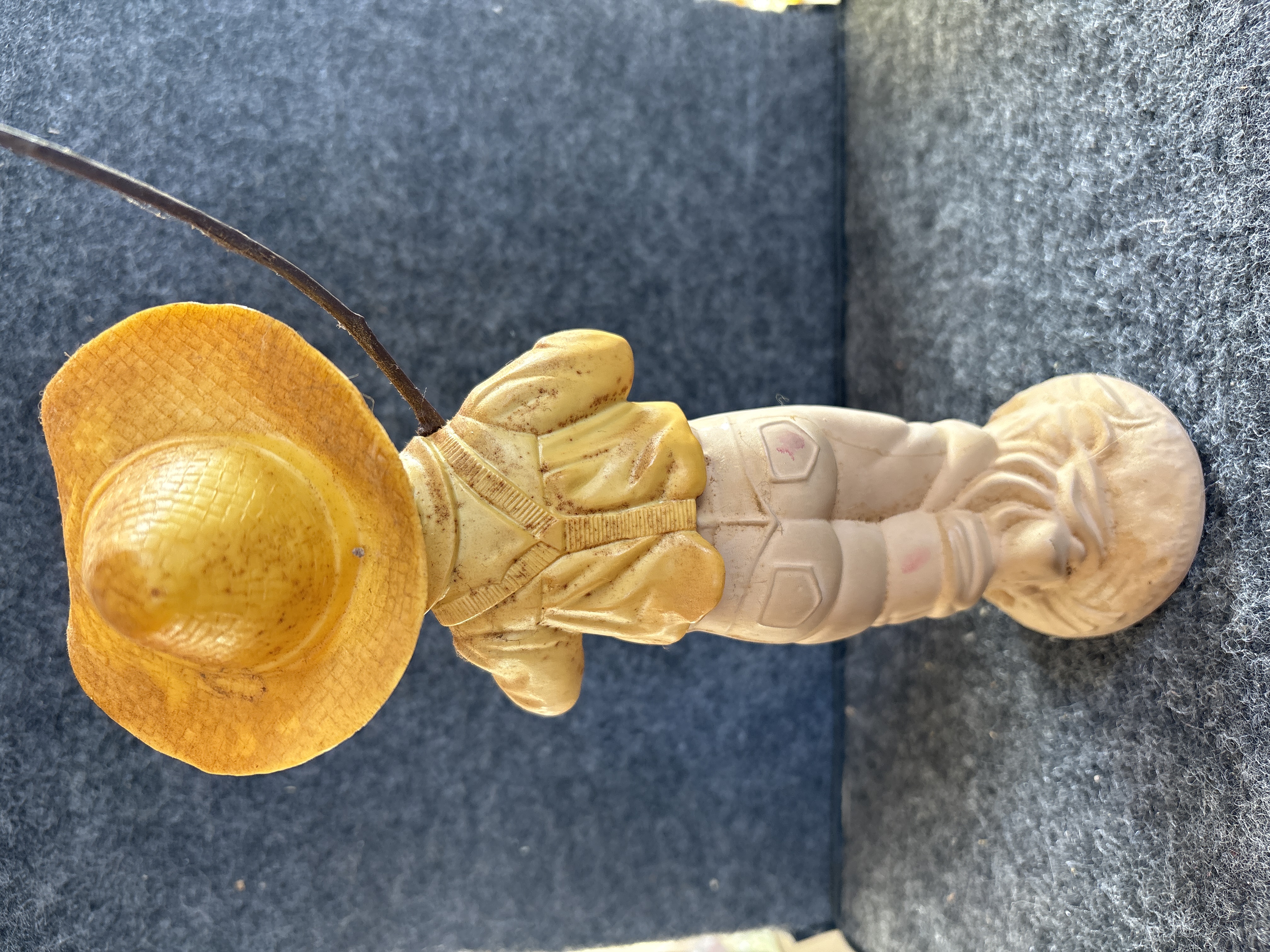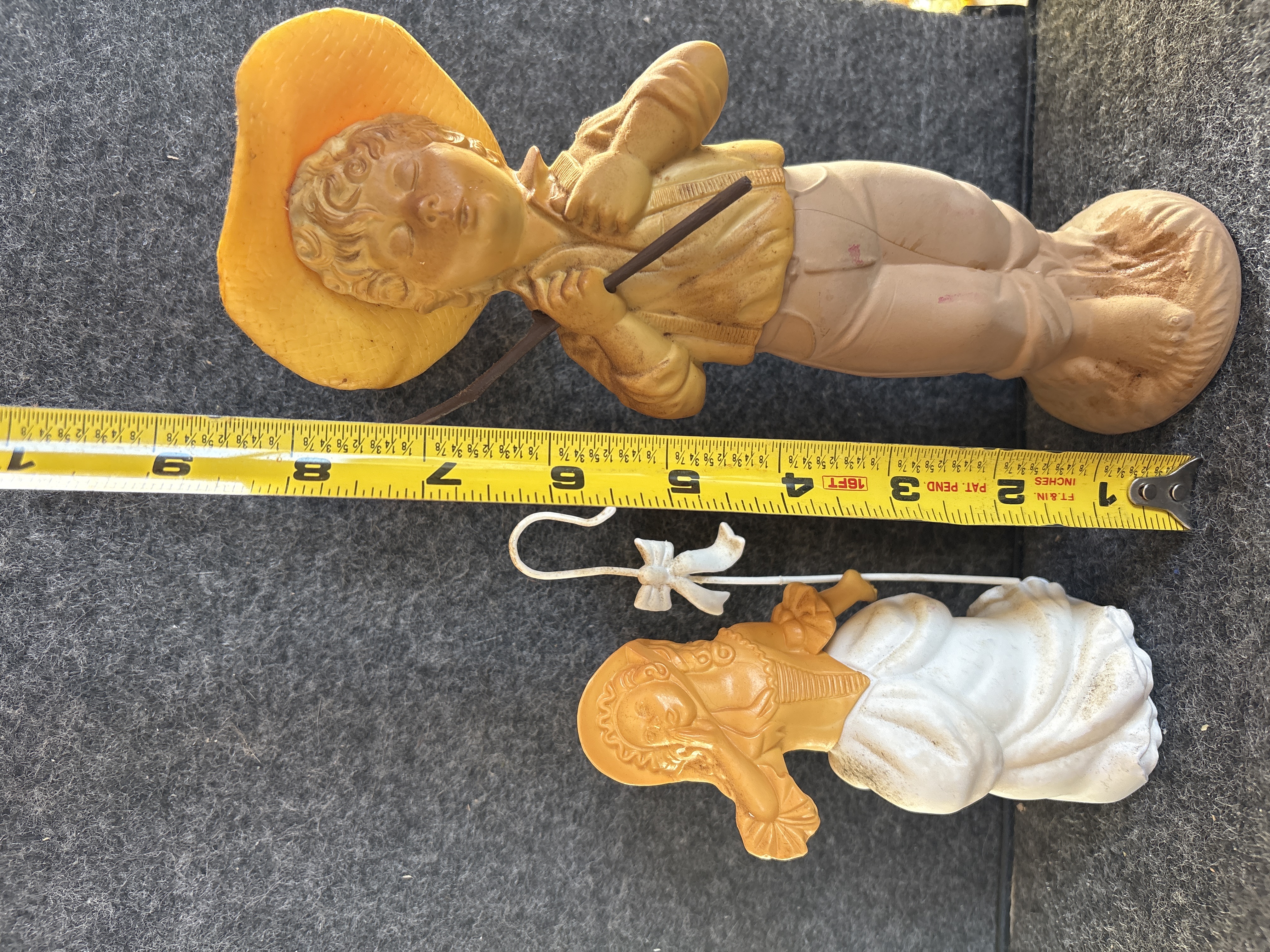 This lot consists of two vintage character-themed cologne bottles produced by Avon Products, Inc. The first bottle, identified as Catch A Fish, is a molded plastic figurine of a boy wearing a wide-brimmed hat, suspenders, and trousers, holding a thin twig as a fishing pole. The figurine is designed as a two-piece vessel where the upper torso acts as the removable cap. The base retains a partial paper label with the Avon Products, Inc. name and New York, N.Y. 10019 address. The second bottle depicts the nursery rhyme character Little Bo Peep. She is modeled in a seated pose wearing a wide-brimmed hat and a full white skirt, holding a white plastic shepherd’s crook adorned with a bow. This is also a two-piece bottle with the upper body serving as the cap. The base features a complete paper label identifying the contents as Unforgettable Cologne, 2 Fl. Oz., by Avon Prod., Inc., N.Y., N.Y. 10019.