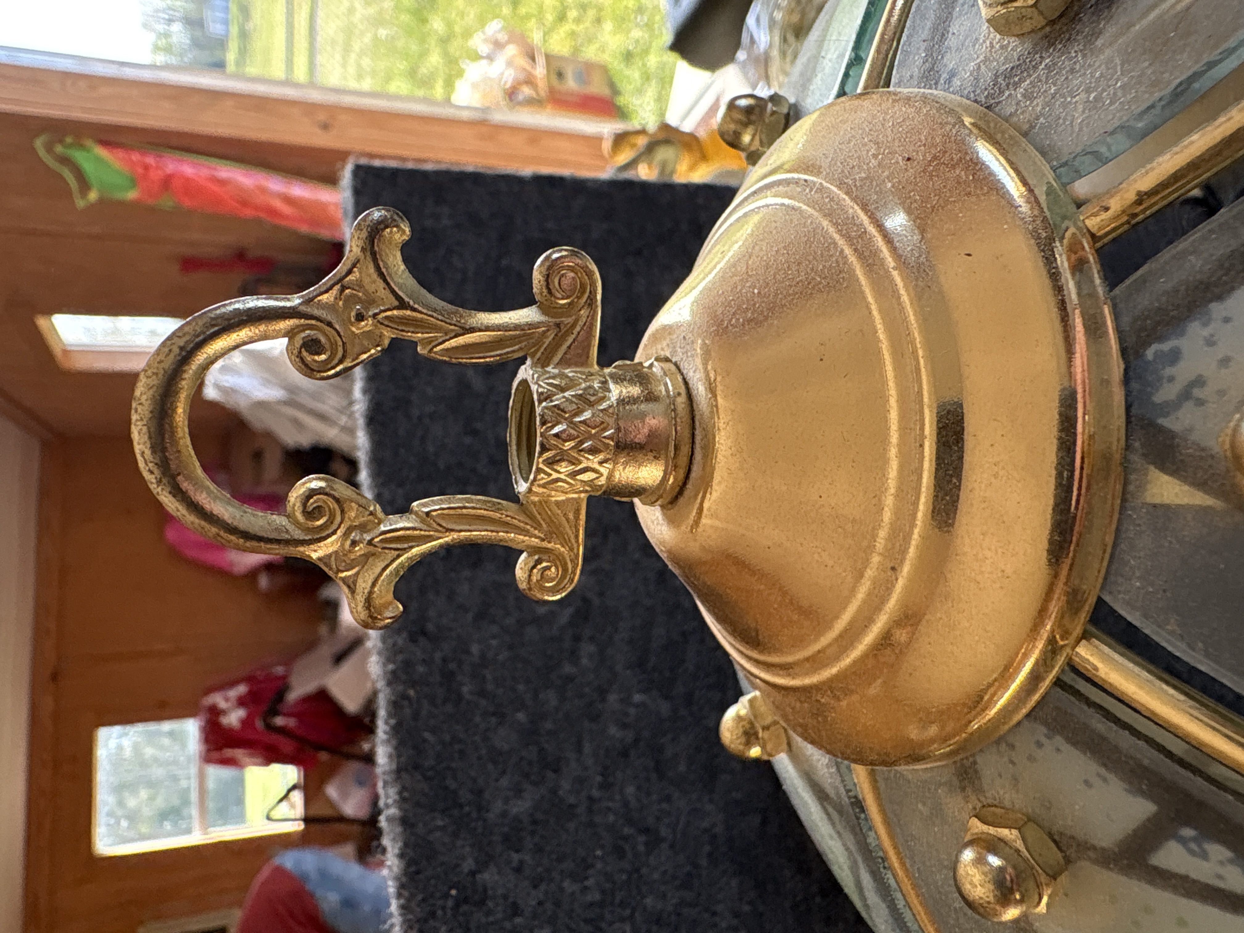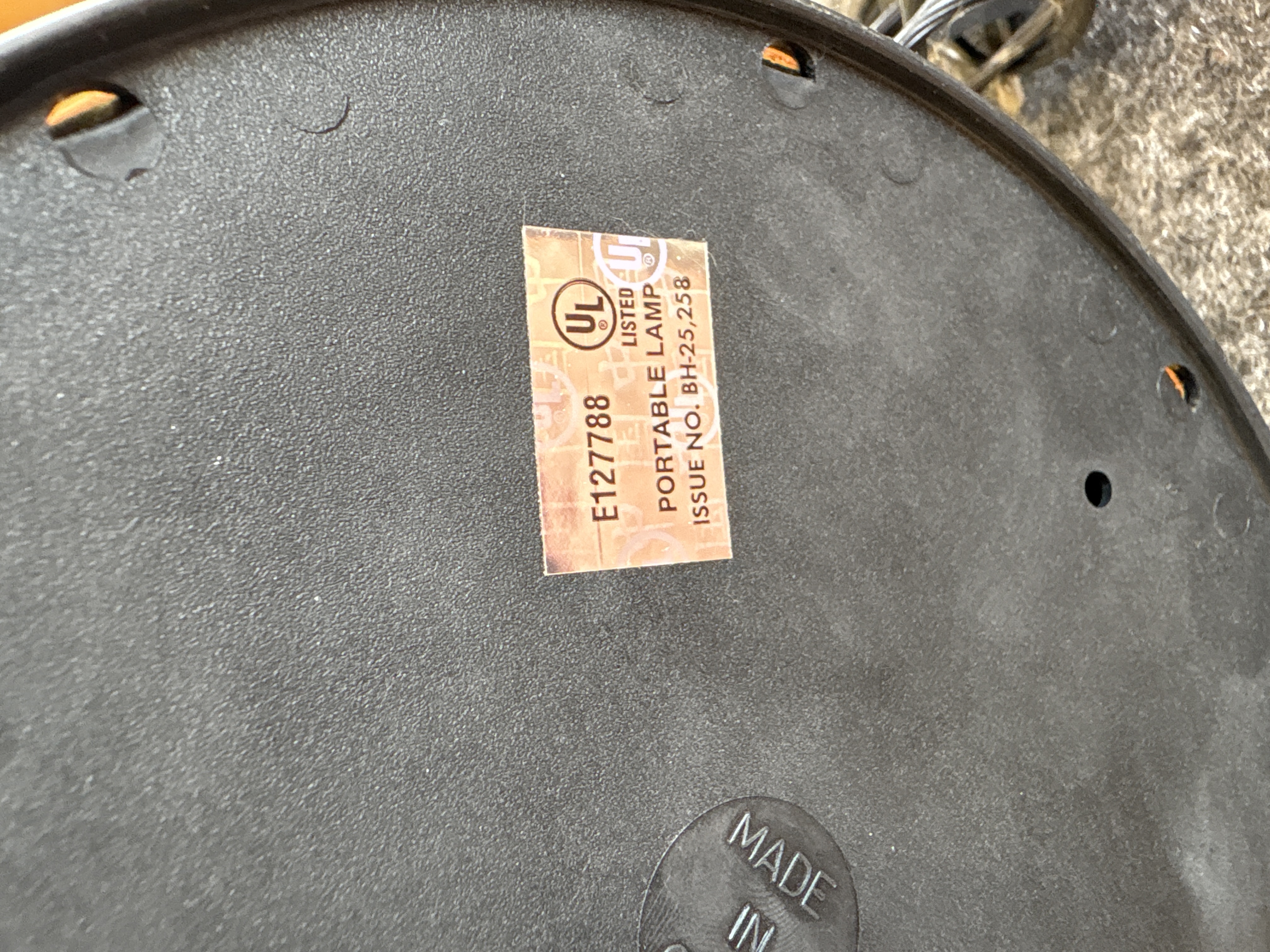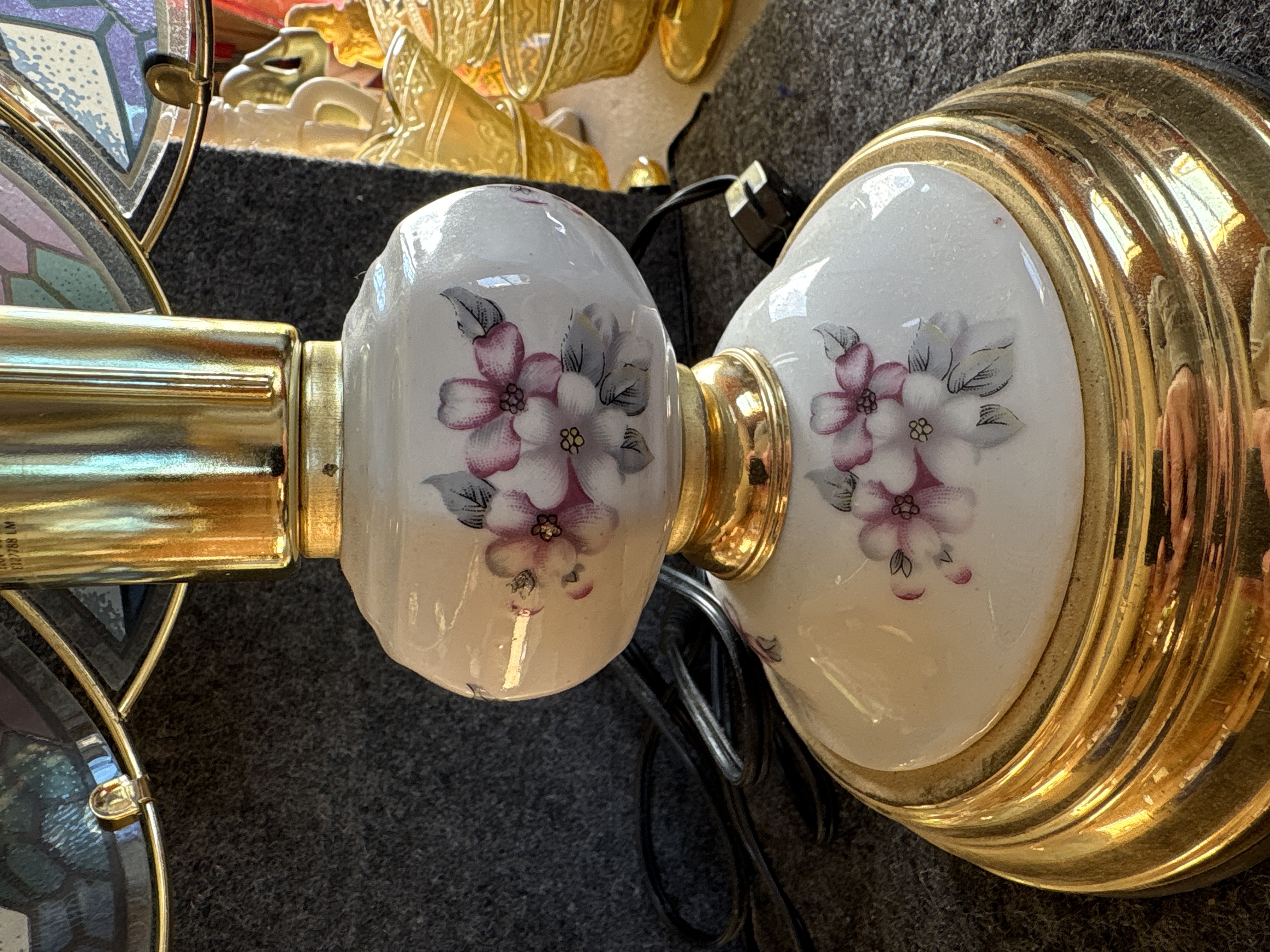 This multi-light table lamp is designed in the late 20th-century touch lamp style. The piece features a six-panel glass shade, with each curved panel displaying a screen-printed geometric pattern in shades of blue, green, and lavender intended to simulate the appearance of stained glass. The panels are secured within a polished brass-tone metal frame with decorative clips. The lamp body consists of two white ceramic sections decorated with pink and lavender floral transfers, separated by brass-tone metal spacers. The base is constructed of polished brass-tone metal over a plastic base plate. A gold foil Underwriters Laboratories sticker on the underside identifies the item as a portable lamp, issue number BH-25,258, with file number E127788. The base plate is molded with the text MADE IN TAIWAN, and the metal socket housing is stamped E127788 LM. The lamp is equipped with a black power cord, a standard two-prong plug, and an in-line rotary switch.
