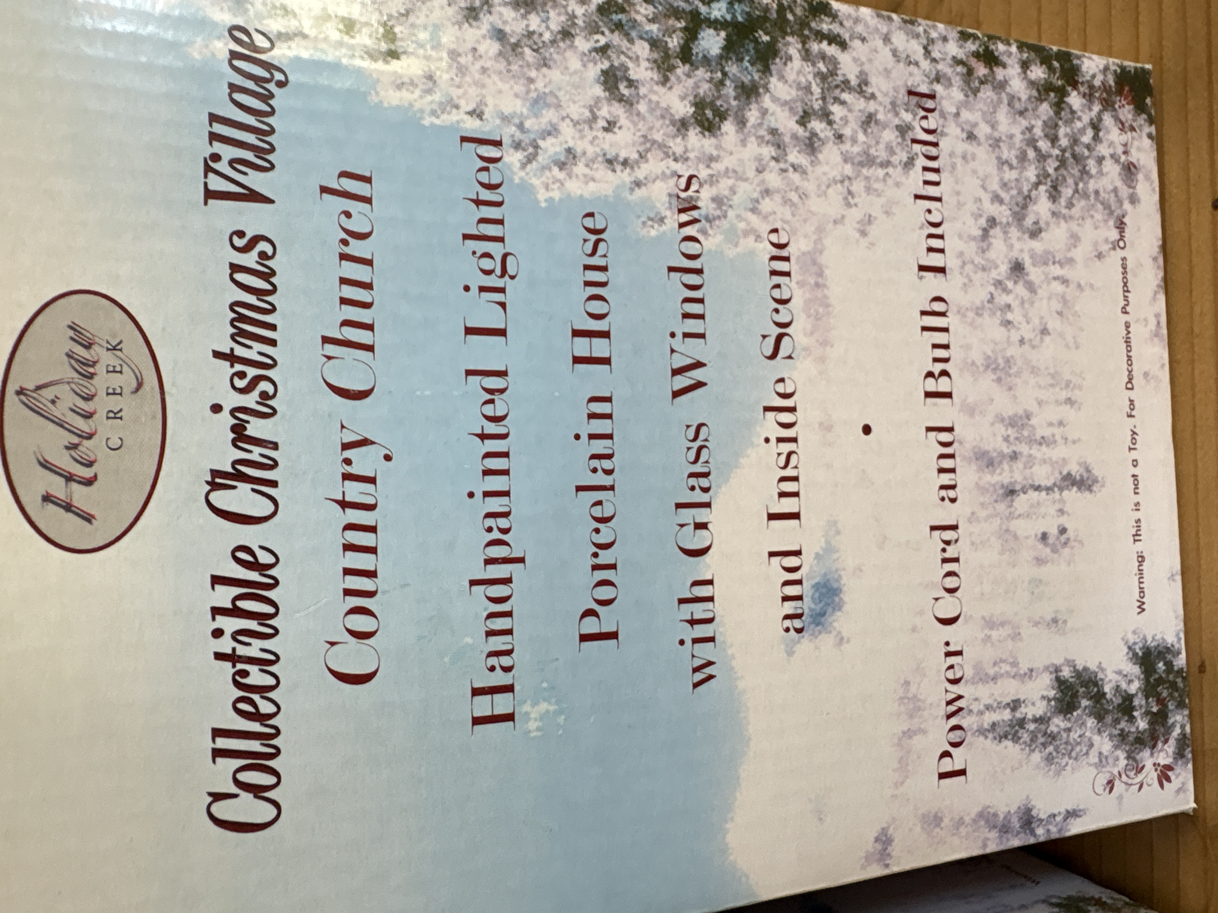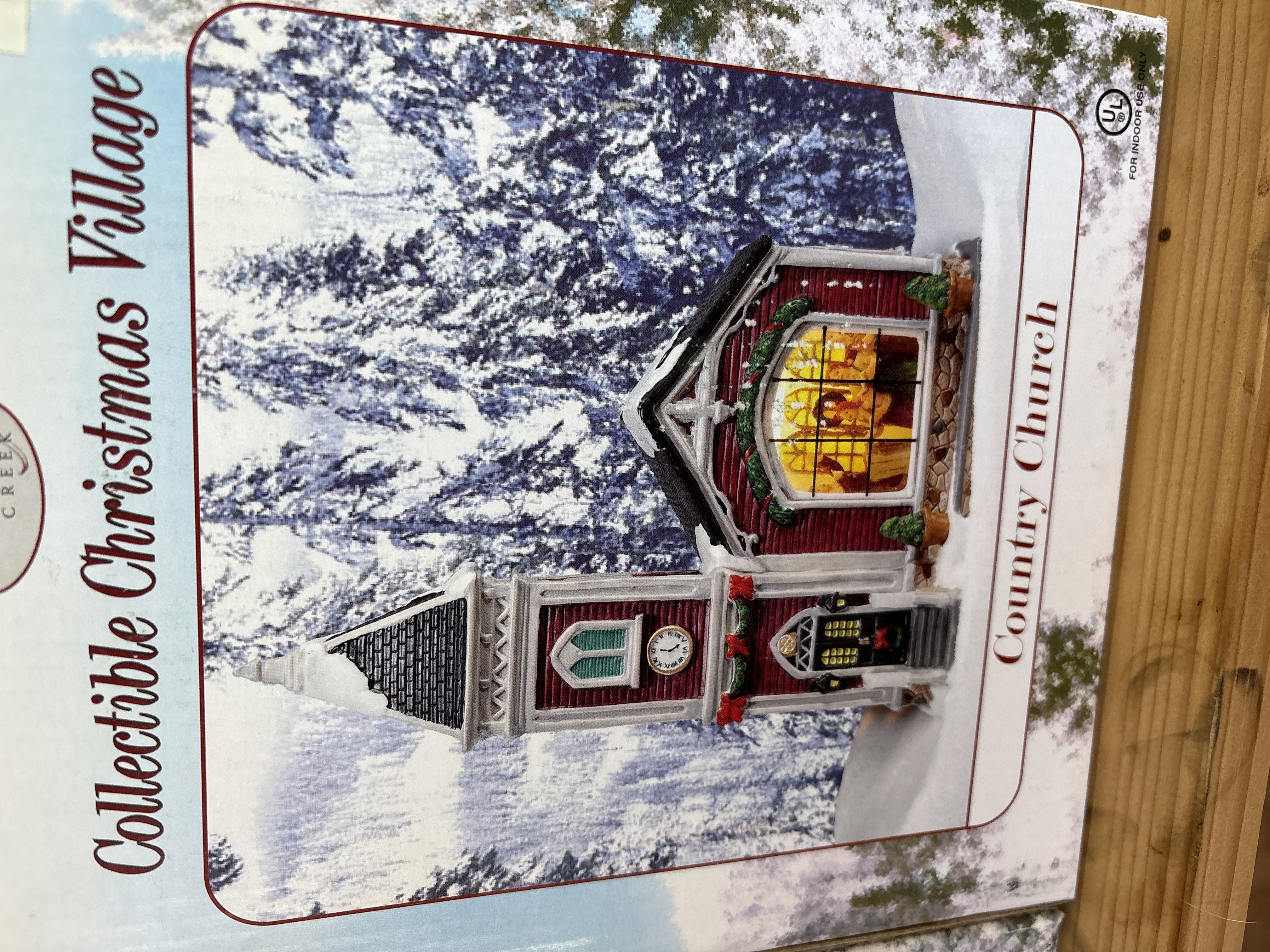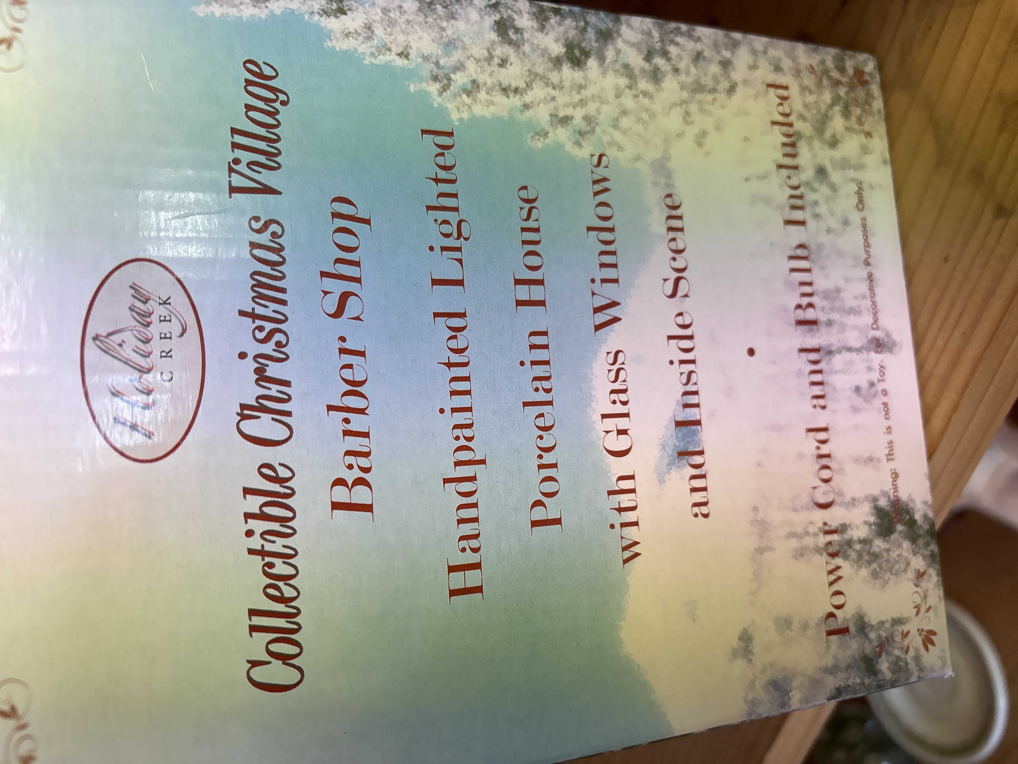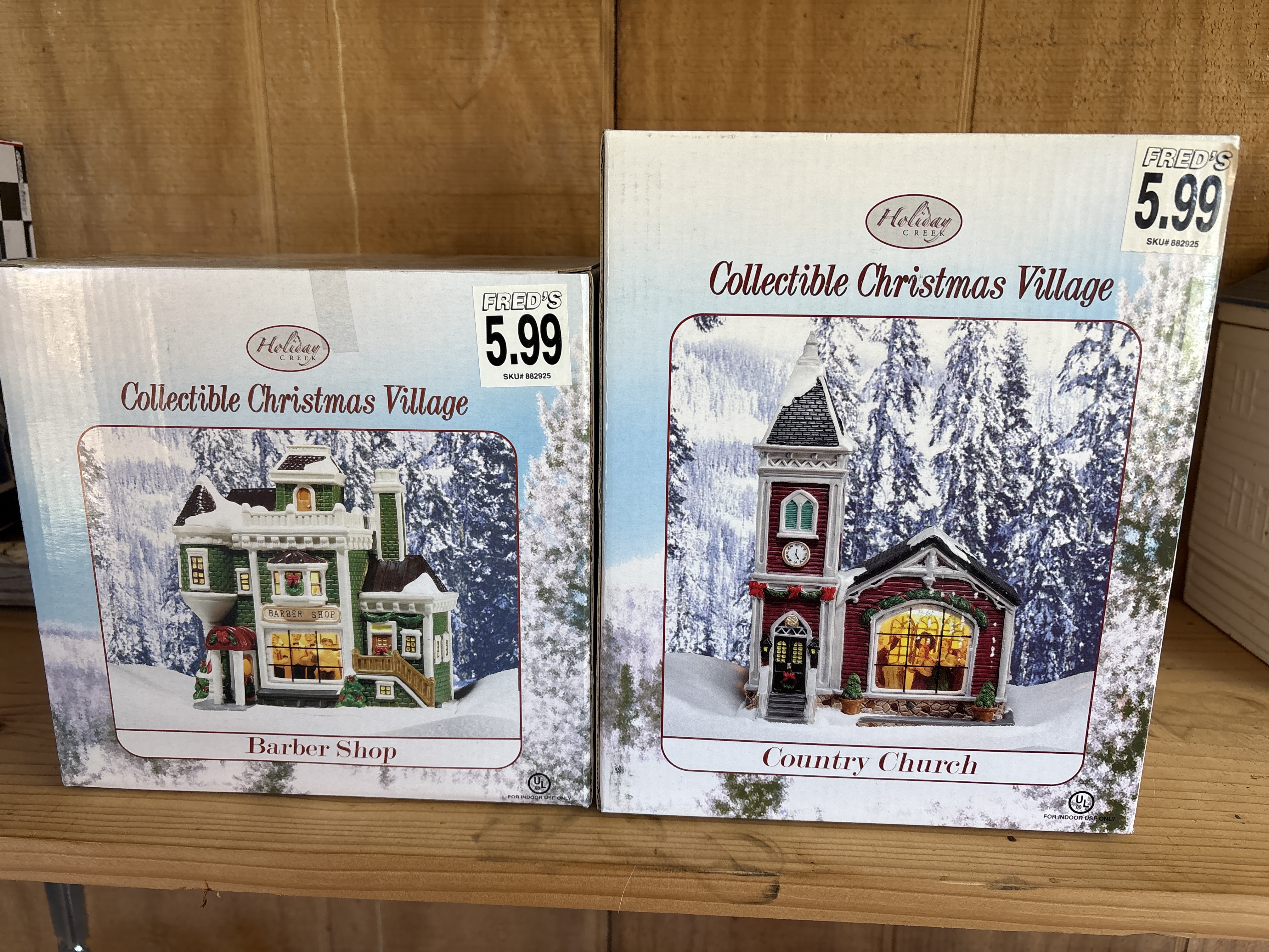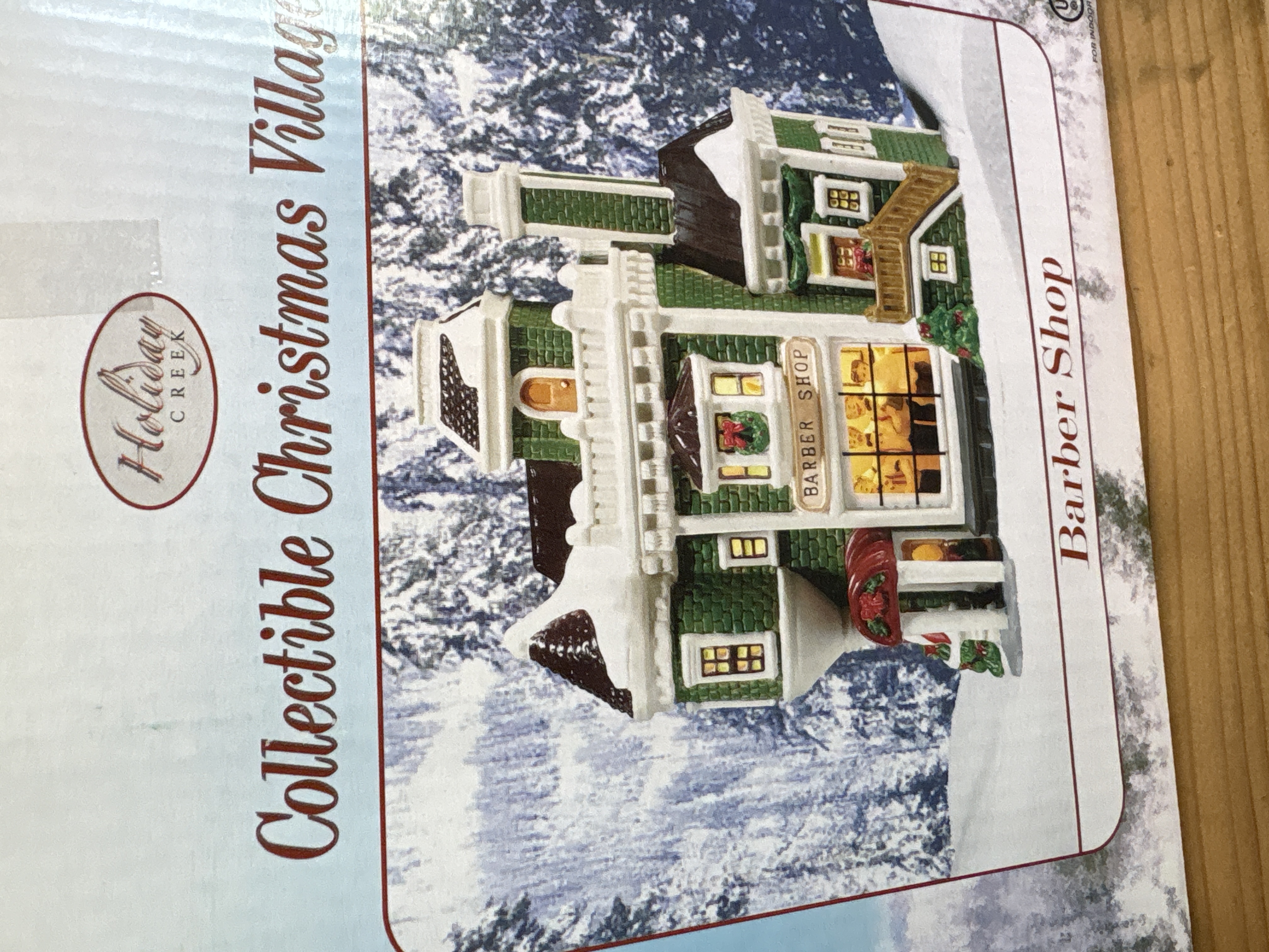This lot features two hand-painted porcelain buildings from the Holiday Creek Collectible Christmas Village series, specifically the Barber Shop and the Country Church. The Barber Shop is a two-story Victorian-style building with a green exterior, white architectural trim, and a small balcony. The ground floor features a storefront window depicting an interior scene and a sign labeled Barber Shop. The Country Church features red wood-style siding, a tall white bell tower with a clock, and a steepled roof. It is decorated with festive garlands and wreaths with red bows. Both structures are constructed from hand-painted porcelain with glass windows and include interior scenes. Each building is designed to be lighted and includes a power cord and bulb. The packaging displays the Holiday Creek logo and retail stickers from Freds with SKU 882925.