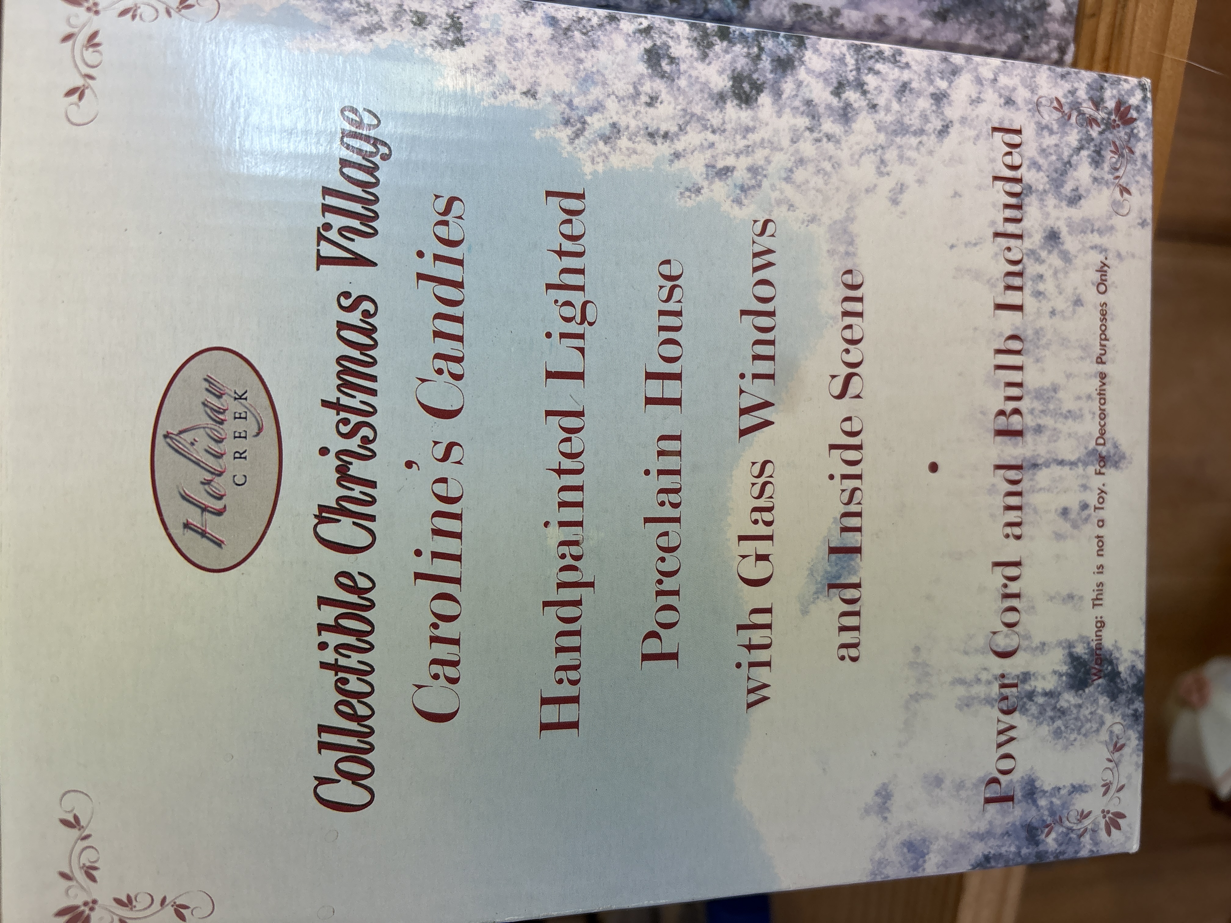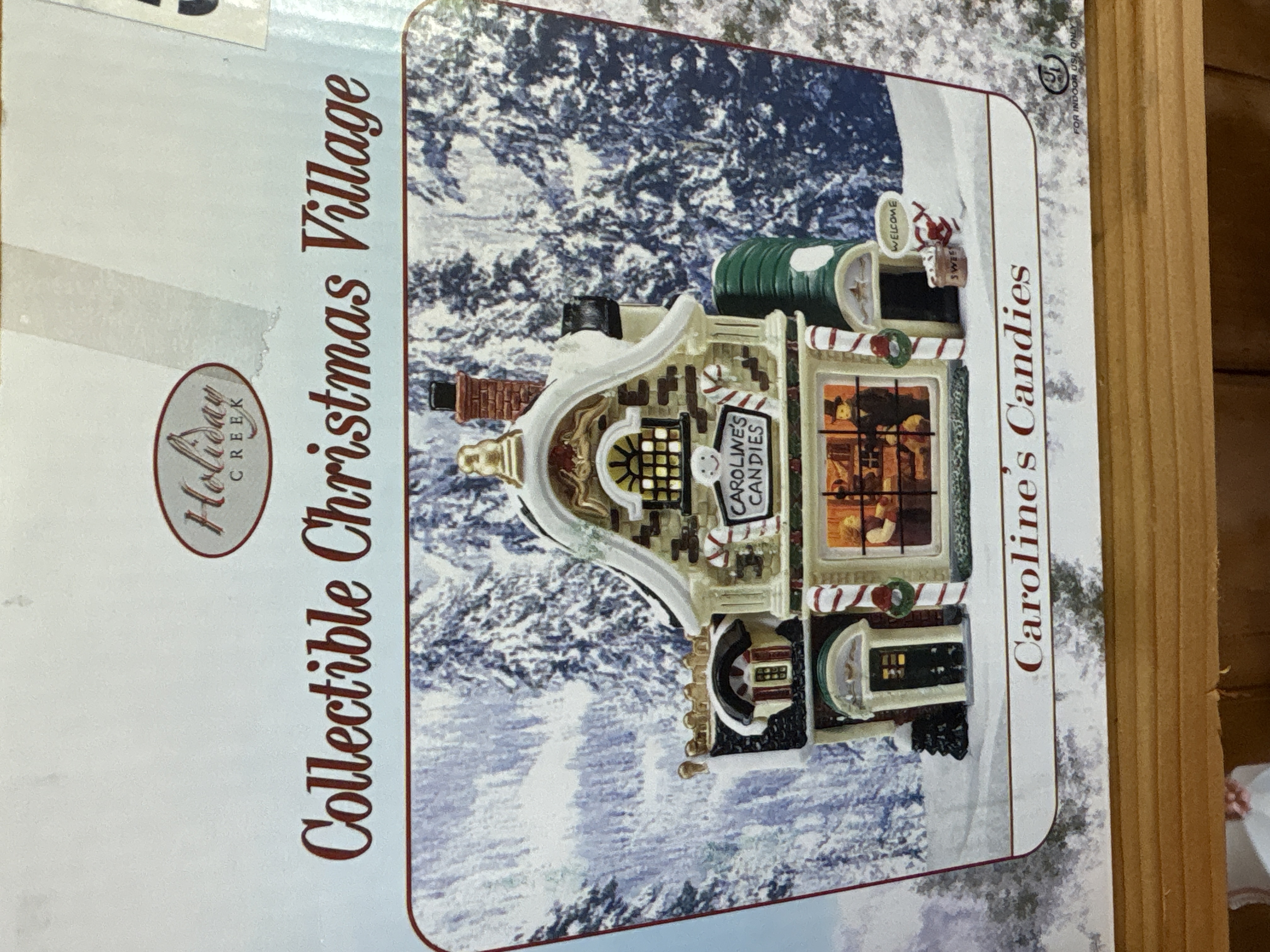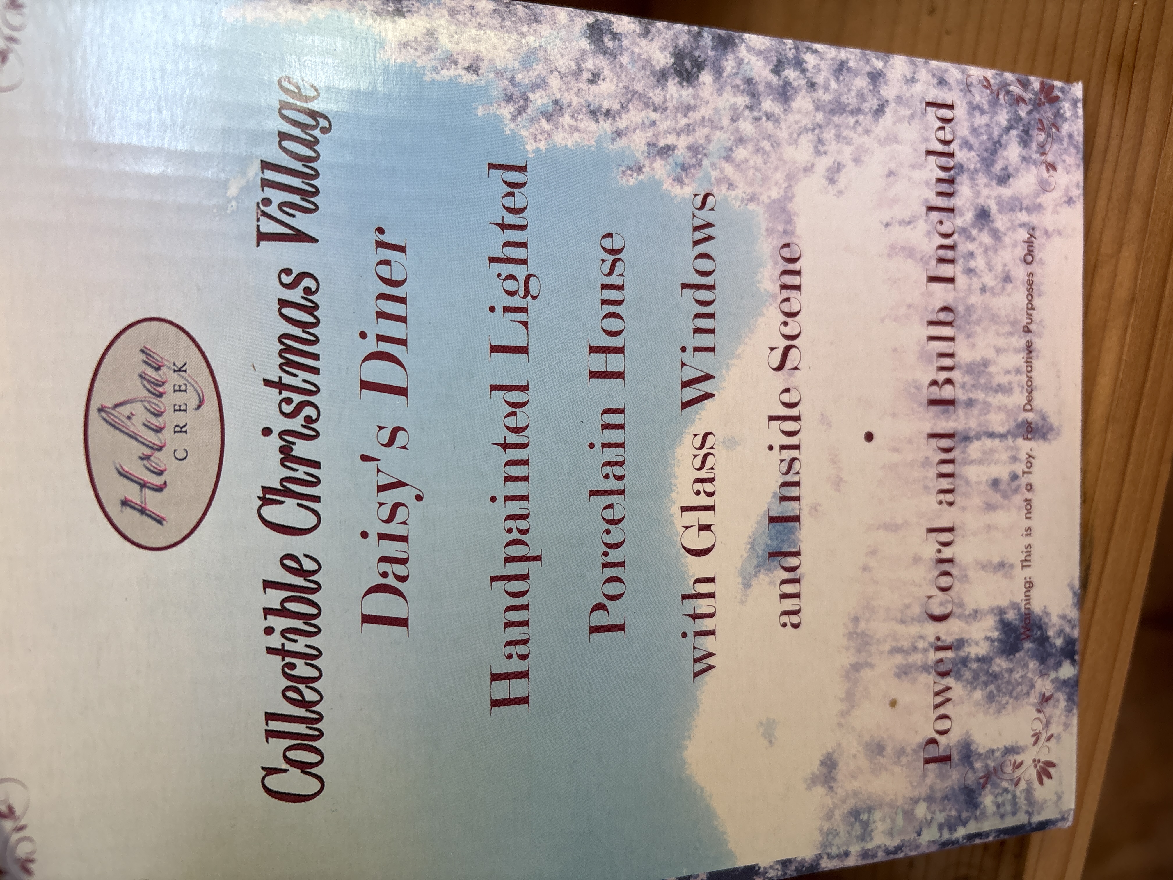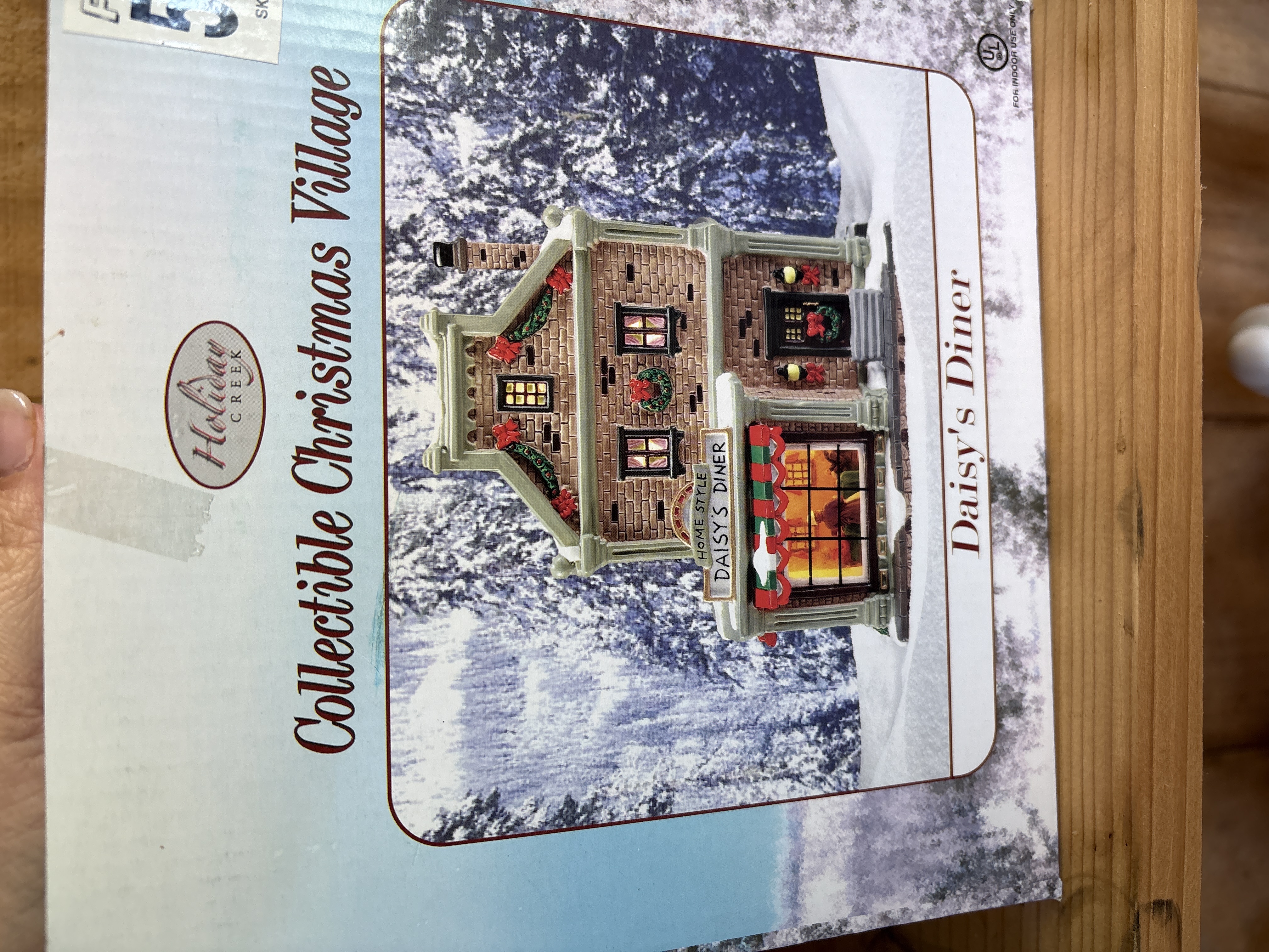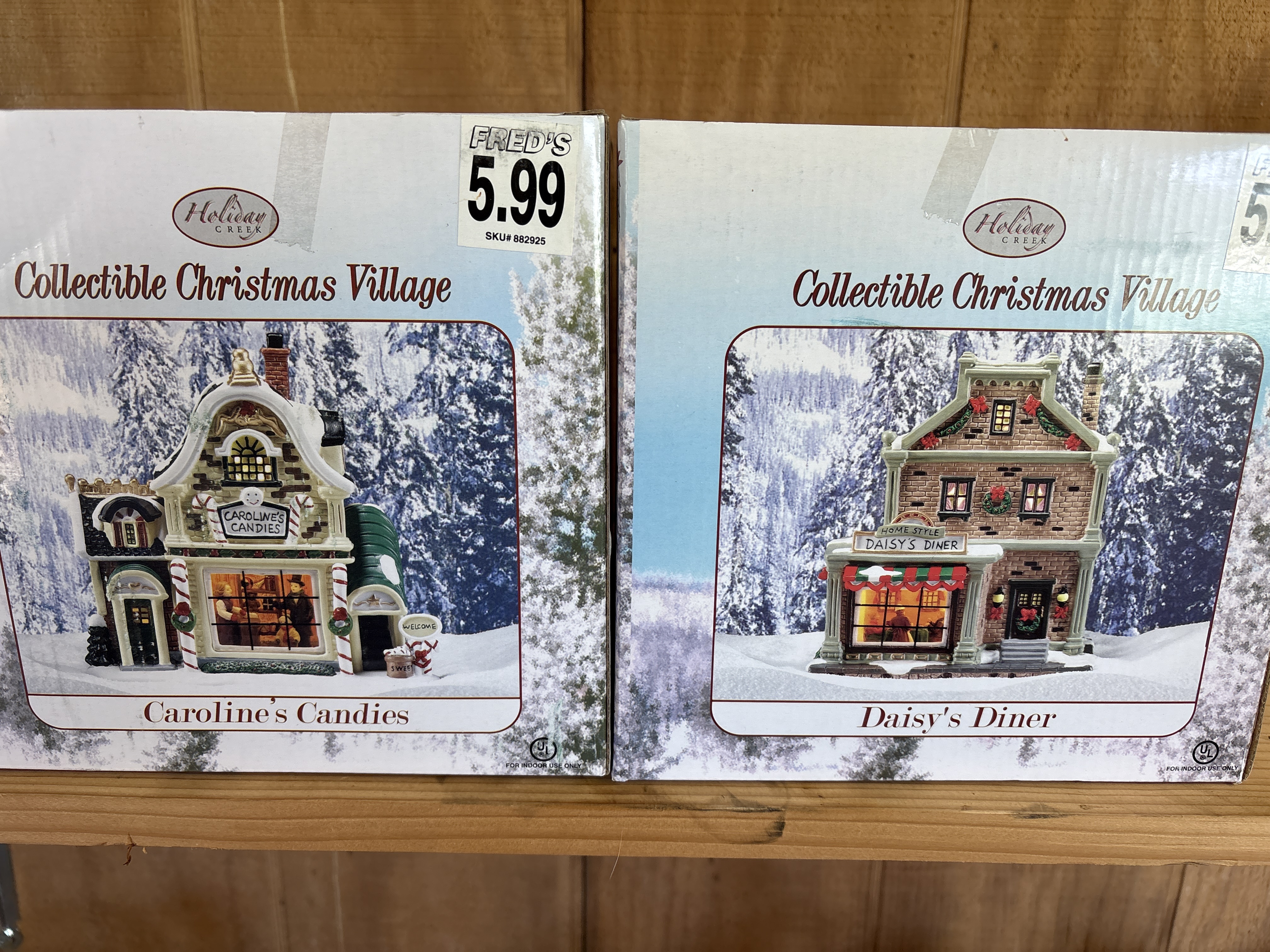 This lot consists of two hand-painted porcelain buildings from the Holiday Creek Collectible Christmas Village series, titled Carolines Candies and Daisys Diner. Carolines Candies features a storefront with candy-cane-striped pillars and a shop scene visible through glass window inserts. Daisys Diner is designed as a brick-style restaurant with a sign reading Home Style Daisys Diner, decorated with wreaths and featuring an illuminated interior dining scene visible through glass windows. Both structures are constructed of hand-painted porcelain with glass window inserts. The items were manufactured for the United States market and bear UL listing marks on the packaging. Each unit includes a power cord and bulb for interior illumination as indicated by the product boxes.