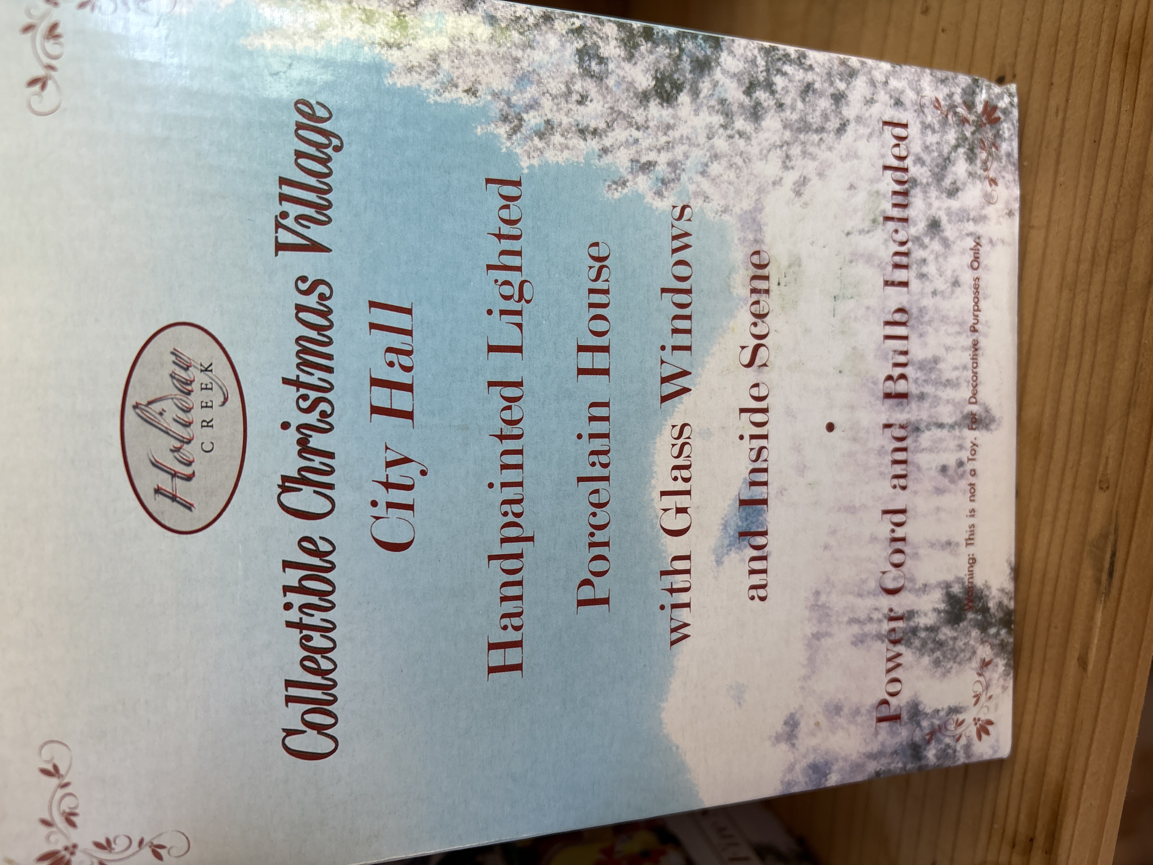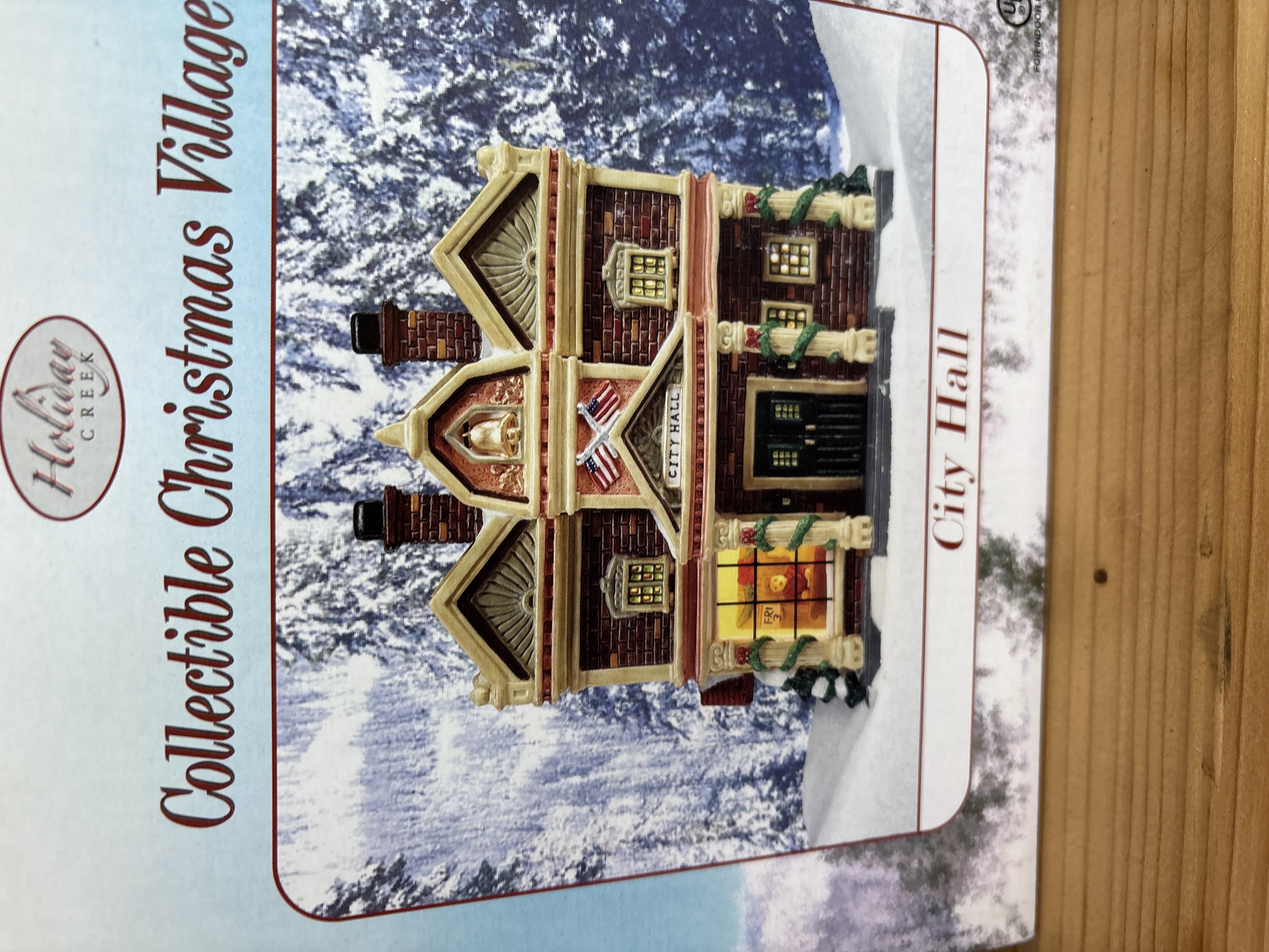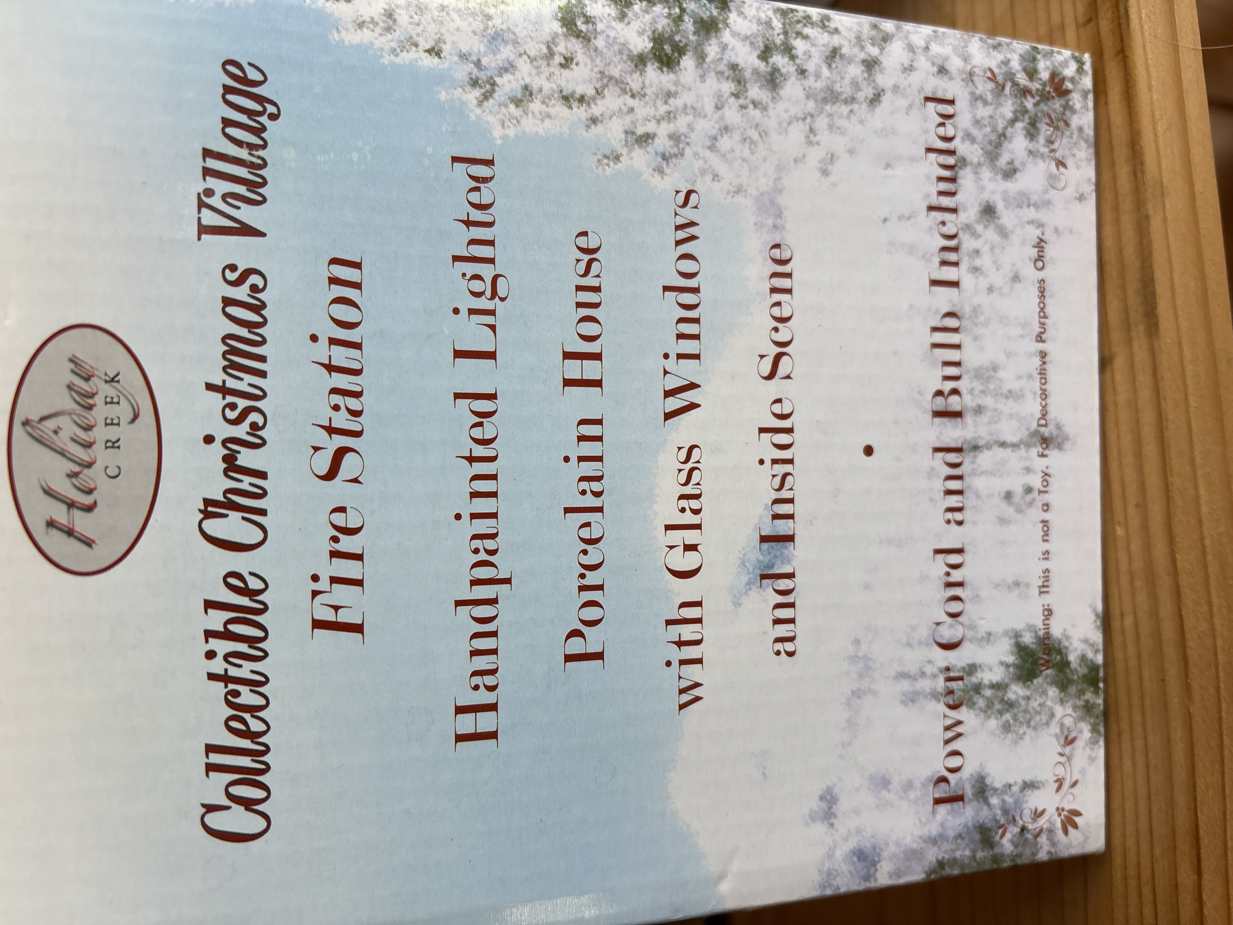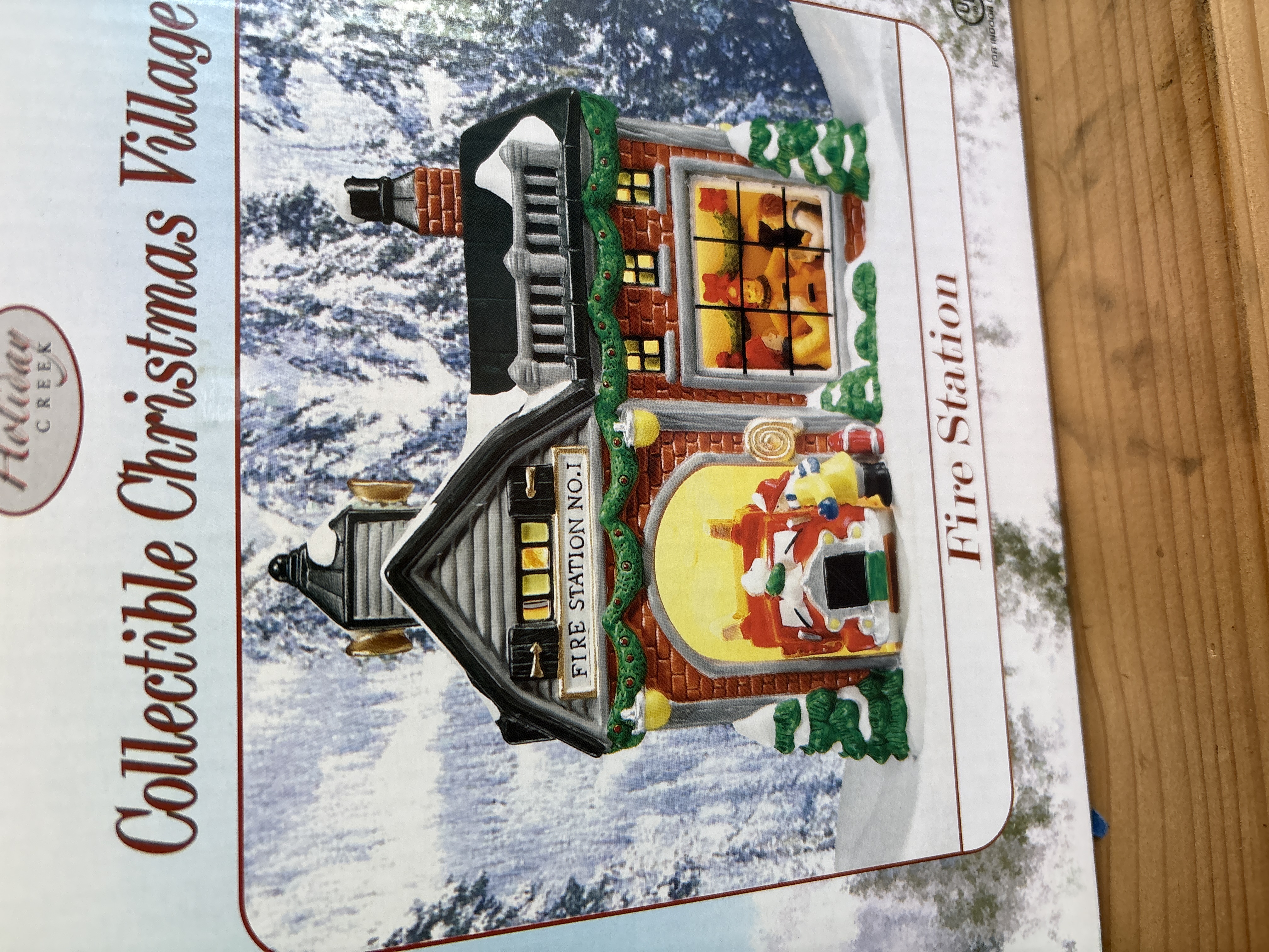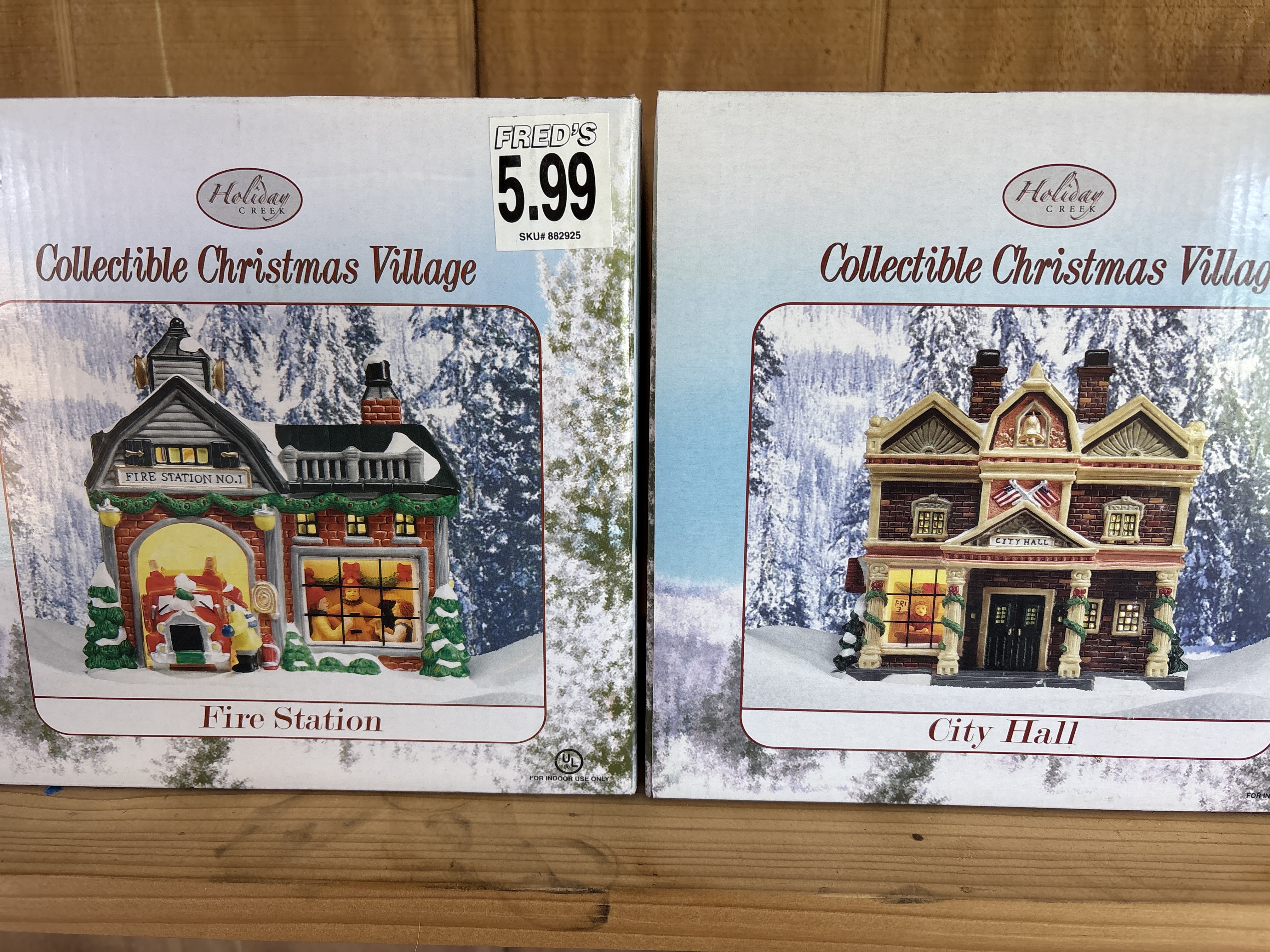 A pair of hand-painted porcelain buildings from the Holiday Creek Collectible Christmas Village series, comprising a Fire Station and a City Hall. Each building is constructed of porcelain with glass windows and features a visible interior scene. The items are designed for illumination and include a power cord and bulb per the manufacturer packaging. The Fire Station features a brick-patterned exterior with Fire Station No. 1 signage, while the City Hall includes a bell tower and American flag motifs. Both items are presented in their original retail boxes bearing the Holiday Creek brand mark.