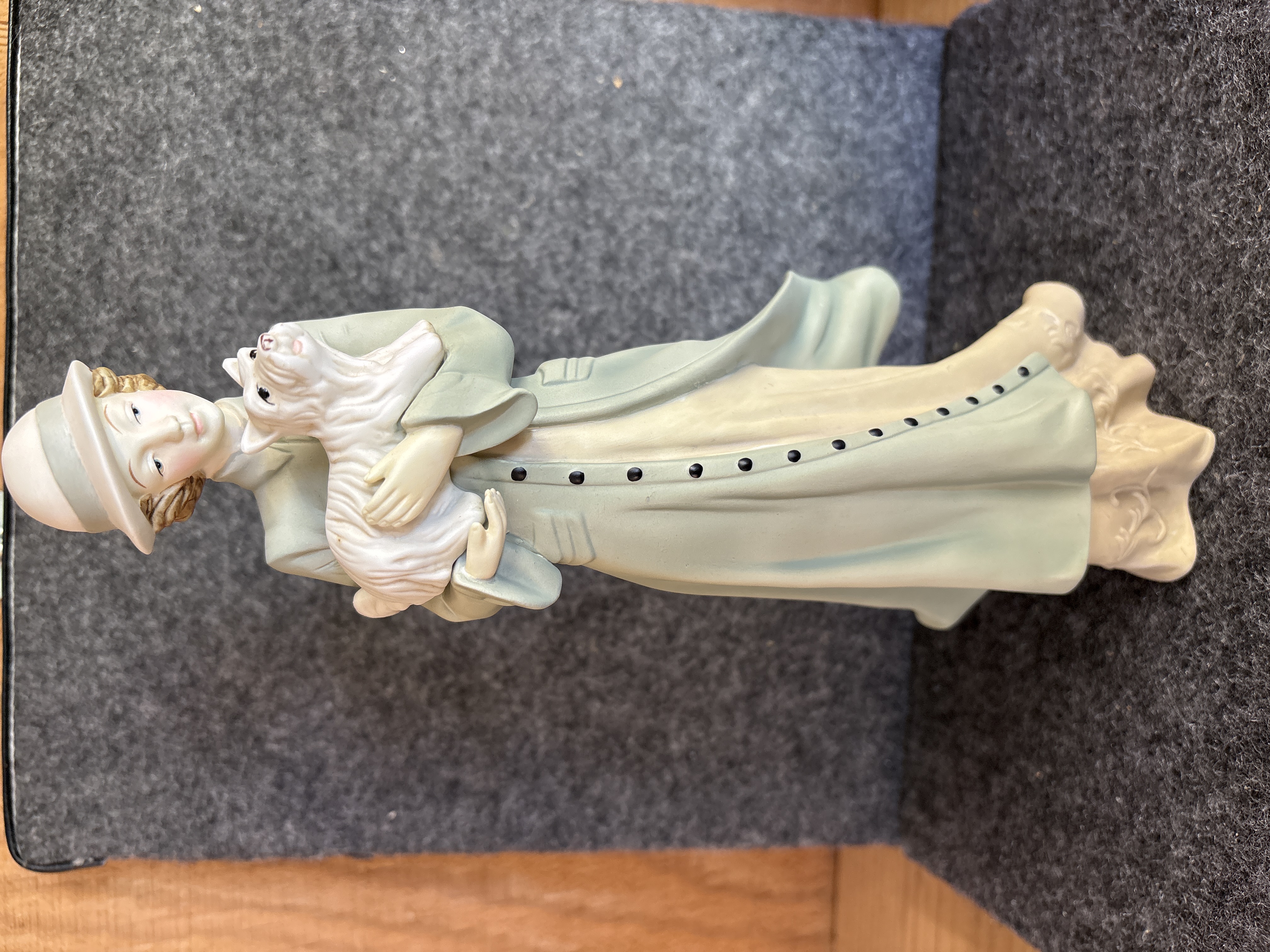 A matte-finished ceramic figurine titled Melanie and Shea, model number 11462. The piece depicts a woman in early 20th-century period attire, featuring a light green long coat with dark button details and a matching wide-brimmed hat. She is shown cradling a small white dog, resembling a West Highland White Terrier. The base is marked with the Home Interiors and Gifts logo and name, the address 1649 Frankford Road West, Carrollton, Texas 75007, USA, and the copyright date 2004. It also specifies Made in China and includes the website address.