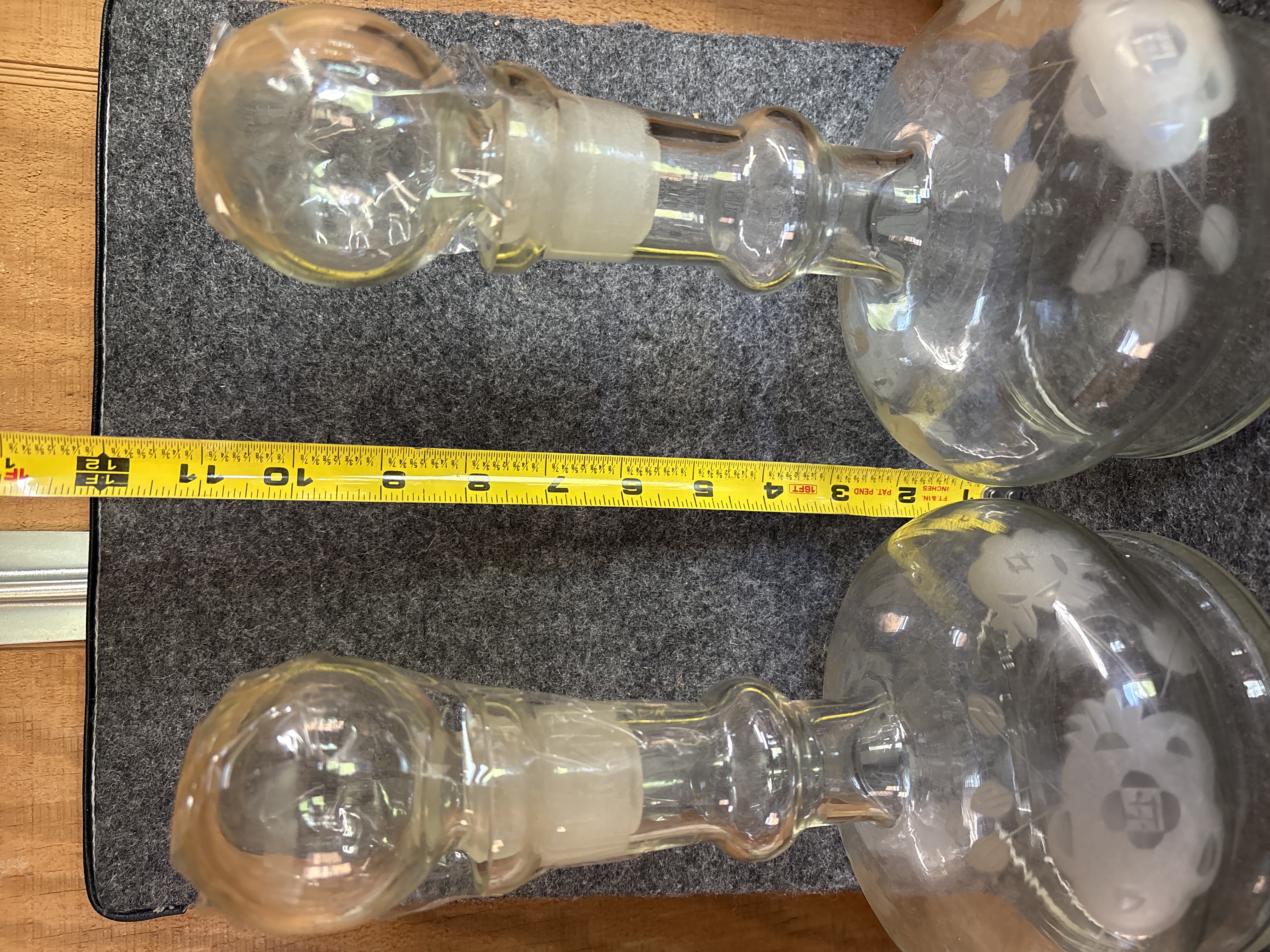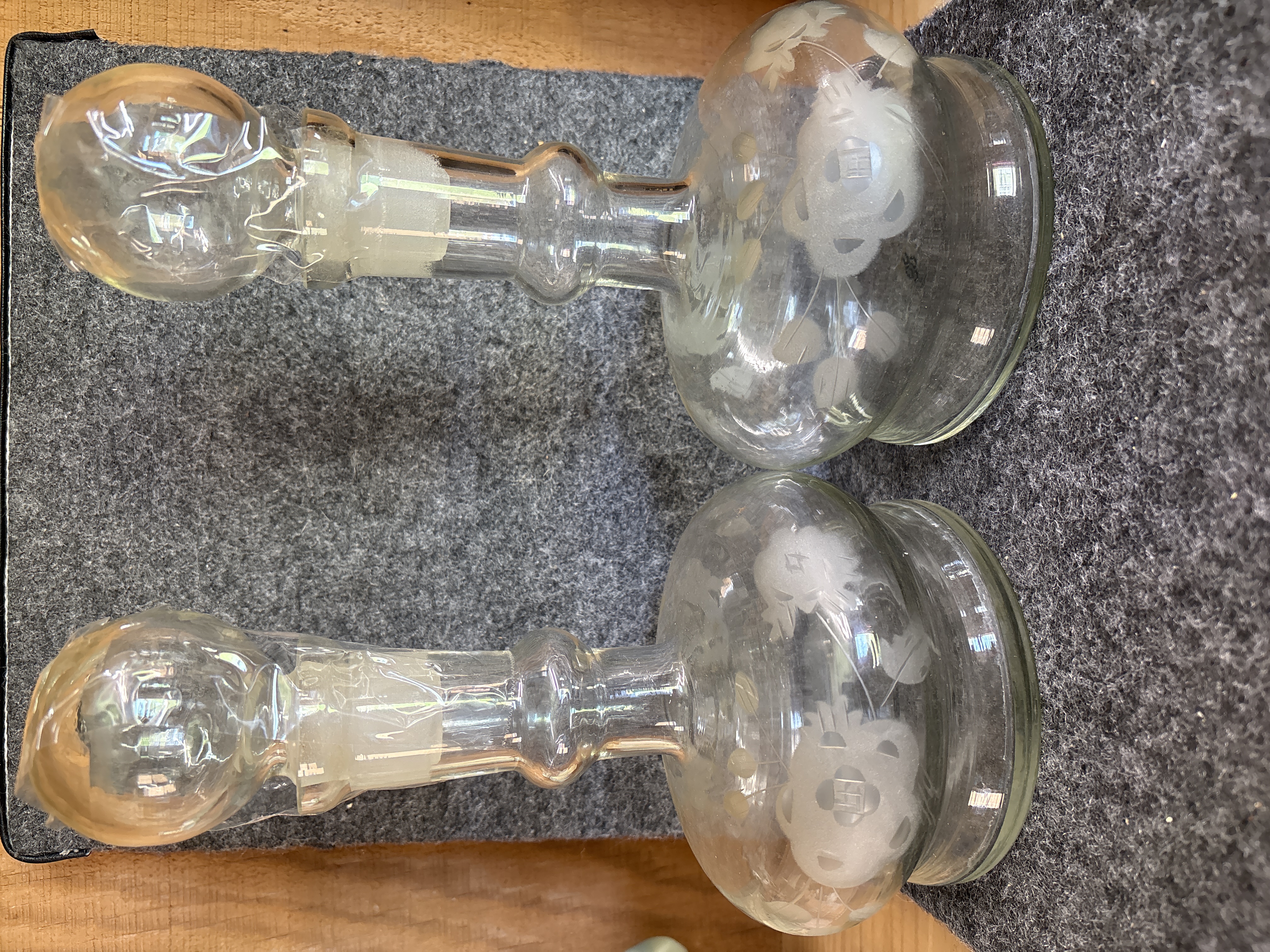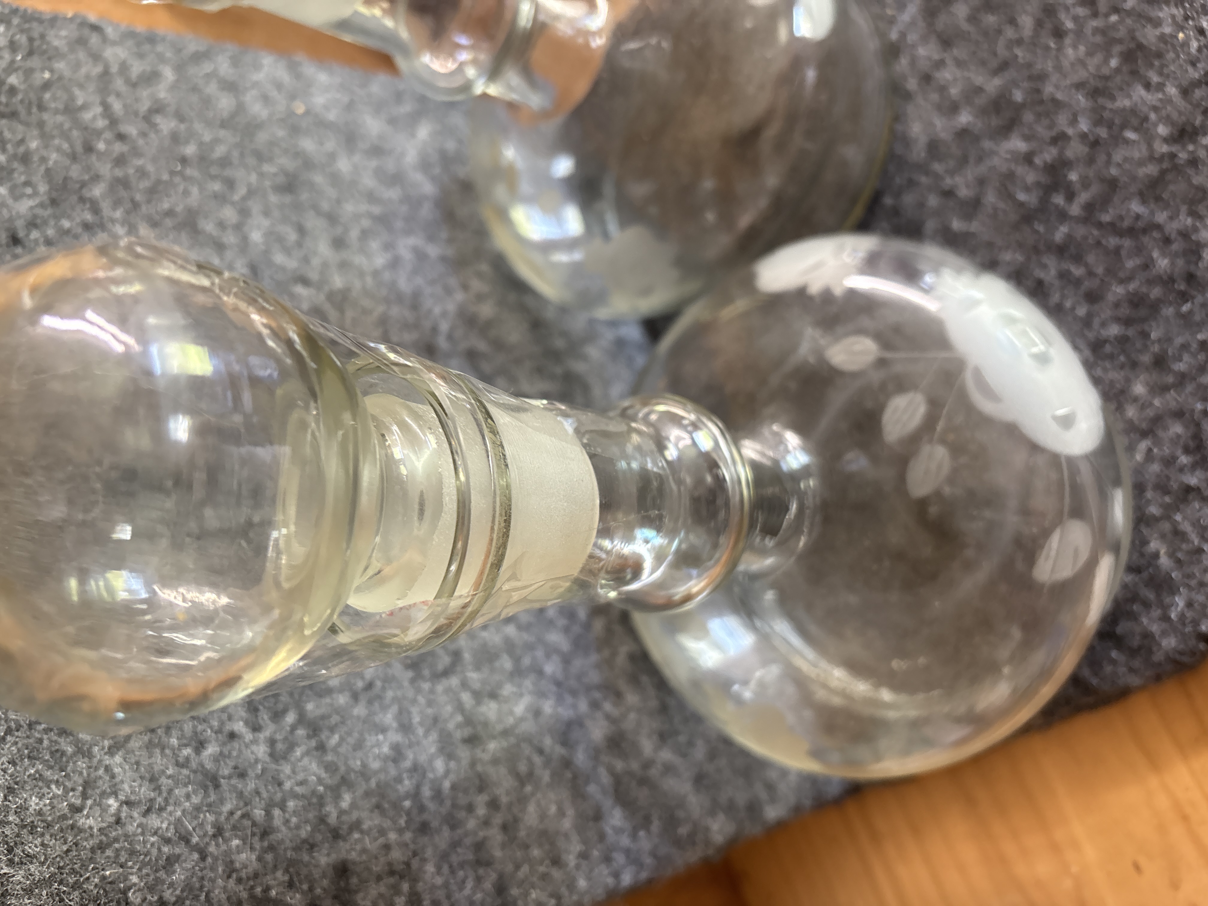 A pair of blown glass decanters featuring matching globular stoppers. Each vessel is designed with a rounded, bulbous body, a long neck with a central knop, and a flared rim. The exterior is decorated with wheel-etched or engraved designs featuring stylized floral and leaf motifs. Within the larger etched floral shapes are smaller, square geometric patterns. The stoppers are equipped with ground joints for a secure fit. A rectangular adhesive label is present on the underside of the base, featuring a logo of three interlocking angular shapes and the vertical text MADE IN PERU.