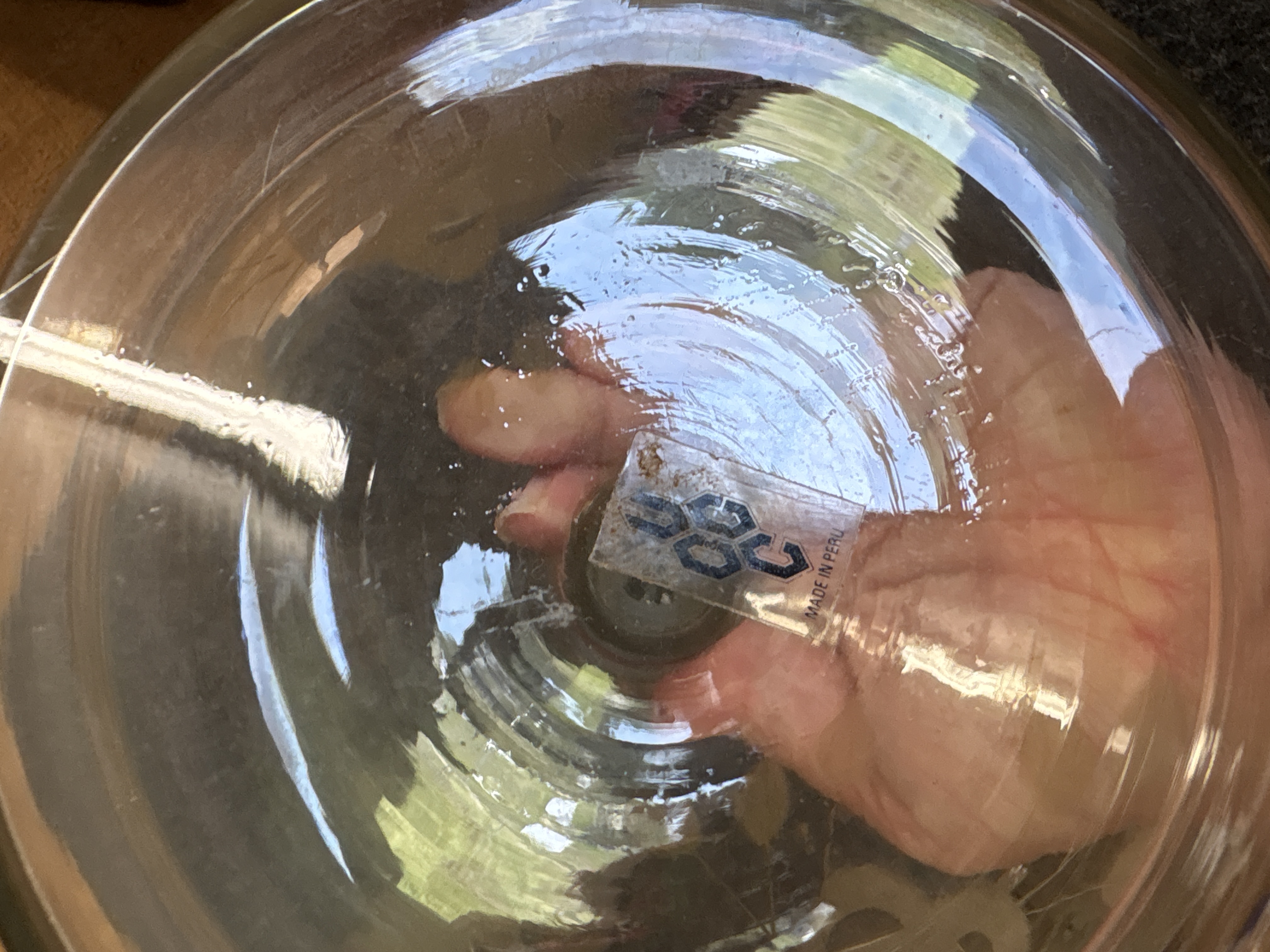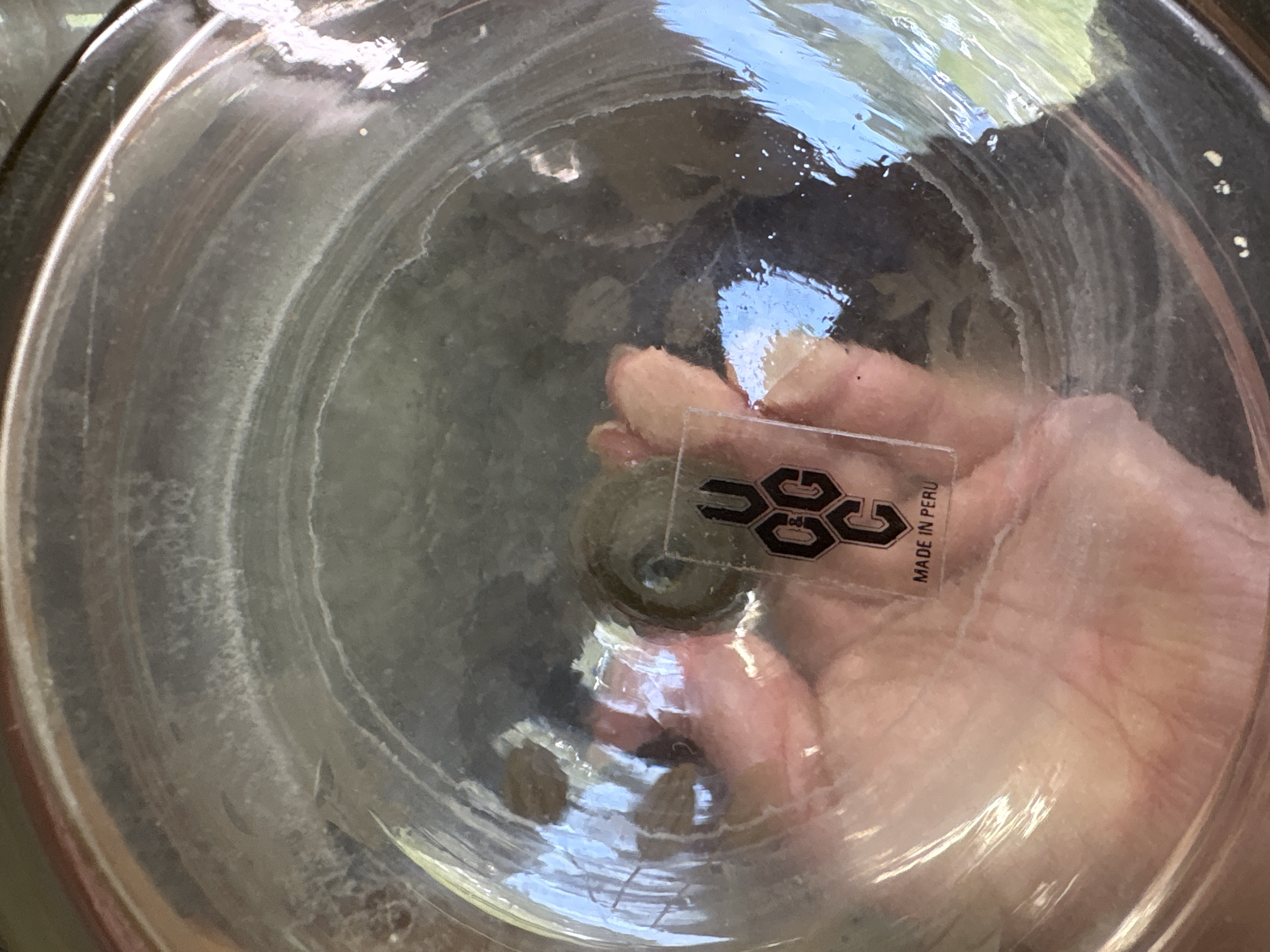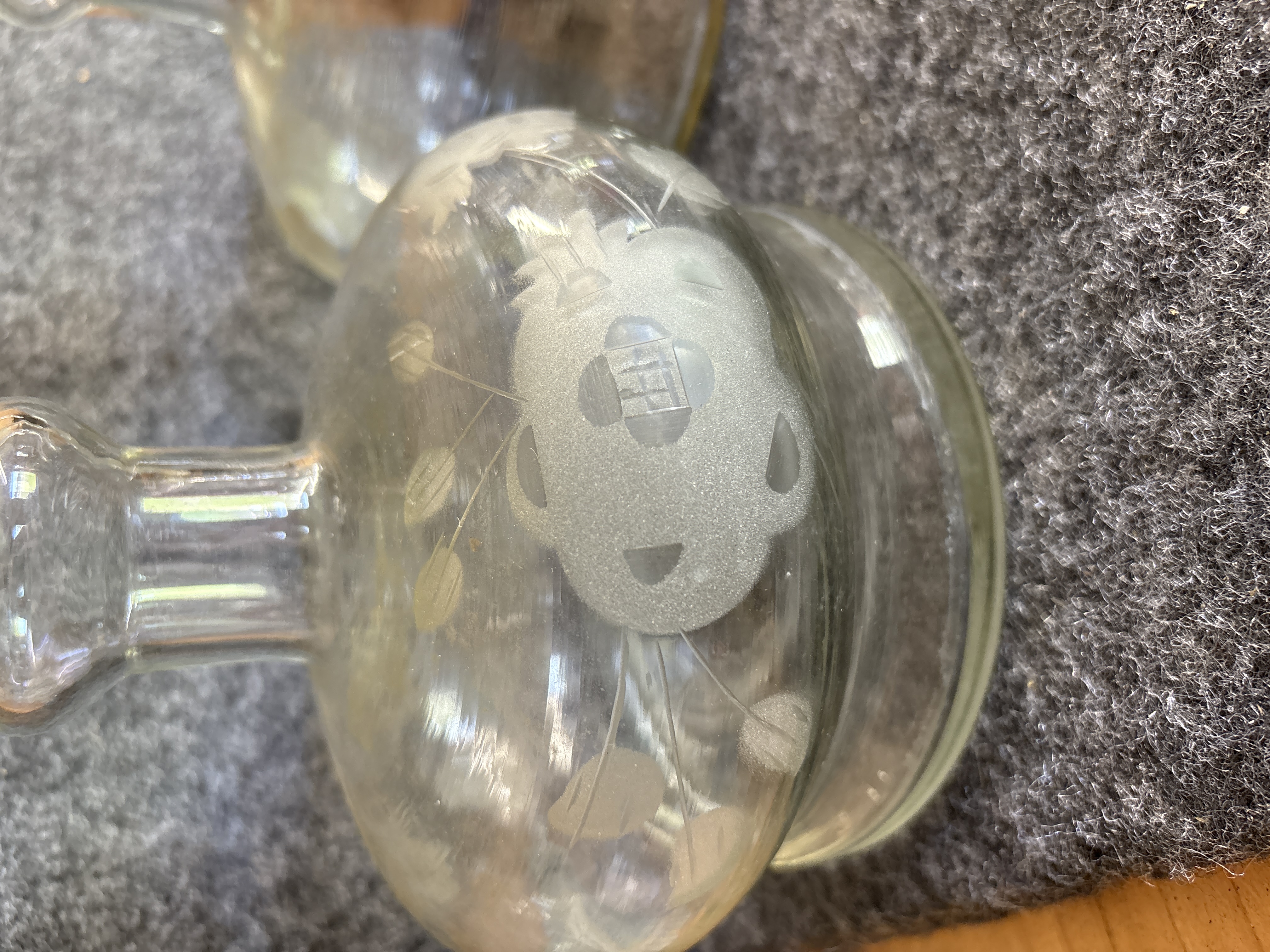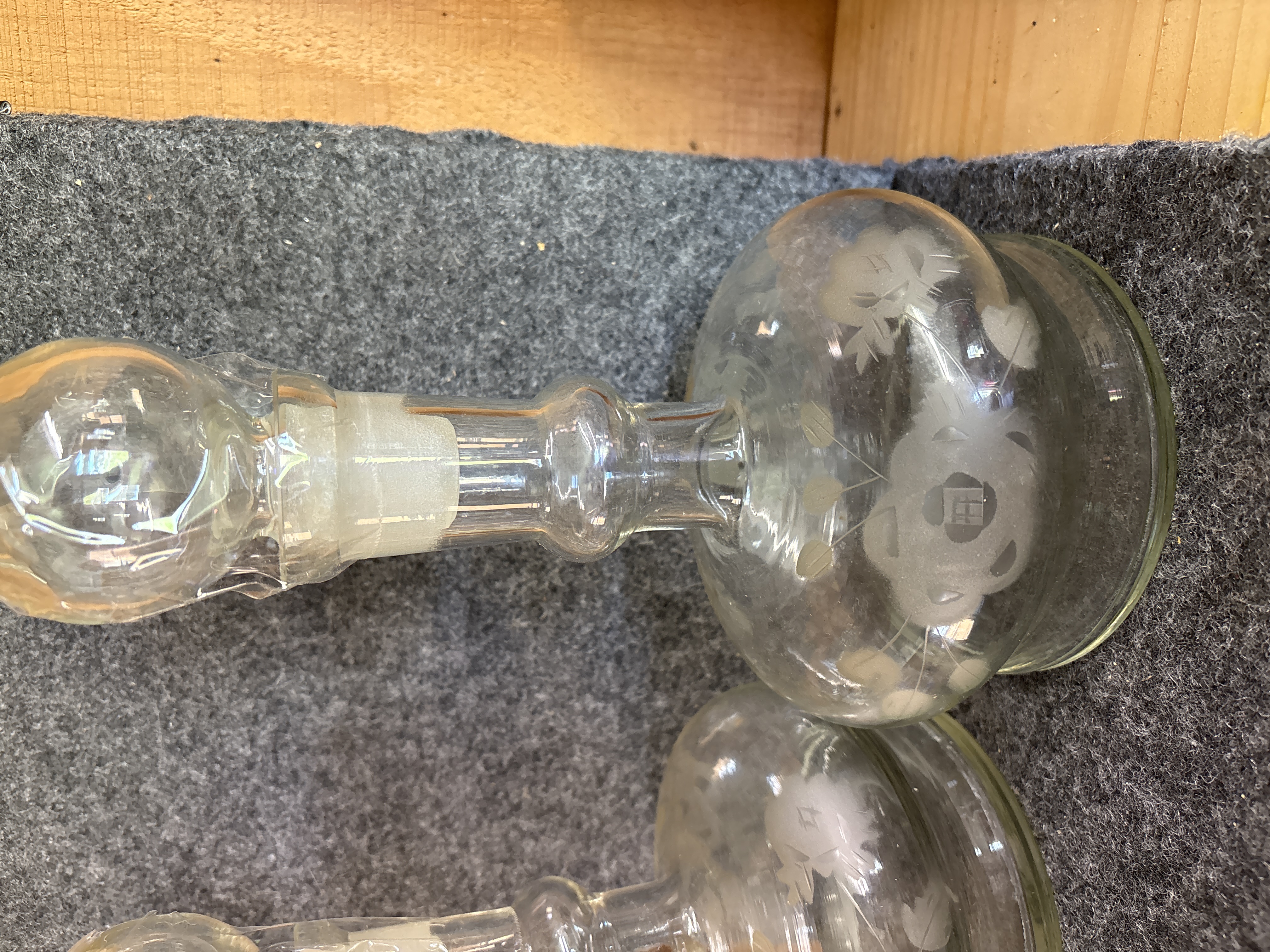 A pair of blown glass decanters featuring matching globular stoppers. Each vessel is designed with a rounded, bulbous body, a long neck with a central knop, and a flared rim. The exterior is decorated with wheel-etched or engraved designs featuring stylized floral and leaf motifs. Within the larger etched floral shapes are smaller, square geometric patterns. The stoppers are equipped with ground joints for a secure fit. A rectangular adhesive label is present on the underside of the base, featuring a logo of three interlocking angular shapes and the vertical text MADE IN PERU.