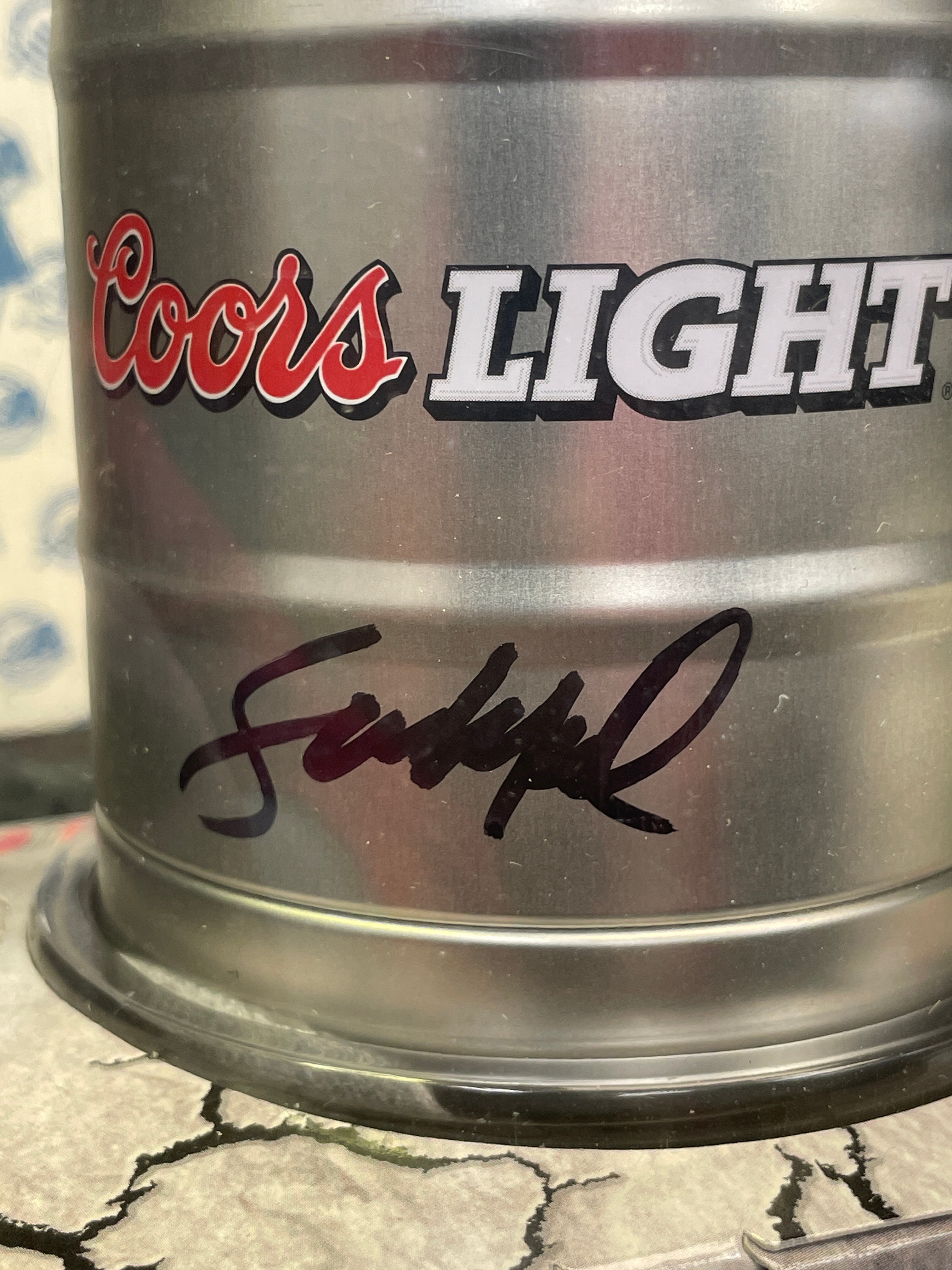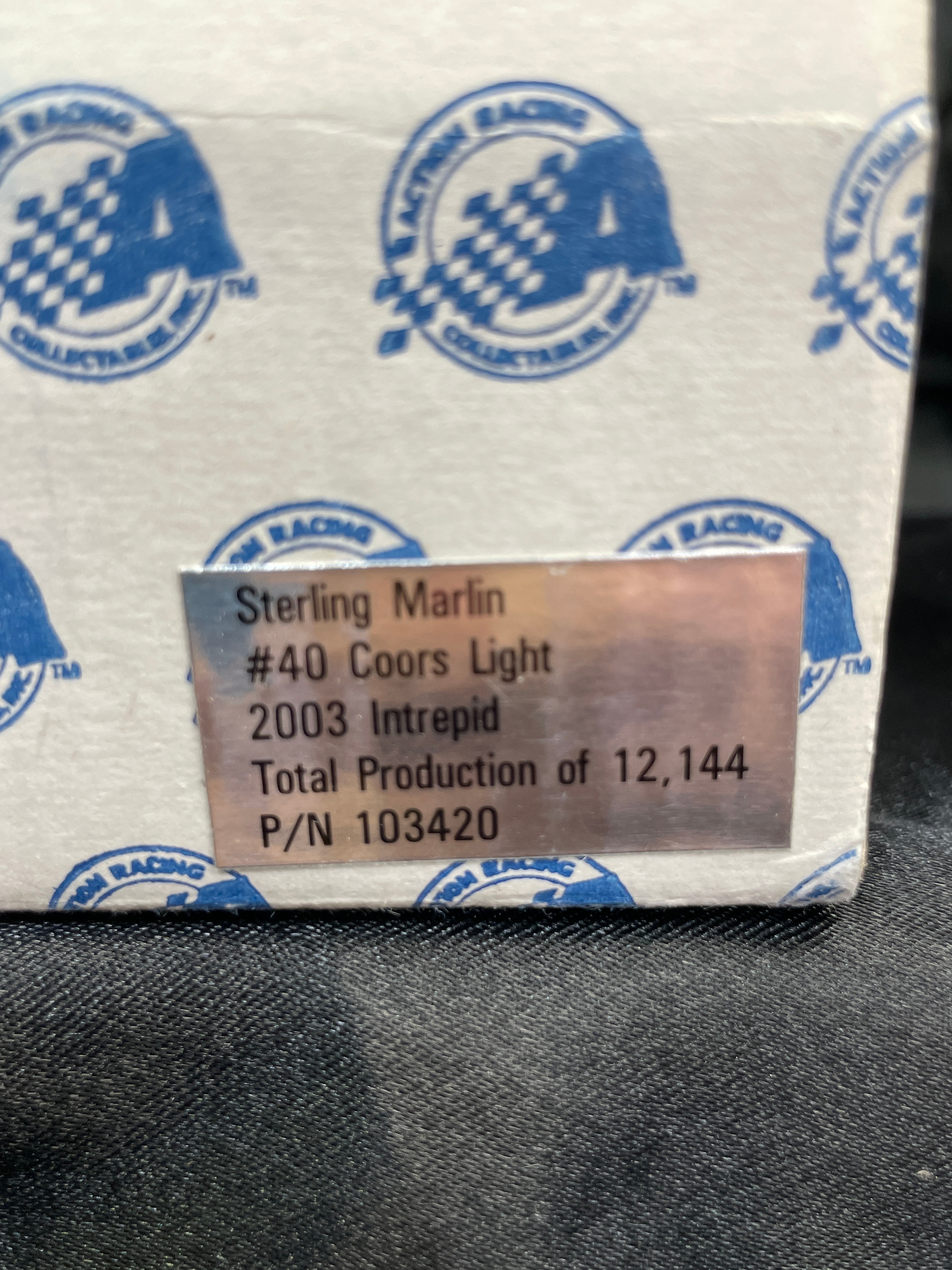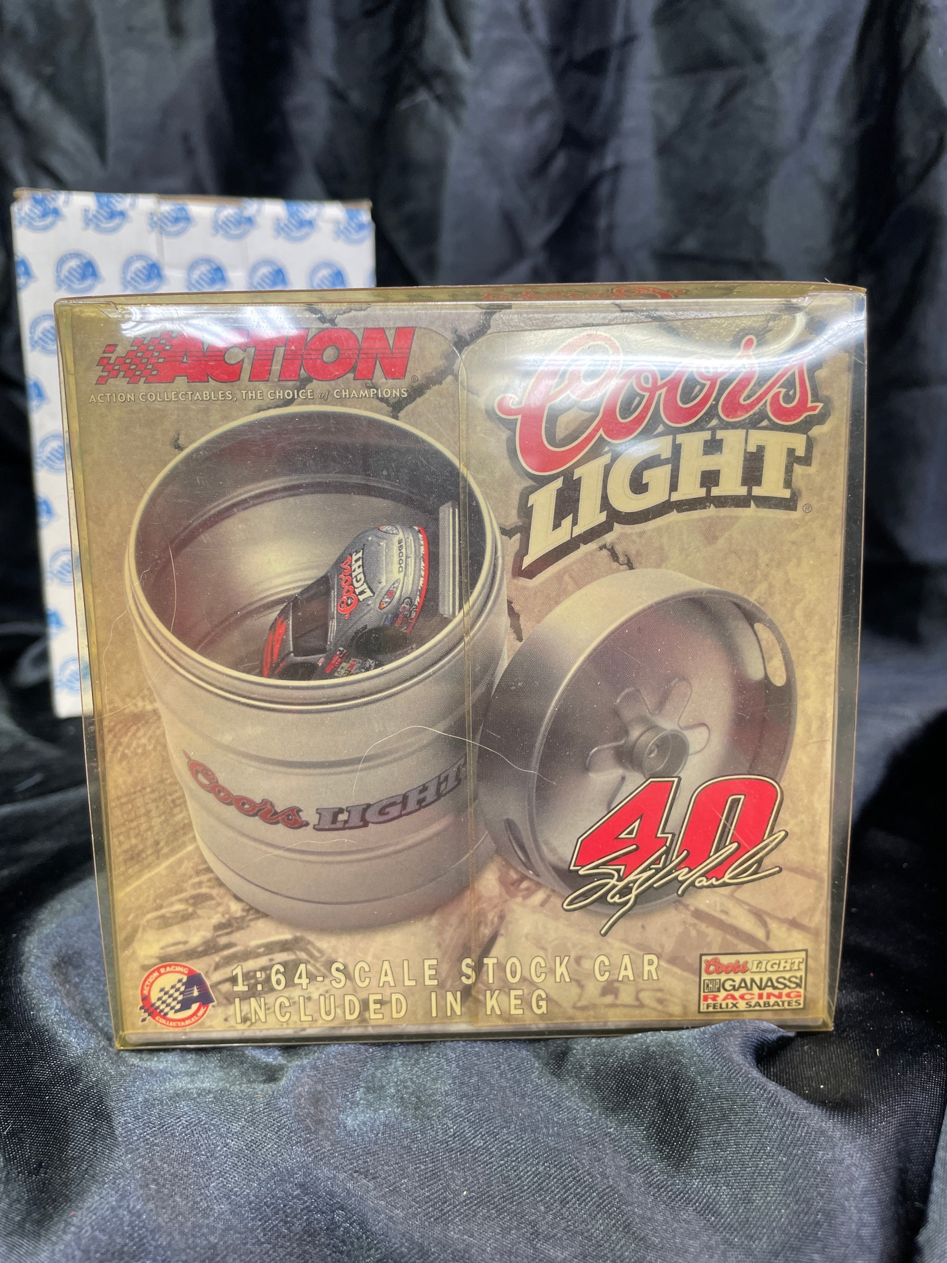 A limited edition Sterling Marlin #40 Coors Light 2003 Dodge Intrepid 1:64-scale stock car, presented within a miniature metal keg. Dating to 2003, the silver-toned miniature metal keg is branded ‘Coors LIGHT’ and features a black stylized signature. It is housed within its original clear plastic display box, which includes ‘ACTION’ branding, ‘NASCAR, ‘ ‘Sterling 40,’ and ‘Coors LIGHT GANASSI FELIX SABATES’ details, confirming the inclusion of a 1:64-scale stock car inside the keg. This display box is further contained within its original white cardboard outer box, patterned with ‘ACTION RACING COLLECTABLES, INC.’ logos. A silver label affixed to the outer box identifies the item as ‘Sterling Marlin #40 Coors Light 2003 Intrepid’ with a ‘Total Production of 12,144.’