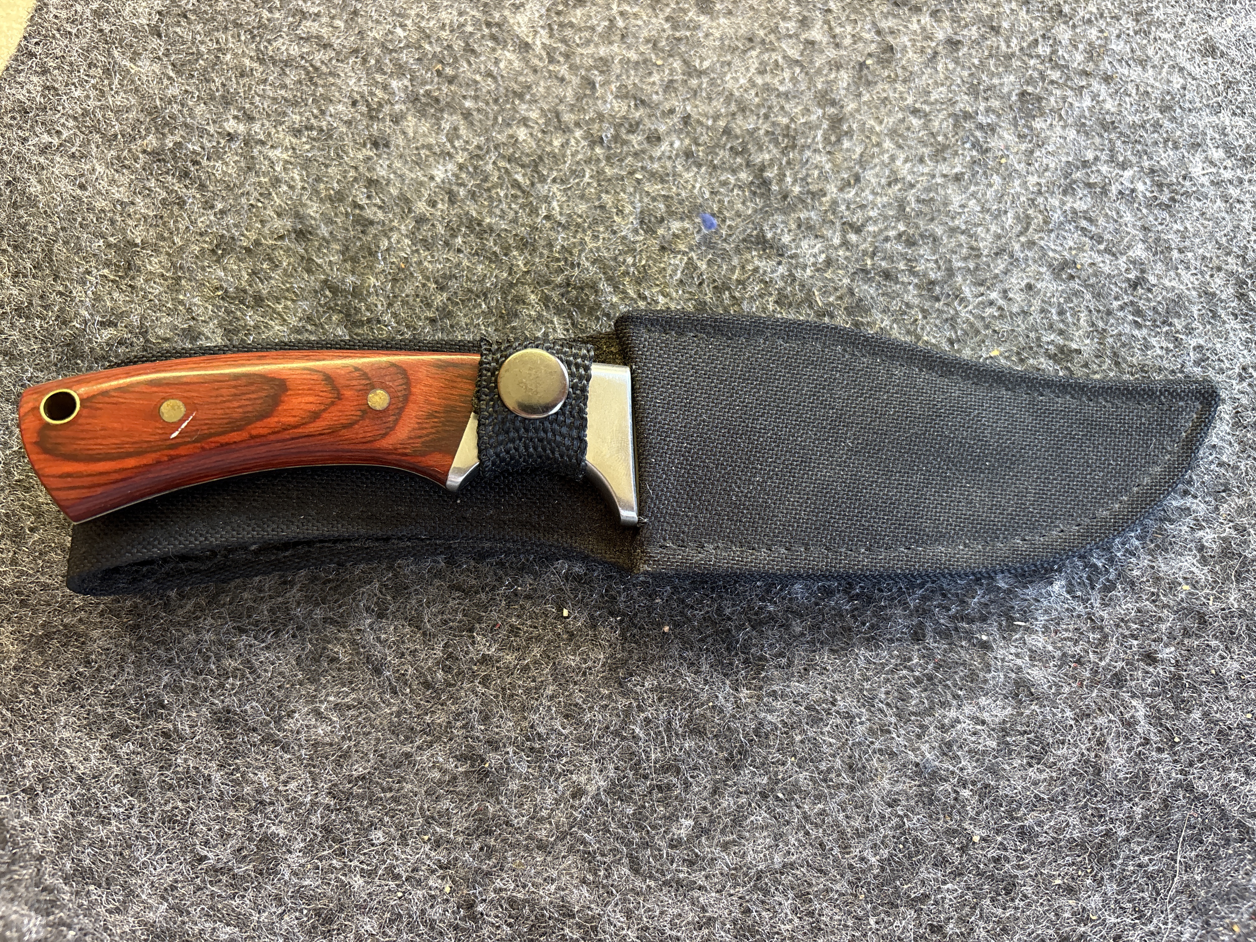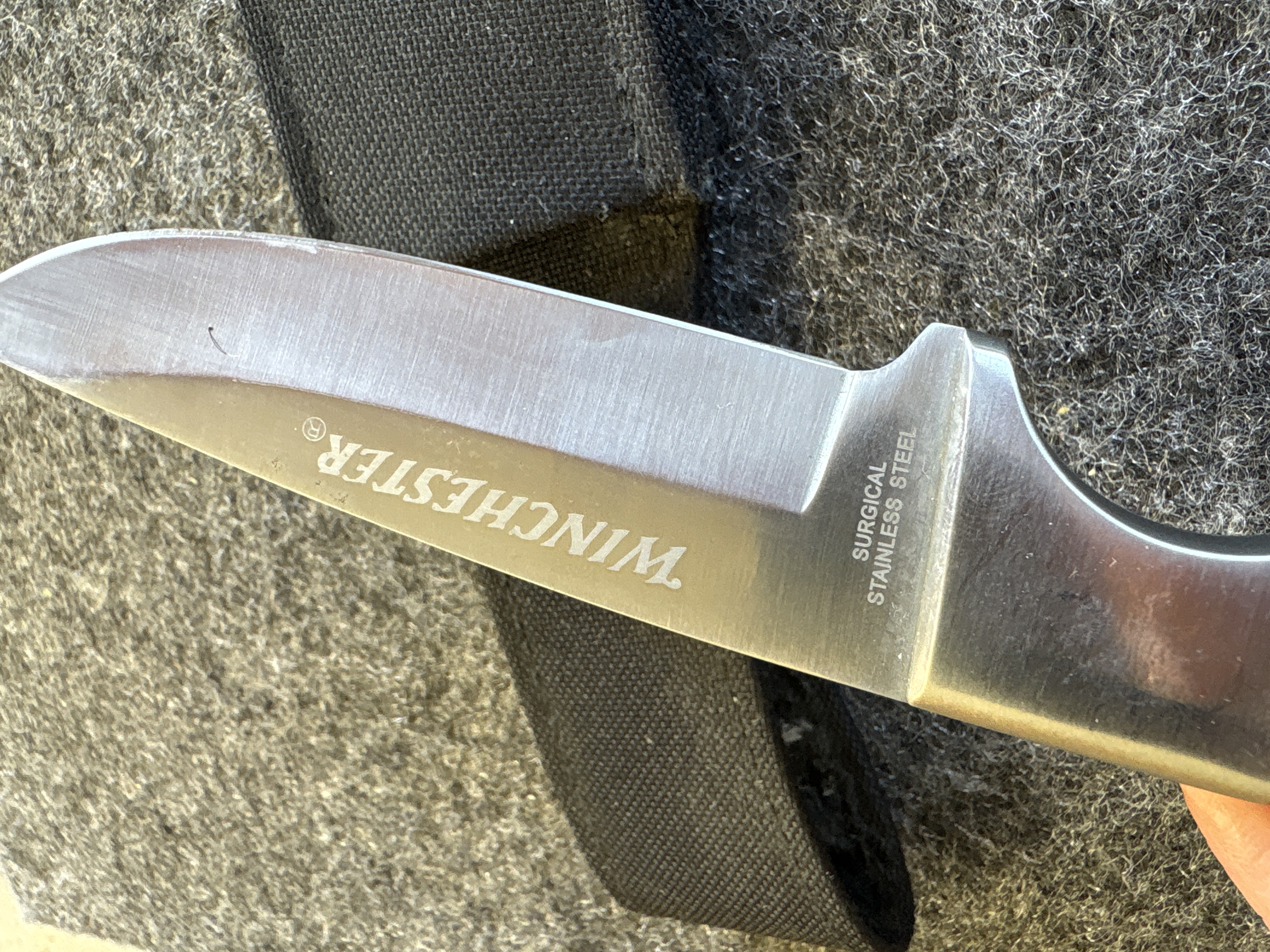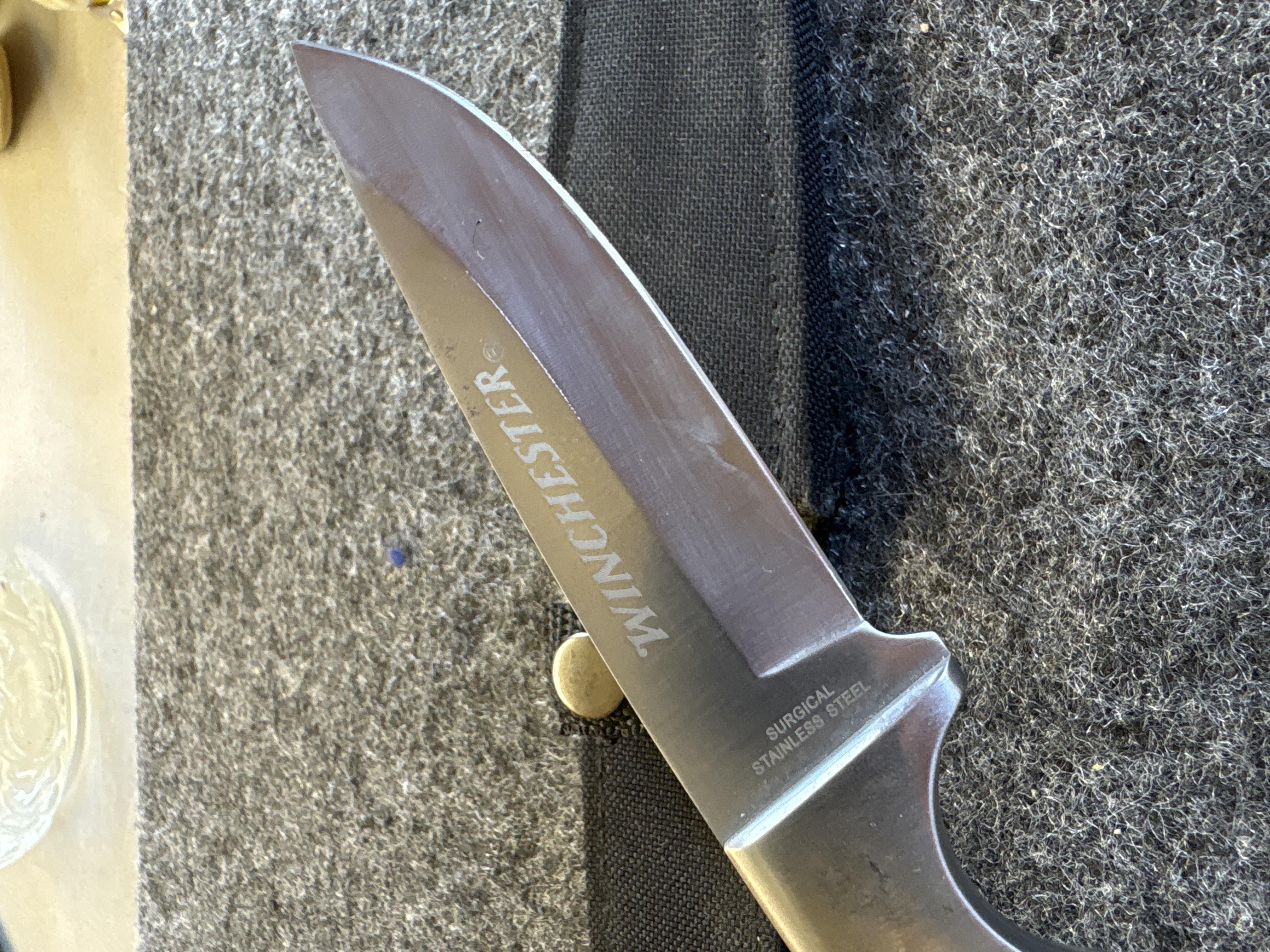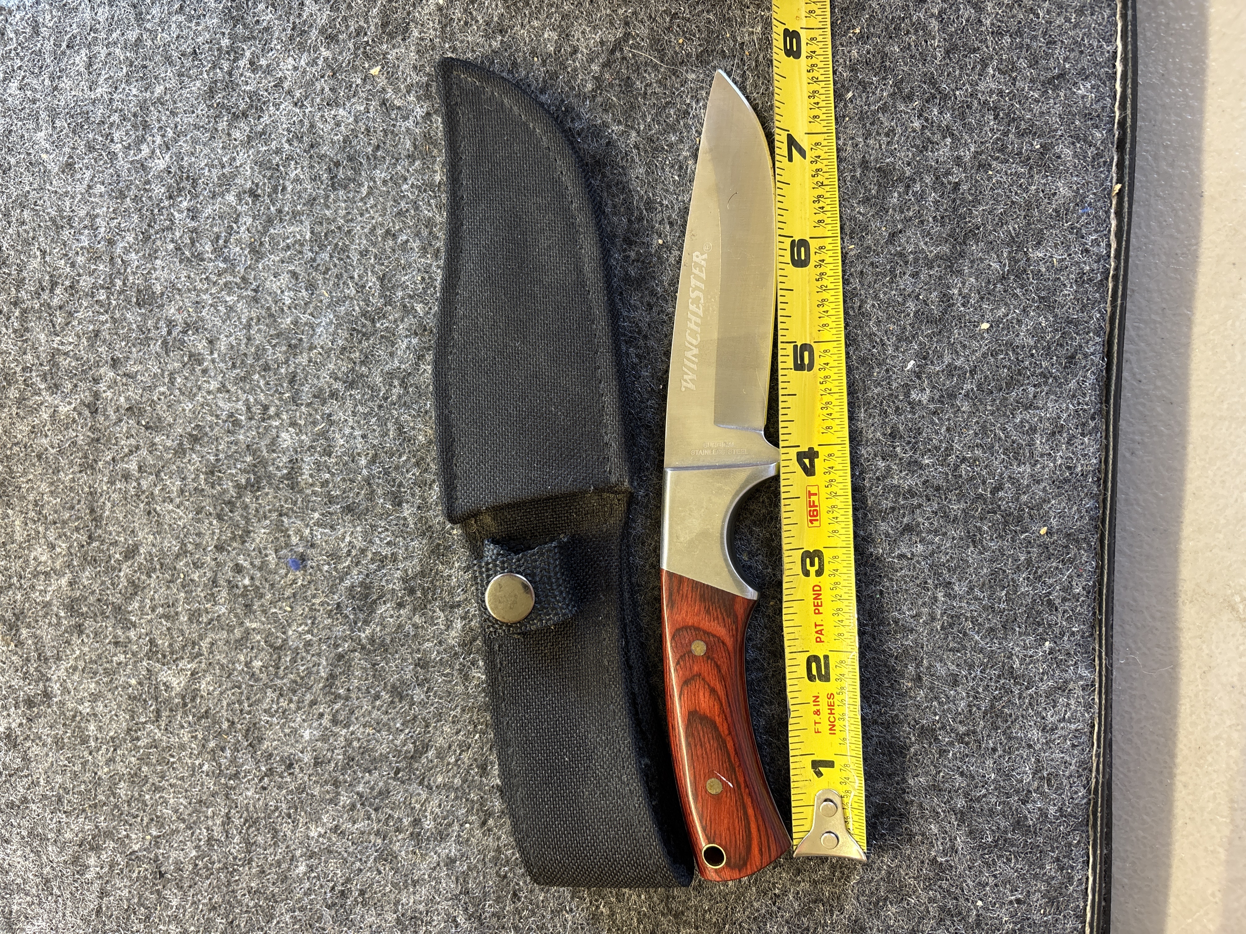 A Winchester G41340 Hunter fixed blade utility knife featuring full tang construction. The drop point blade is crafted from surgical stainless steel with a satin finish and a hollow grind. The blade design includes a deep finger choil for increased control. The face of the blade is etched with the Winchester brand name and registered trademark symbol. The ricasso is stamped Surgical Stainless Steel on the primary side and China on the reverse. The handle consists of contoured brown wood-grain laminate scales, identified as Pakkawood, secured to the tang with two brass pins. A brass-lined lanyard hole is located at the pommel. The knife is accompanied by its original black ballistic nylon belt sheath with a snap-fastener retaining strap.